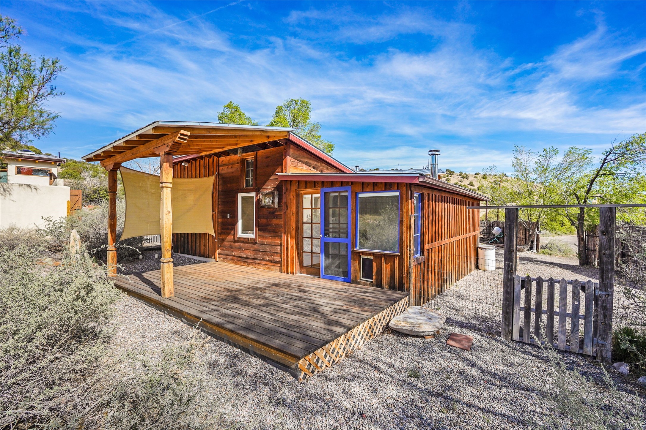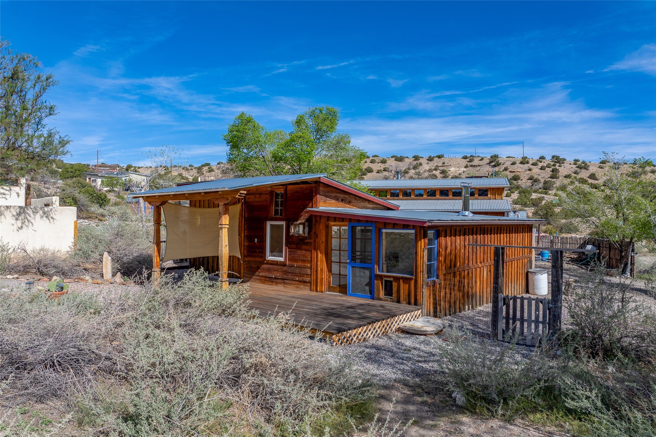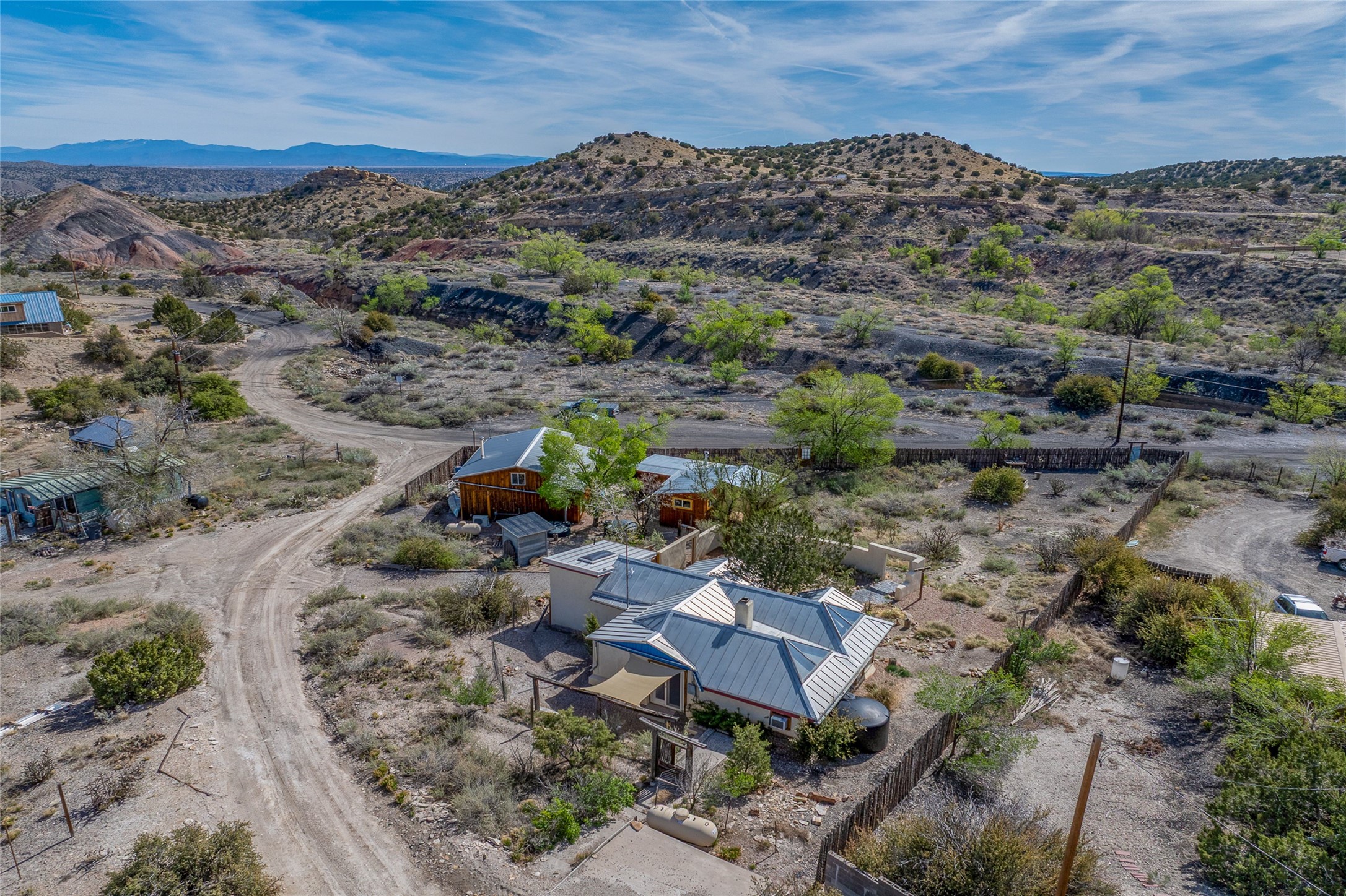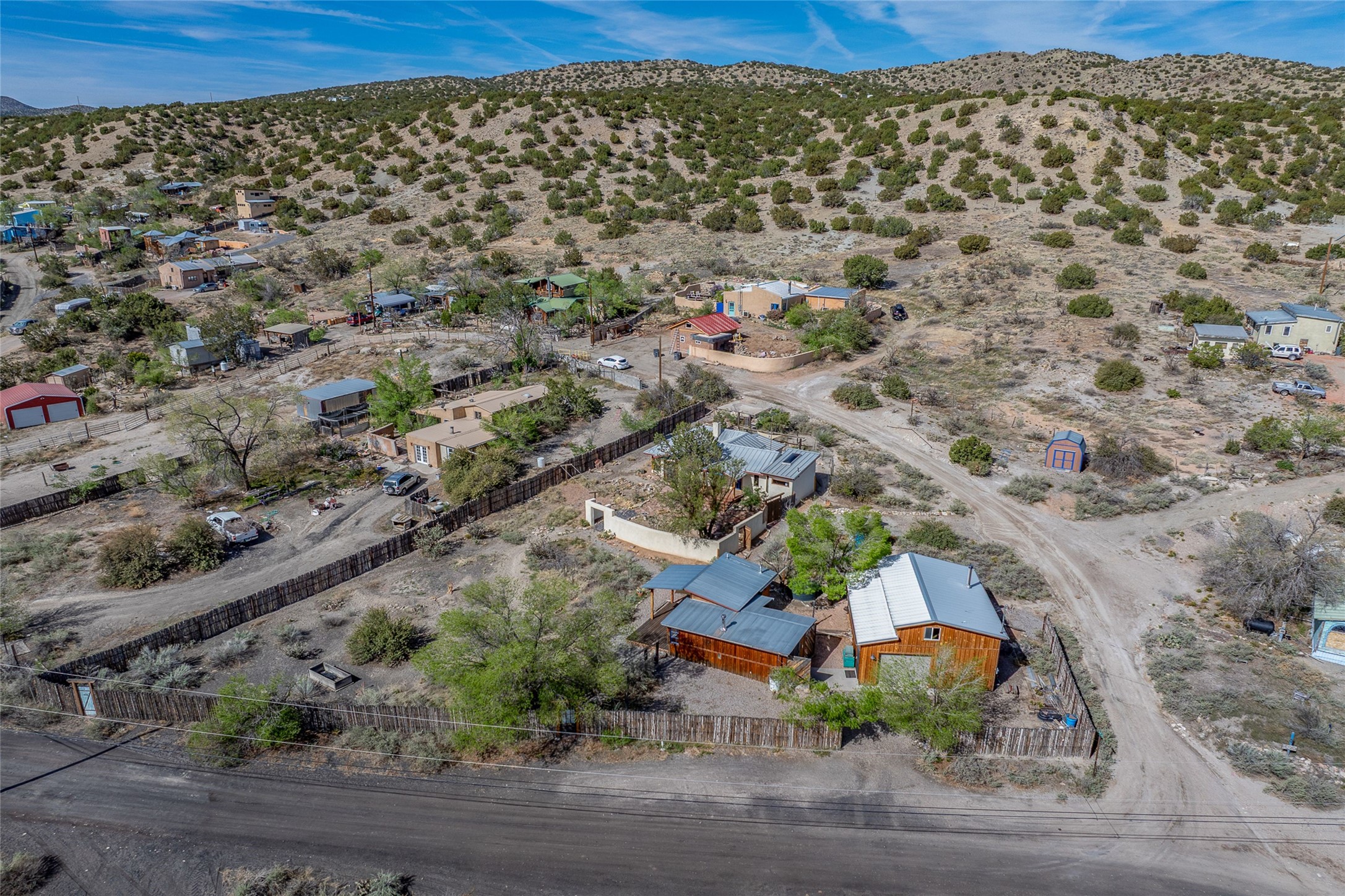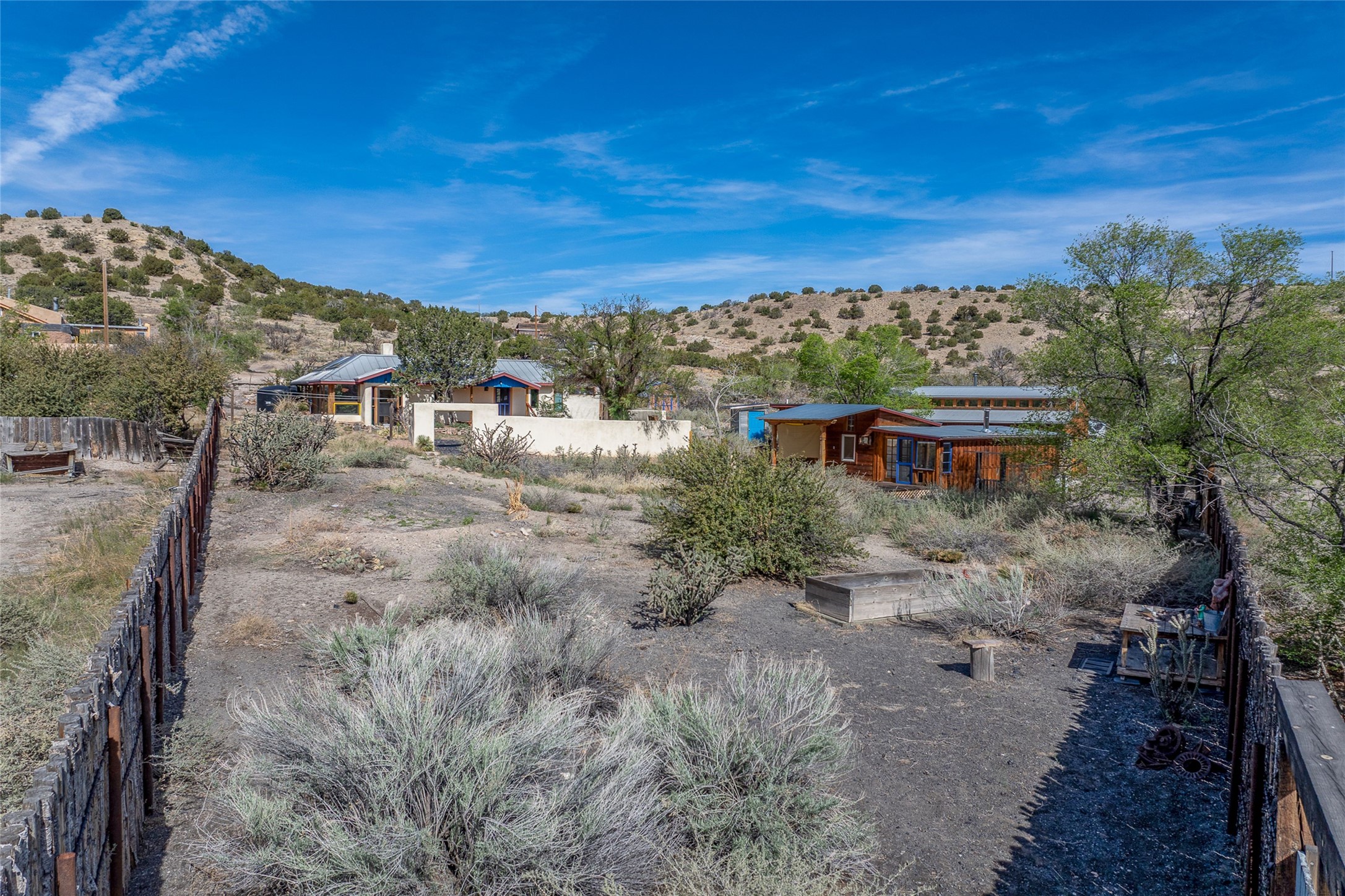 Nestled in the heart of historic Madrid village and close to the County greenbelt, this unique .64-acre property offers a blend of charm and functionality. It features a 972-square-foot artistic main home, a 443-square-foot studio complete bath with shower and sink, and a bright, spacious 750-square-foot workshop. The workshop is equipped with a wood stove for heating and a mini-split system that also provides heating and cooling. The main home showcases partial adobe construction, a sunlit atrium, a two-way kiva fireplace, and a bathroom featuring a clawfoot tub. The property consists of two legally recorded lots. Both the studio and the main house open to an expansive fenced yard with secure coyote fencing, ideal for pets. Just off the kitchen's patio doors lies a tranquil patio space, adding to the peaceful ambiance. This property is part of a lively, creative community with coffee shop, galleries, restaurants, and a general store--all within walking distance. Its location offers convenient access to Albuquerque and Santa Fe via the scenic Turquoise Trail. A perfect blend of artistry, community, and work-at-home possibilities awaits.