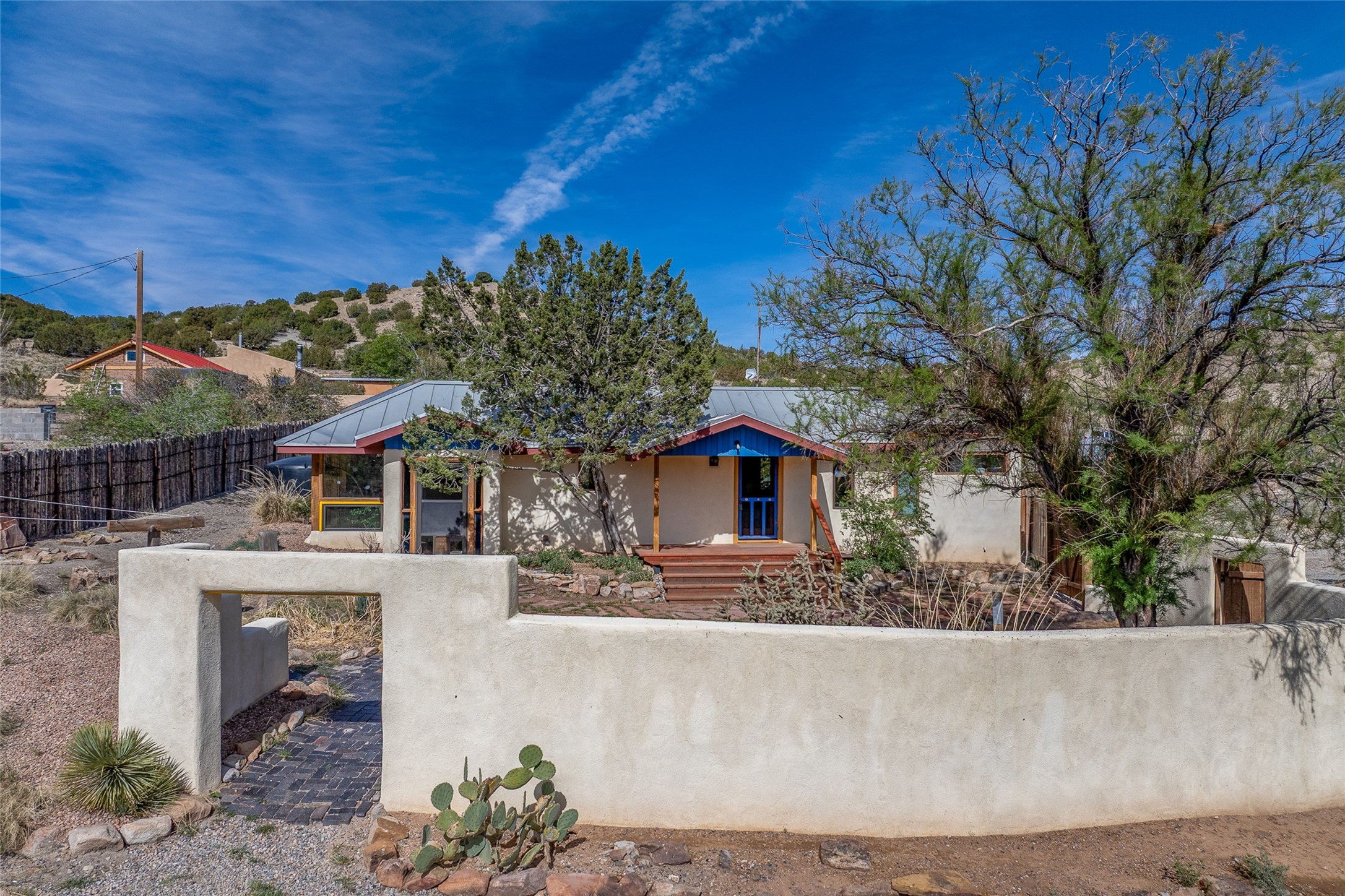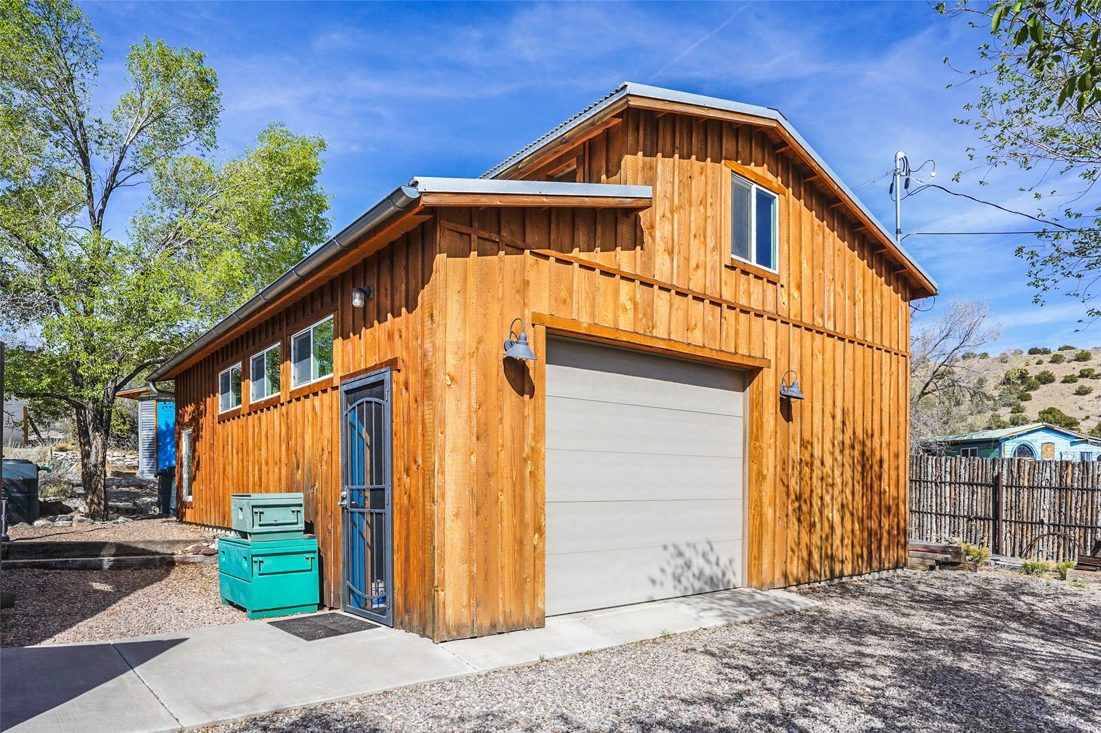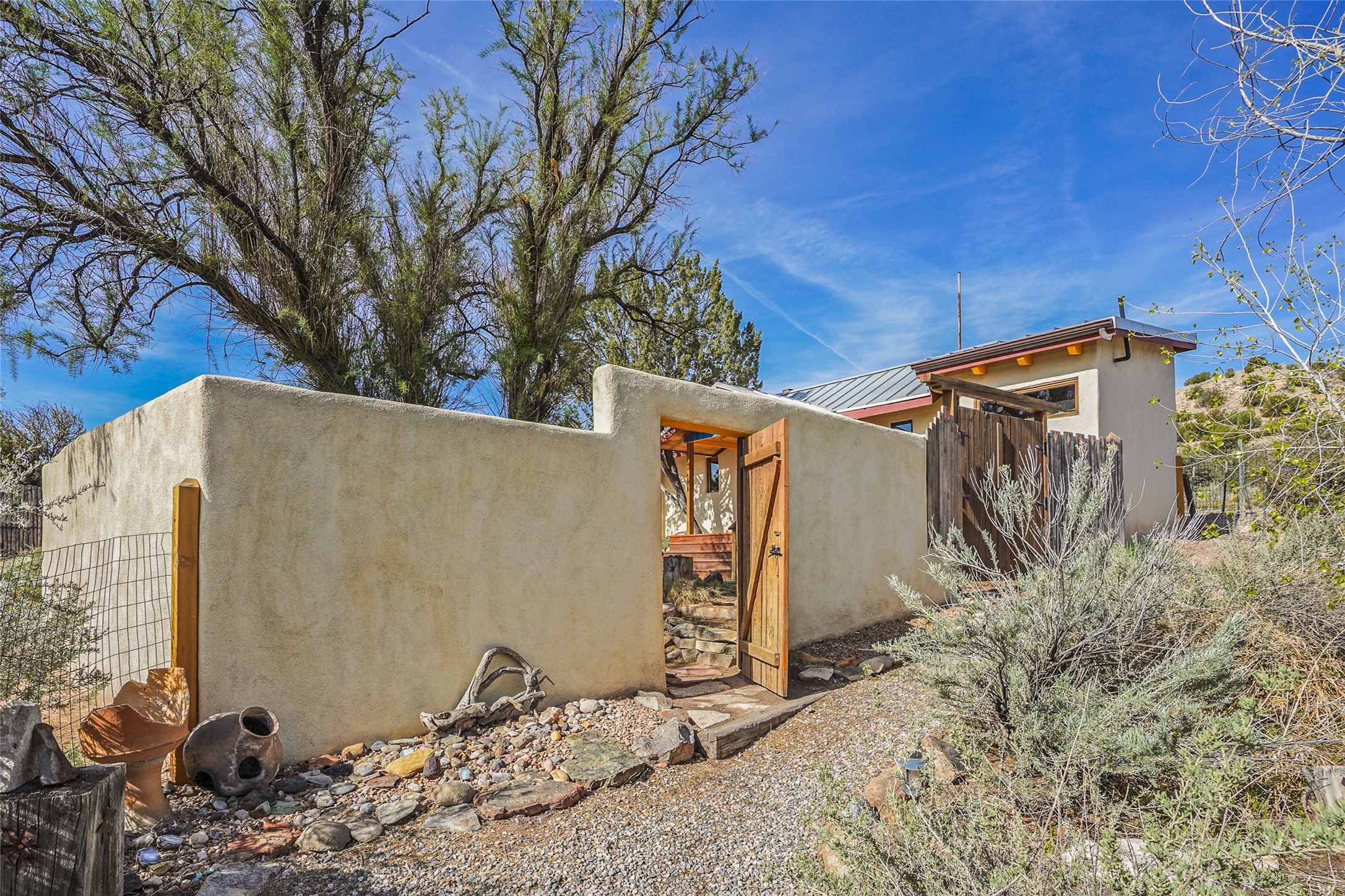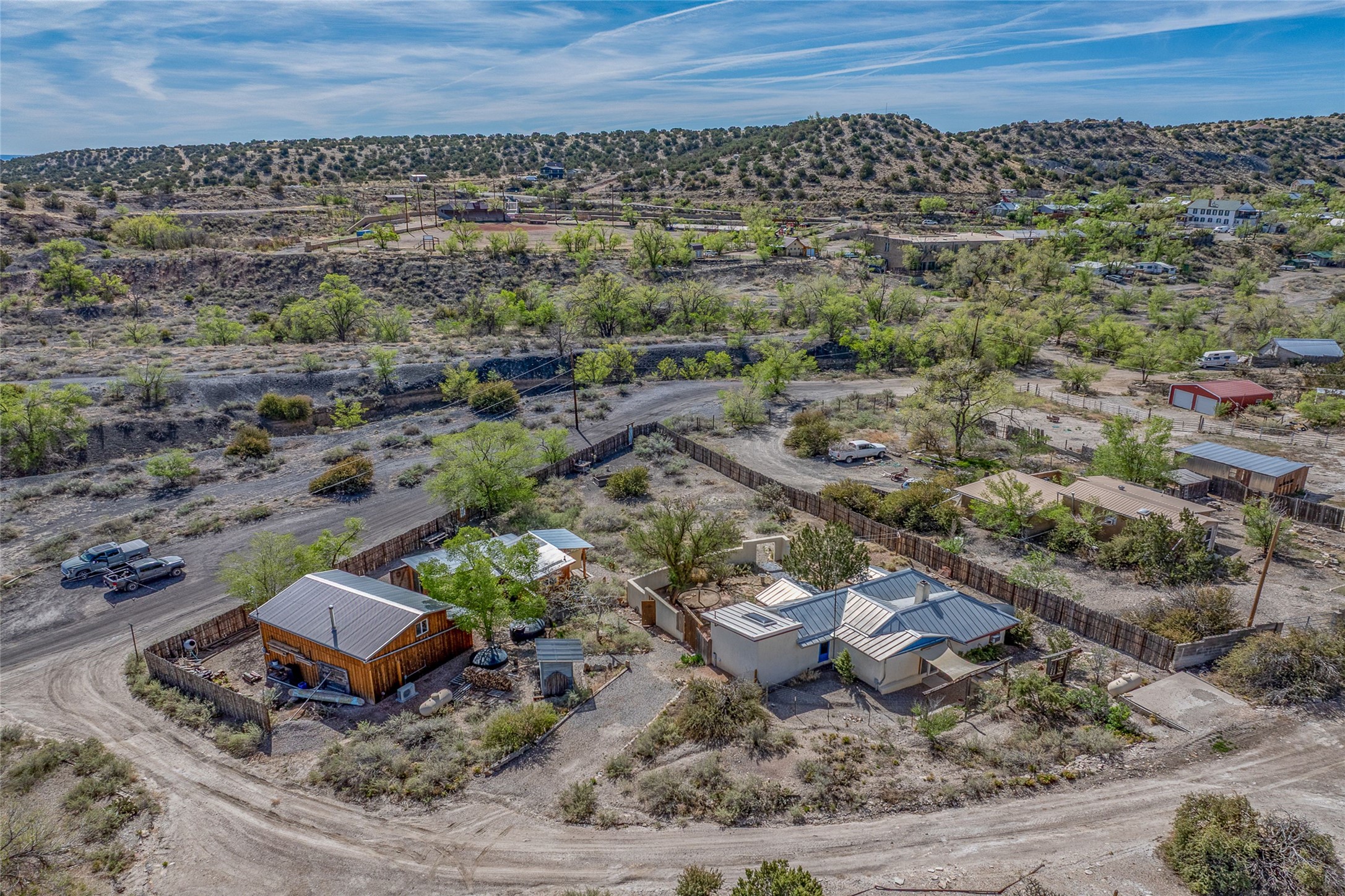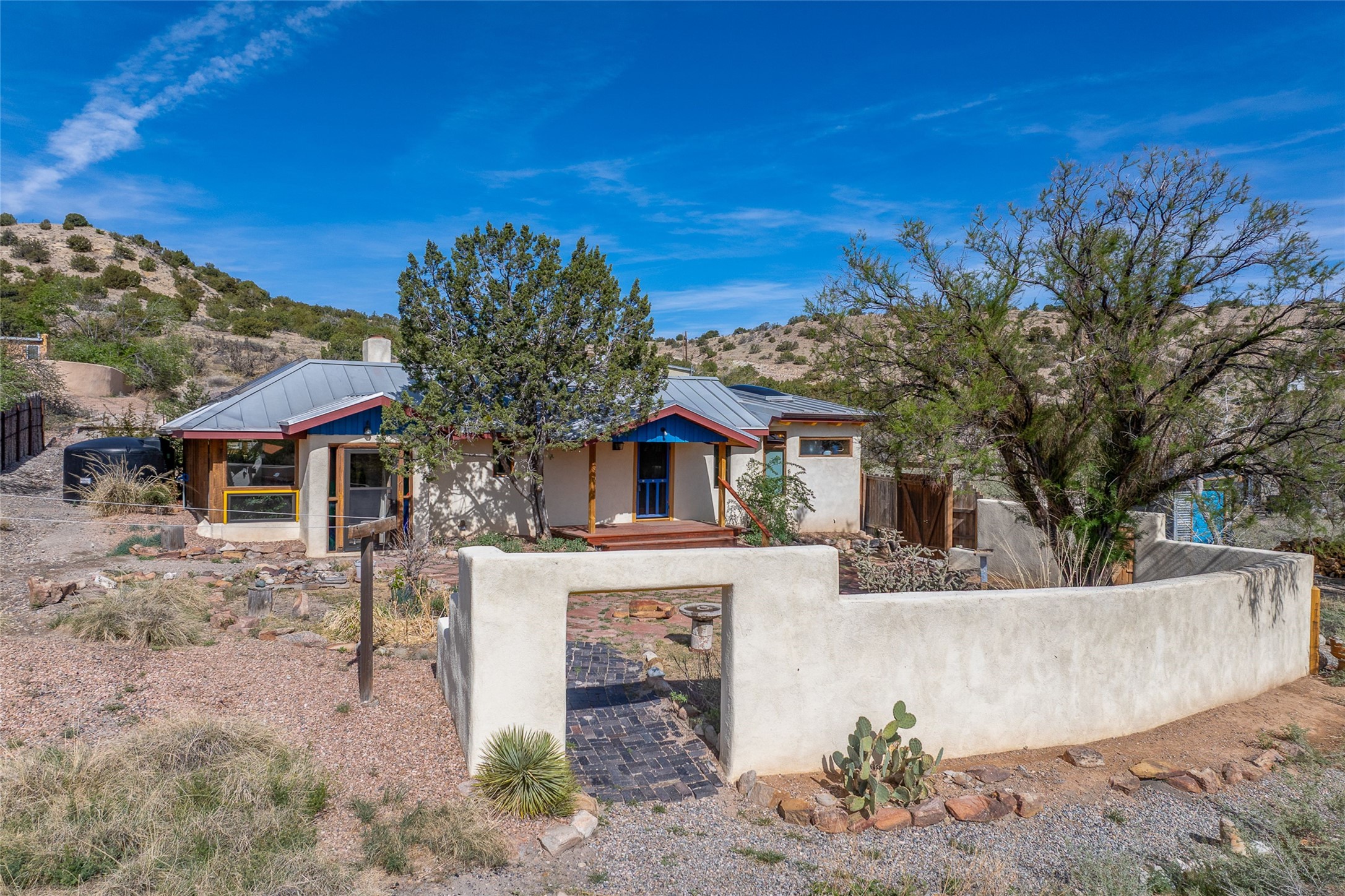 Nestled in the heart of historic Madrid village and close to the County greenbelt, this unique .64-acre property offers a blend of charm and functionality. It features a 972-square-foot artistic main home, a 443-square-foot studio complete bath with shower and sink, and a bright, spacious 750-square-foot workshop. The workshop is equipped with a wood stove for heating and a mini-split system that also provides heating and cooling. The main home showcases partial adobe construction, a sunlit atrium, a two-way kiva fireplace, and a bathroom featuring a clawfoot tub. The property consists of two legally recorded lots. Both the studio and the main house open to an expansive fenced yard with secure coyote fencing, ideal for pets. Just off the kitchen's patio doors lies a tranquil patio space, adding to the peaceful ambiance. This property is part of a lively, creative community with coffee shop, galleries, restaurants, and a general store--all within walking distance. Its location offers convenient access to Albuquerque and Santa Fe via the scenic Turquoise Trail. A perfect blend of artistry, community, and work-at-home possibilities awaits.