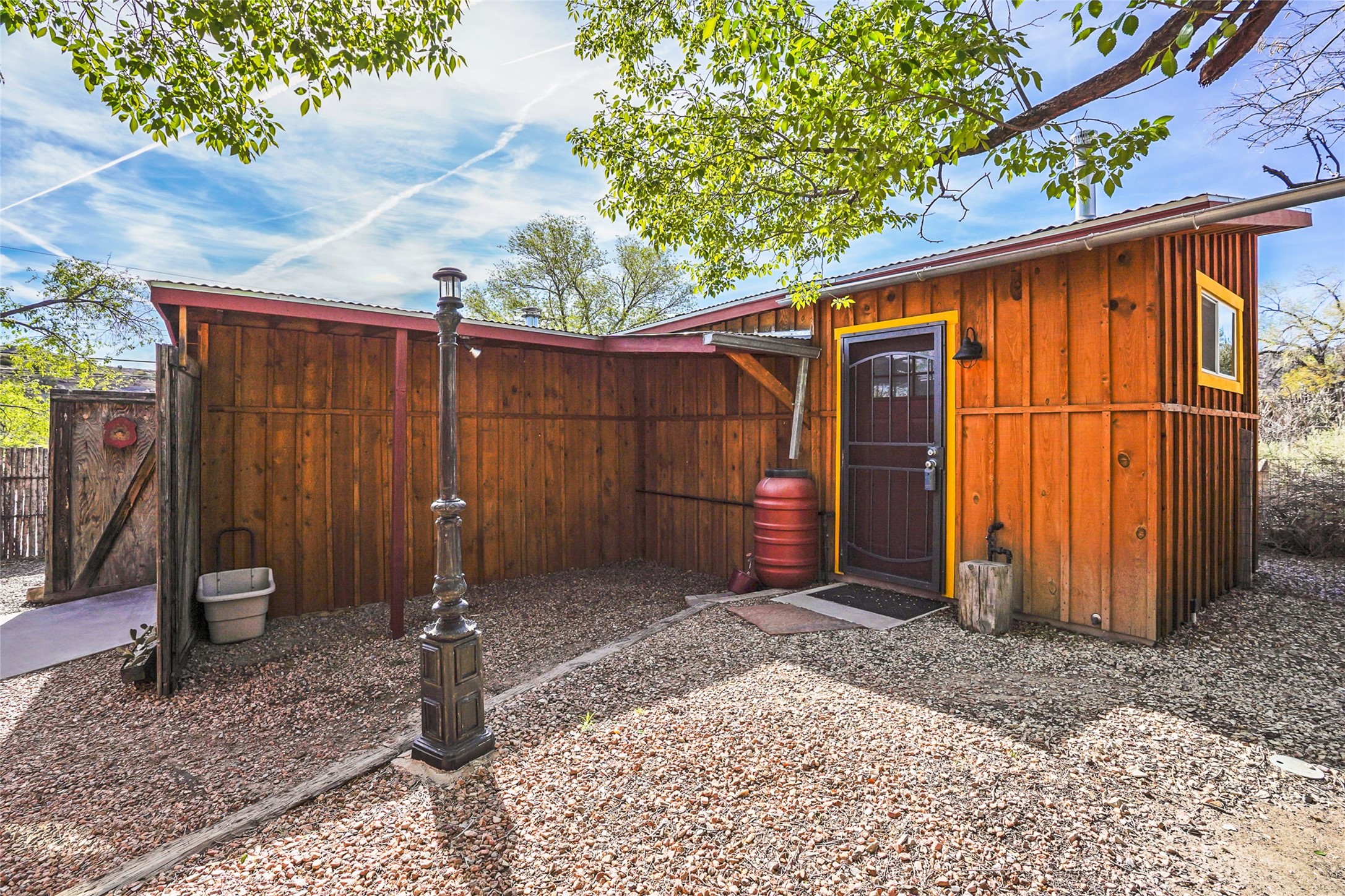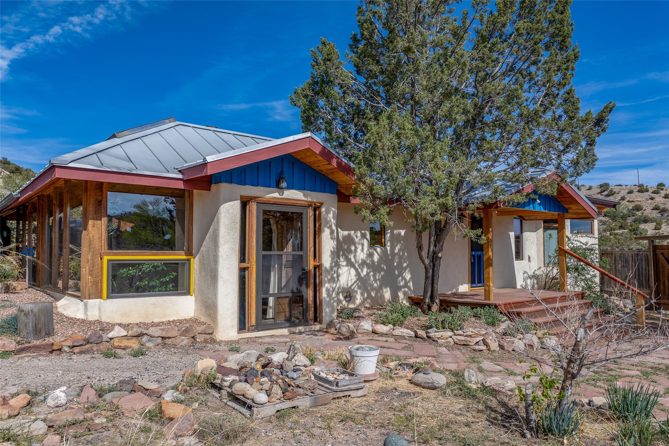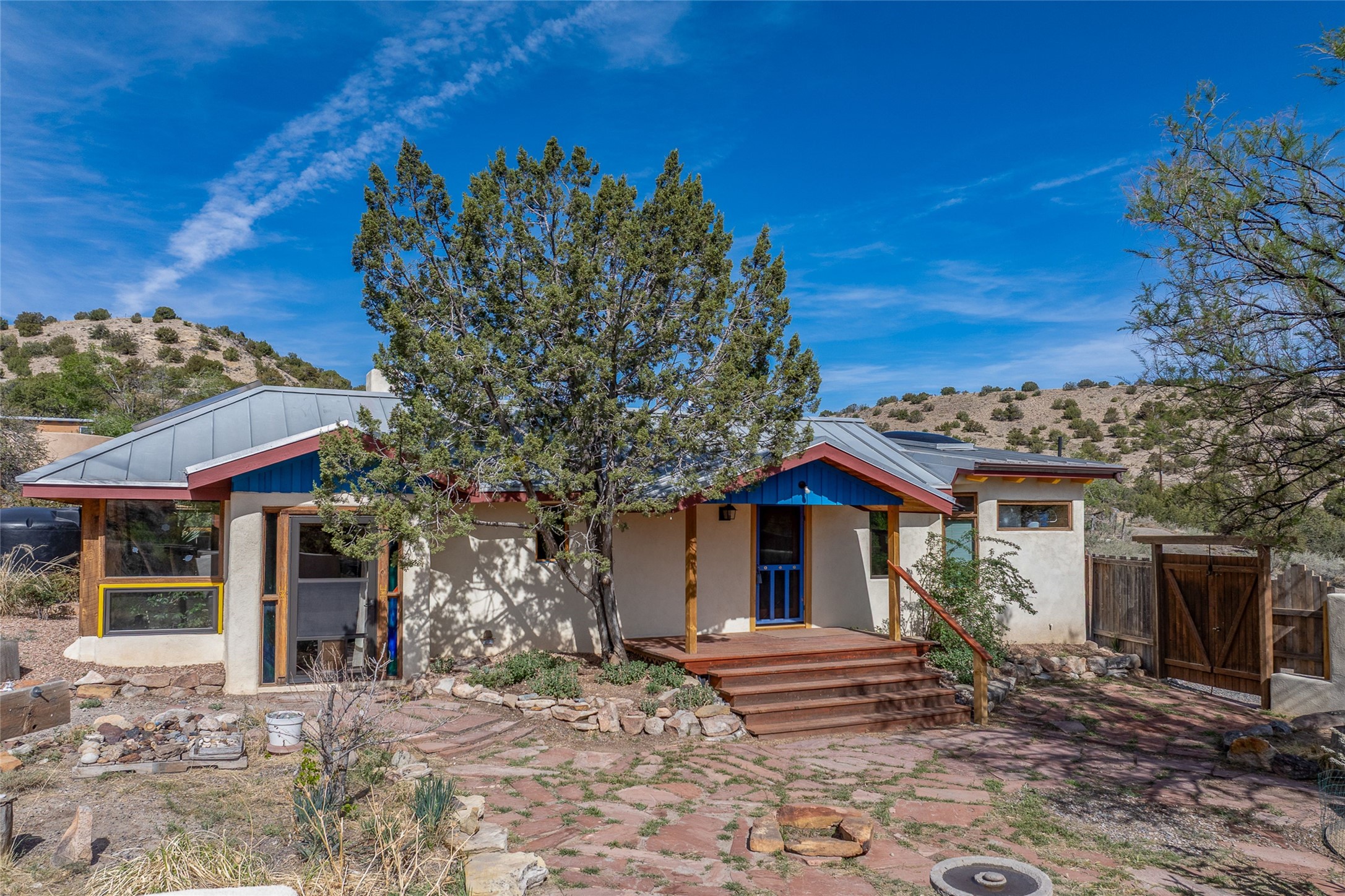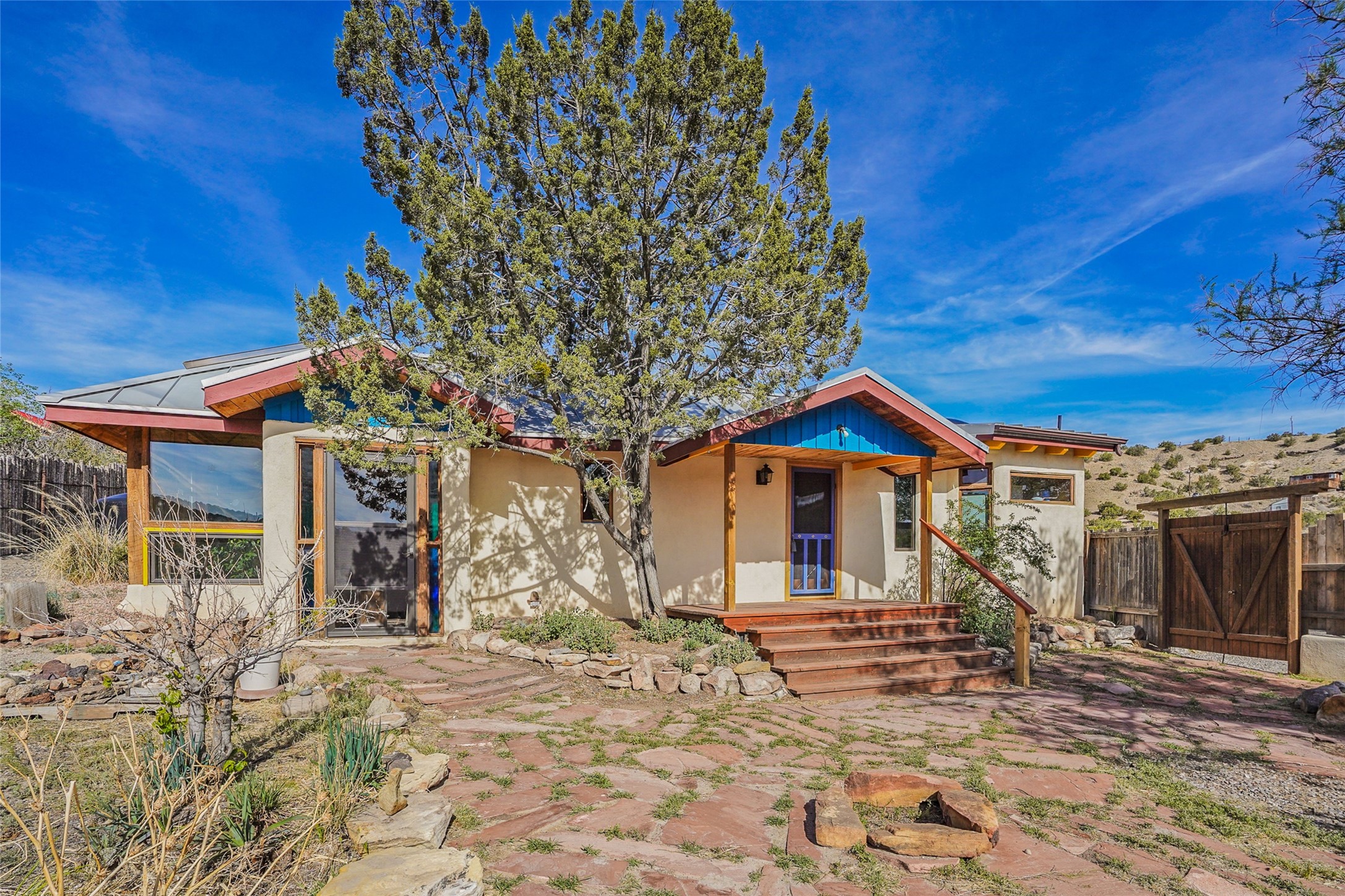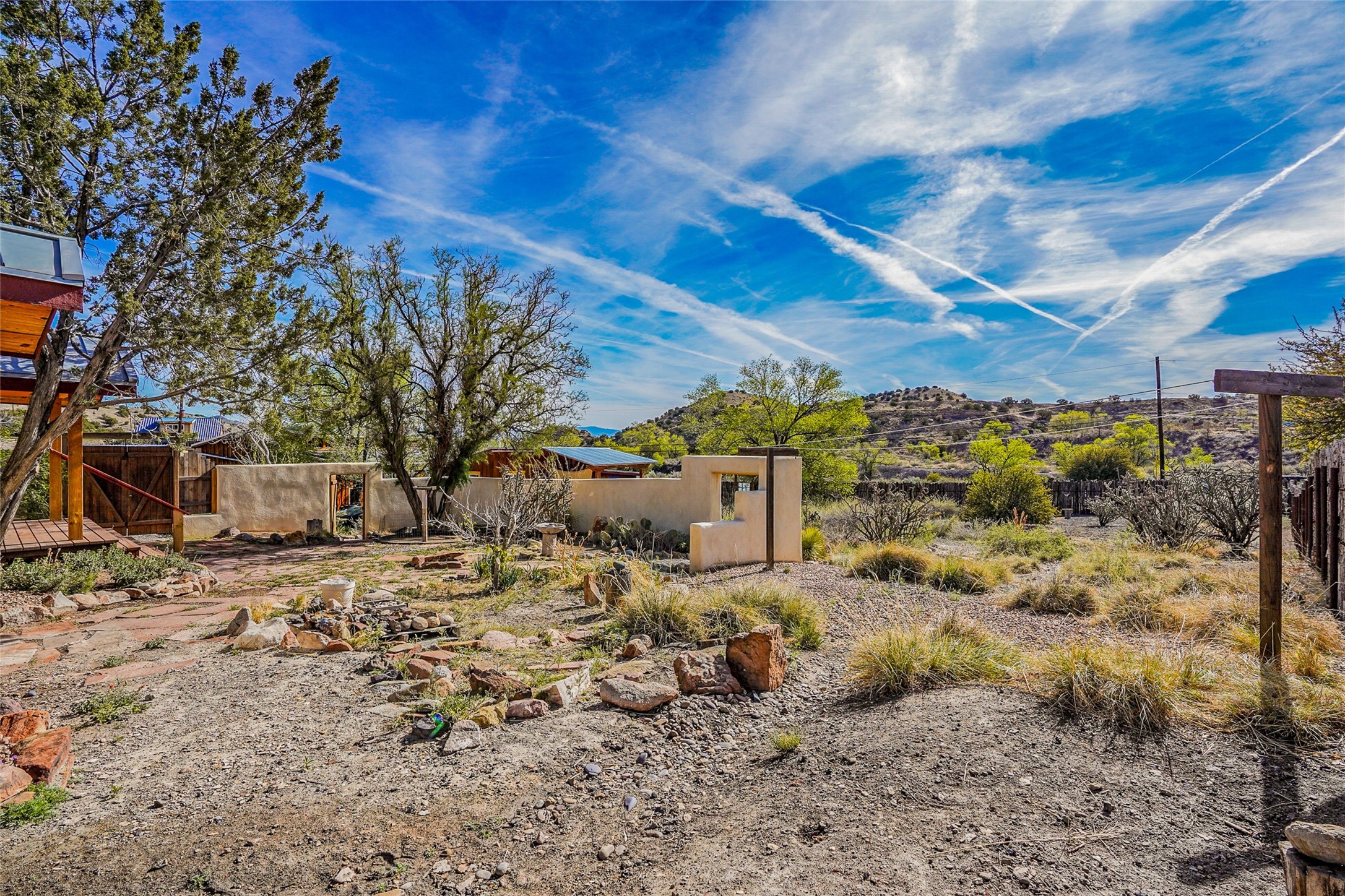 Nestled in the heart of historic Madrid village and close to the County greenbelt, this unique .64-acre property offers a blend of charm and functionality. It features a 972-square-foot artistic main home, a 443-square-foot studio complete bath with shower and sink, and a bright, spacious 750-square-foot workshop. The workshop is equipped with a wood stove for heating and a mini-split system that also provides heating and cooling. The main home showcases partial adobe construction, a sunlit atrium, a two-way kiva fireplace, and a bathroom featuring a clawfoot tub. The property consists of two legally recorded lots. Both the studio and the main house open to an expansive fenced yard with secure coyote fencing, ideal for pets. Just off the kitchen's patio doors lies a tranquil patio space, adding to the peaceful ambiance. This property is part of a lively, creative community with coffee shop, galleries, restaurants, and a general store--all within walking distance. Its location offers convenient access to Albuquerque and Santa Fe via the scenic Turquoise Trail. A perfect blend of artistry, community, and work-at-home possibilities awaits.