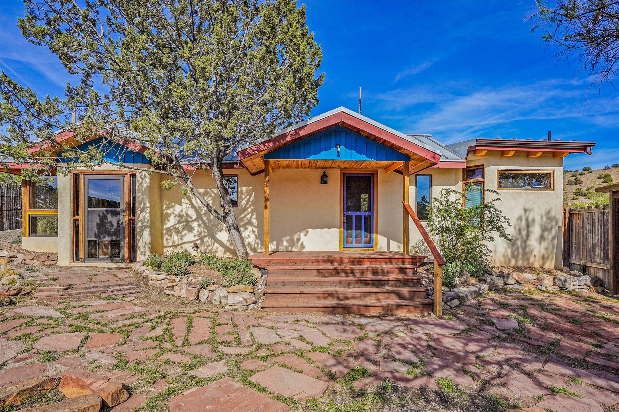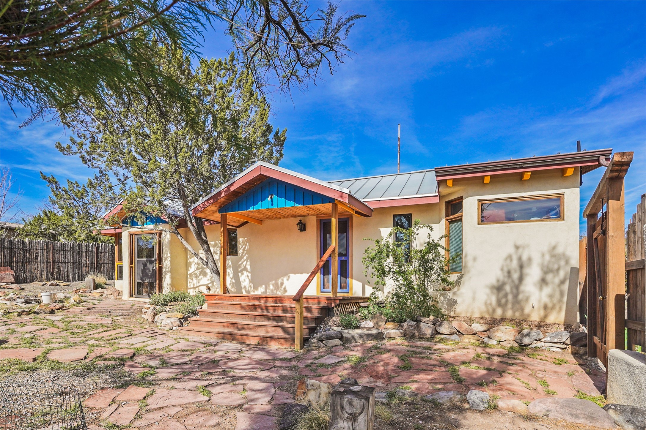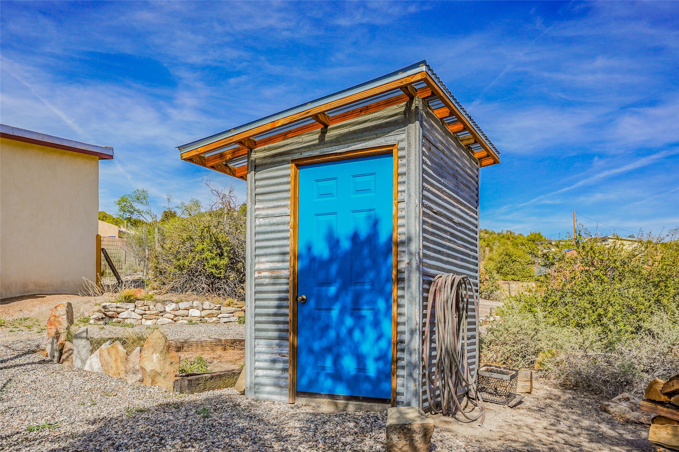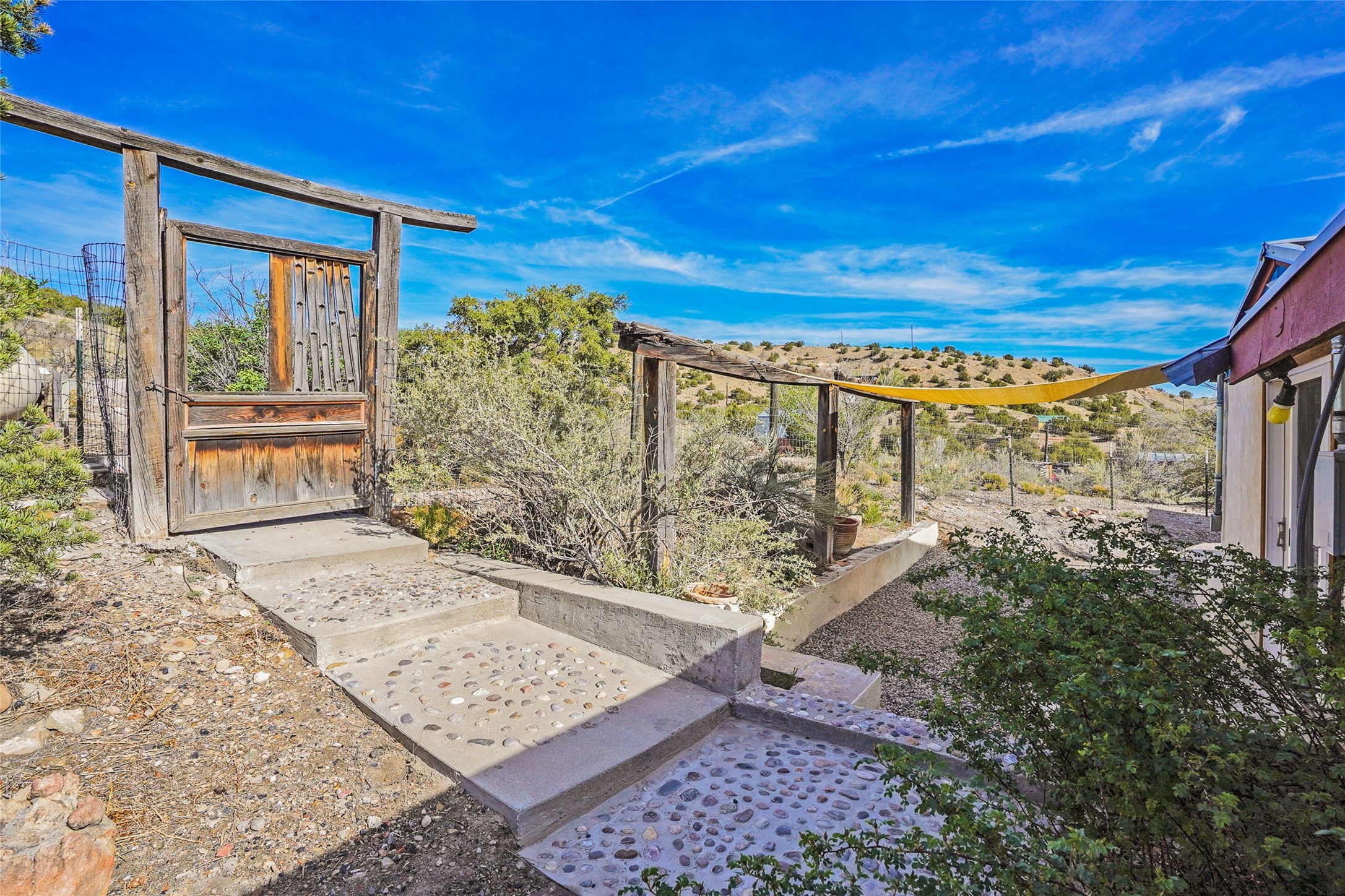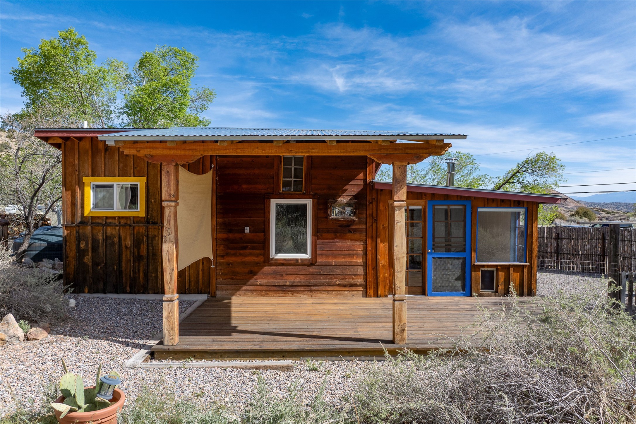 Nestled in the heart of historic Madrid village and close to the County greenbelt, this unique .64-acre property offers a blend of charm and functionality. It features a 972-square-foot artistic main home, a 443-square-foot studio complete bath with shower and sink, and a bright, spacious 750-square-foot workshop. The workshop is equipped with a wood stove for heating and a mini-split system that also provides heating and cooling. The main home showcases partial adobe construction, a sunlit atrium, a two-way kiva fireplace, and a bathroom featuring a clawfoot tub. The property consists of two legally recorded lots. Both the studio and the main house open to an expansive fenced yard with secure coyote fencing, ideal for pets. Just off the kitchen's patio doors lies a tranquil patio space, adding to the peaceful ambiance. This property is part of a lively, creative community with coffee shop, galleries, restaurants, and a general store--all within walking distance. Its location offers convenient access to Albuquerque and Santa Fe via the scenic Turquoise Trail. A perfect blend of artistry, community, and work-at-home possibilities awaits.