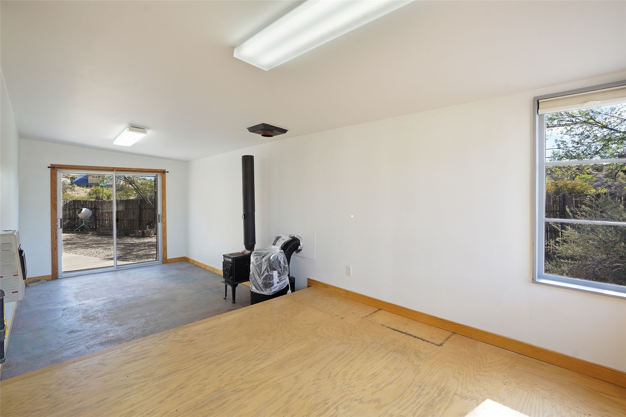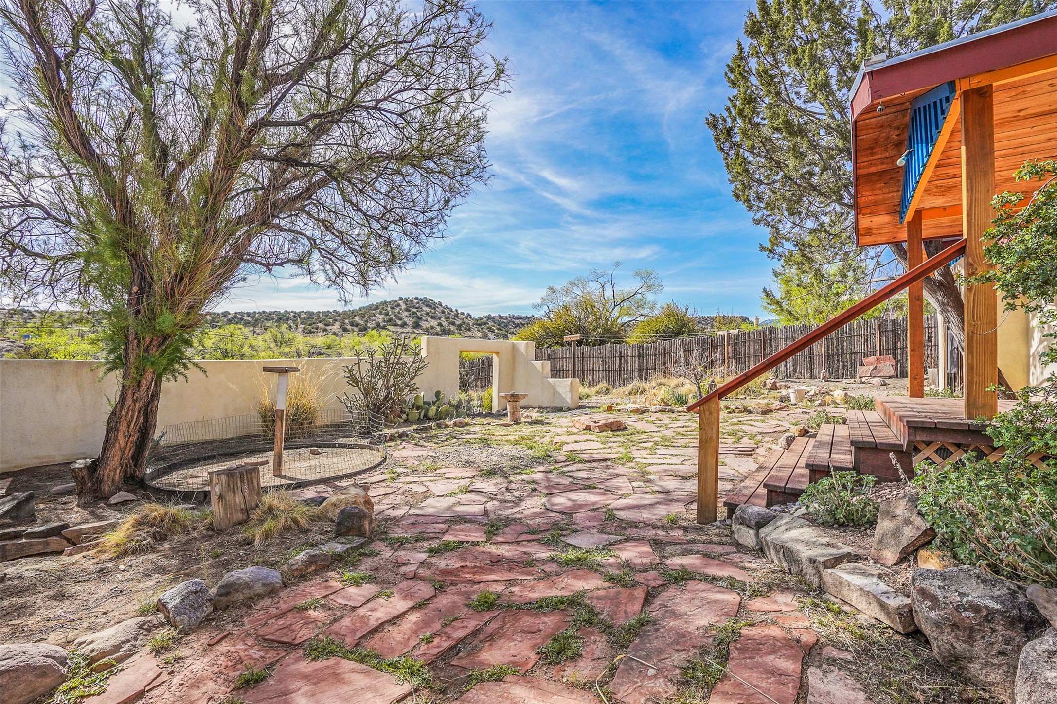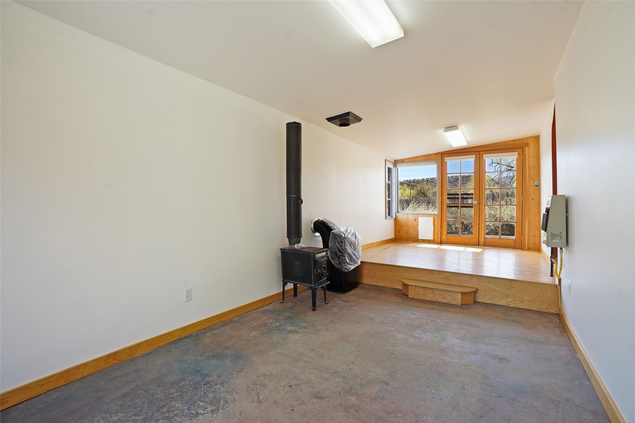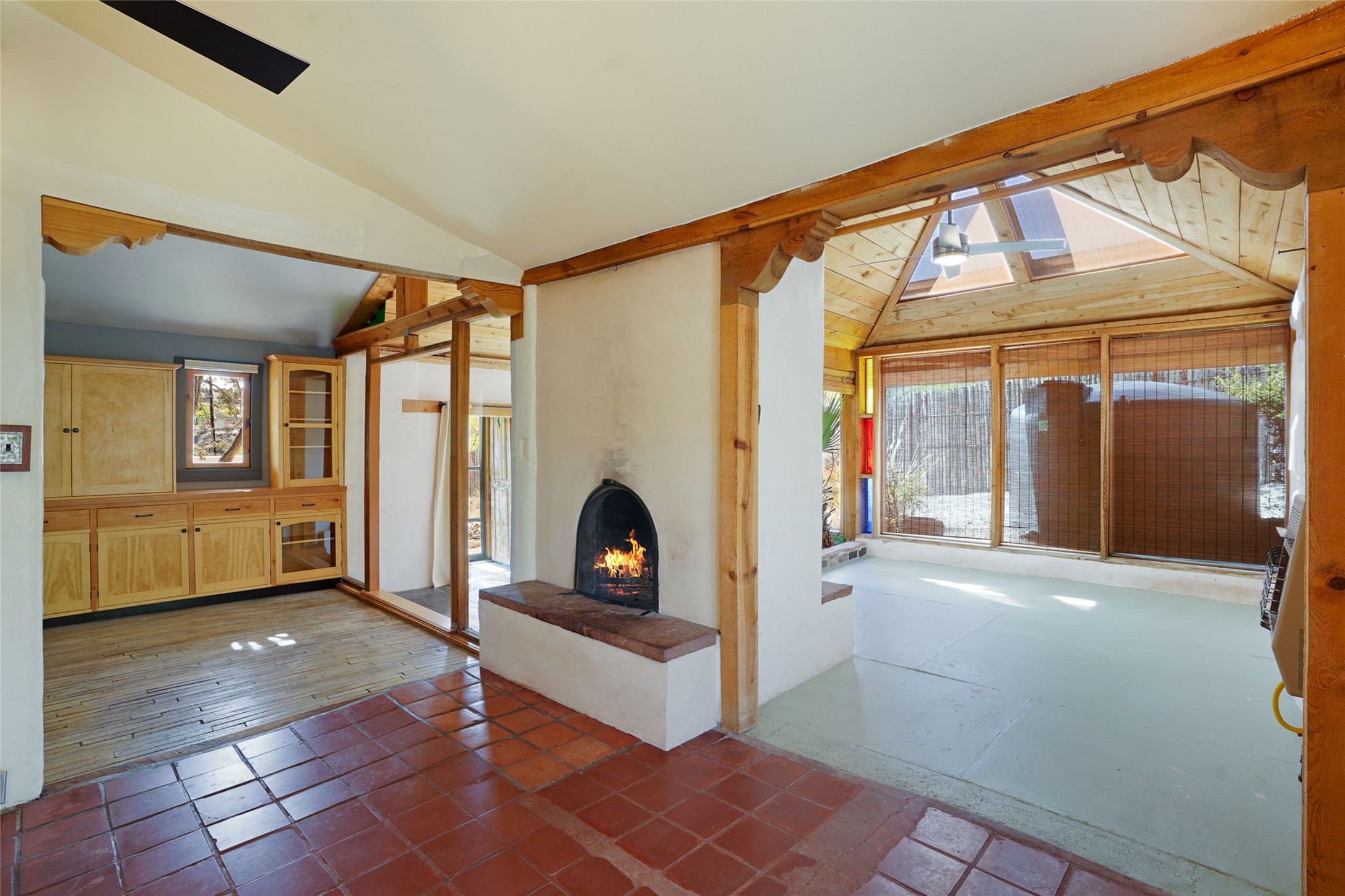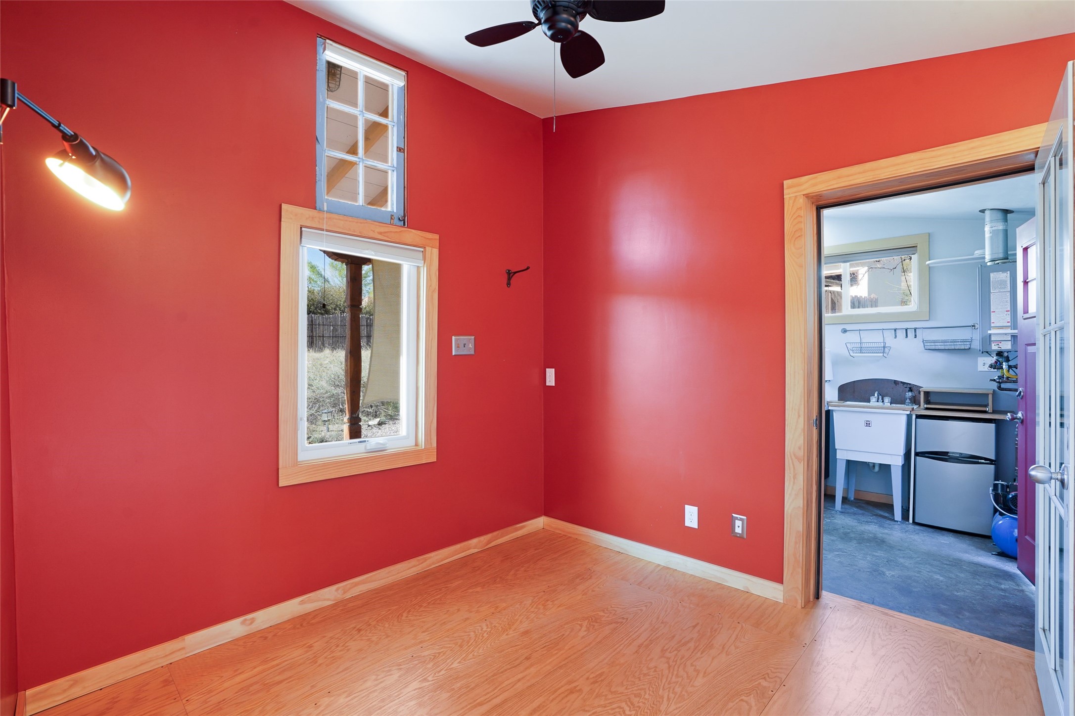 Nestled in the heart of historic Madrid village and close to the County greenbelt, this unique .64-acre property offers a blend of charm and functionality. It features a 972-square-foot artistic main home, a 443-square-foot studio complete bath with shower and sink, and a bright, spacious 750-square-foot workshop. The workshop is equipped with a wood stove for heating and a mini-split system that also provides heating and cooling. The main home showcases partial adobe construction, a sunlit atrium, a two-way kiva fireplace, and a bathroom featuring a clawfoot tub. The property consists of two legally recorded lots. Both the studio and the main house open to an expansive fenced yard with secure coyote fencing, ideal for pets. Just off the kitchen's patio doors lies a tranquil patio space, adding to the peaceful ambiance. This property is part of a lively, creative community with coffee shop, galleries, restaurants, and a general store--all within walking distance. Its location offers convenient access to Albuquerque and Santa Fe via the scenic Turquoise Trail. A perfect blend of artistry, community, and work-at-home possibilities awaits.