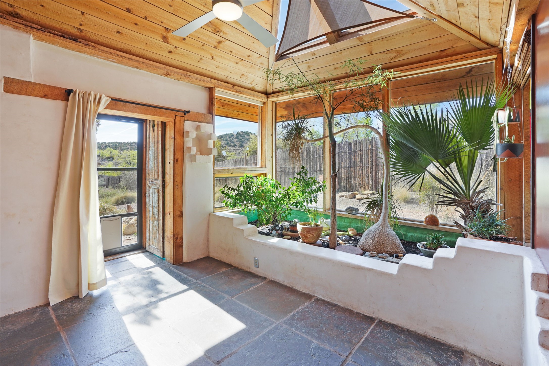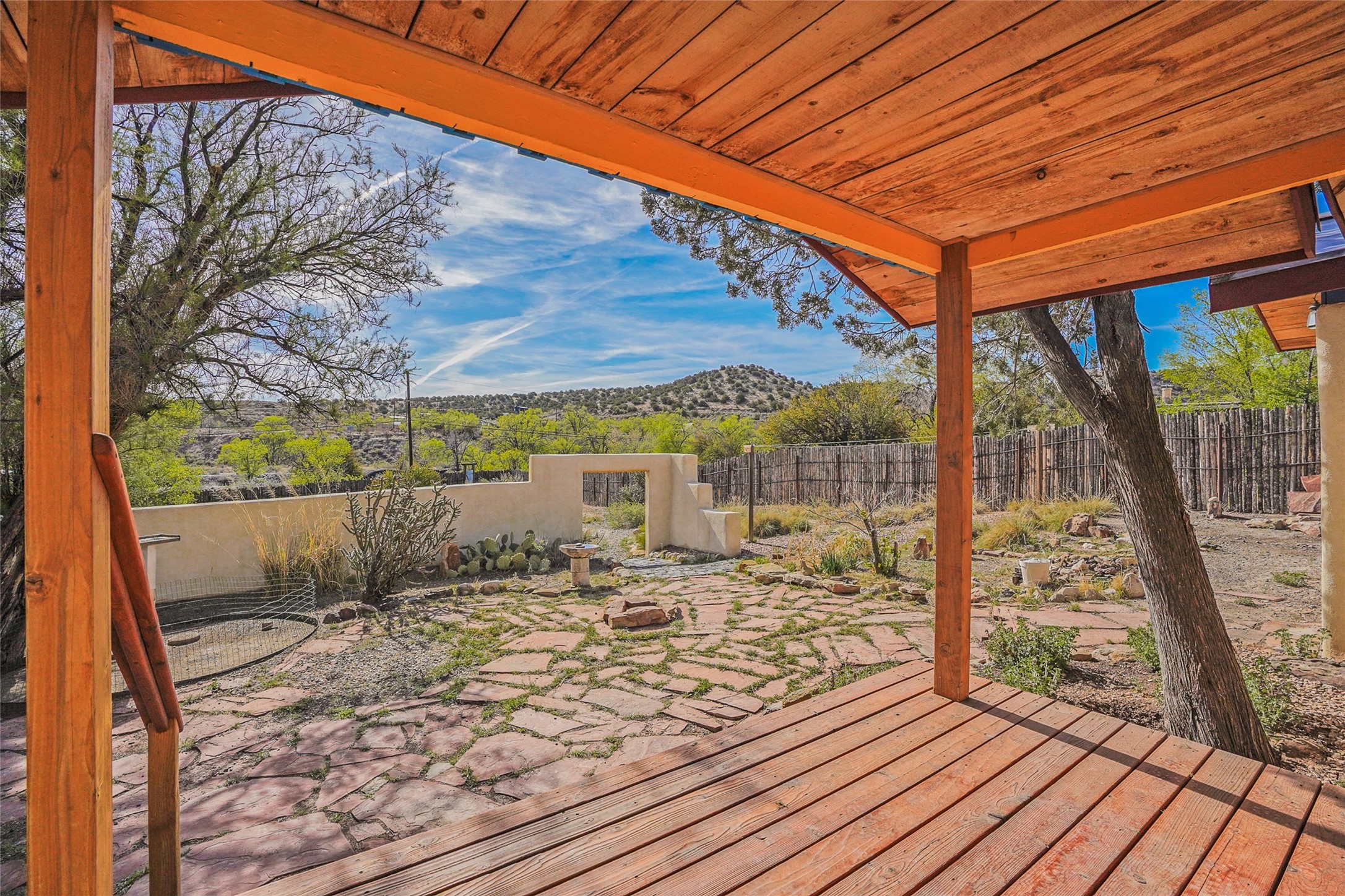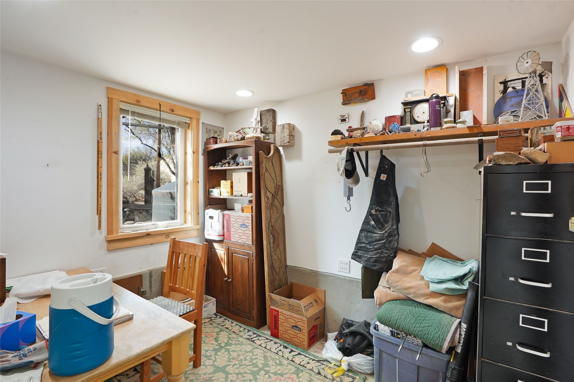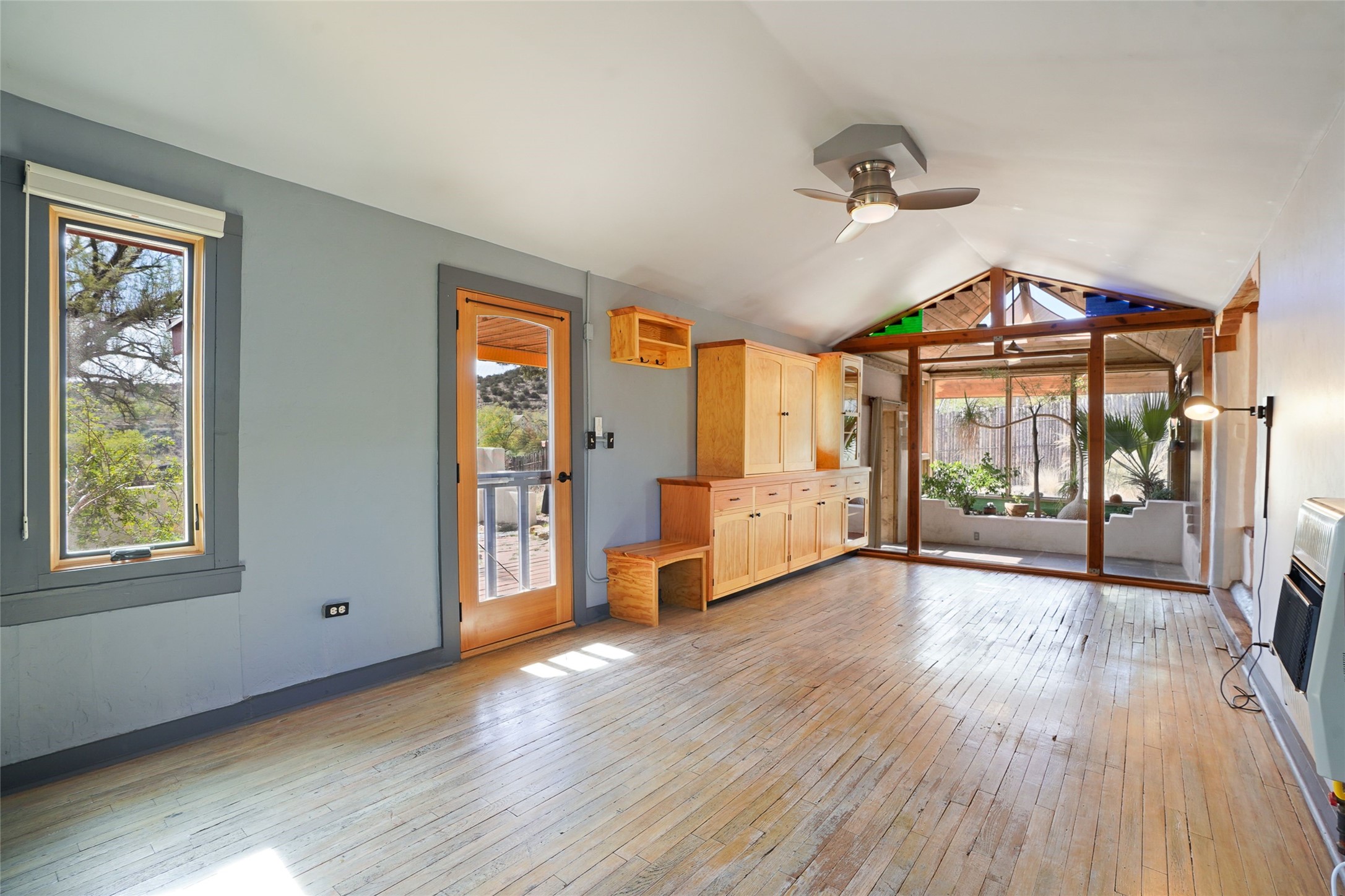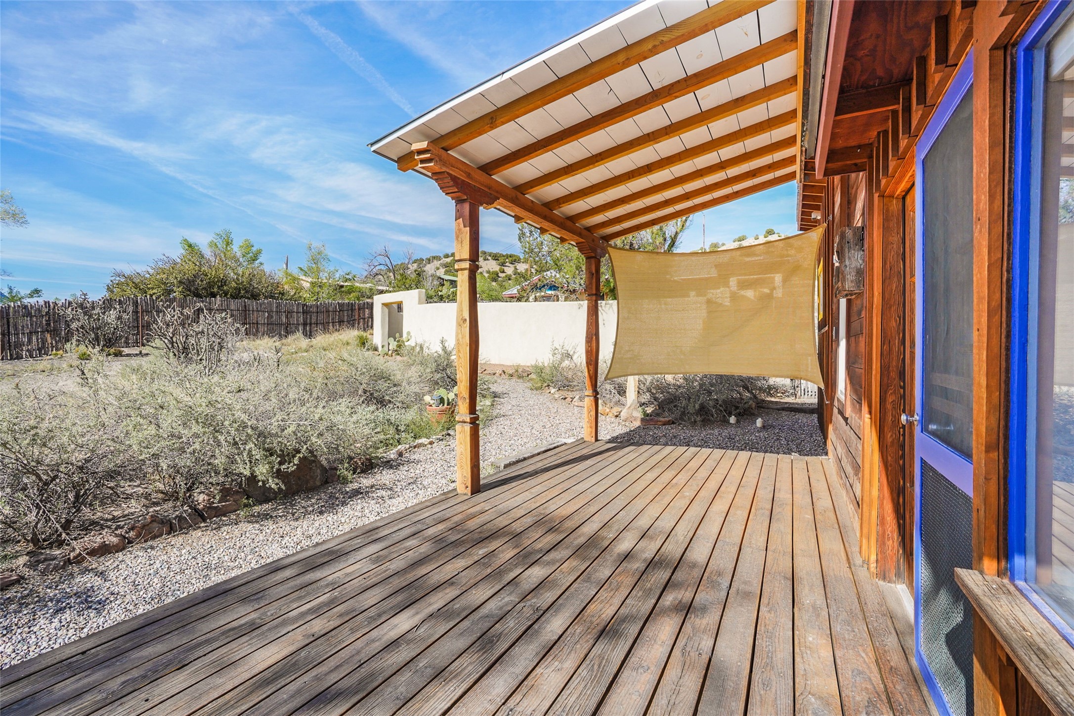 Nestled in the heart of historic Madrid village and close to the County greenbelt, this unique .64-acre property offers a blend of charm and functionality. It features a 972-square-foot artistic main home, a 443-square-foot studio complete bath with shower and sink, and a bright, spacious 750-square-foot workshop. The workshop is equipped with a wood stove for heating and a mini-split system that also provides heating and cooling. The main home showcases partial adobe construction, a sunlit atrium, a two-way kiva fireplace, and a bathroom featuring a clawfoot tub. The property consists of two legally recorded lots. Both the studio and the main house open to an expansive fenced yard with secure coyote fencing, ideal for pets. Just off the kitchen's patio doors lies a tranquil patio space, adding to the peaceful ambiance. This property is part of a lively, creative community with coffee shop, galleries, restaurants, and a general store--all within walking distance. Its location offers convenient access to Albuquerque and Santa Fe via the scenic Turquoise Trail. A perfect blend of artistry, community, and work-at-home possibilities awaits.