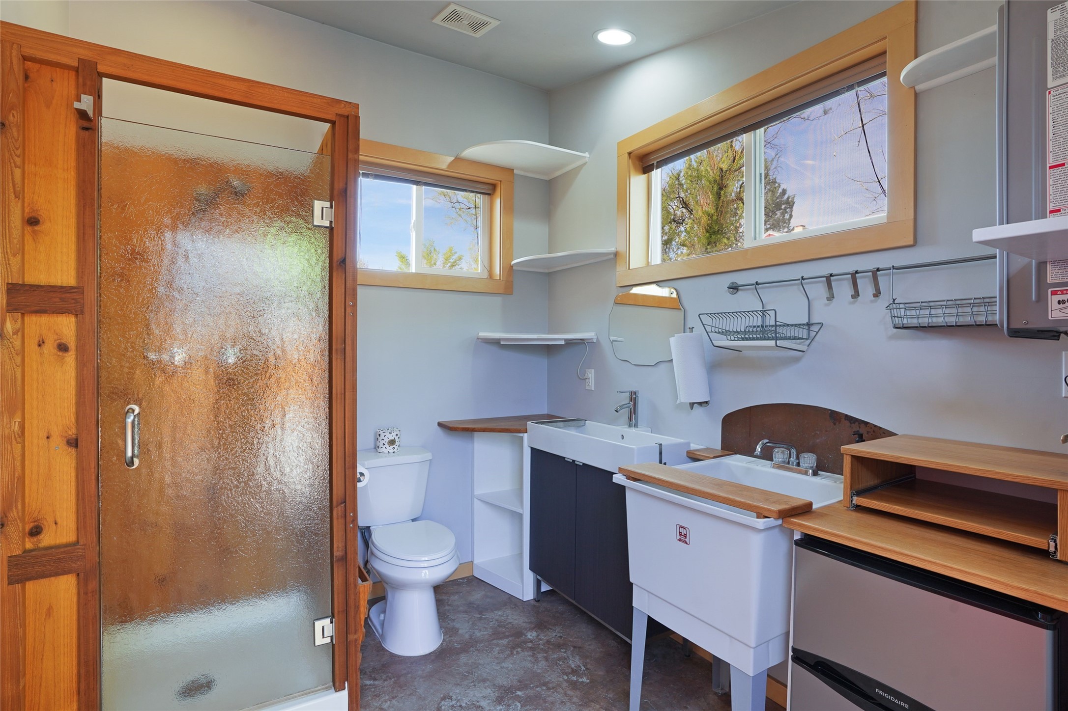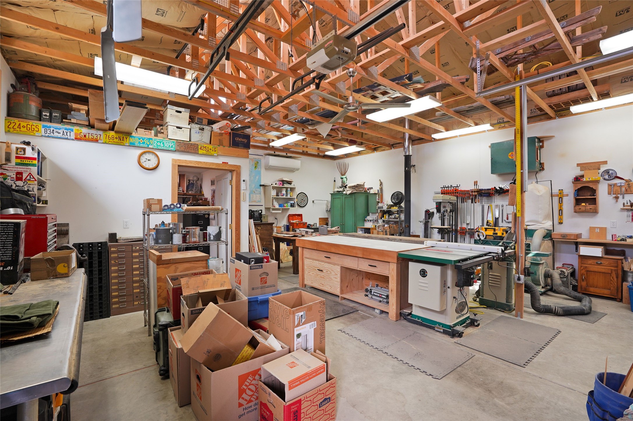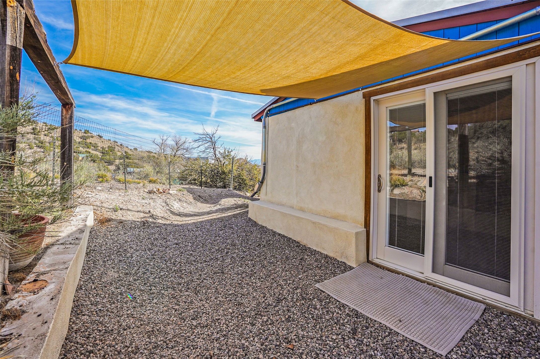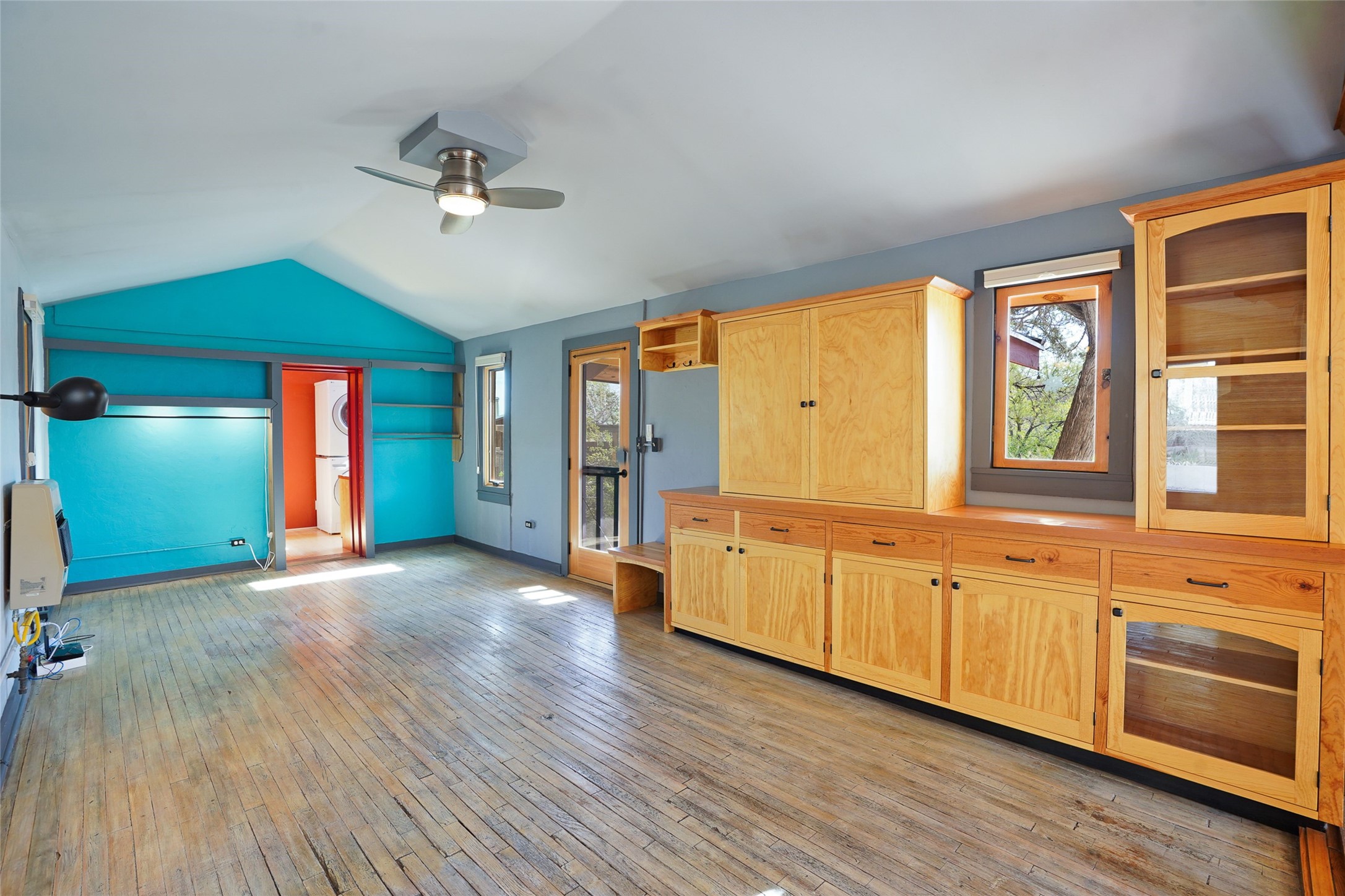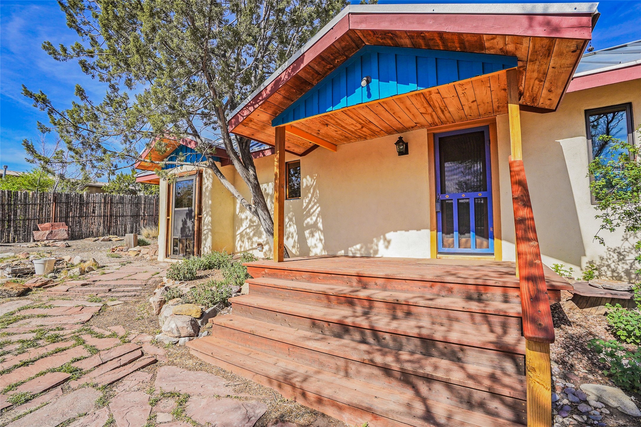 Nestled in the heart of historic Madrid village and close to the County greenbelt, this unique .64-acre property offers a blend of charm and functionality. It features a 972-square-foot artistic main home, a 443-square-foot studio complete bath with shower and sink, and a bright, spacious 750-square-foot workshop. The workshop is equipped with a wood stove for heating and a mini-split system that also provides heating and cooling. The main home showcases partial adobe construction, a sunlit atrium, a two-way kiva fireplace, and a bathroom featuring a clawfoot tub. The property consists of two legally recorded lots. Both the studio and the main house open to an expansive fenced yard with secure coyote fencing, ideal for pets. Just off the kitchen's patio doors lies a tranquil patio space, adding to the peaceful ambiance. This property is part of a lively, creative community with coffee shop, galleries, restaurants, and a general store--all within walking distance. Its location offers convenient access to Albuquerque and Santa Fe via the scenic Turquoise Trail. A perfect blend of artistry, community, and work-at-home possibilities awaits.