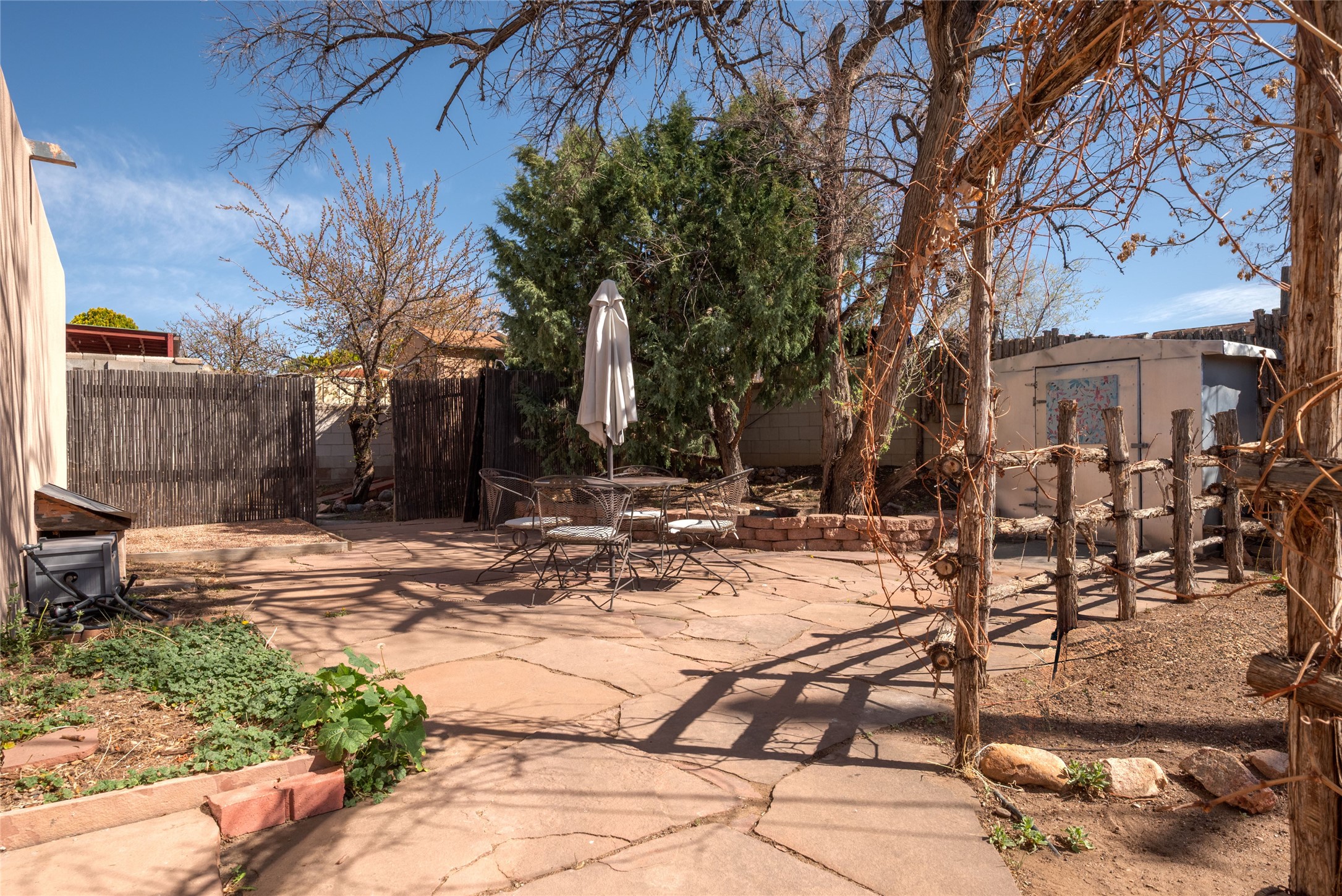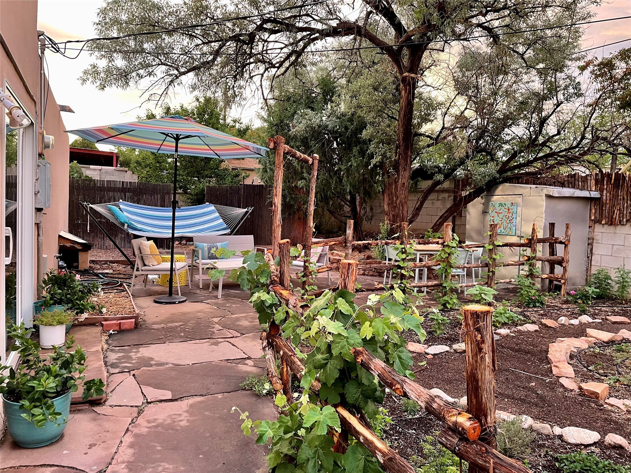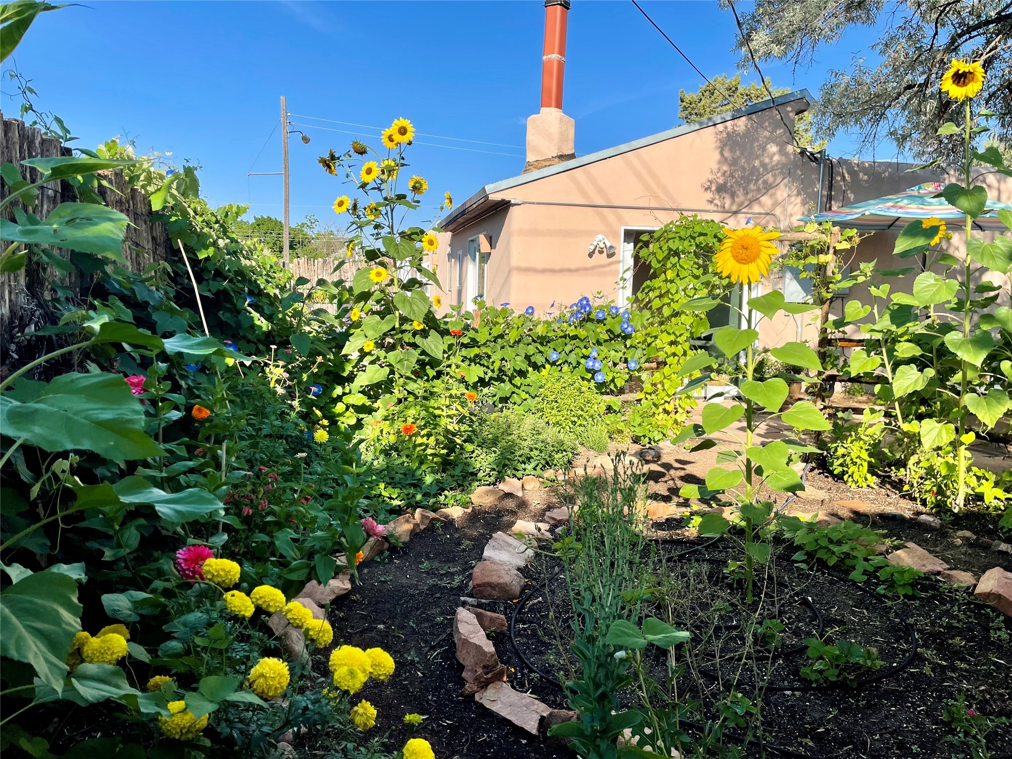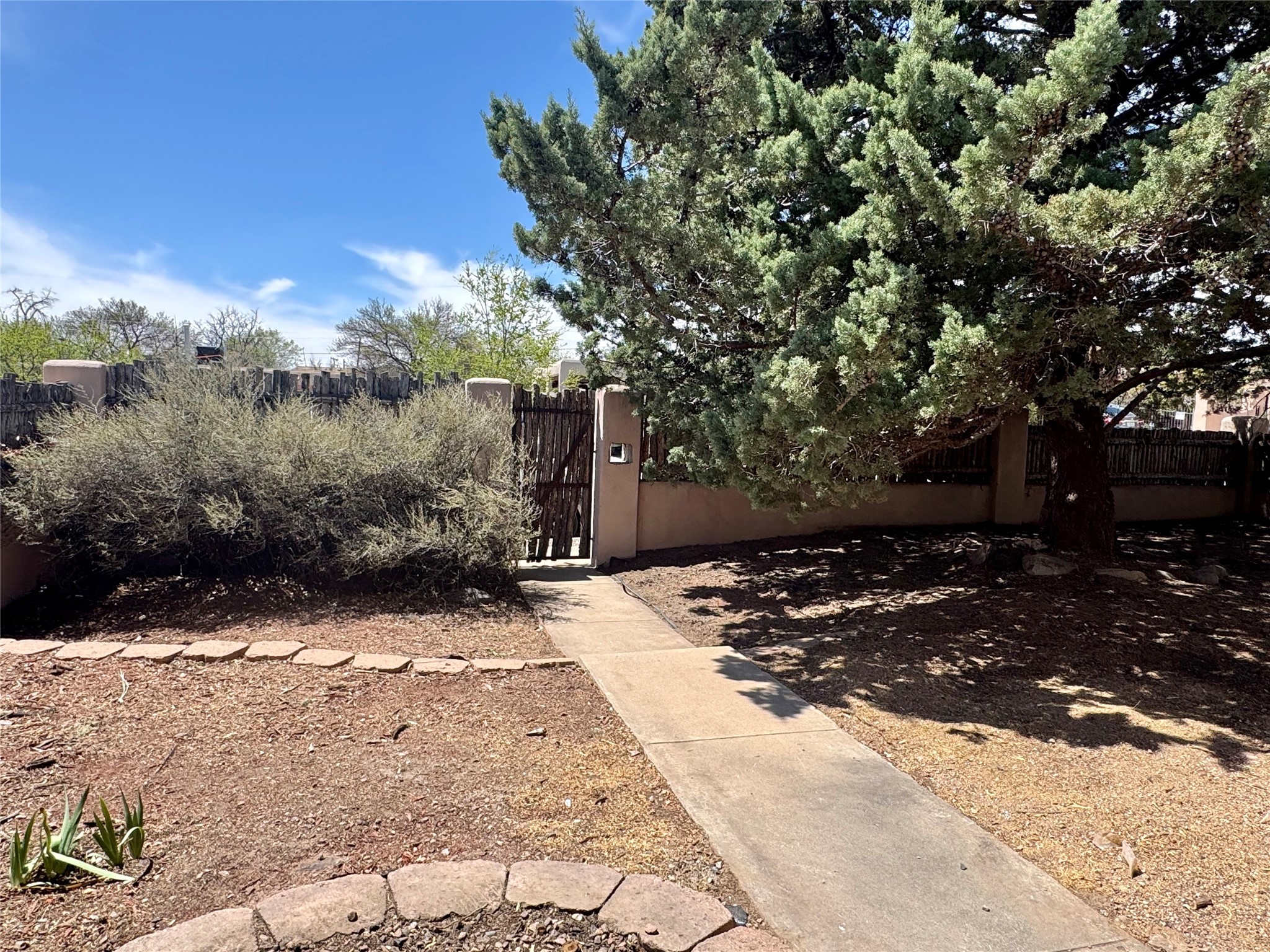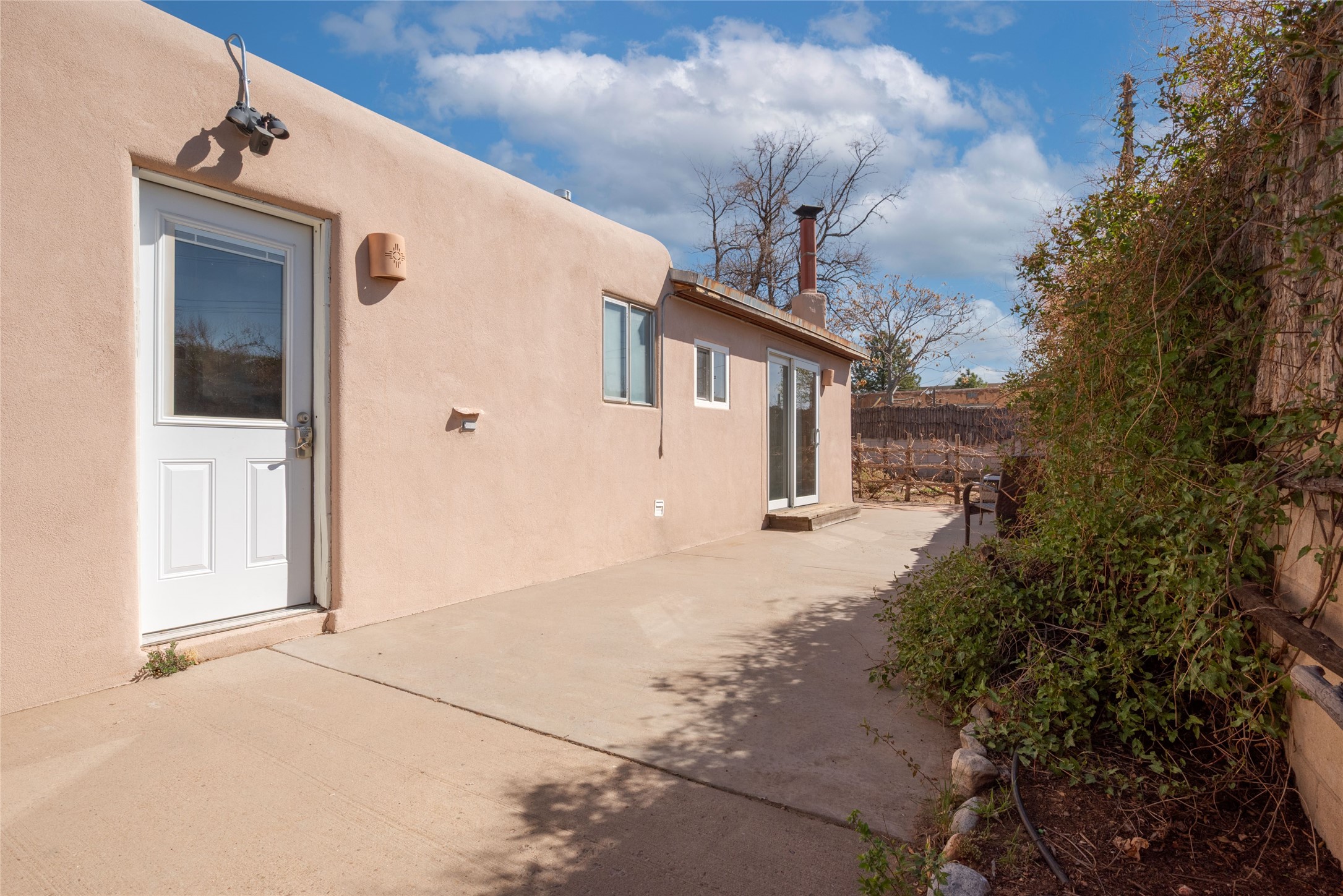 Life is sweet at this well-loved and charming home in mid-town Santa Fe. In summer, the spacious primary suite opens with two sliding doors onto a flagstone backyard with lush garden, and in winter, it is a cosy retreat with the kiva fireplace casting its glow. The front of the house features a living room, kitchen with bar seating and a flex space perfect for an office or dining room. New floors, furnace, and water heater were all added in the last 5 years. Seven skylights, a picture living room window, and a plant window make this a bright, happy home, and a workshop, two sheds, water catchment, pet door, motion detection lights, and an EV charger make this a practical home. The walled front yard with a mature tree offers perfect privacy (and a branch for a swing) while the side and back yards are a surprise delight. The garden has coyote fencing and a grapevine. You'll receive plenty of "volunteer" plants from seasons past, but there is room to make this garden your own. See summer photos. This house has sweet vibes.