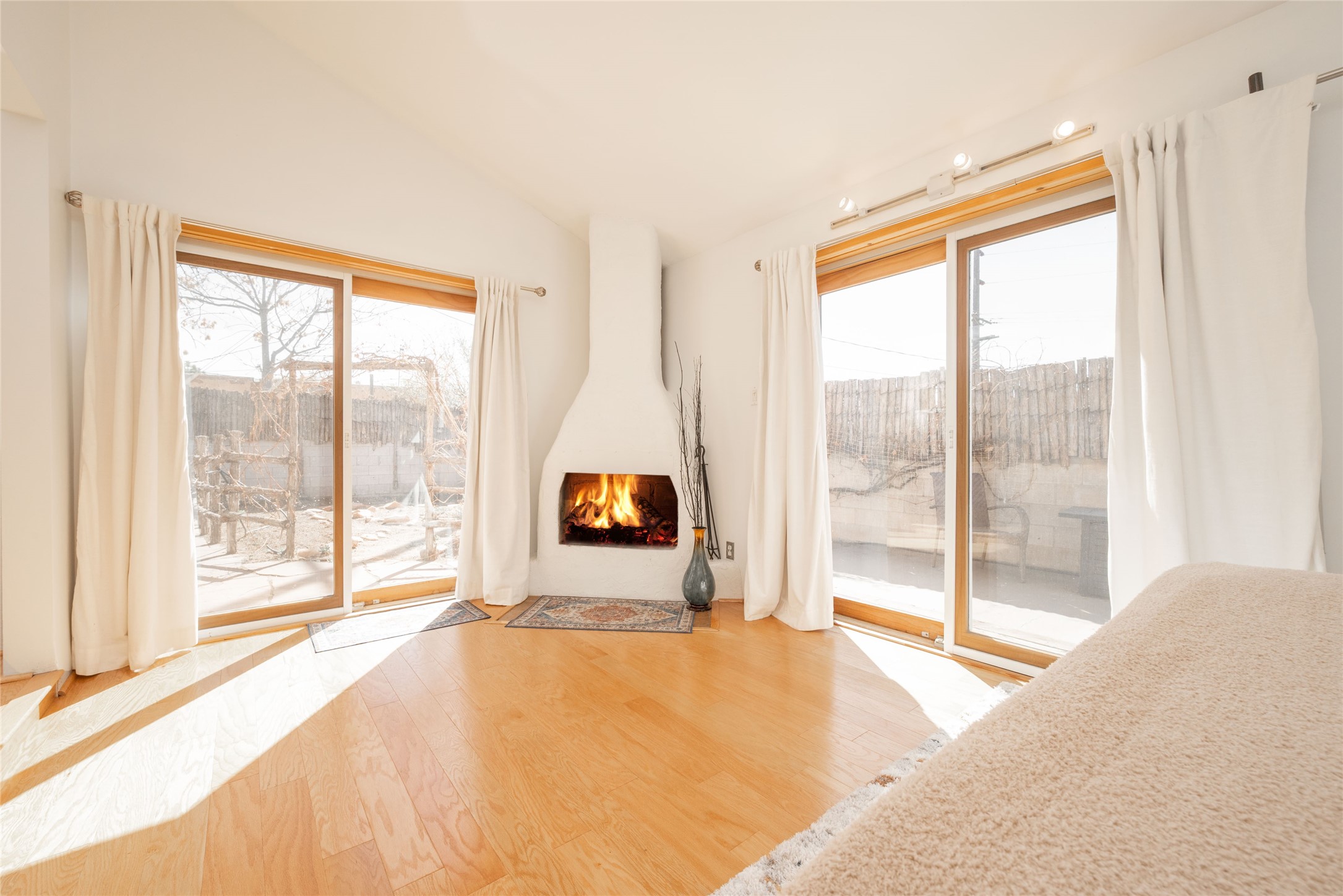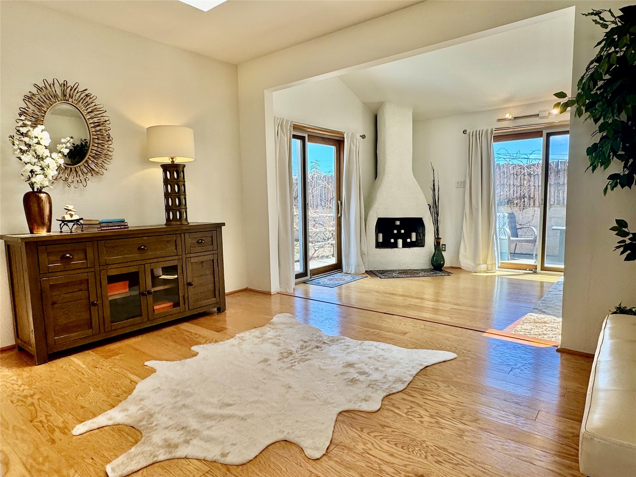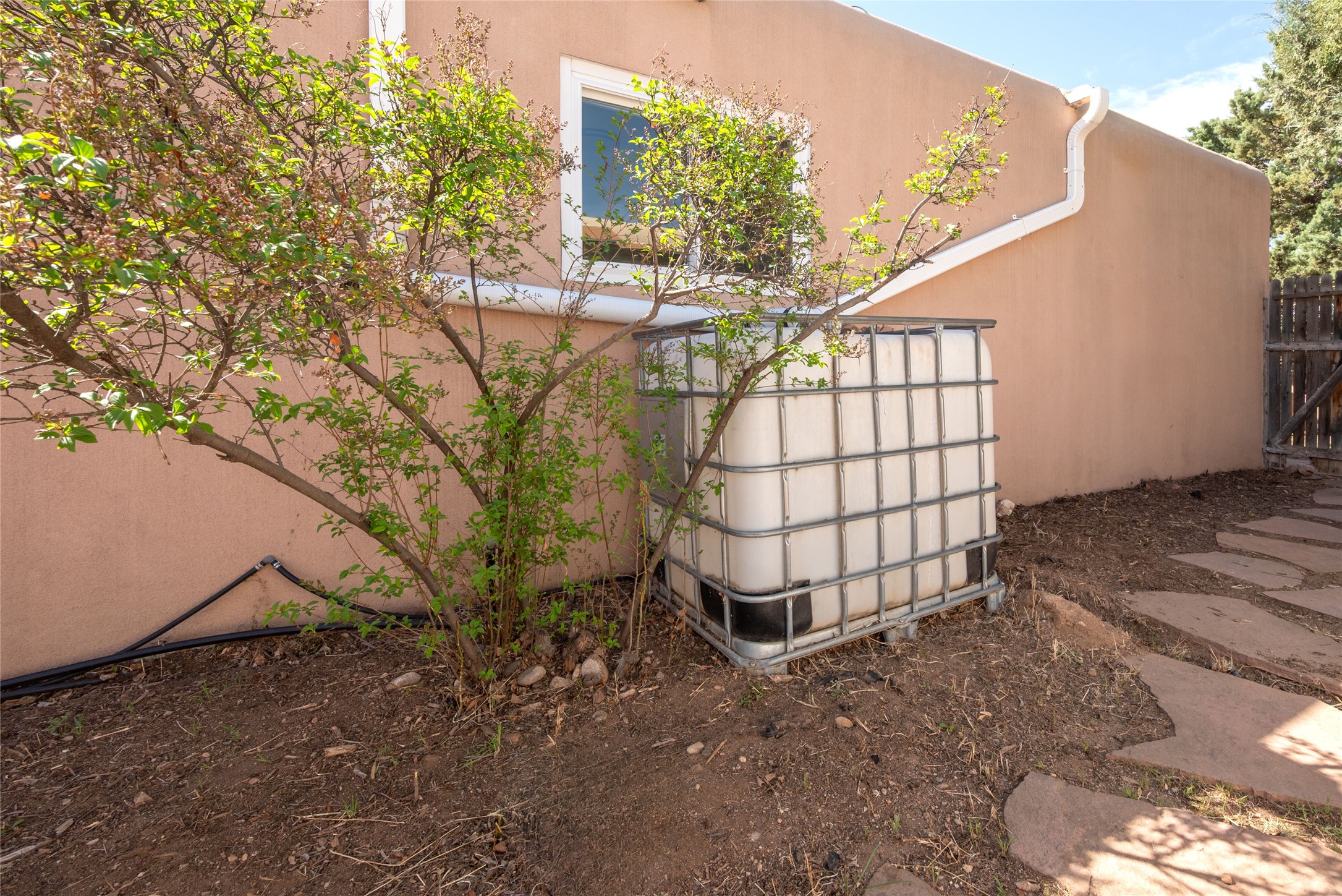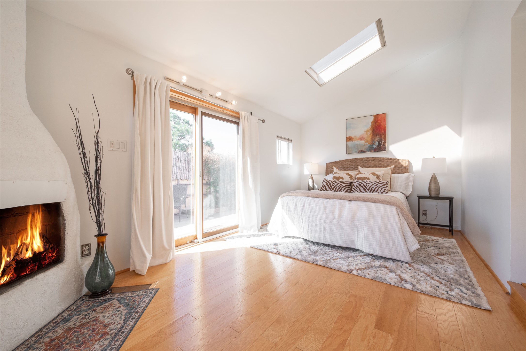 Life is sweet at this well-loved and charming home in mid-town Santa Fe. In summer, the spacious primary suite opens with two sliding doors onto a flagstone backyard with lush garden, and in winter, it is a cosy retreat with the kiva fireplace casting its glow. The front of the house features a living room, kitchen with bar seating and a flex space perfect for an office or dining room. New floors, furnace, and water heater were all added in the last 5 years. Seven skylights, a picture living room window, and a plant window make this a bright, happy home, and a workshop, two sheds, water catchment, pet door, motion detection lights, and an EV charger make this a practical home. The walled front yard with a mature tree offers perfect privacy (and a branch for a swing) while the side and back yards are a surprise delight. The garden has coyote fencing and a grapevine. You'll receive plenty of "volunteer" plants from seasons past, but there is room to make this garden your own. See summer photos. This house has sweet vibes.