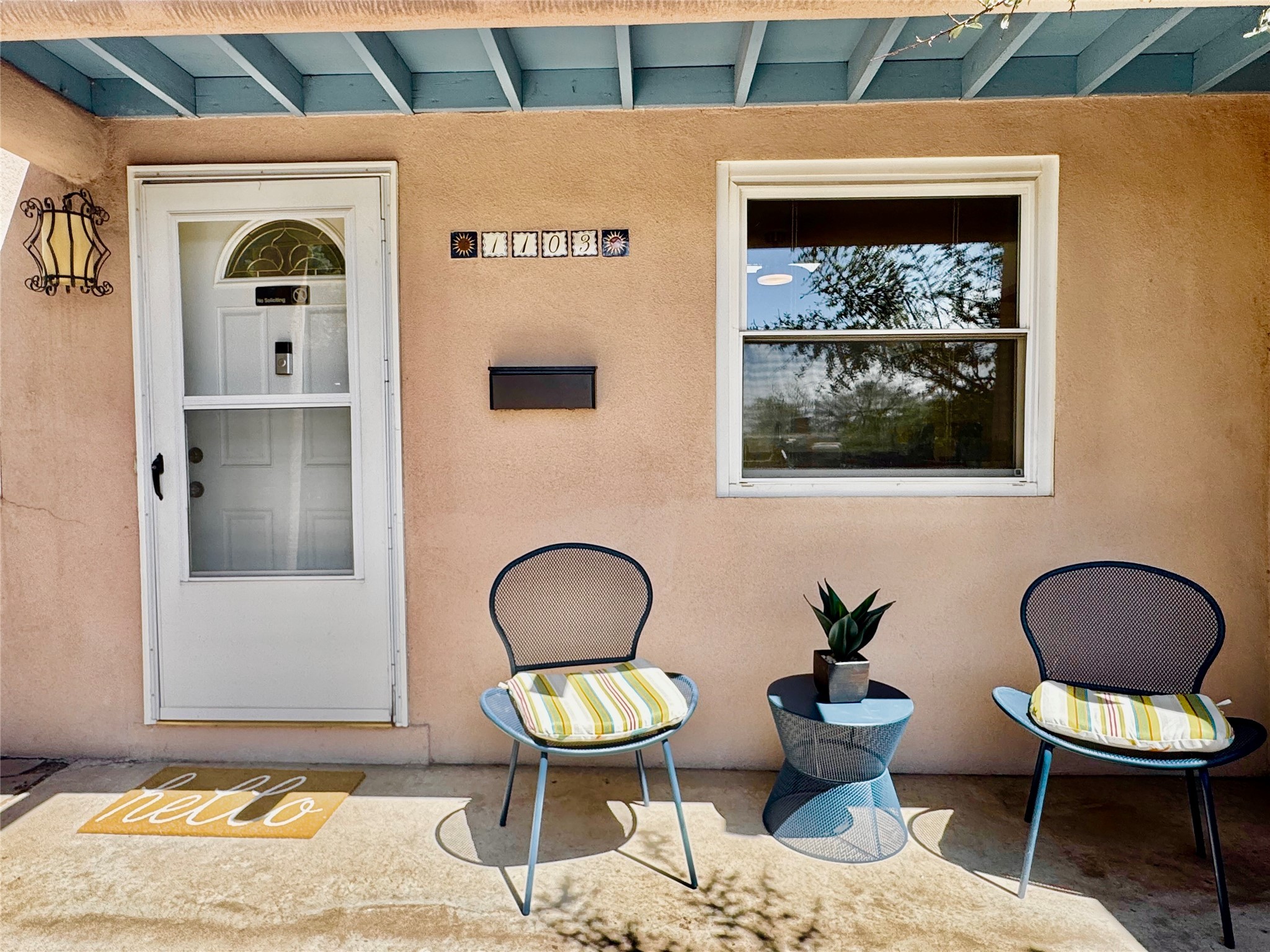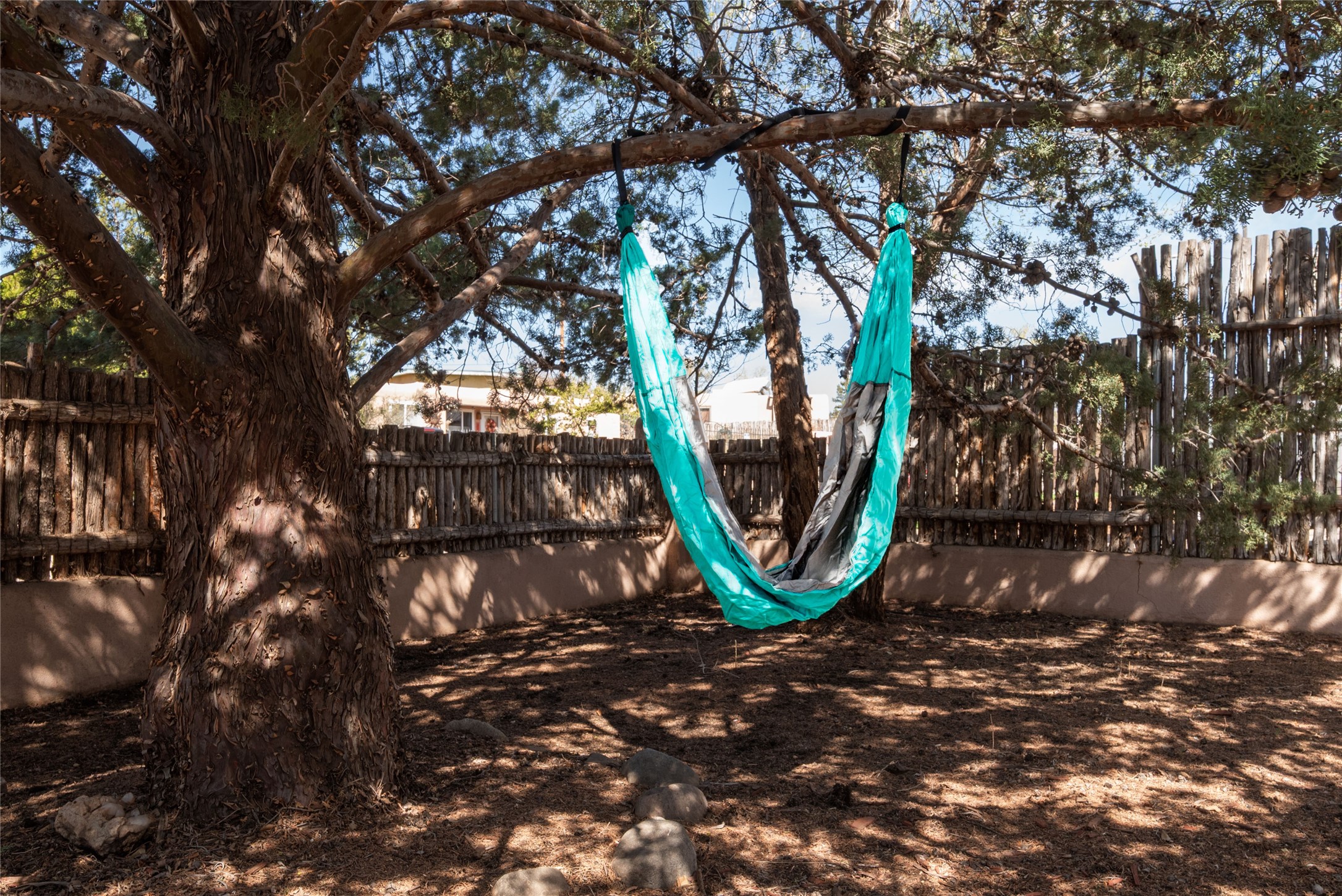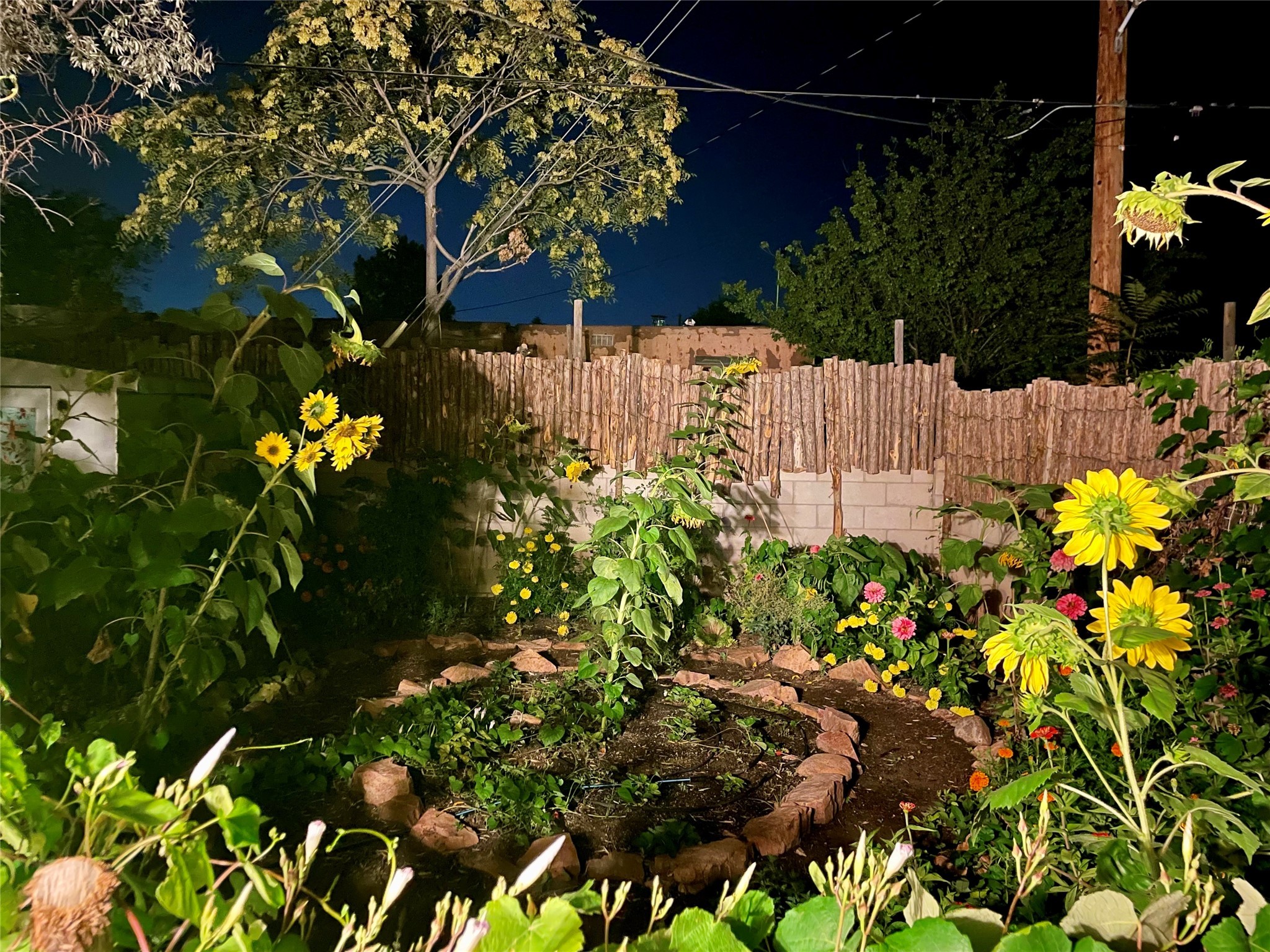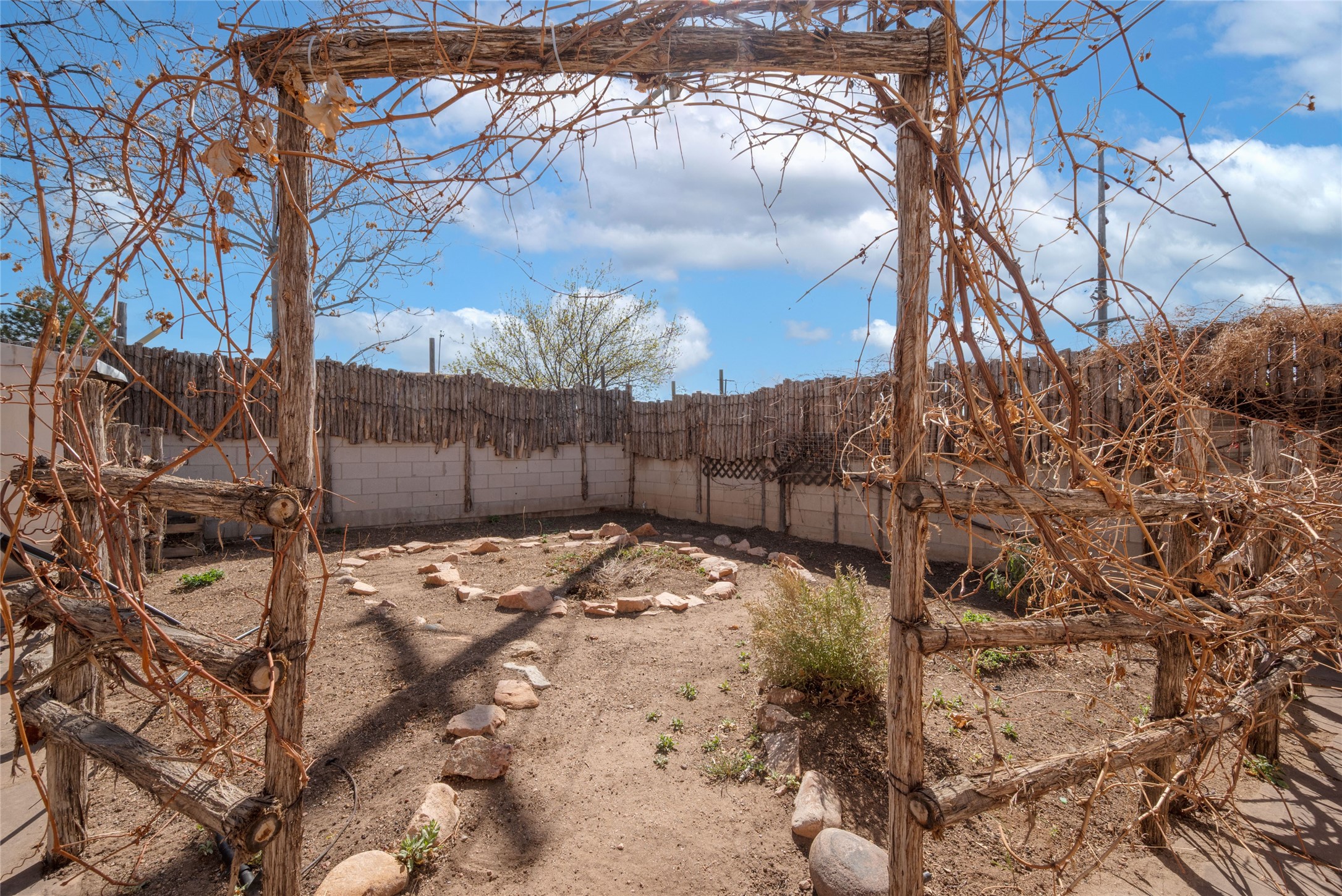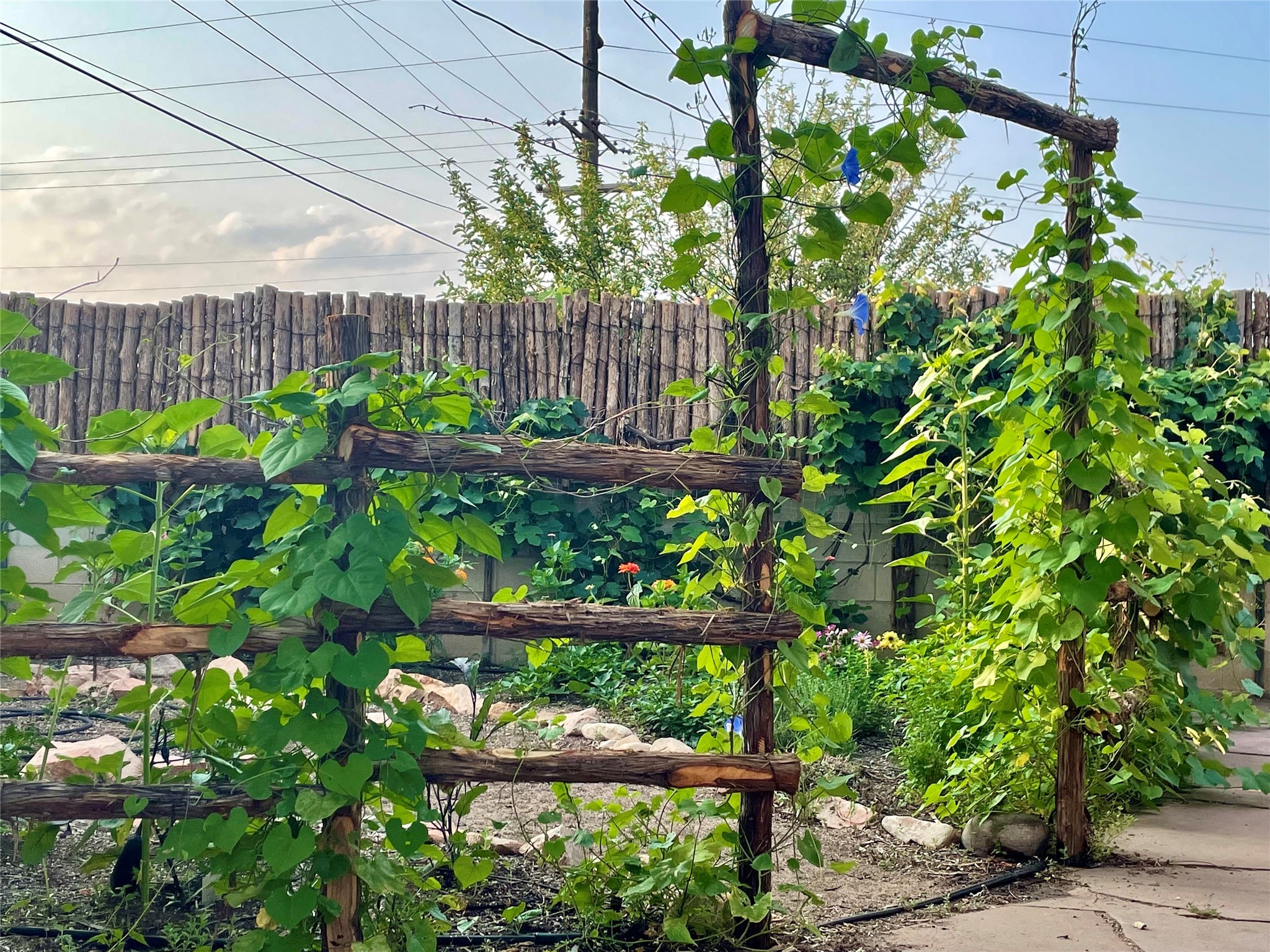 Life is sweet at this well-loved and charming home in mid-town Santa Fe. In summer, the spacious primary suite opens with two sliding doors onto a flagstone backyard with lush garden, and in winter, it is a cosy retreat with the kiva fireplace casting its glow. The front of the house features a living room, kitchen with bar seating and a flex space perfect for an office or dining room. New floors, furnace, and water heater were all added in the last 5 years. Seven skylights, a picture living room window, and a plant window make this a bright, happy home, and a workshop, two sheds, water catchment, pet door, motion detection lights, and an EV charger make this a practical home. The walled front yard with a mature tree offers perfect privacy (and a branch for a swing) while the side and back yards are a surprise delight. The garden has coyote fencing and a grapevine. You'll receive plenty of "volunteer" plants from seasons past, but there is room to make this garden your own. See summer photos. This house has sweet vibes.
