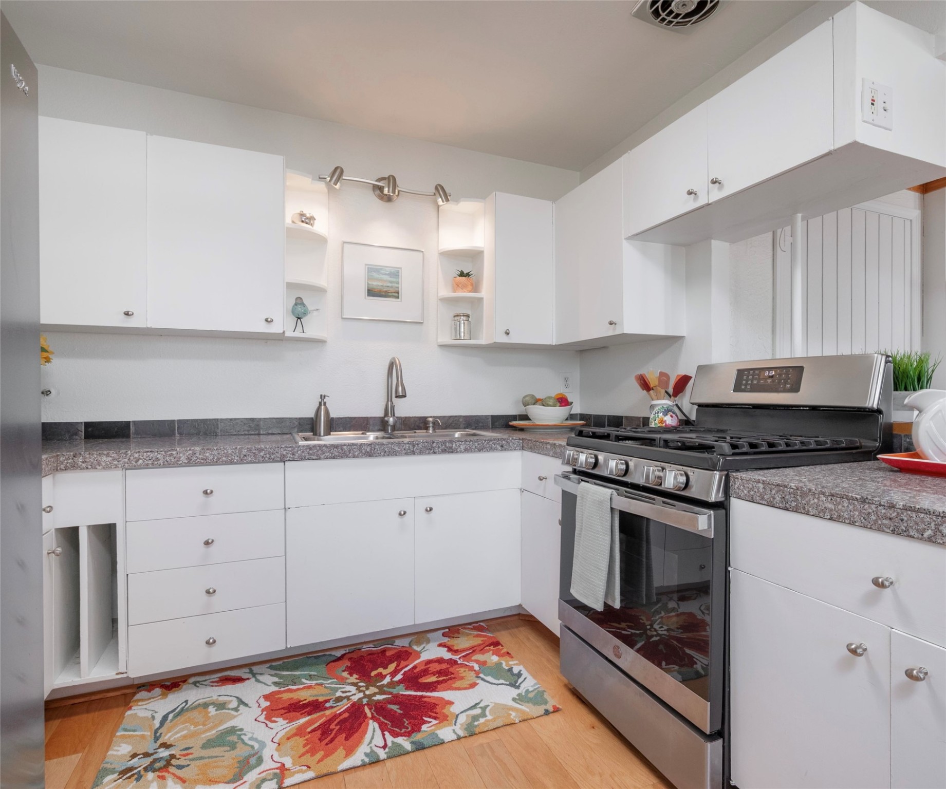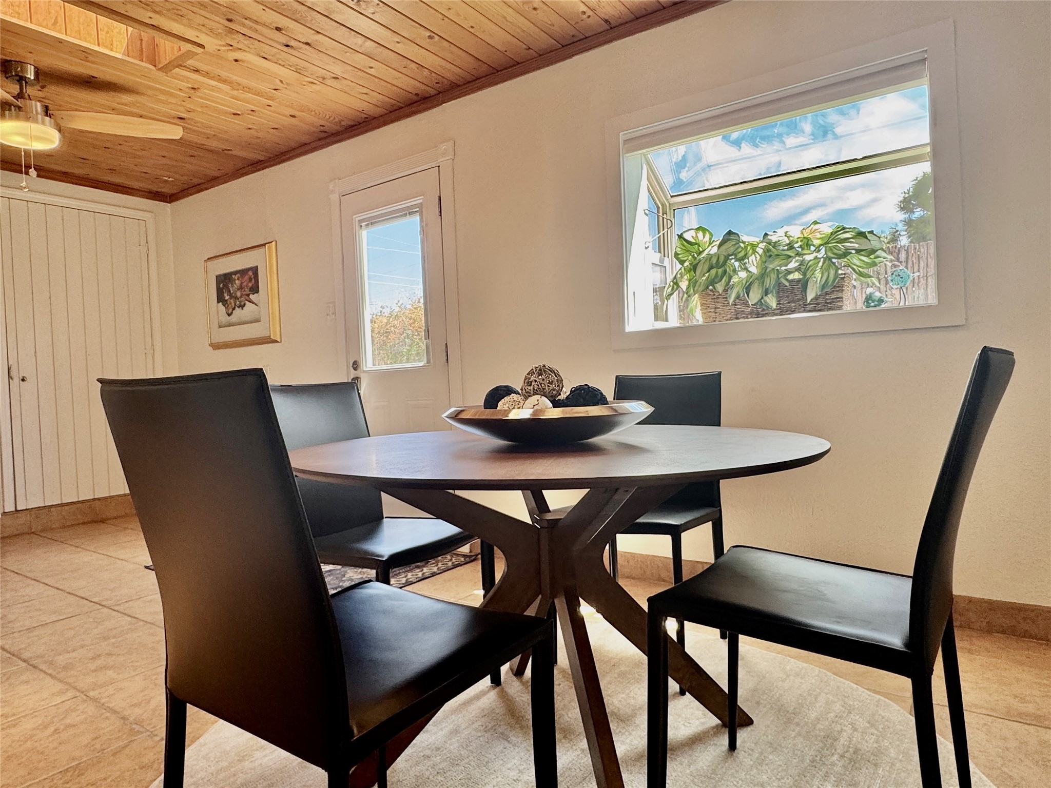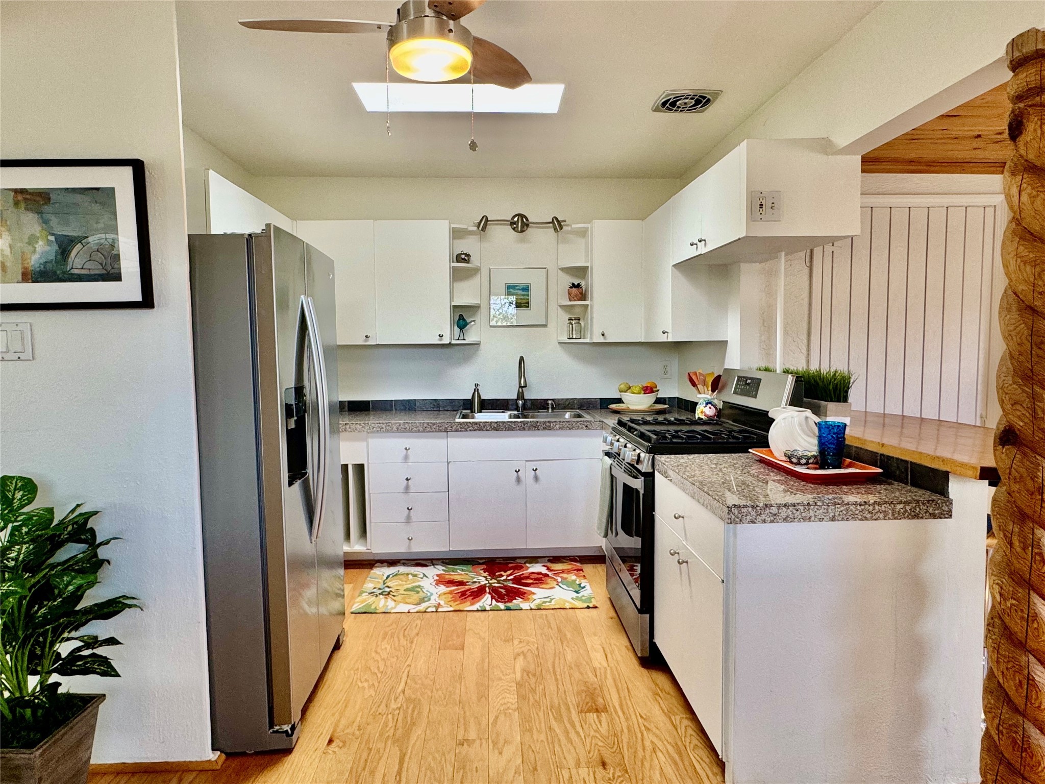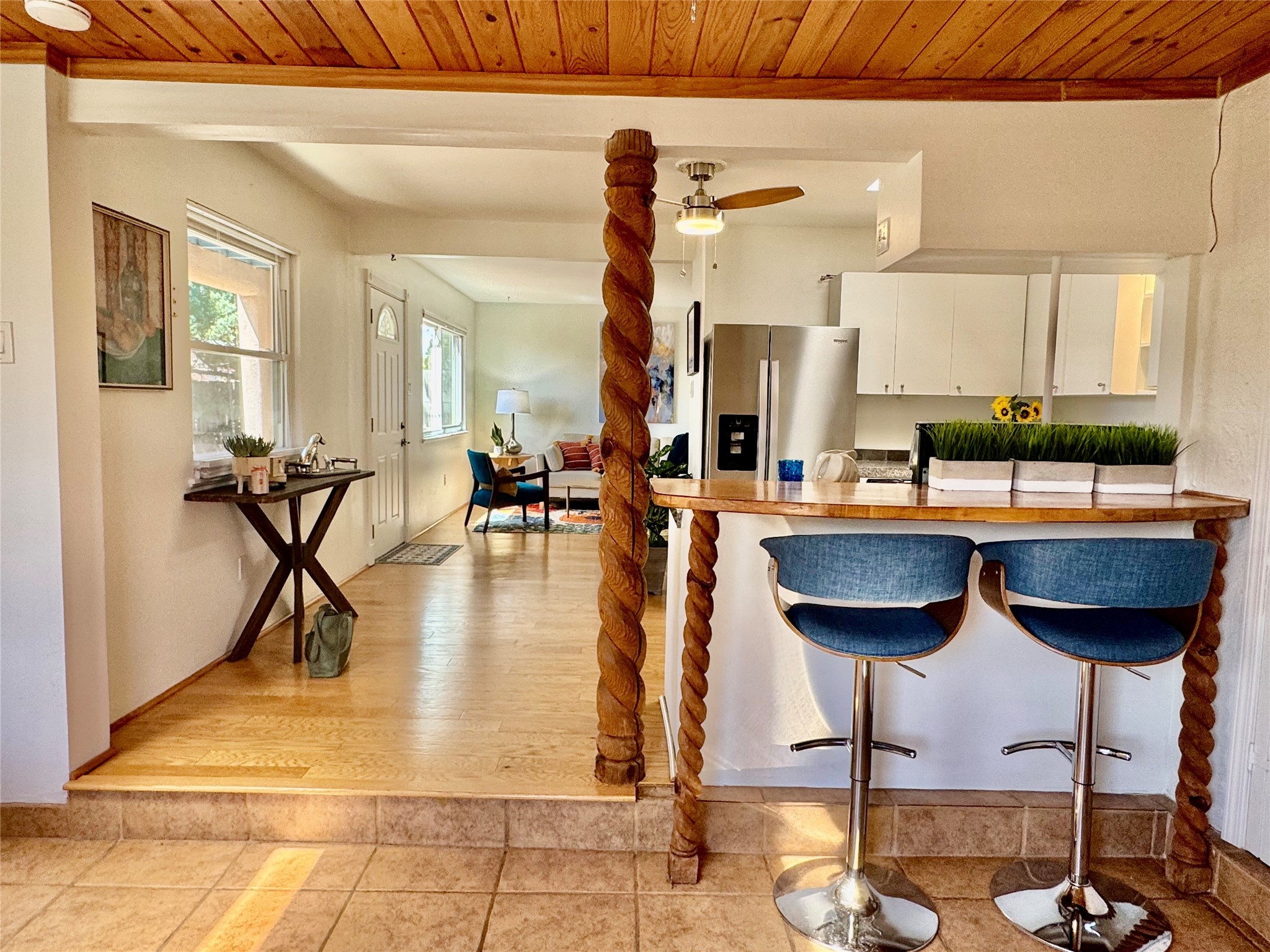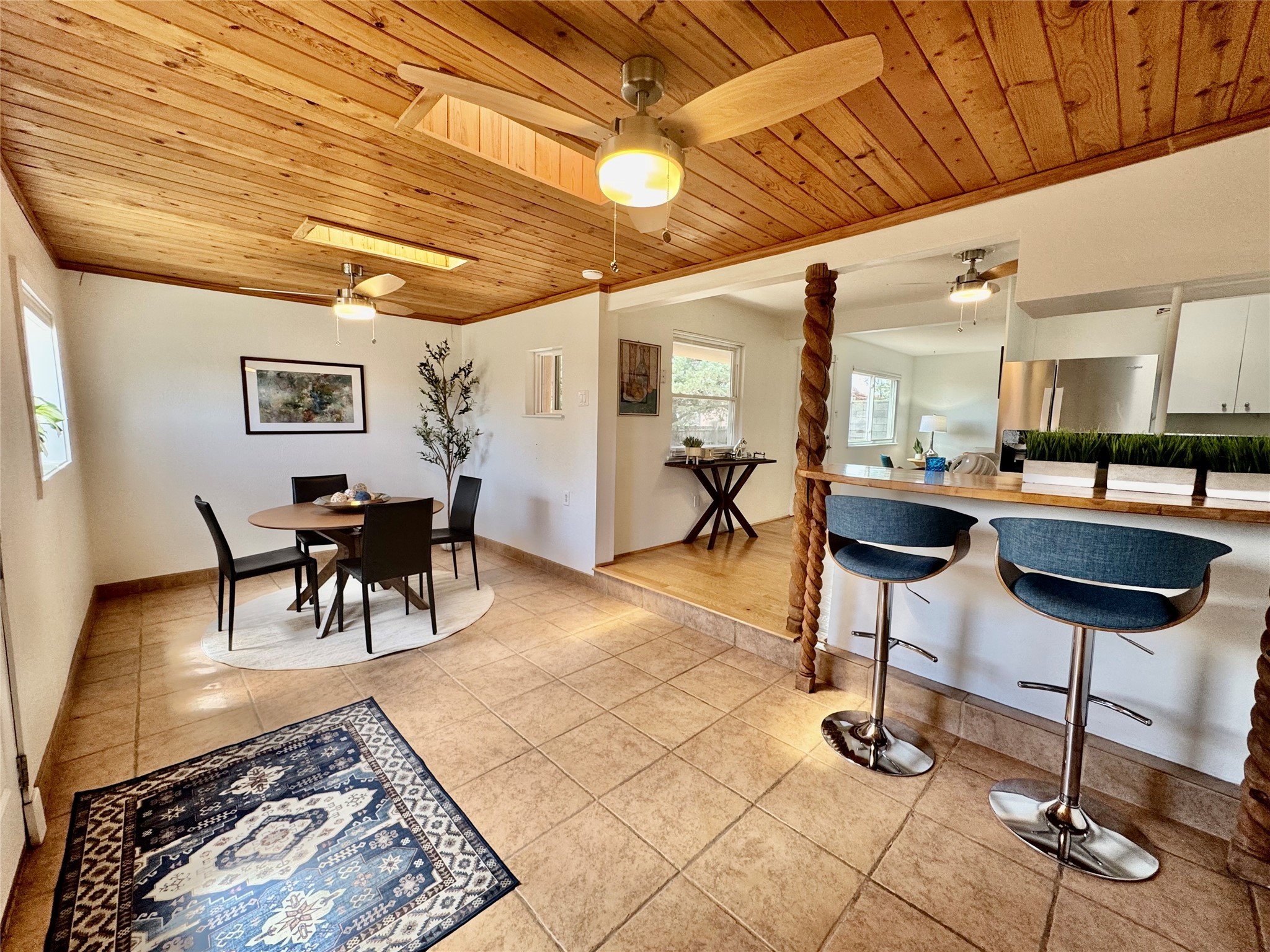 Life is sweet at this well-loved and charming home in mid-town Santa Fe. In summer, the spacious primary suite opens with two sliding doors onto a flagstone backyard with lush garden, and in winter, it is a cosy retreat with the kiva fireplace casting its glow. The front of the house features a living room, kitchen with bar seating and a flex space perfect for an office or dining room. New floors, furnace, and water heater were all added in the last 5 years. Seven skylights, a picture living room window, and a plant window make this a bright, happy home, and a workshop, two sheds, water catchment, pet door, motion detection lights, and an EV charger make this a practical home. The walled front yard with a mature tree offers perfect privacy (and a branch for a swing) while the side and back yards are a surprise delight. The garden has coyote fencing and a grapevine. You'll receive plenty of "volunteer" plants from seasons past, but there is room to make this garden your own. See summer photos. This house has sweet vibes.