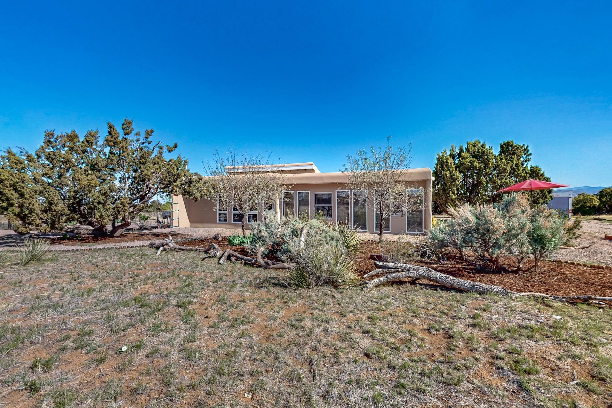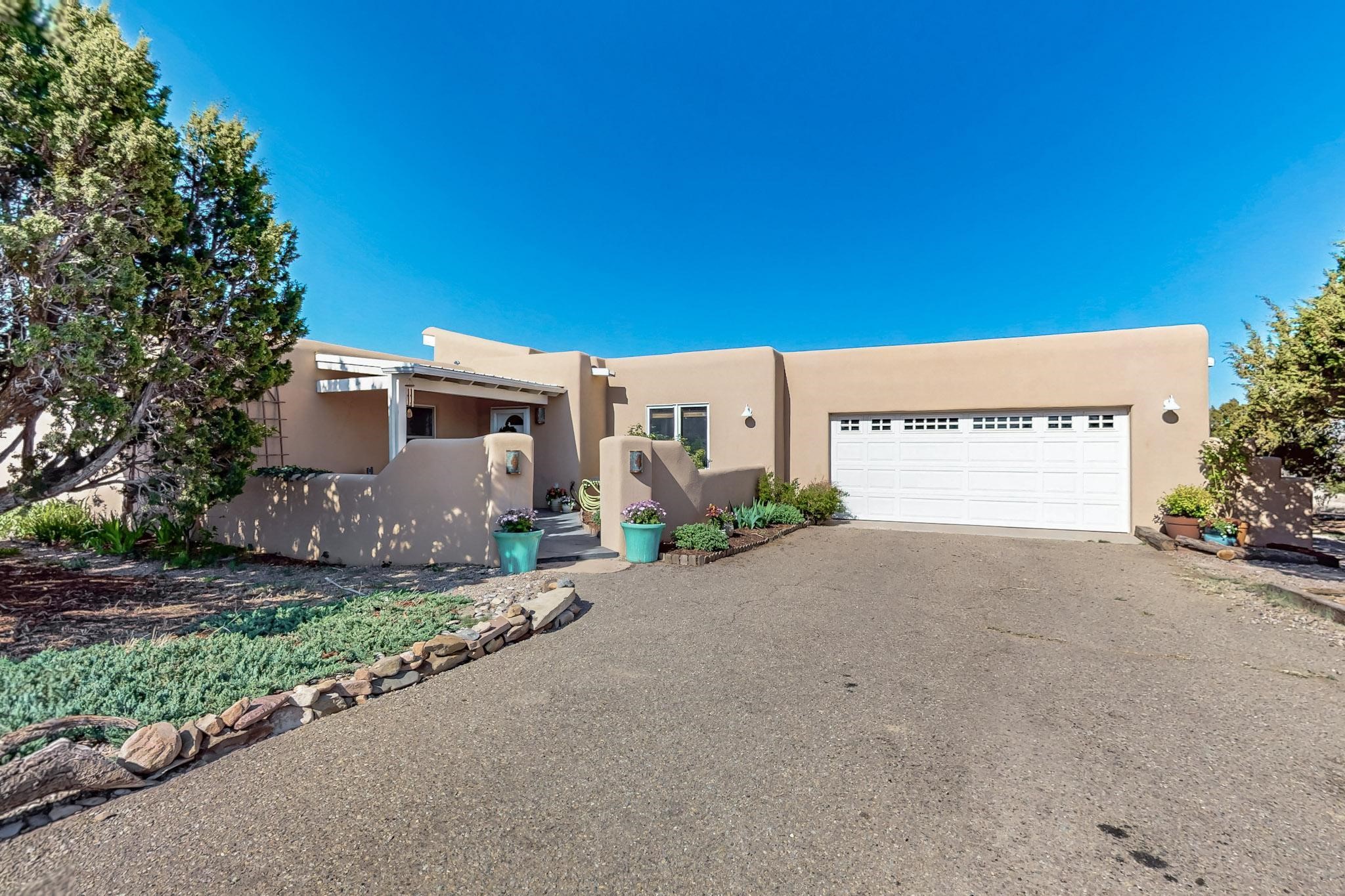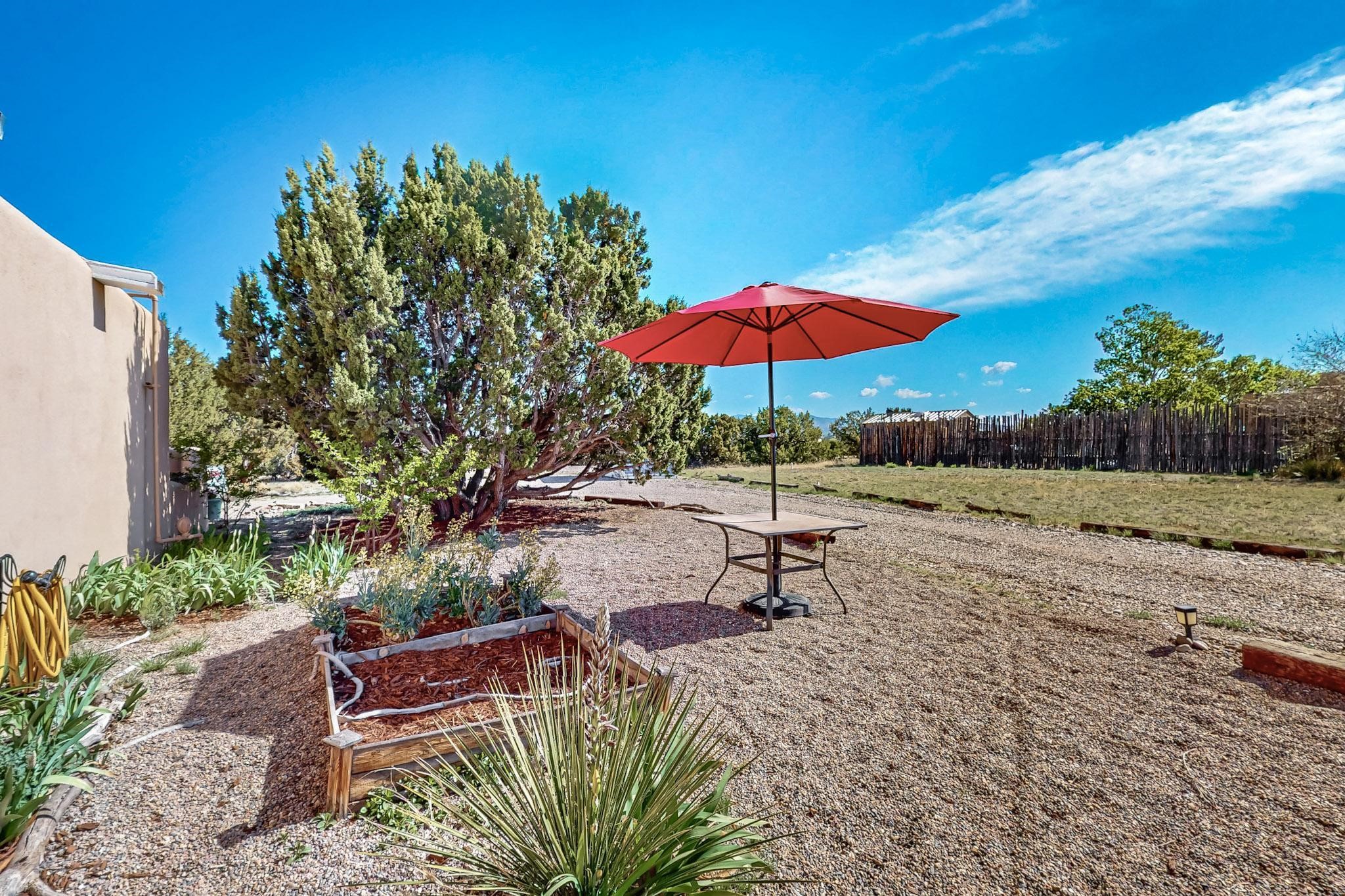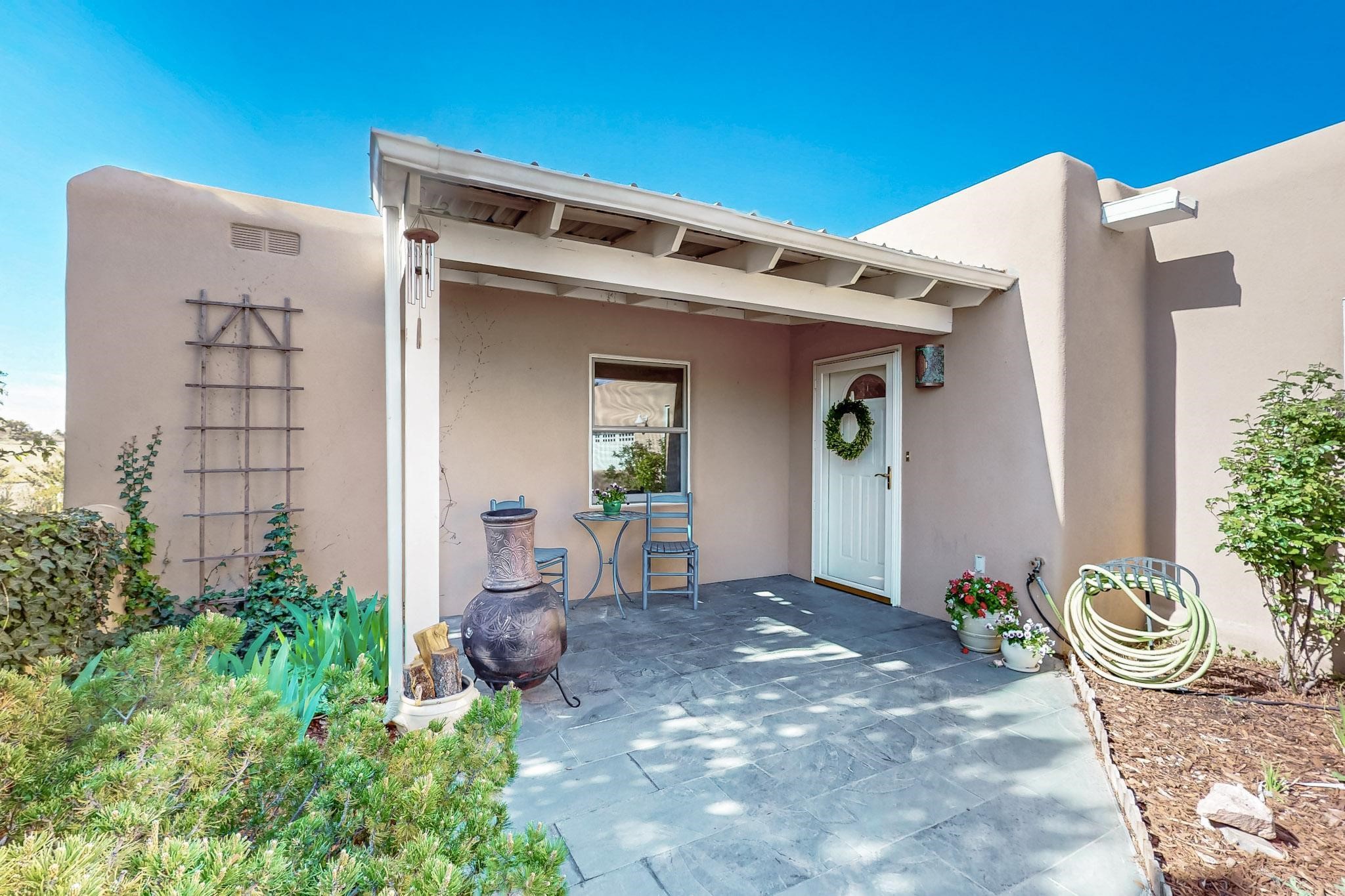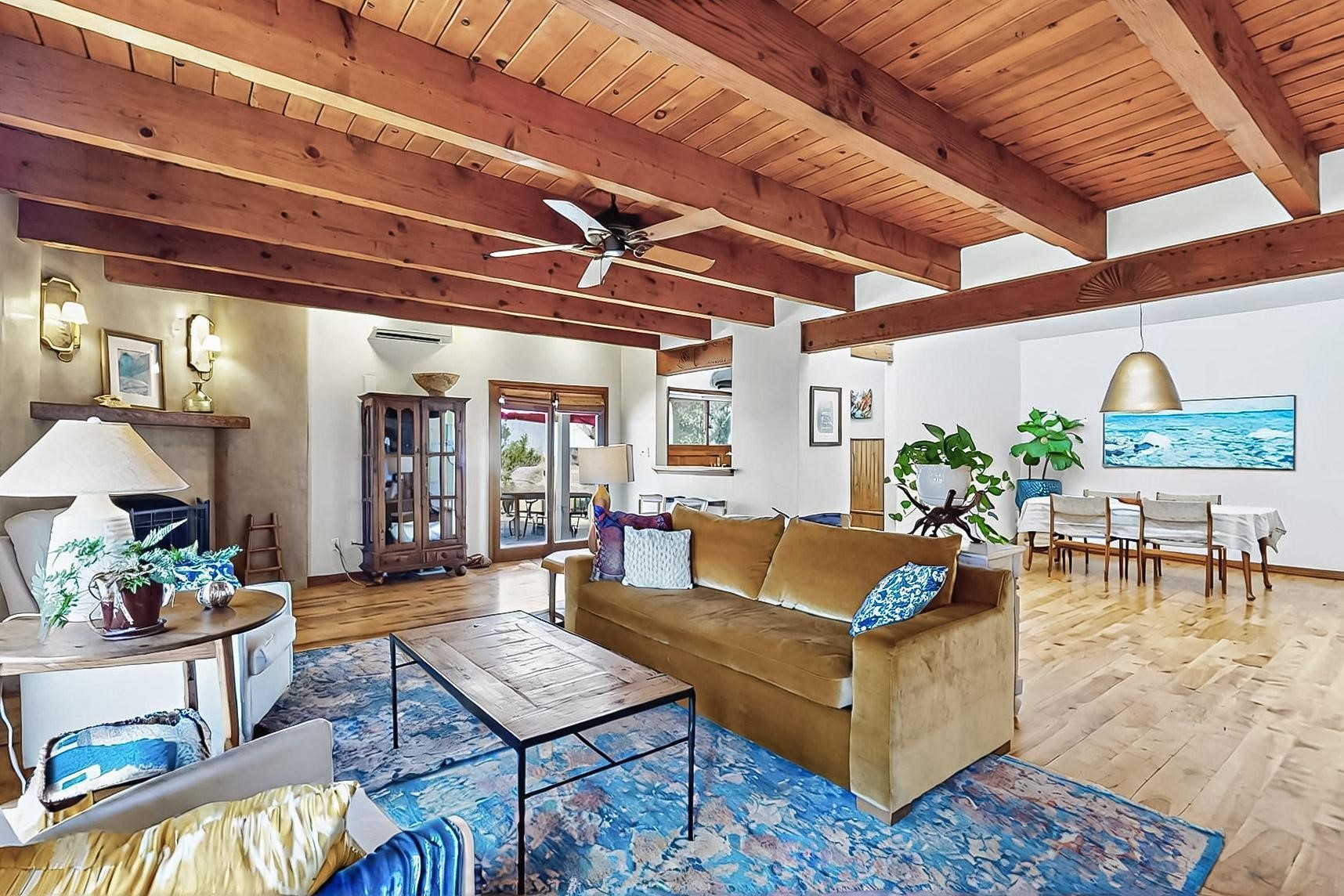 This is the property you've been waiting for! Set back off the road for serenity, privacy and tons of parking, this meticulously renovated passive solar partial adobe brick home has a welcoming walled courtyard, wide plank flamed birch and walnut hardwood floors, new silicon roof with transferable warranty, new transom windows, Navian tankless hot water heater, Dimplex electric heaters with wall thermostats, electric and plumbing upgrades.Beautiful kitchen with clerestory windows, maple cabinets, farmhouse sink, wood wainscoting and gleaming walnut butcher block countertops, Rejuvenation brass hardware, blue slate floors, new appliances, and Zellige handcrafted glazed Moroccan terracotta tiles flows into the pantry and utility room remodel with sink and new W/D.xBoth rooms with built-in storage galore. Open concept post and beam living room with a remote control natural gas fireplace, mini-split cooling system, architectural hand carved support beams and French doors leading out to the enclosed yard.Designated dining room off the kitchen with high sloped ceiling and clerestory windows. En-suite Master bath has been renovated with marble vanity and flooring. Xeriscaping with a partial drip irrigation system, numerous trees, shrubs and flowers. Sellers are avid gardeners and have built a robust native landscape that is drought-tolerant and low maintenance.