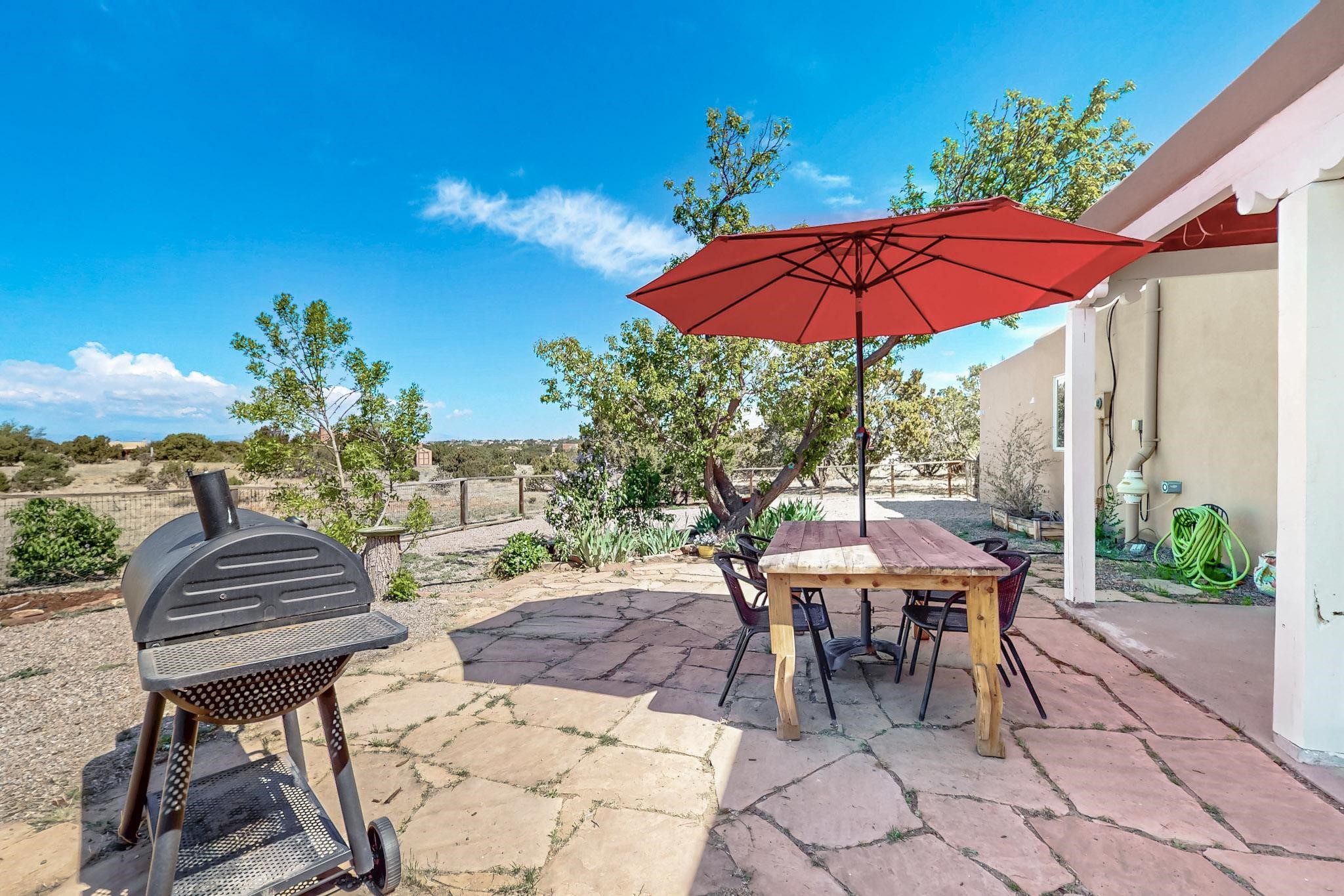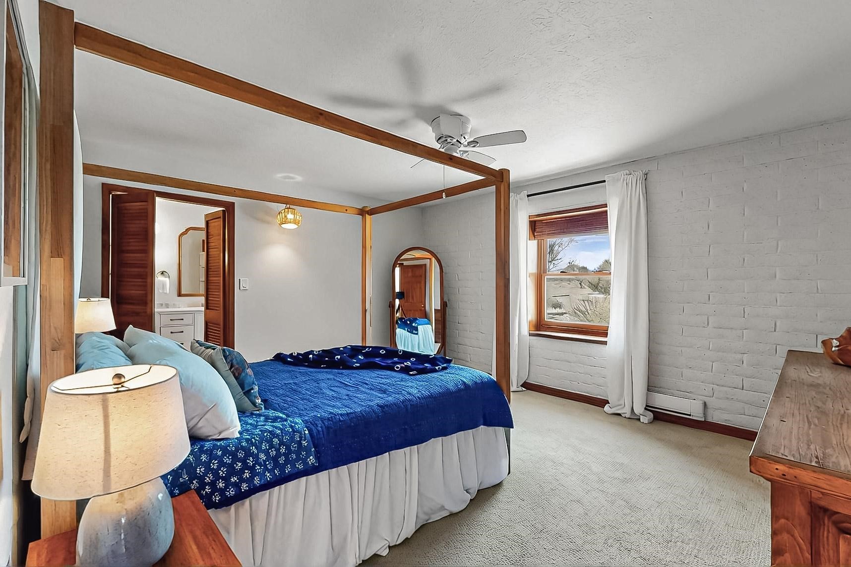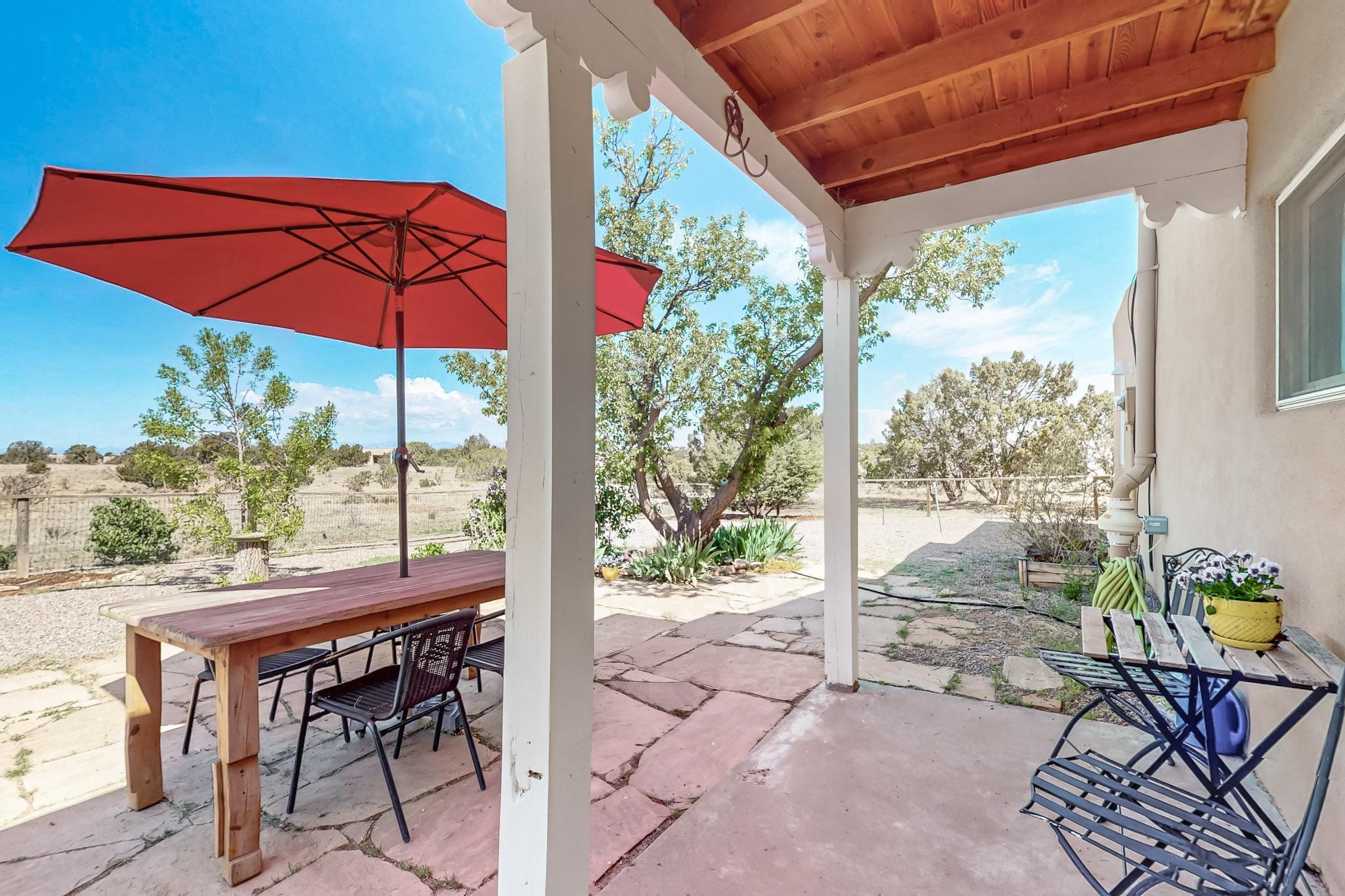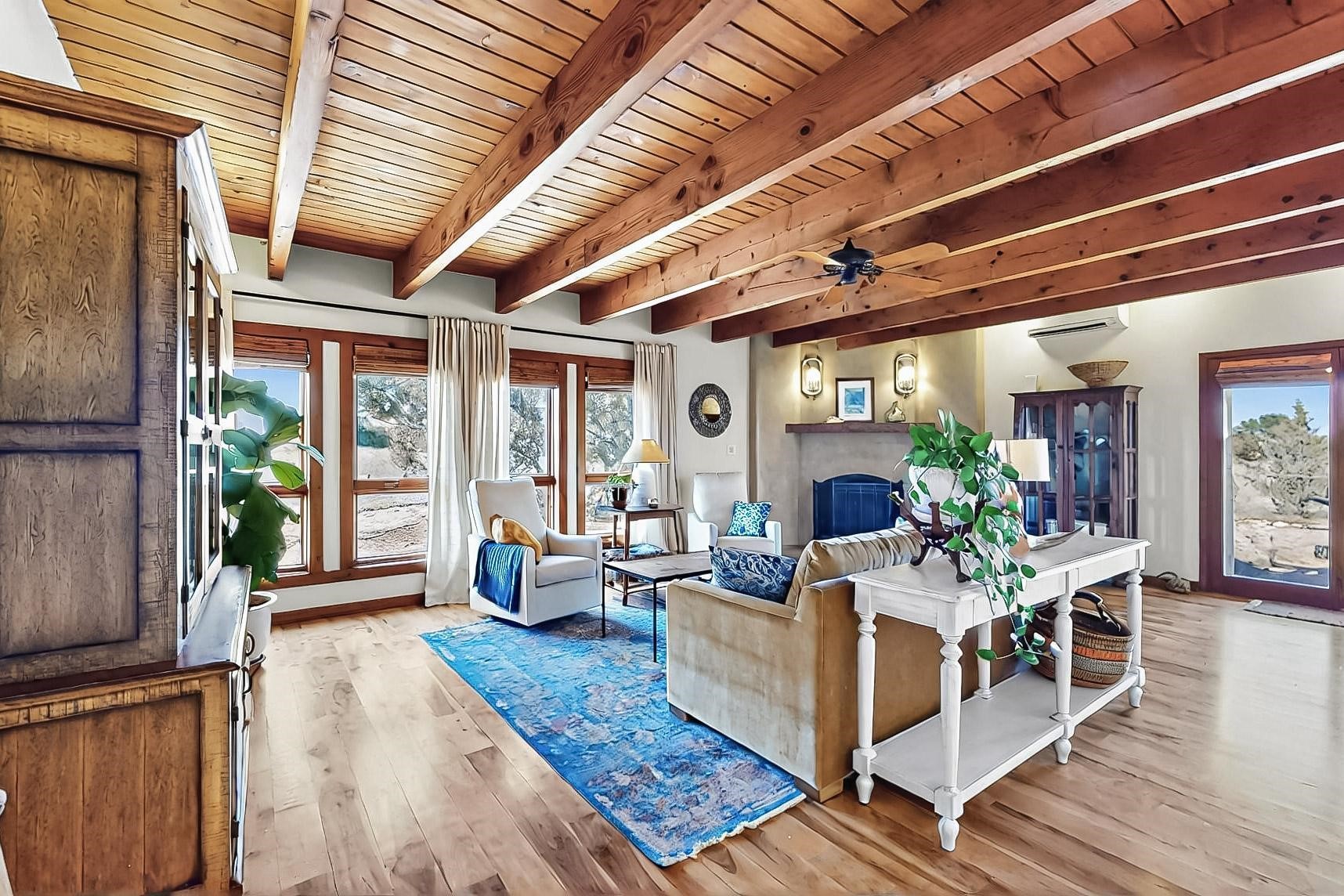 This is the property you've been waiting for! Set back off the road for serenity, privacy and tons of parking, this meticulously renovated passive solar partial adobe brick home has a welcoming walled courtyard, wide plank flamed birch and walnut hardwood floors, new silicon roof with transferable warranty, new transom windows, Navian tankless hot water heater, Dimplex electric heaters with wall thermostats, electric and plumbing upgrades.Beautiful kitchen with clerestory windows, maple cabinets, farmhouse sink, wood wainscoting and gleaming walnut butcher block countertops, Rejuvenation brass hardware, blue slate floors, new appliances, and Zellige handcrafted glazed Moroccan terracotta tiles flows into the pantry and utility room remodel with sink and new W/D.xBoth rooms with built-in storage galore. Open concept post and beam living room with a remote control natural gas fireplace, mini-split cooling system, architectural hand carved support beams and French doors leading out to the enclosed yard.Designated dining room off the kitchen with high sloped ceiling and clerestory windows. En-suite Master bath has been renovated with marble vanity and flooring. Xeriscaping with a partial drip irrigation system, numerous trees, shrubs and flowers. Sellers are avid gardeners and have built a robust native landscape that is drought-tolerant and low maintenance.