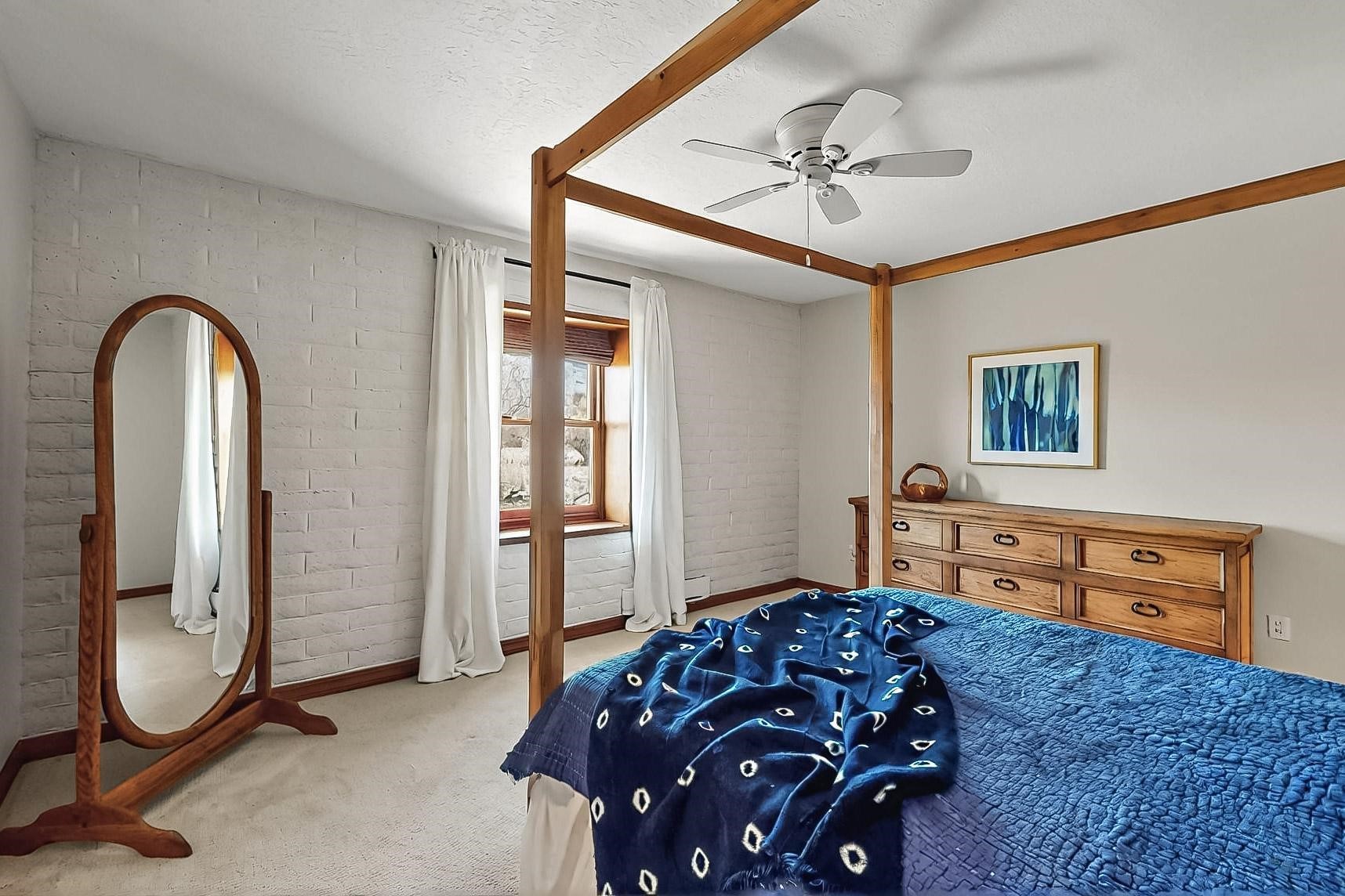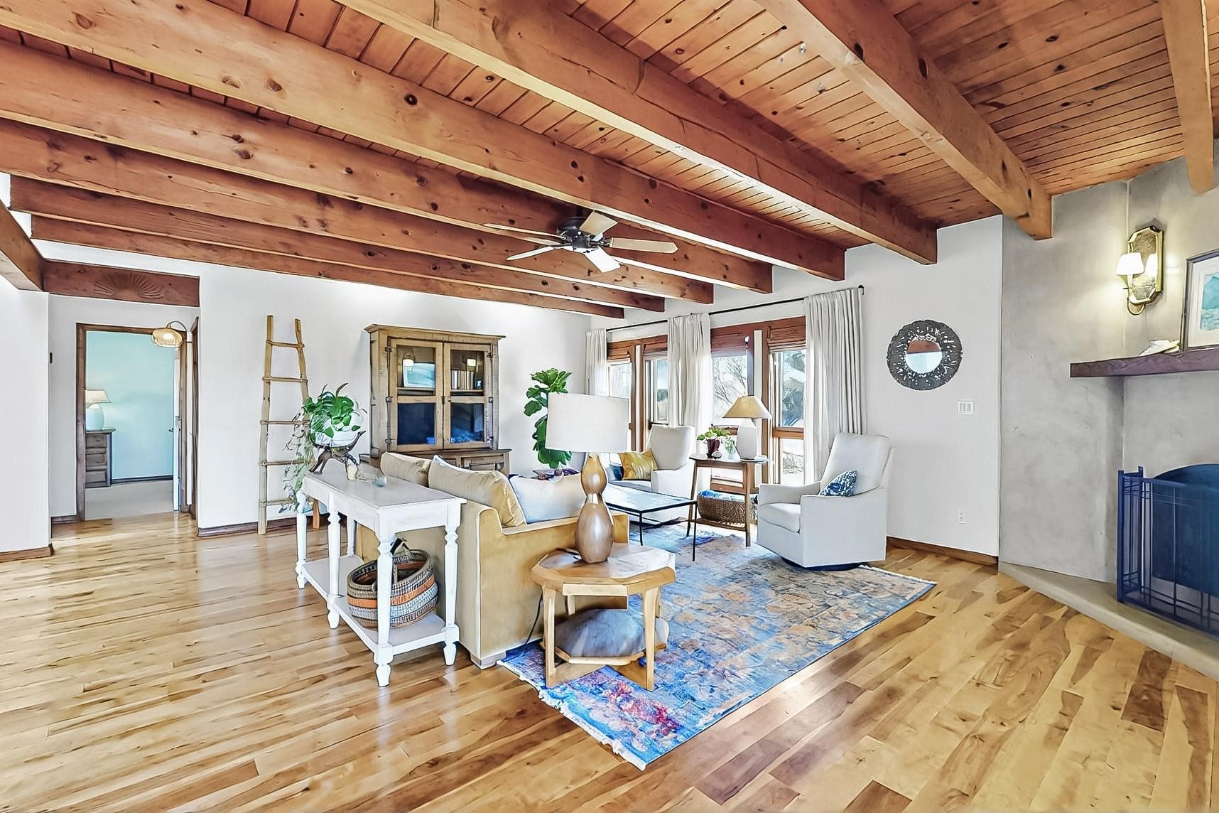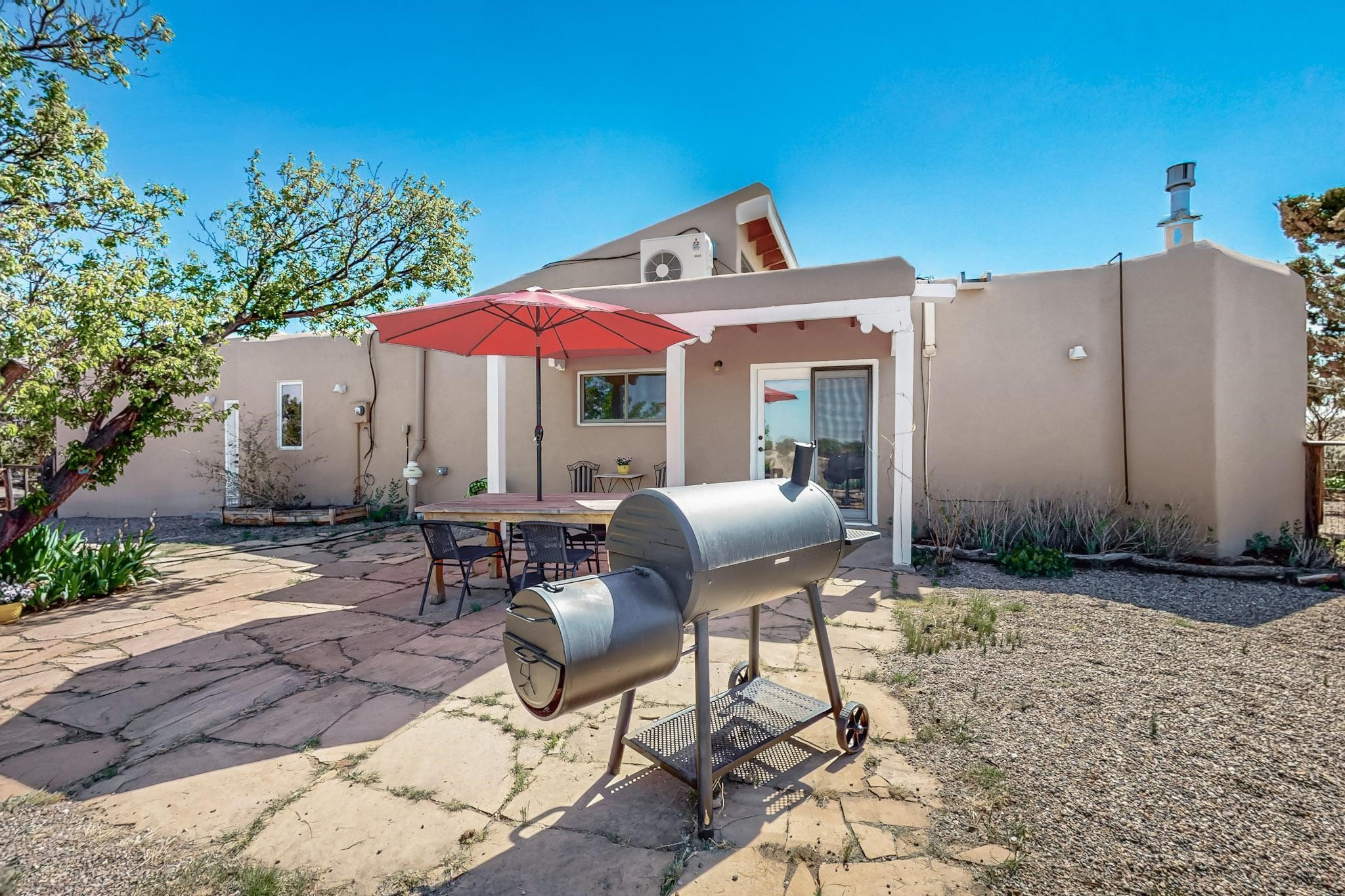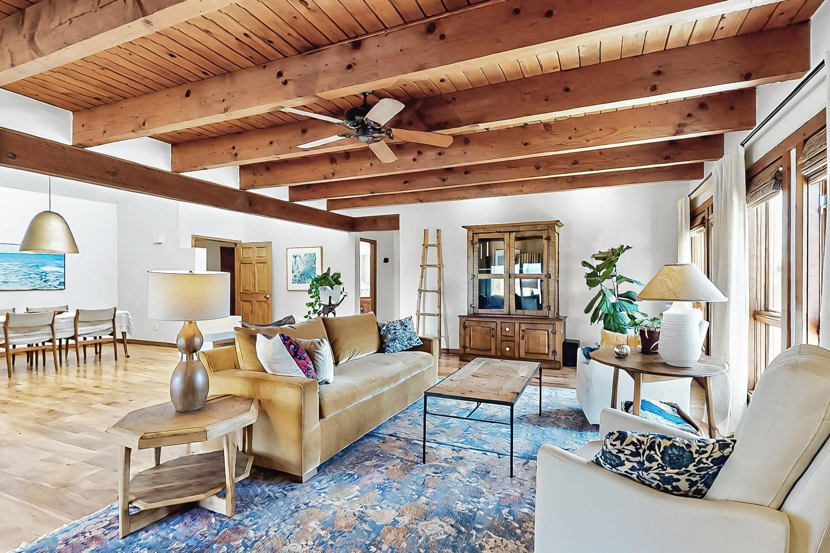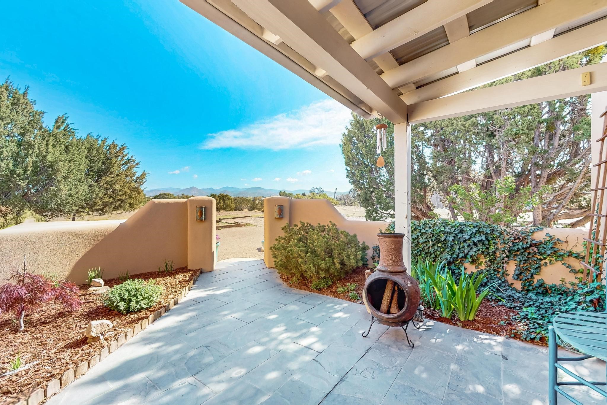 This is the property you've been waiting for! Set back off the road for serenity, privacy and tons of parking, this meticulously renovated passive solar partial adobe brick home has a welcoming walled courtyard, wide plank flamed birch and walnut hardwood floors, new silicon roof with transferable warranty, new transom windows, Navian tankless hot water heater, Dimplex electric heaters with wall thermostats, electric and plumbing upgrades.Beautiful kitchen with clerestory windows, maple cabinets, farmhouse sink, wood wainscoting and gleaming walnut butcher block countertops, Rejuvenation brass hardware, blue slate floors, new appliances, and Zellige handcrafted glazed Moroccan terracotta tiles flows into the pantry and utility room remodel with sink and new W/D.xBoth rooms with built-in storage galore. Open concept post and beam living room with a remote control natural gas fireplace, mini-split cooling system, architectural hand carved support beams and French doors leading out to the enclosed yard.Designated dining room off the kitchen with high sloped ceiling and clerestory windows. En-suite Master bath has been renovated with marble vanity and flooring. Xeriscaping with a partial drip irrigation system, numerous trees, shrubs and flowers. Sellers are avid gardeners and have built a robust native landscape that is drought-tolerant and low maintenance.