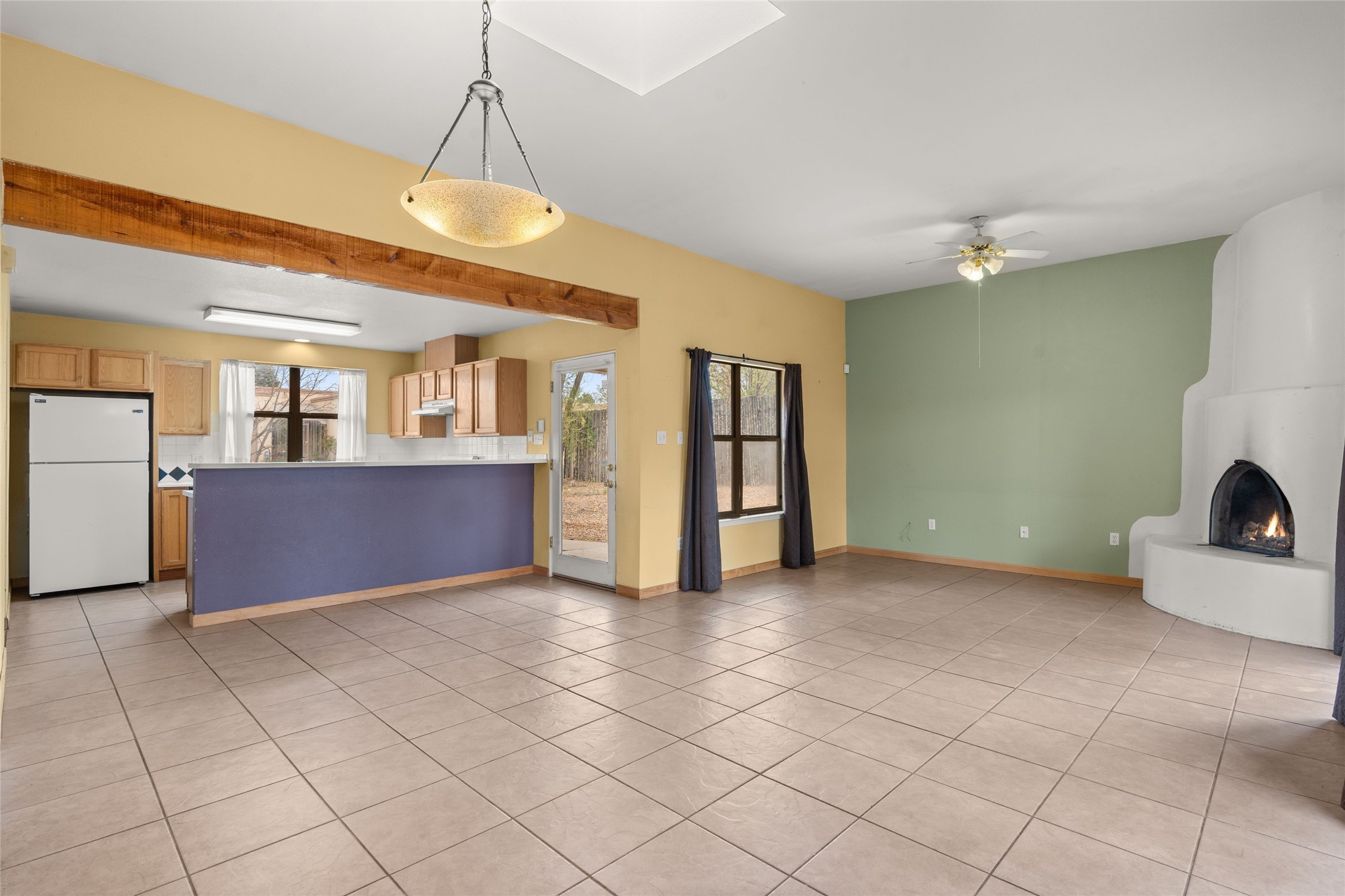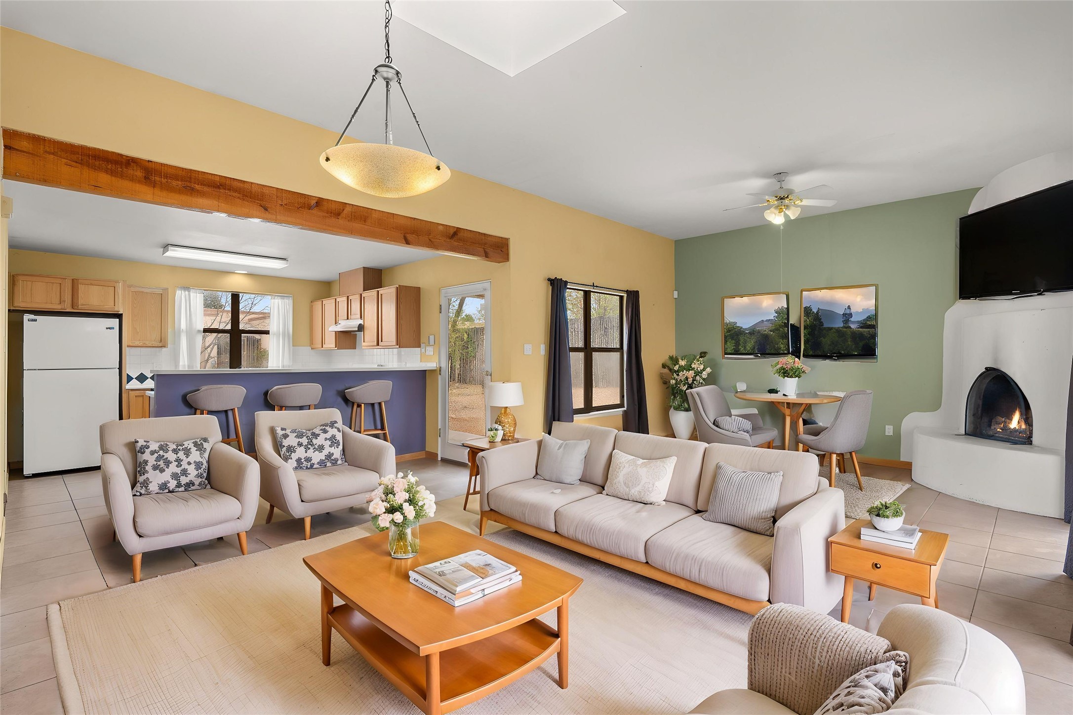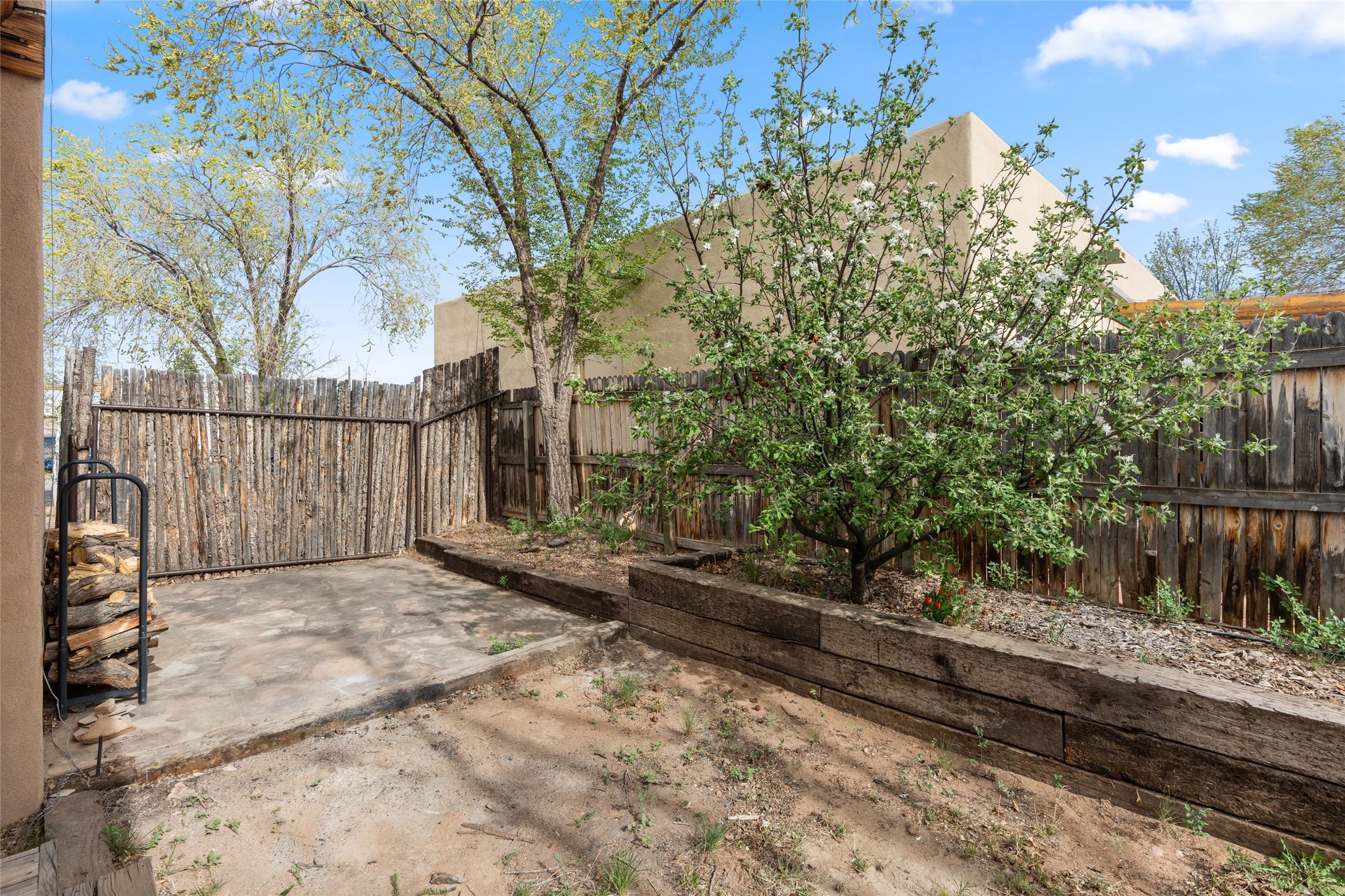 Charming 2-bedroom, 1-bath home offering 1,041 sq ft of character, warmth, and potential. Tucked beneath mature trees, the property provides a sense of privacy and tranquility. A generously covered portal creates the ideal setting for outdoor entertaining, relaxing, or dining al fresco. Inside, you'll be welcomed by high ceilings and a cozy kiva fireplace. This home is a wonderful opportunity for those with a vision to personalize and enhance a space full of charm.