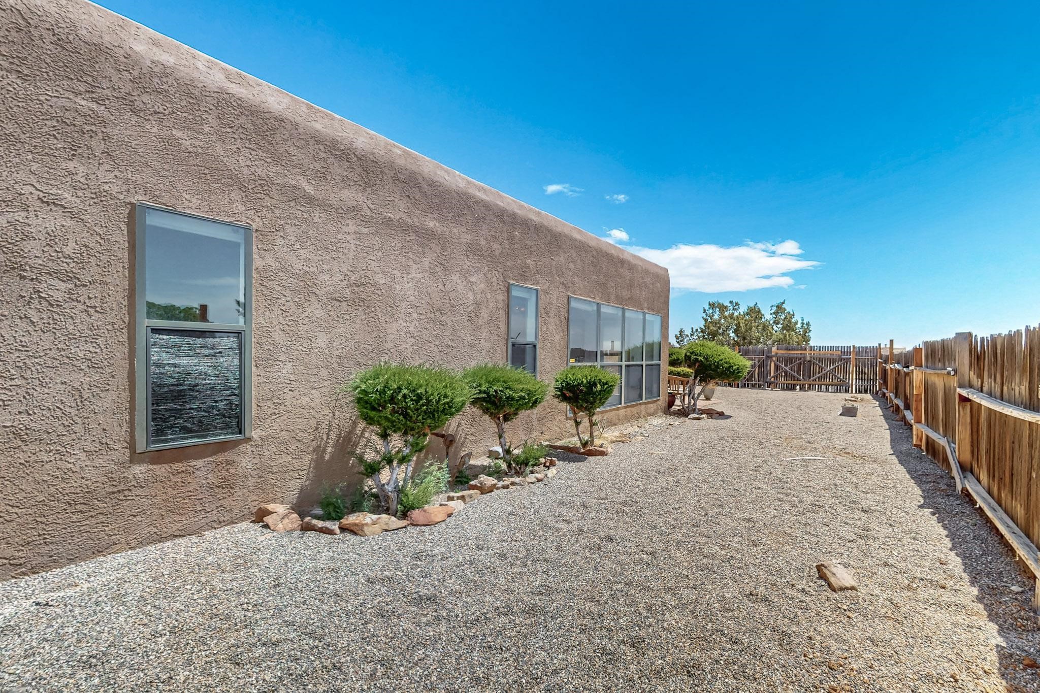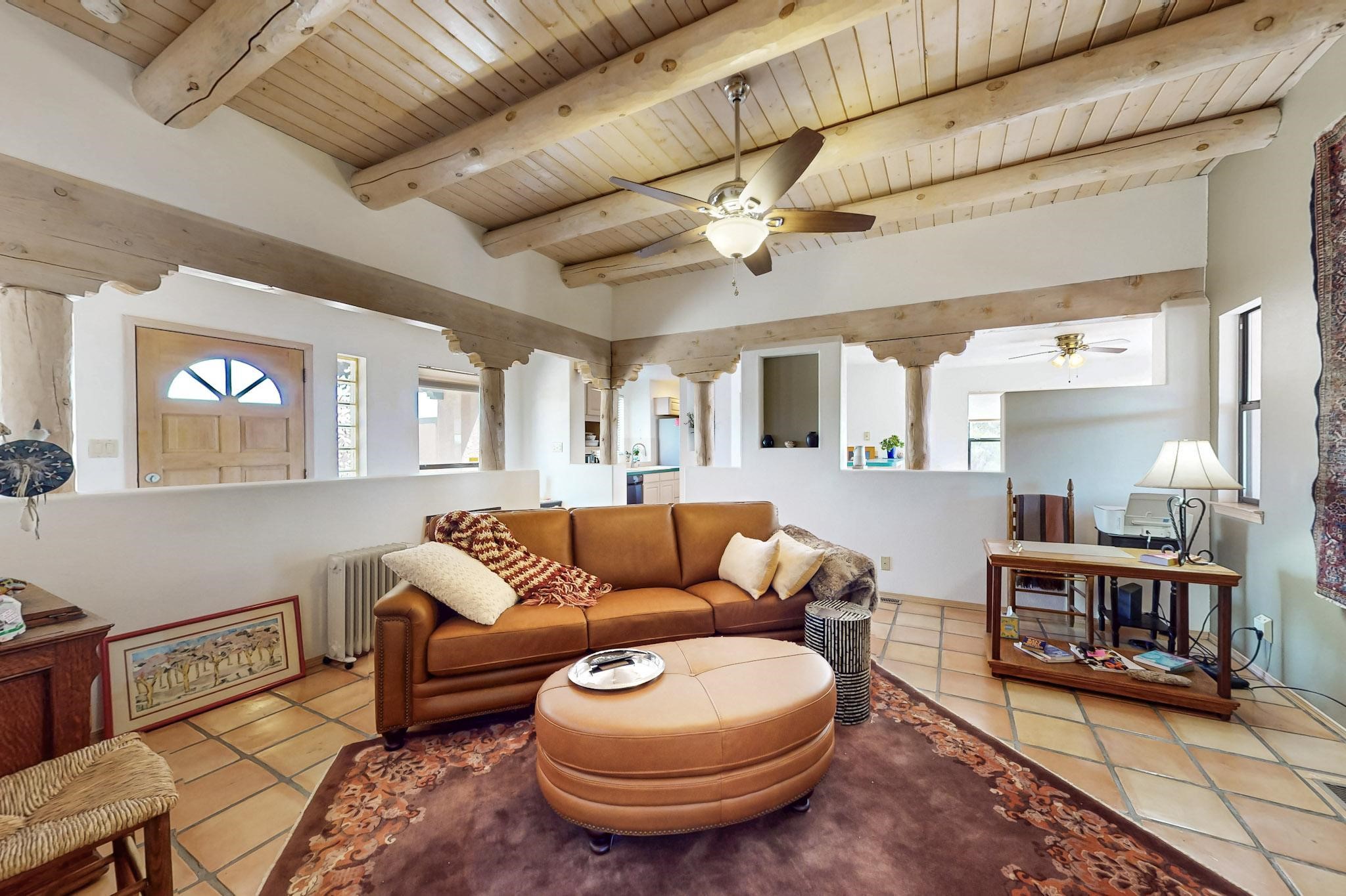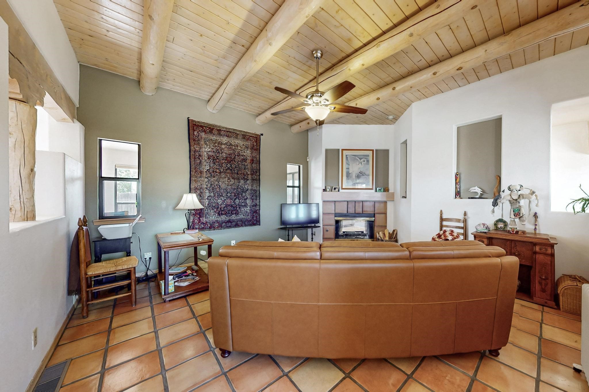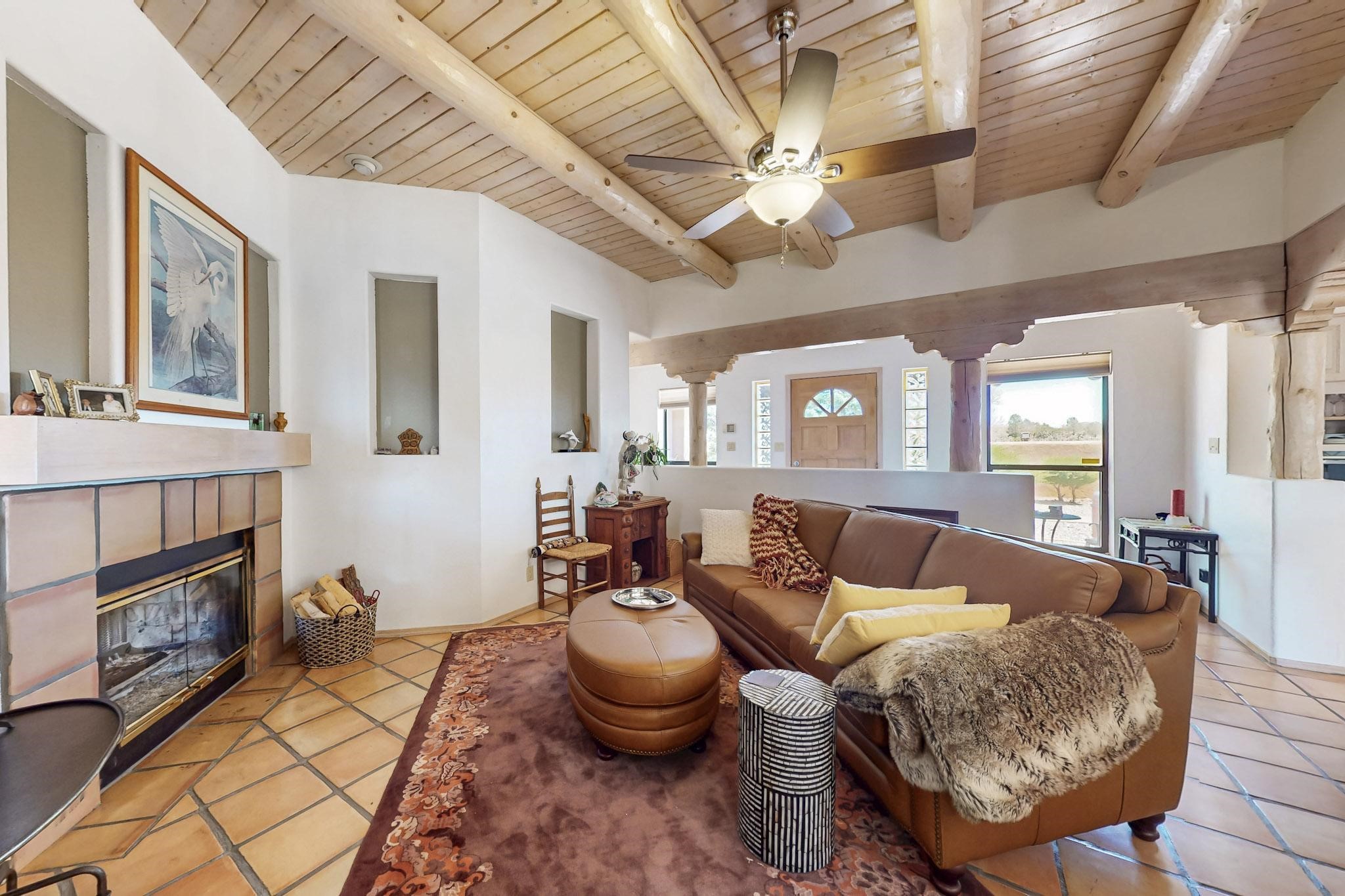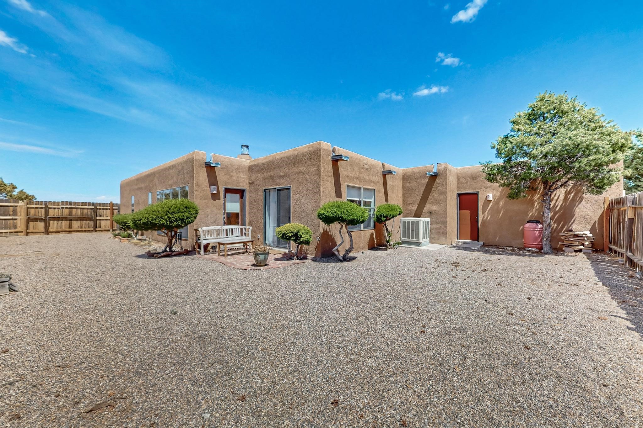 Lovely light classic contemporary pueblo, open plan design with a large extra sunroom. Natural gas forced air with a swamp cooler hook up giving central air conditioning to give both winter heat and summer cool. A 2 way wood burning fireplace with a gas log starter sits between the living room and main bedroom. A private front courtyard, Saltillo floors, viga beams and corbels add a touch of SF character. Ceiling fans in all rooms, one year old hot water heater and a brand new septic tank installed 2024. There is a privately fenced back yard accessed from the sunroom and sunny dining area for entertaining or quiet relaxation. This home sits back on 1.6 acres accessed by paved roads within easy reach of Eldorado amenities, two local shopping centers, schools, parks, library and senior center, only minutes into Santa Fe.
