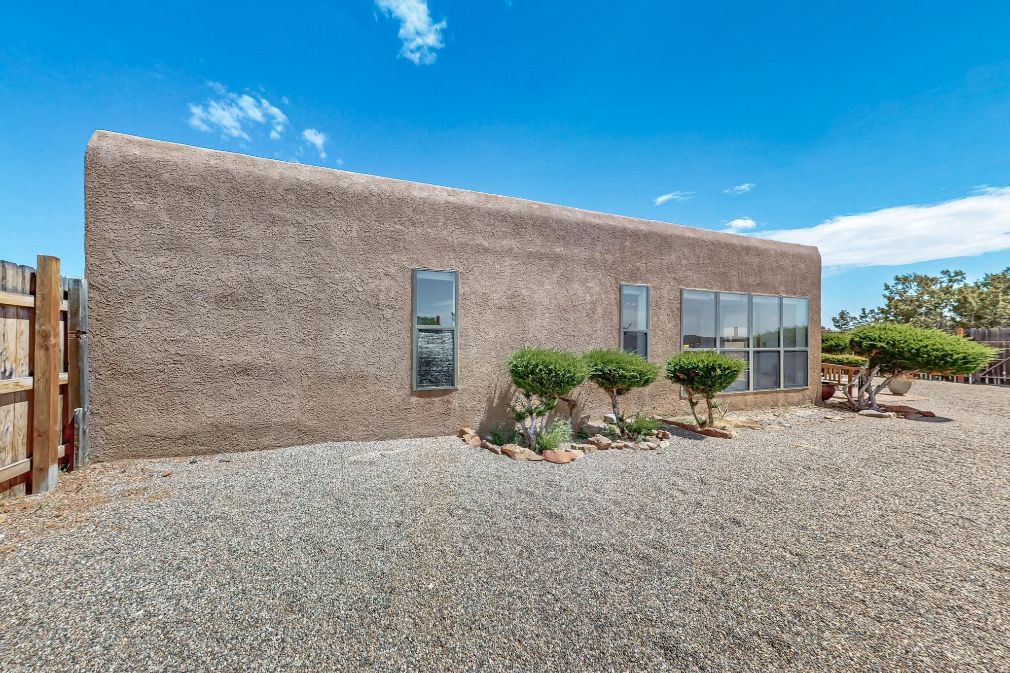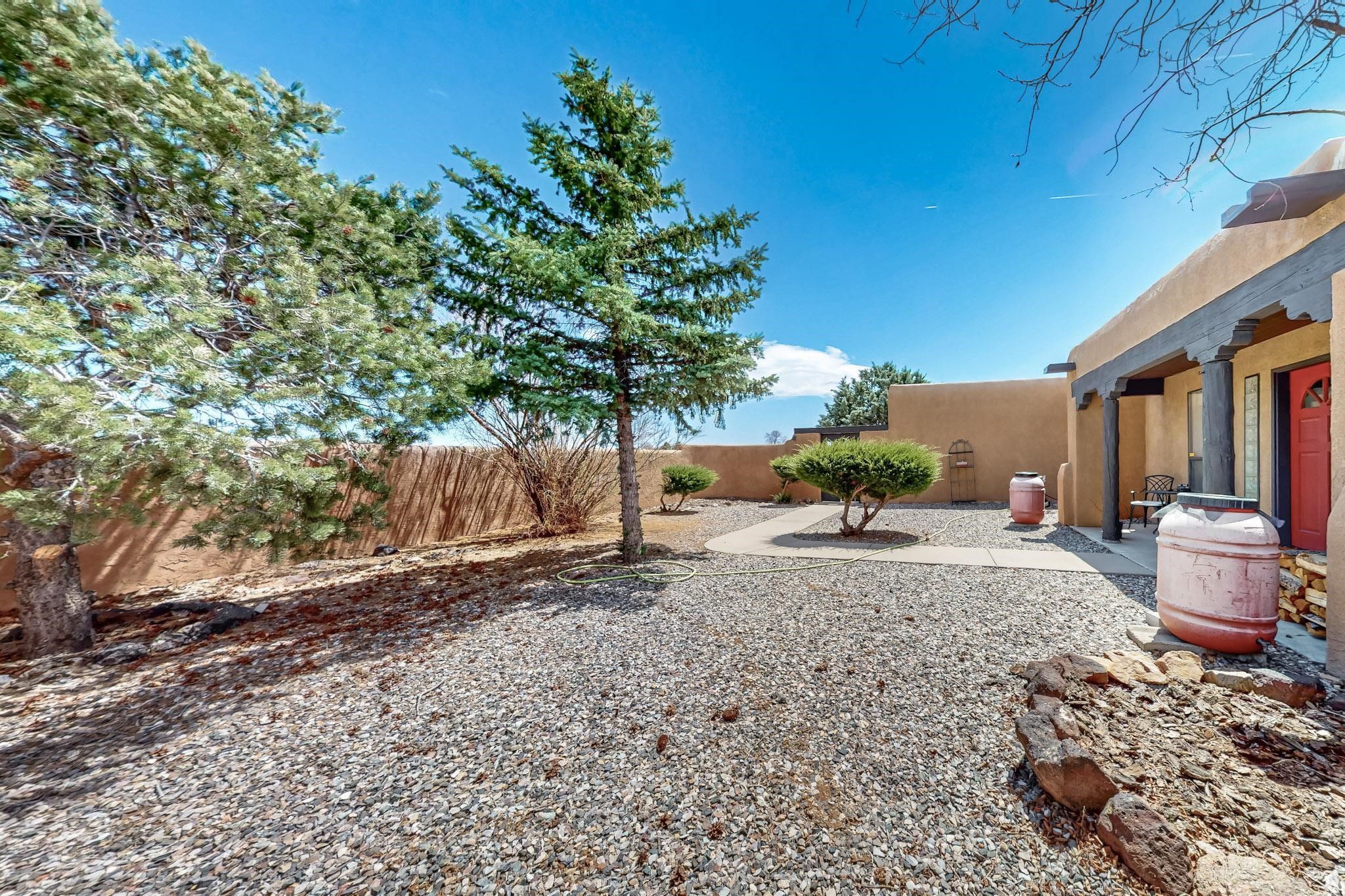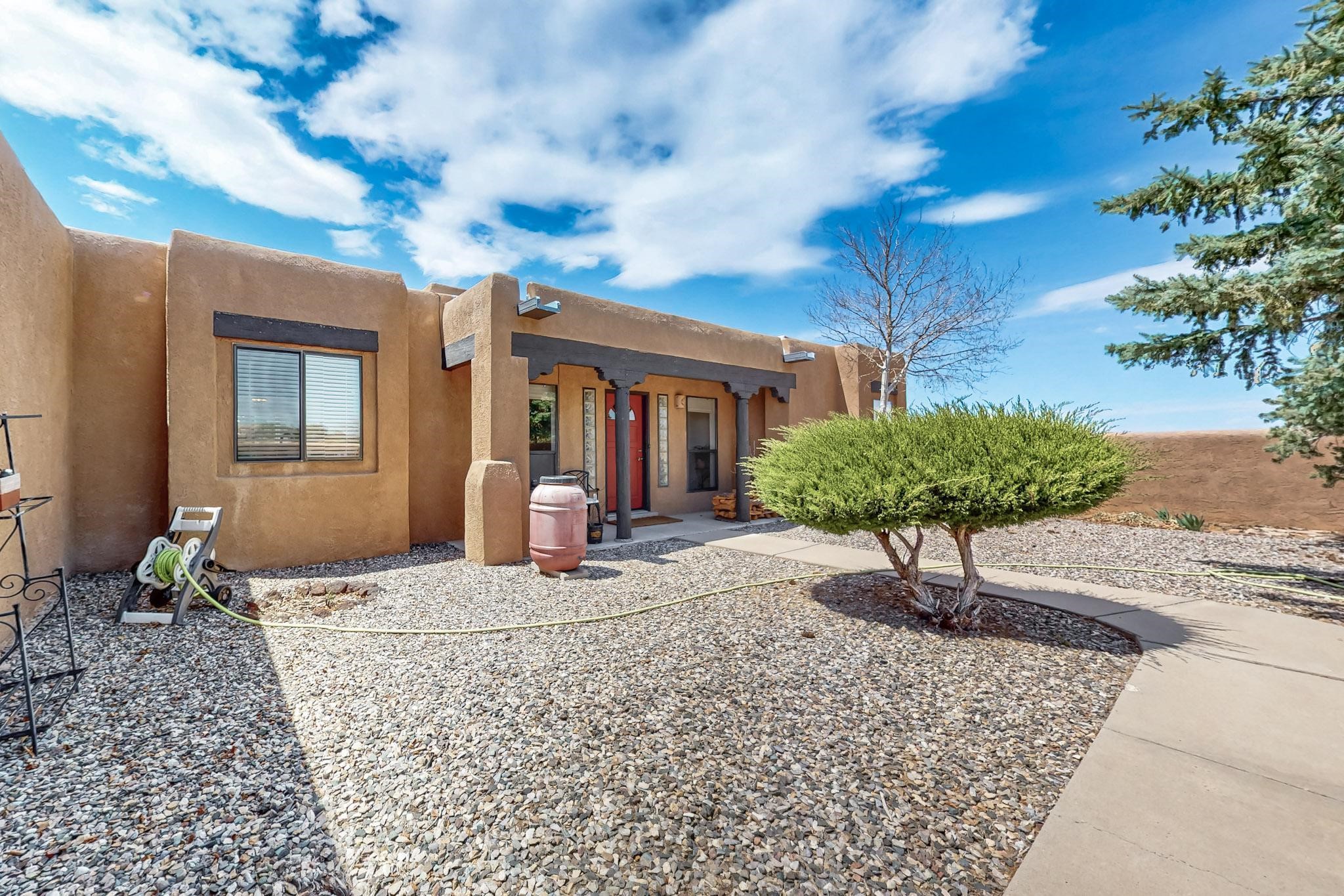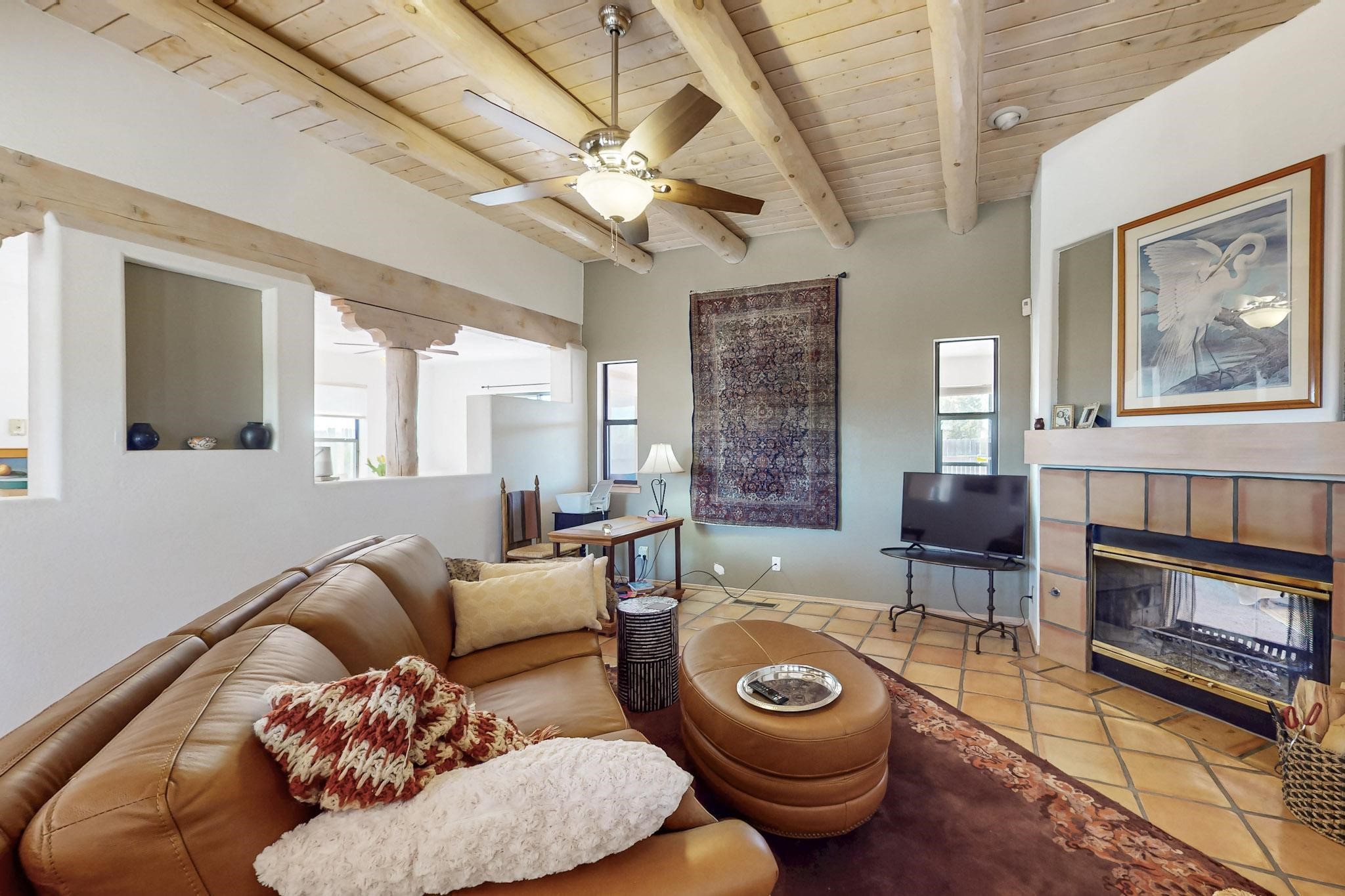 Lovely light classic contemporary pueblo, open plan design with a large extra sunroom. Natural gas forced air with a swamp cooler hook up giving central air conditioning to give both winter heat and summer cool. A 2 way wood burning fireplace with a gas log starter sits between the living room and main bedroom. A private front courtyard, Saltillo floors, viga beams and corbels add a touch of SF character. Ceiling fans in all rooms, one year old hot water heater and a brand new septic tank installed 2024. There is a privately fenced back yard accessed from the sunroom and sunny dining area for entertaining or quiet relaxation. This home sits back on 1.6 acres accessed by paved roads within easy reach of Eldorado amenities, two local shopping centers, schools, parks, library and senior center, only minutes into Santa Fe.