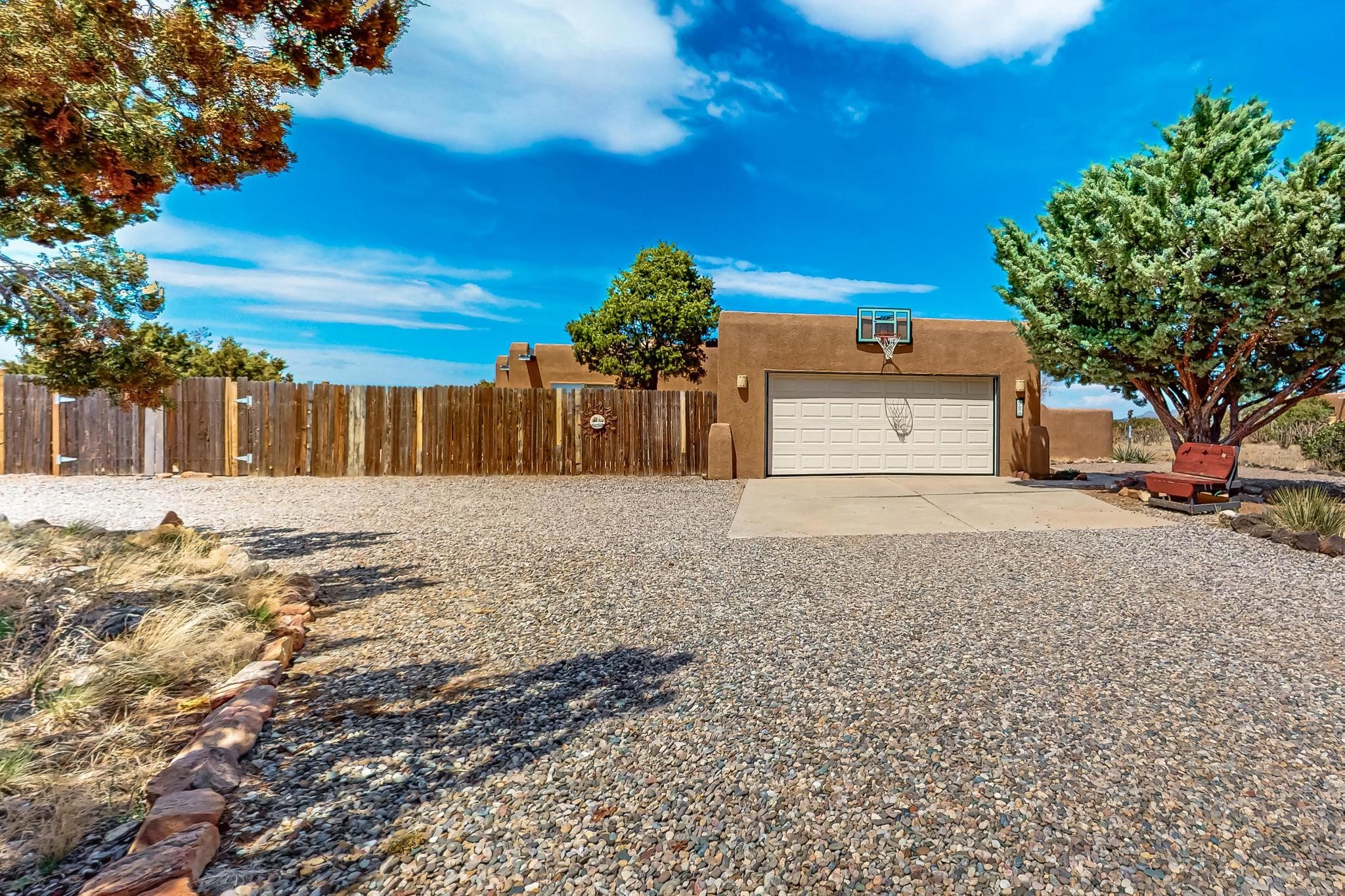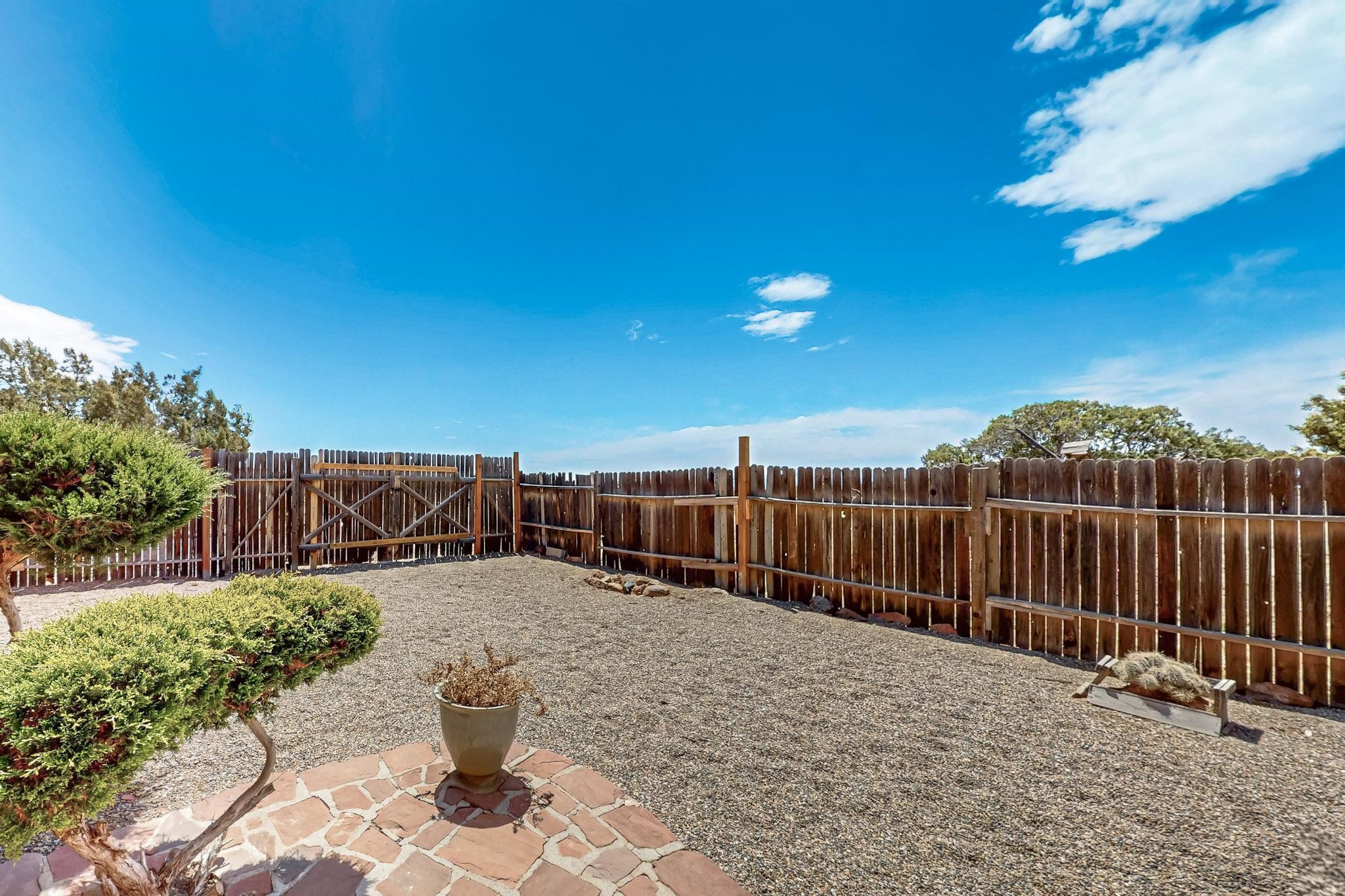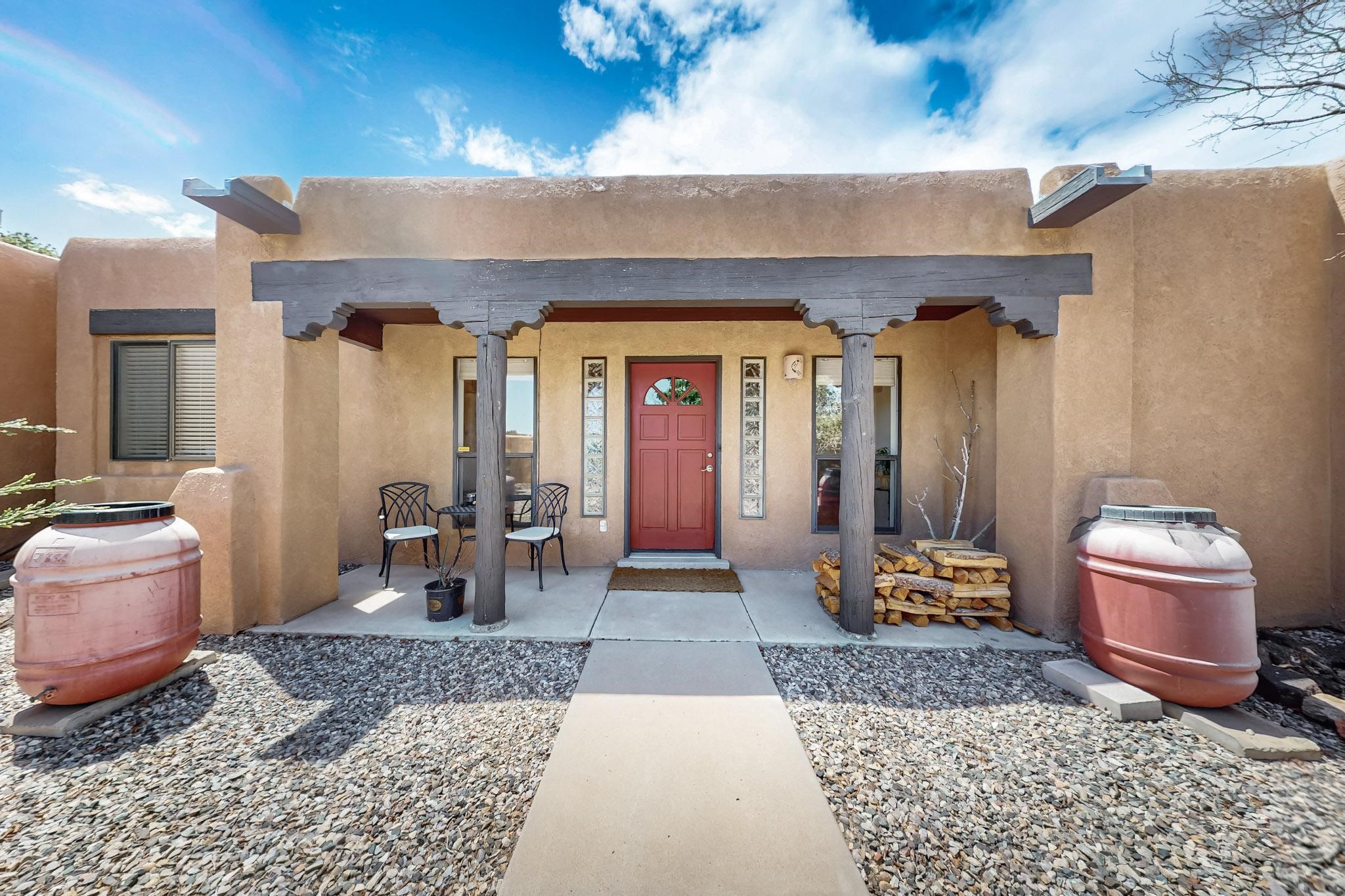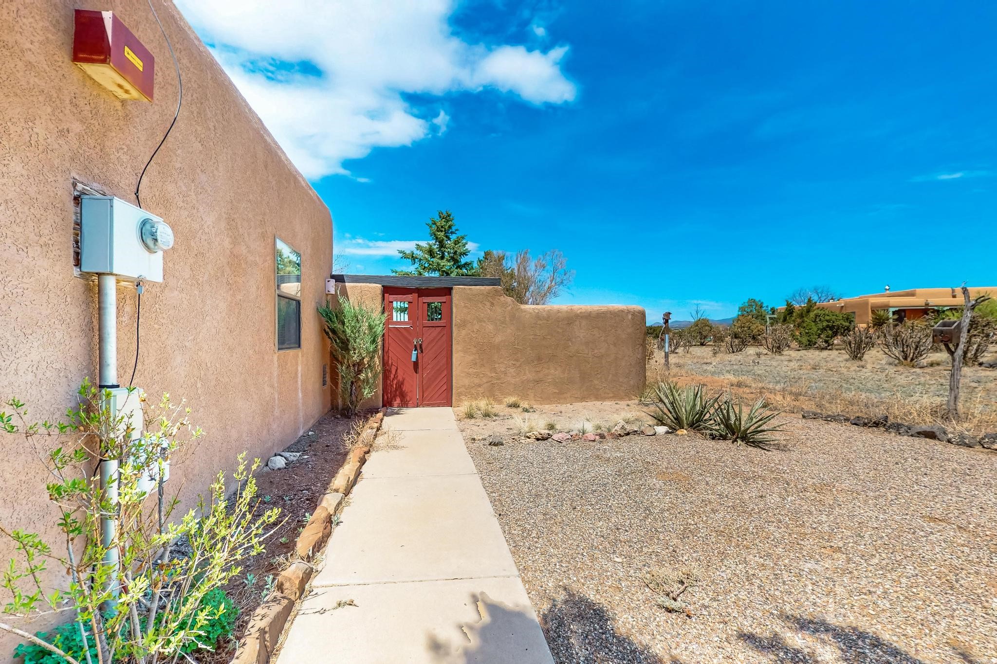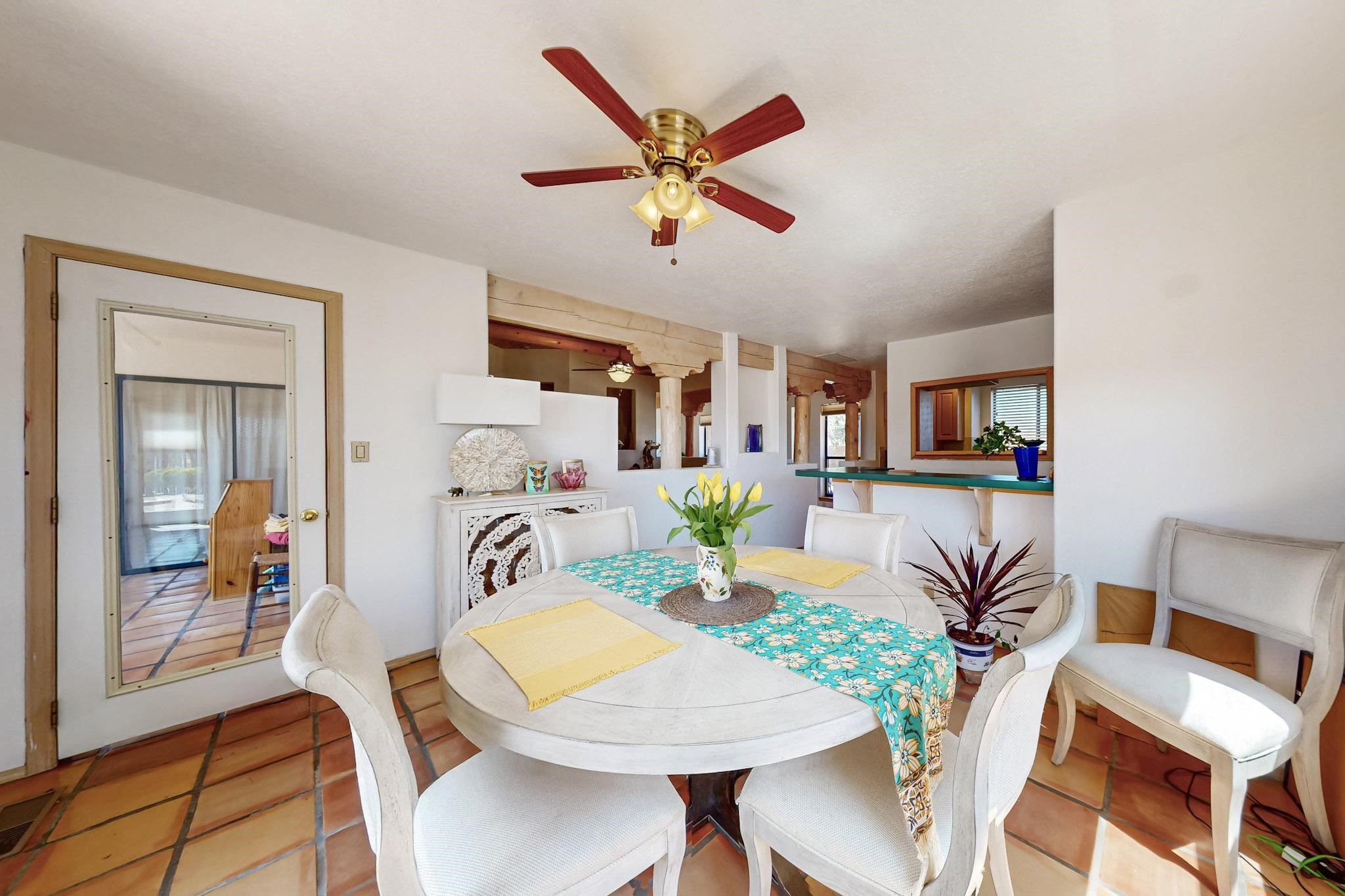 Lovely light classic contemporary pueblo, open plan design with a large extra sunroom. Natural gas forced air with a swamp cooler hook up giving central air conditioning to give both winter heat and summer cool. A 2 way wood burning fireplace with a gas log starter sits between the living room and main bedroom. A private front courtyard, Saltillo floors, viga beams and corbels add a touch of SF character. Ceiling fans in all rooms, one year old hot water heater and a brand new septic tank installed 2024. There is a privately fenced back yard accessed from the sunroom and sunny dining area for entertaining or quiet relaxation. This home sits back on 1.6 acres accessed by paved roads within easy reach of Eldorado amenities, two local shopping centers, schools, parks, library and senior center, only minutes into Santa Fe.