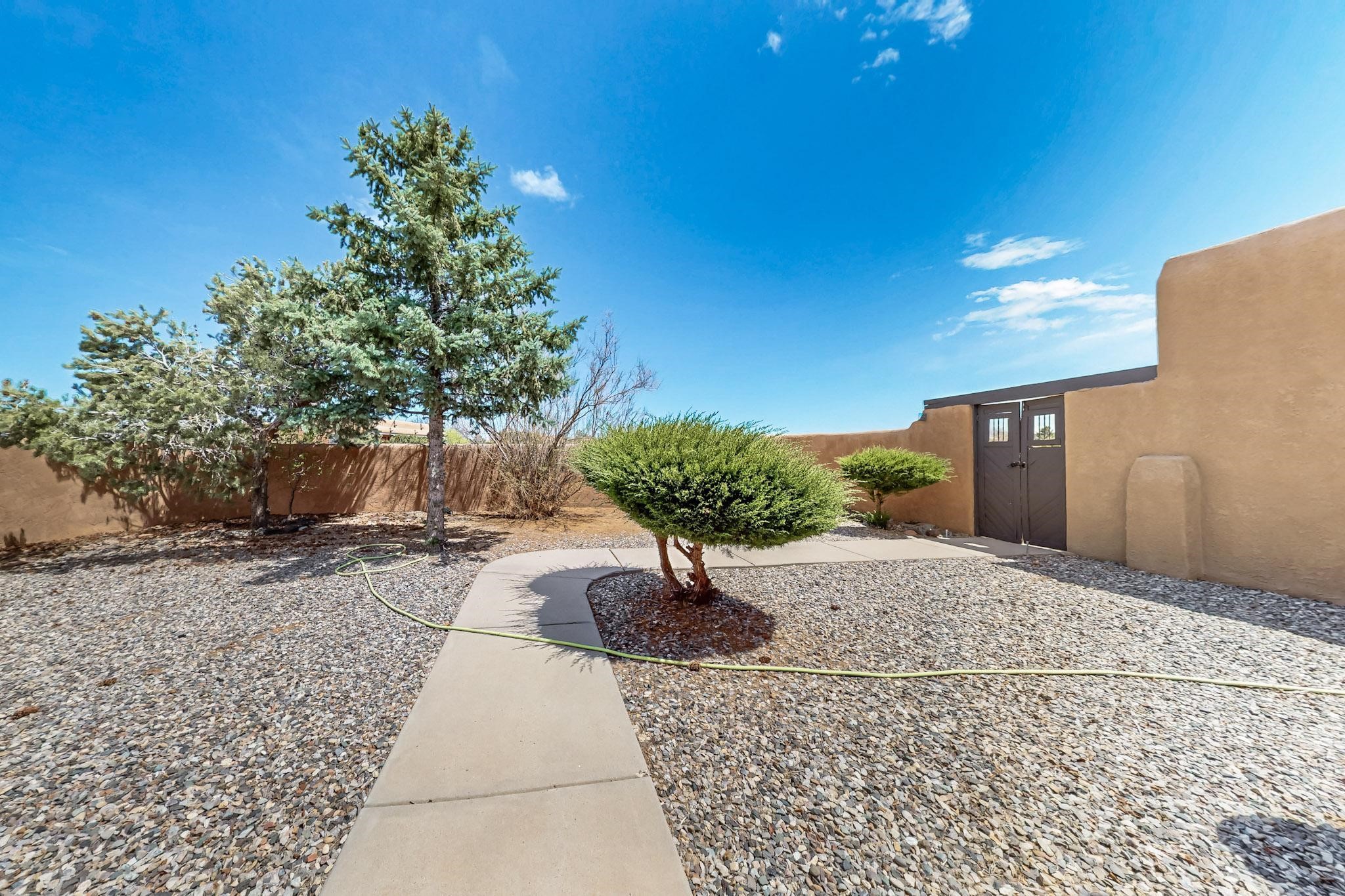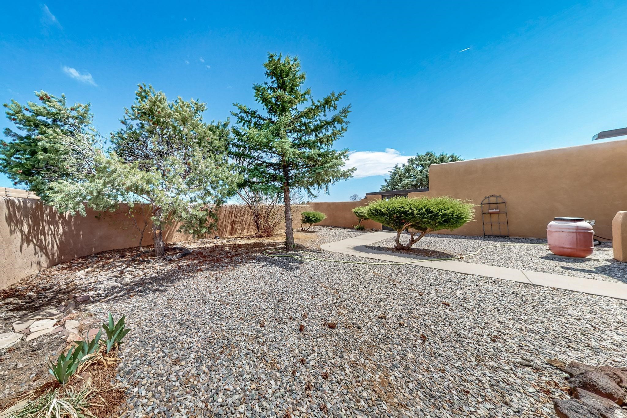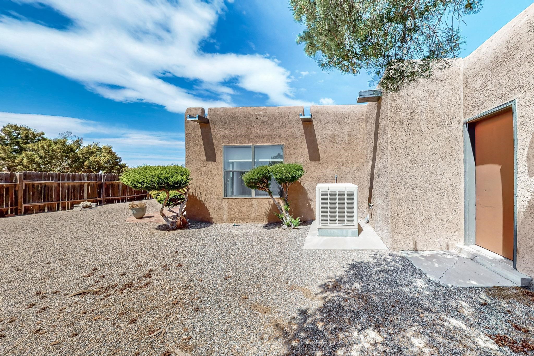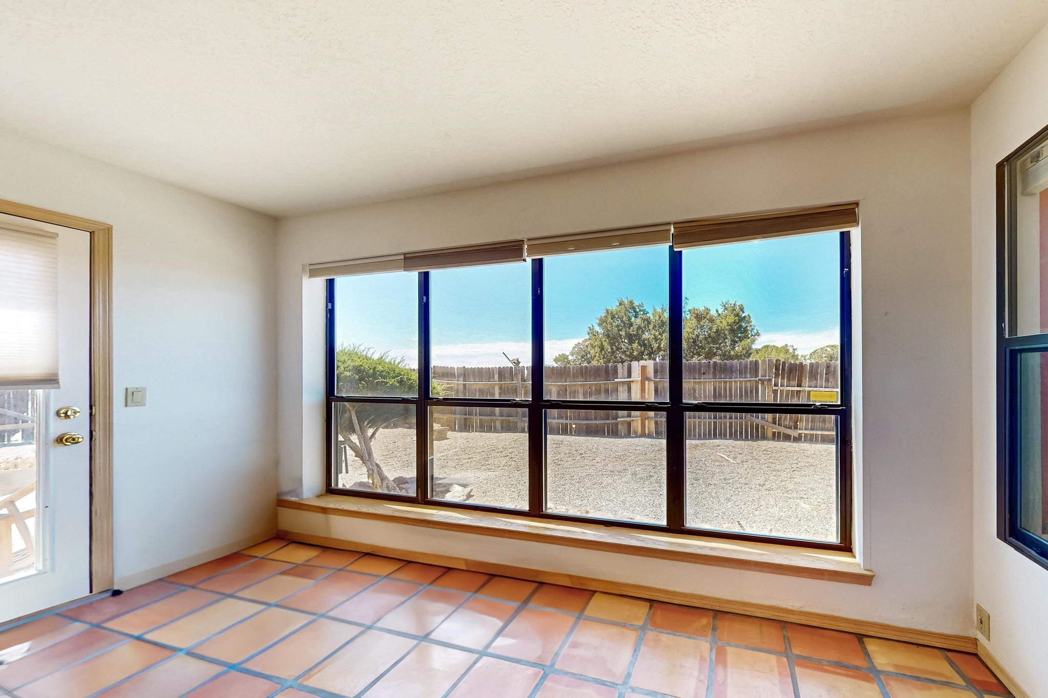 Lovely light classic contemporary pueblo, open plan design with a large extra sunroom. Natural gas forced air with a swamp cooler hook up giving central air conditioning to give both winter heat and summer cool. A 2 way wood burning fireplace with a gas log starter sits between the living room and main bedroom. A private front courtyard, Saltillo floors, viga beams and corbels add a touch of SF character. Ceiling fans in all rooms, one year old hot water heater and a brand new septic tank installed 2024. There is a privately fenced back yard accessed from the sunroom and sunny dining area for entertaining or quiet relaxation. This home sits back on 1.6 acres accessed by paved roads within easy reach of Eldorado amenities, two local shopping centers, schools, parks, library and senior center, only minutes into Santa Fe.