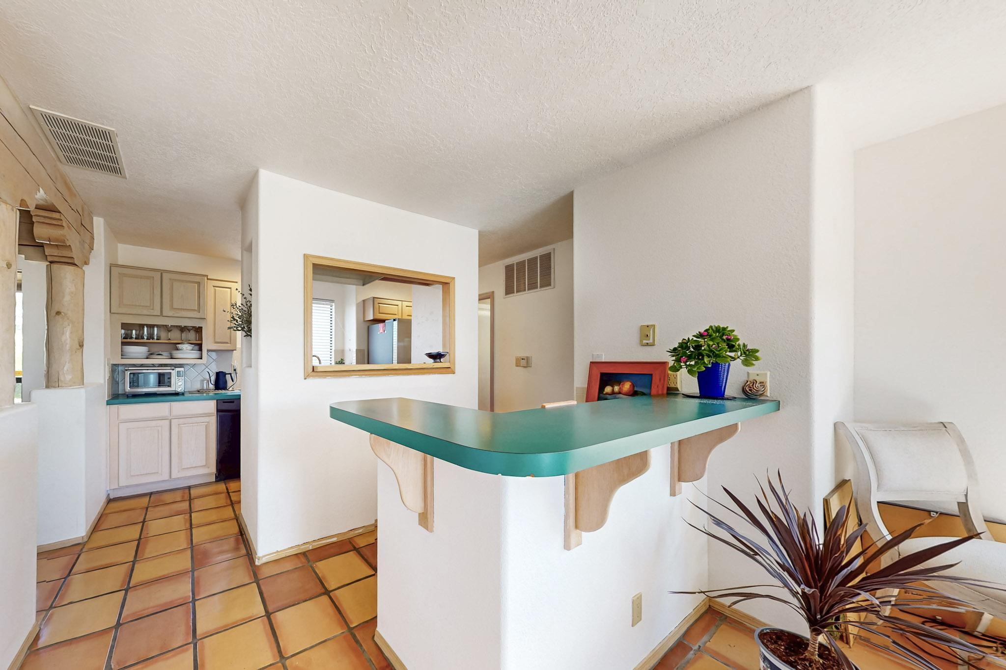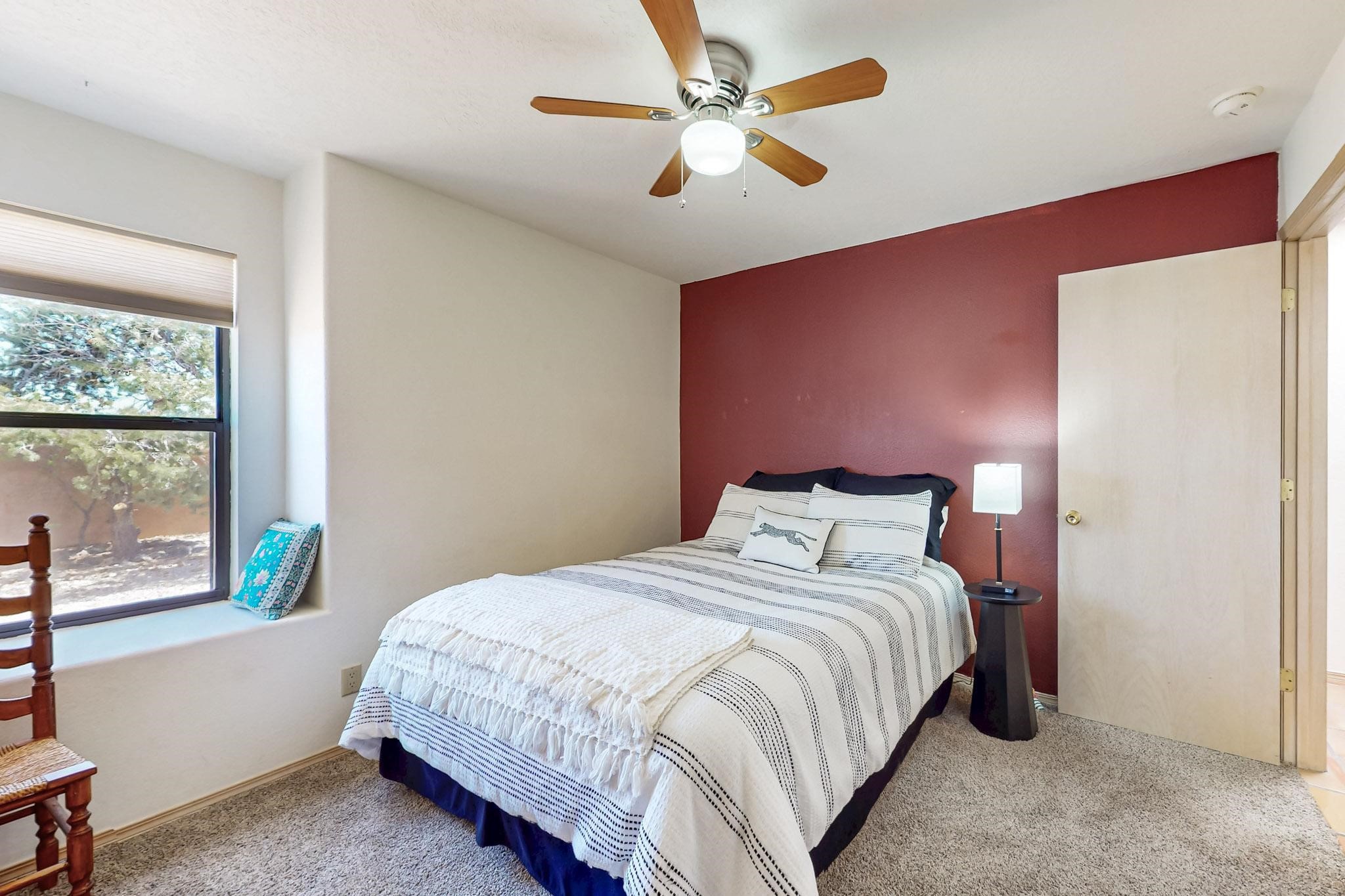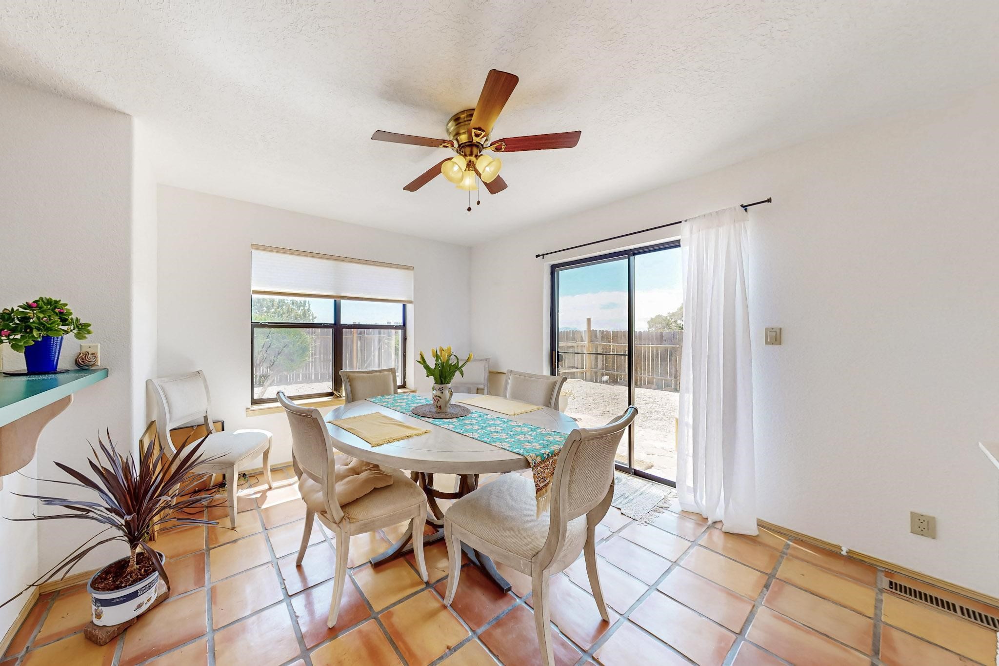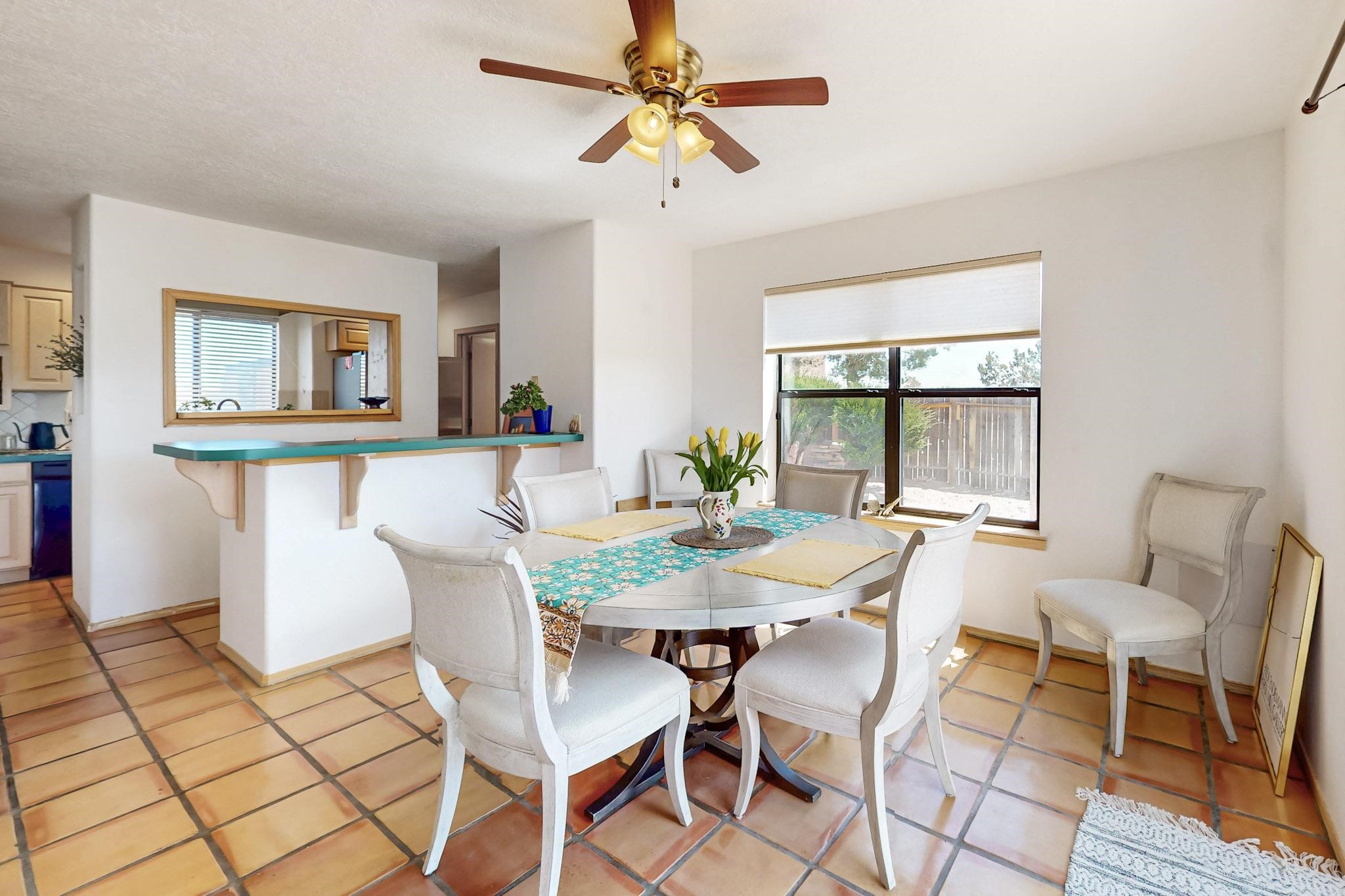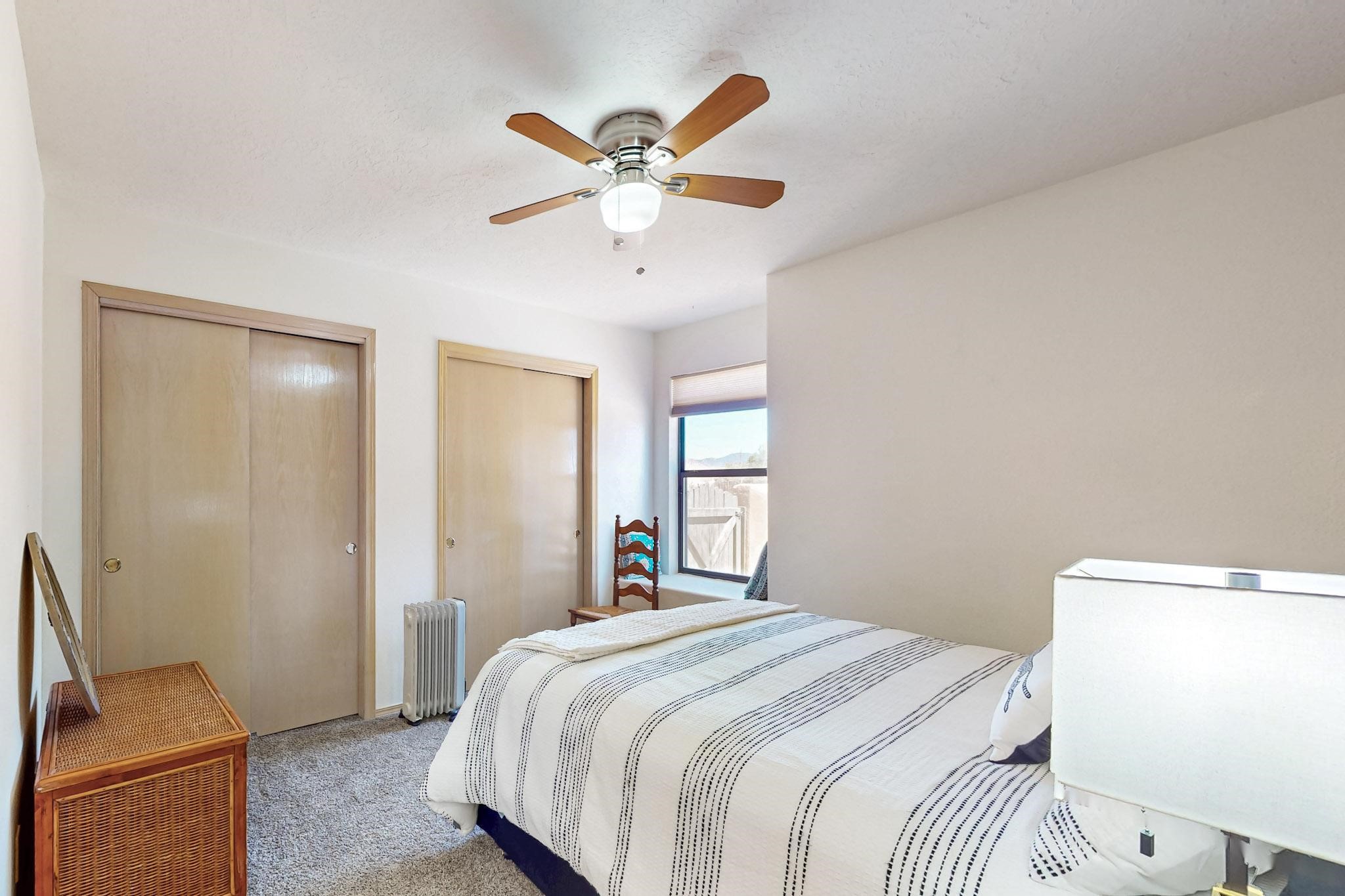 Lovely light classic contemporary pueblo, open plan design with a large extra sunroom. Natural gas forced air with a swamp cooler hook up giving central air conditioning to give both winter heat and summer cool. A 2 way wood burning fireplace with a gas log starter sits between the living room and main bedroom. A private front courtyard, Saltillo floors, viga beams and corbels add a touch of SF character. Ceiling fans in all rooms, one year old hot water heater and a brand new septic tank installed 2024. There is a privately fenced back yard accessed from the sunroom and sunny dining area for entertaining or quiet relaxation. This home sits back on 1.6 acres accessed by paved roads within easy reach of Eldorado amenities, two local shopping centers, schools, parks, library and senior center, only minutes into Santa Fe.