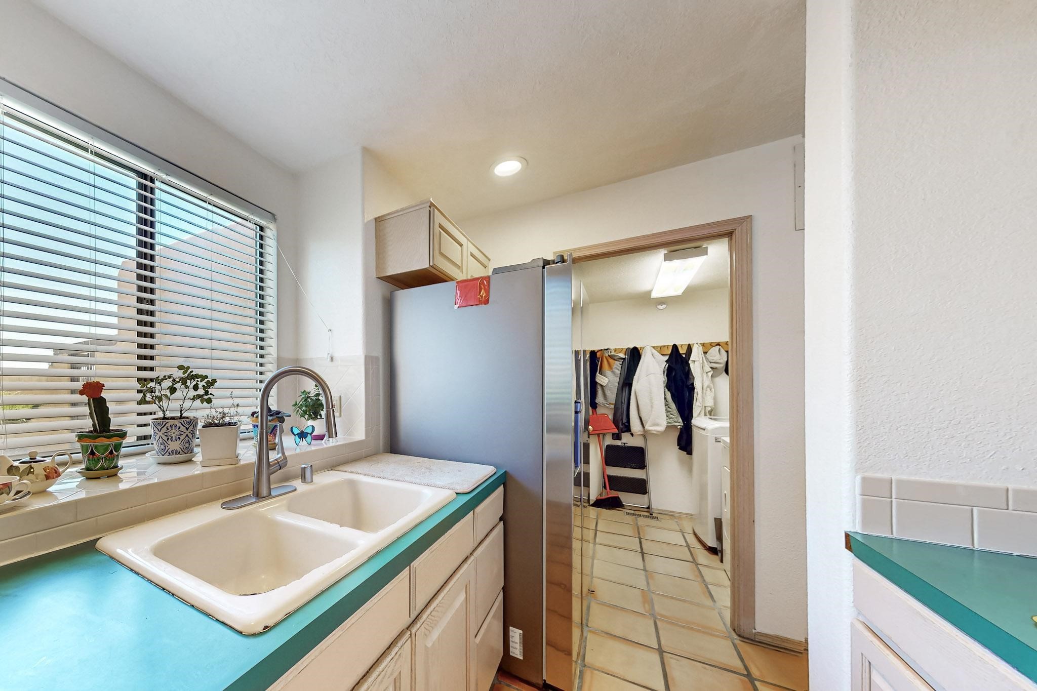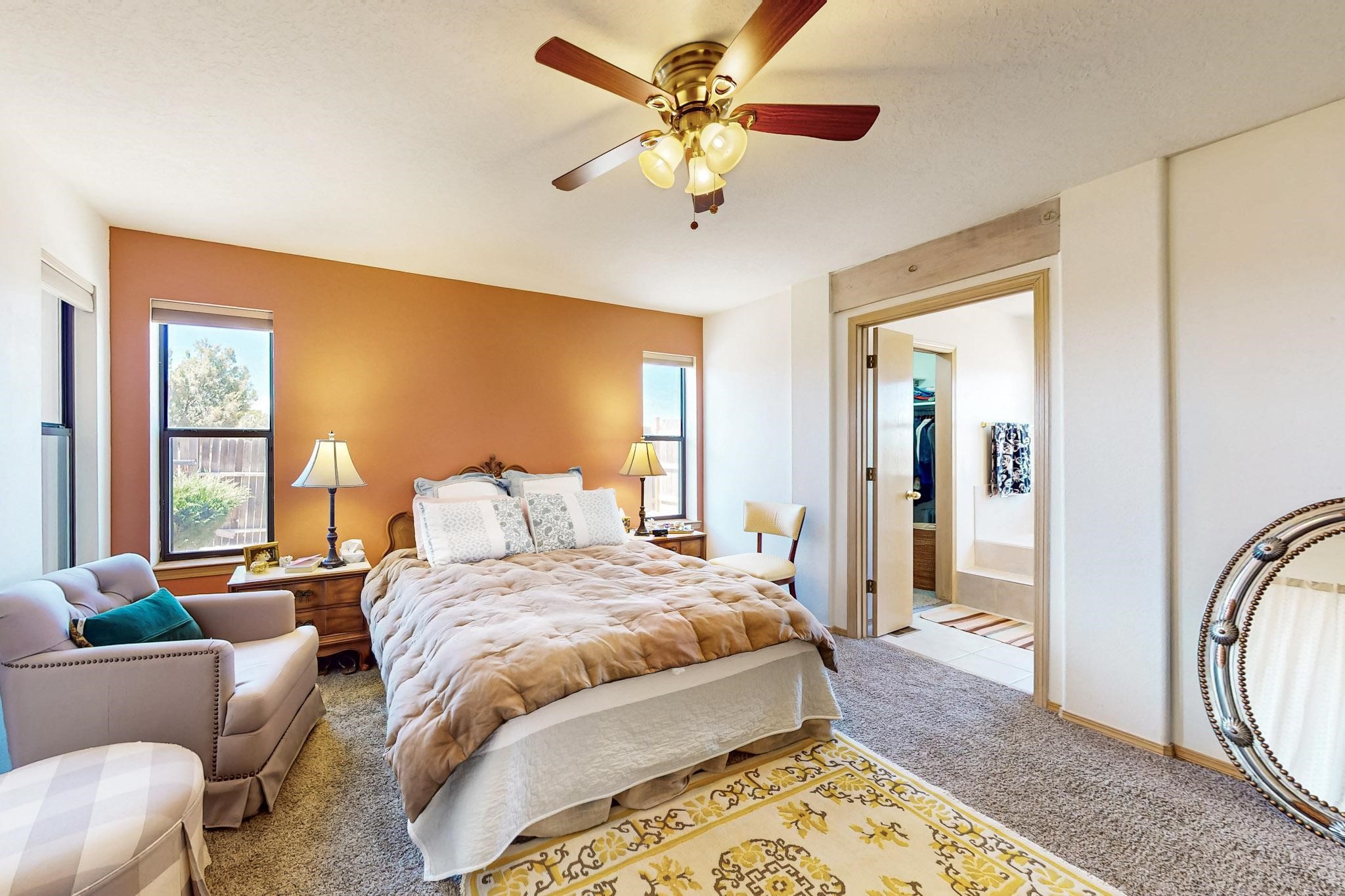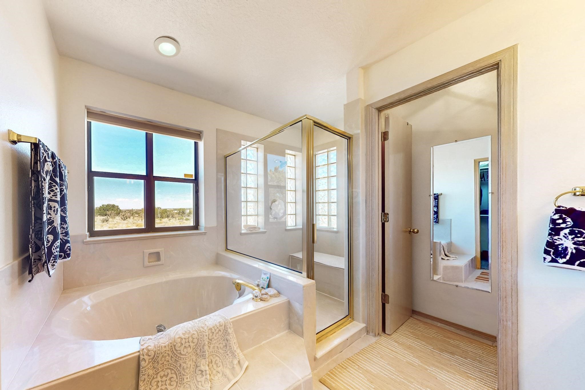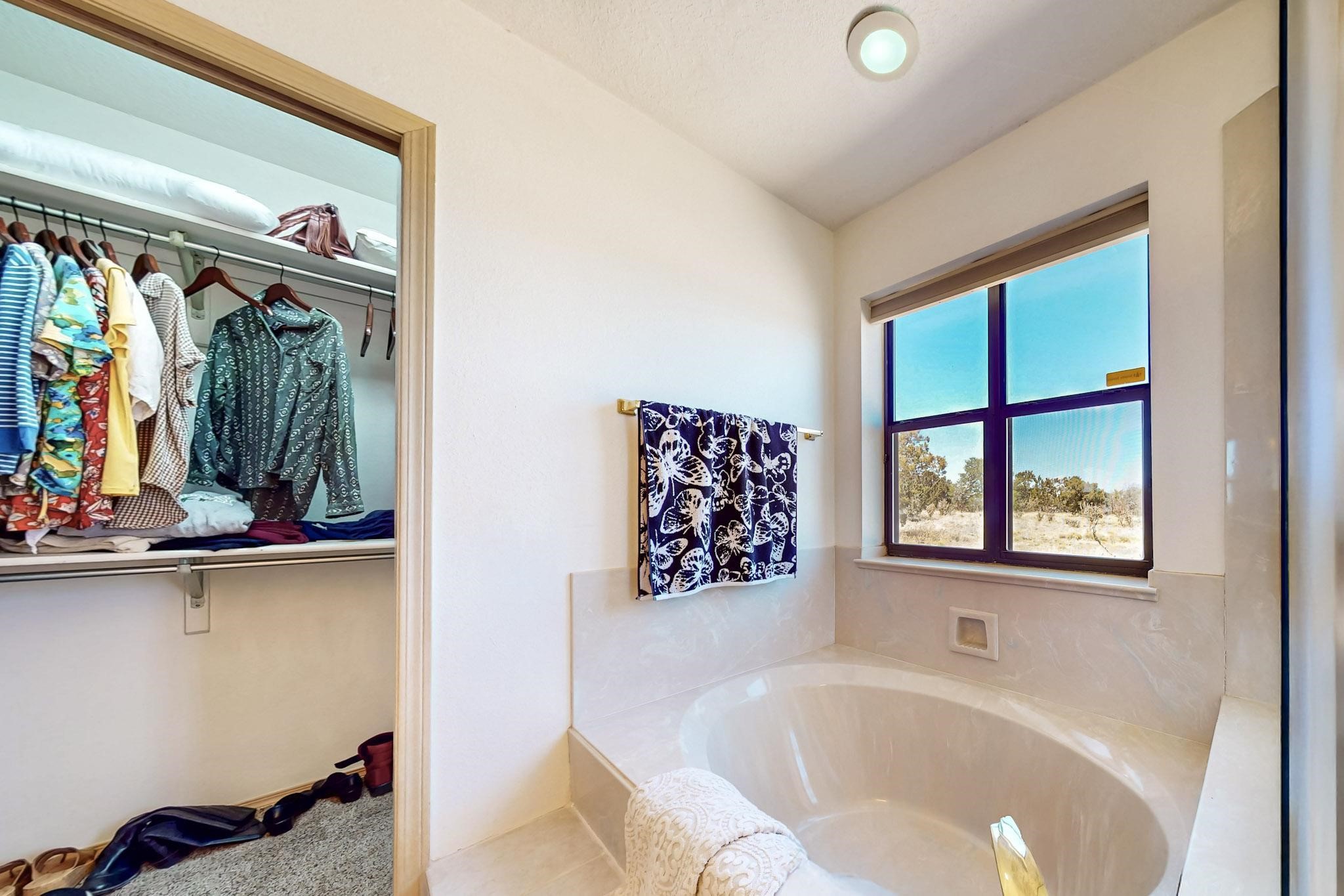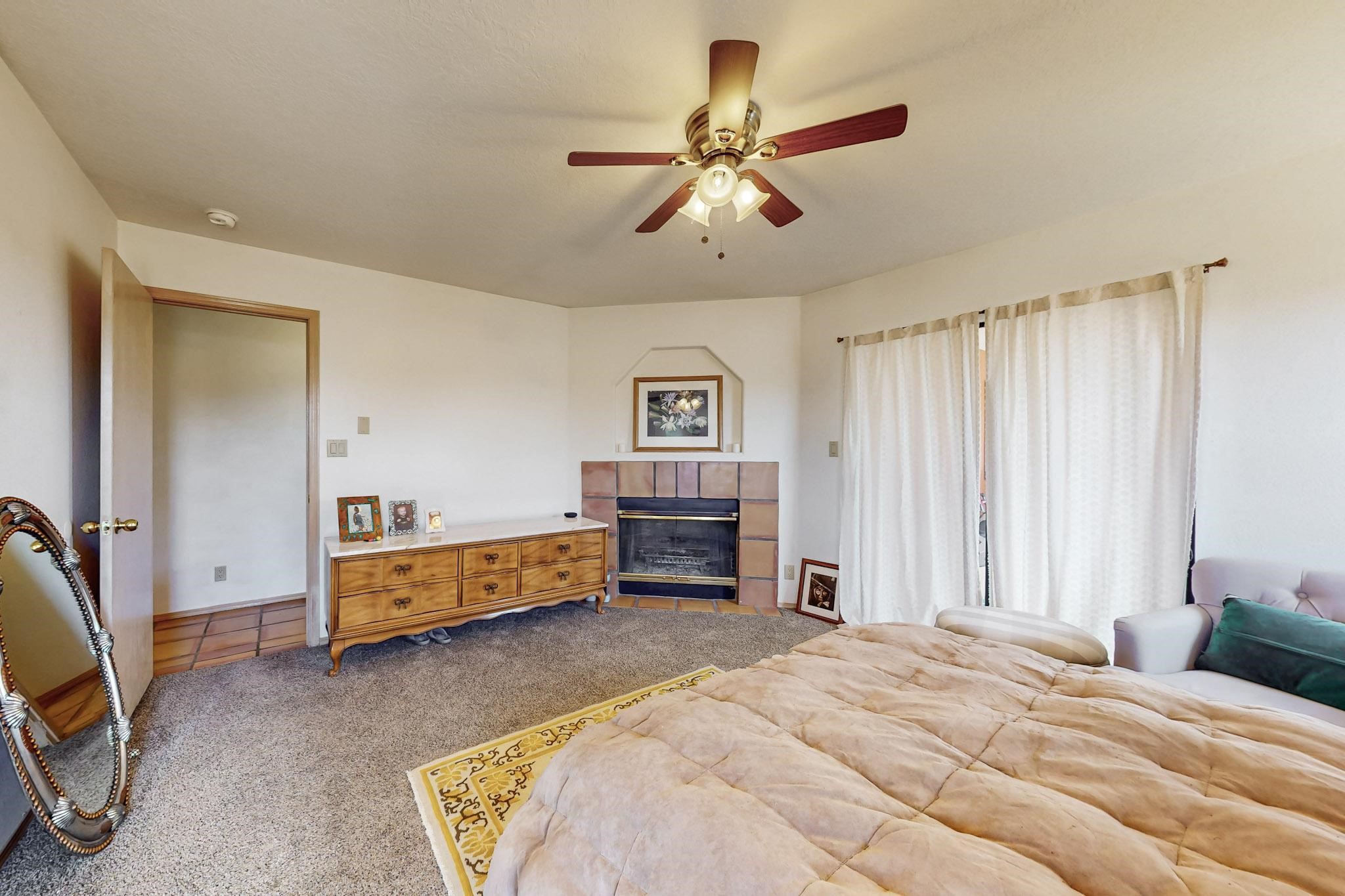 Lovely light classic contemporary pueblo, open plan design with a large extra sunroom. Natural gas forced air with a swamp cooler hook up giving central air conditioning to give both winter heat and summer cool. A 2 way wood burning fireplace with a gas log starter sits between the living room and main bedroom. A private front courtyard, Saltillo floors, viga beams and corbels add a touch of SF character. Ceiling fans in all rooms, one year old hot water heater and a brand new septic tank installed 2024. There is a privately fenced back yard accessed from the sunroom and sunny dining area for entertaining or quiet relaxation. This home sits back on 1.6 acres accessed by paved roads within easy reach of Eldorado amenities, two local shopping centers, schools, parks, library and senior center, only minutes into Santa Fe.