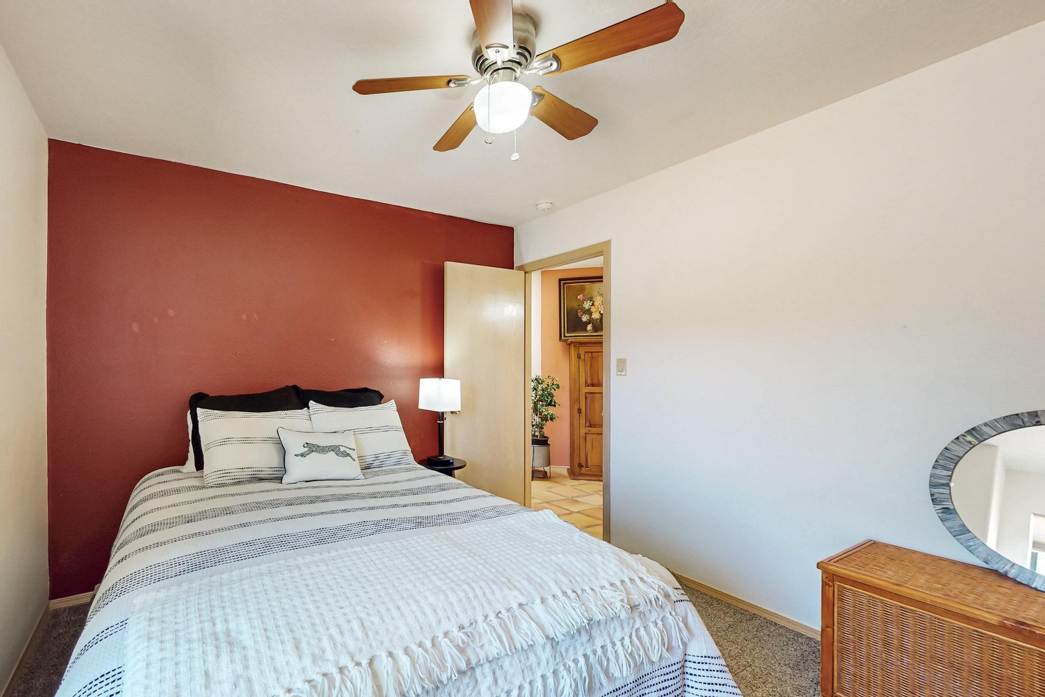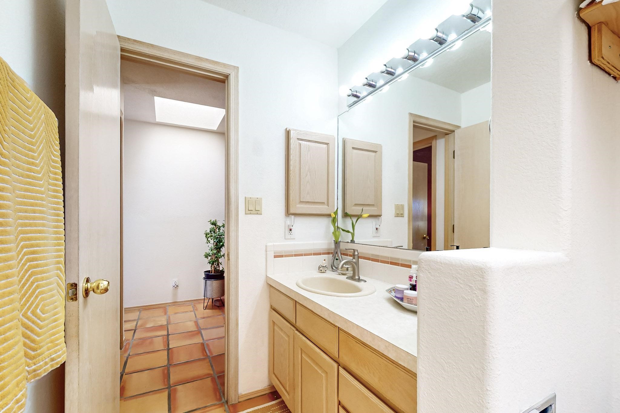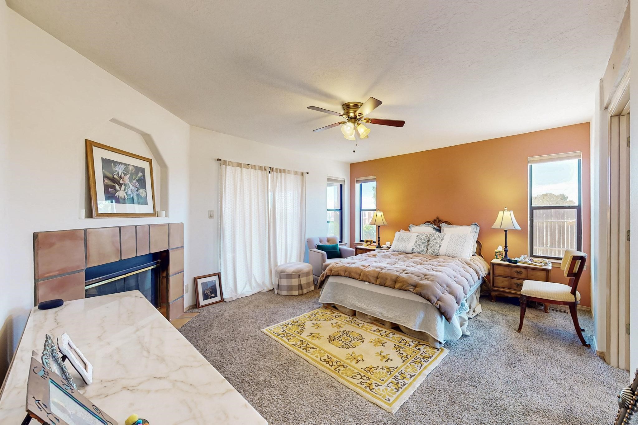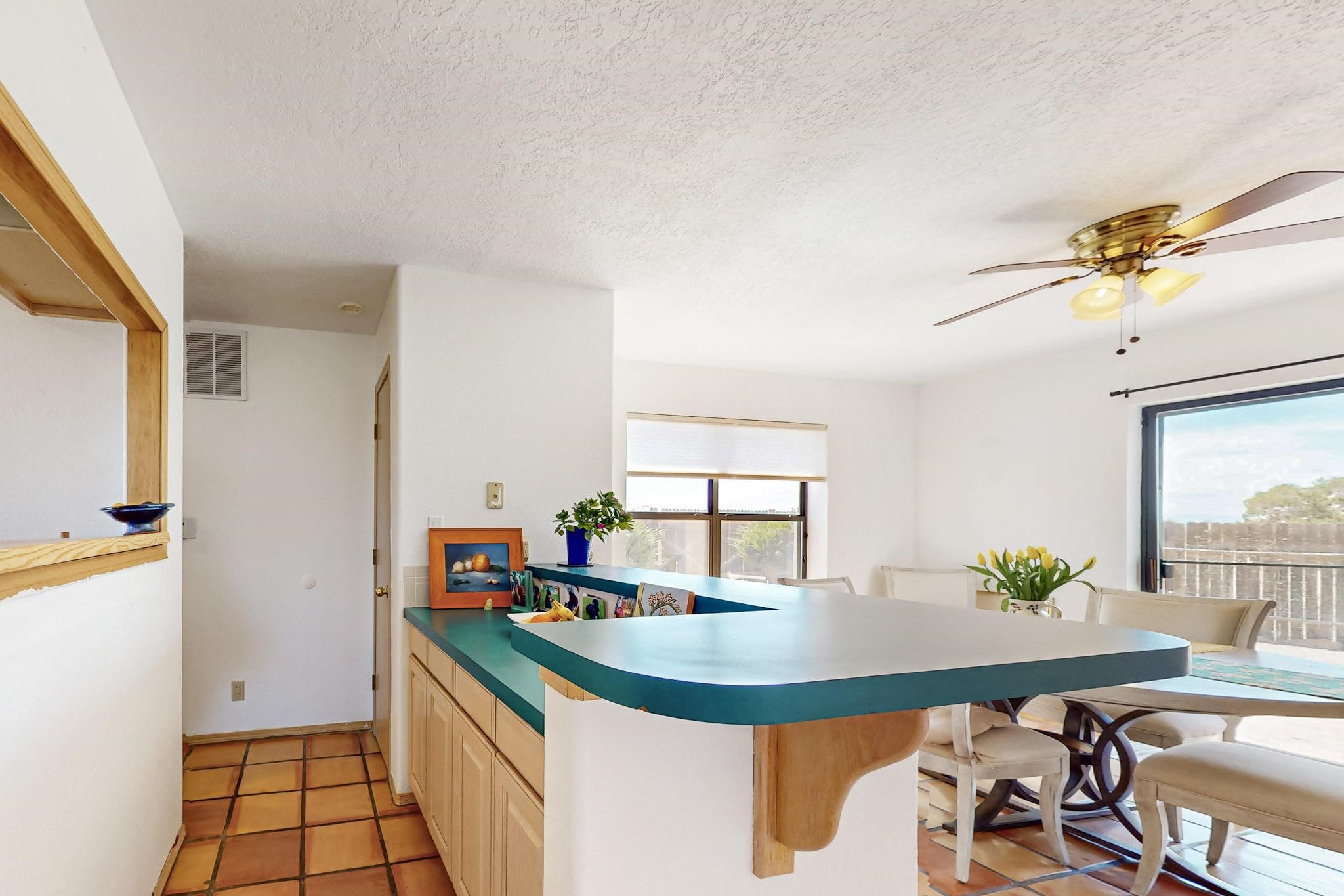 Lovely light classic contemporary pueblo, open plan design with a large extra sunroom. Natural gas forced air with a swamp cooler hook up giving central air conditioning to give both winter heat and summer cool. A 2 way wood burning fireplace with a gas log starter sits between the living room and main bedroom. A private front courtyard, Saltillo floors, viga beams and corbels add a touch of SF character. Ceiling fans in all rooms, one year old hot water heater and a brand new septic tank installed 2024. There is a privately fenced back yard accessed from the sunroom and sunny dining area for entertaining or quiet relaxation. This home sits back on 1.6 acres accessed by paved roads within easy reach of Eldorado amenities, two local shopping centers, schools, parks, library and senior center, only minutes into Santa Fe.