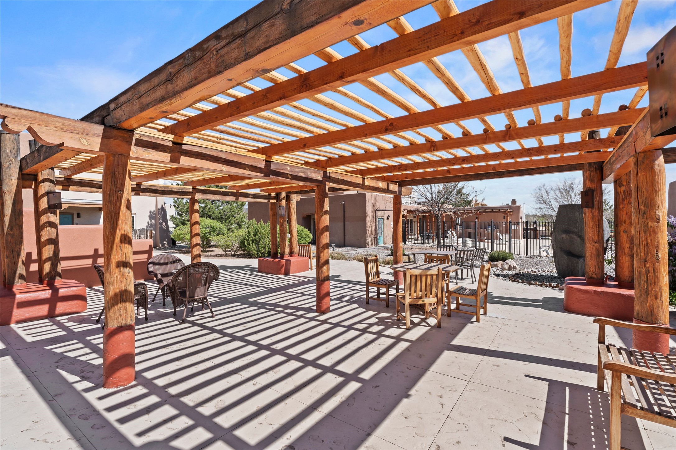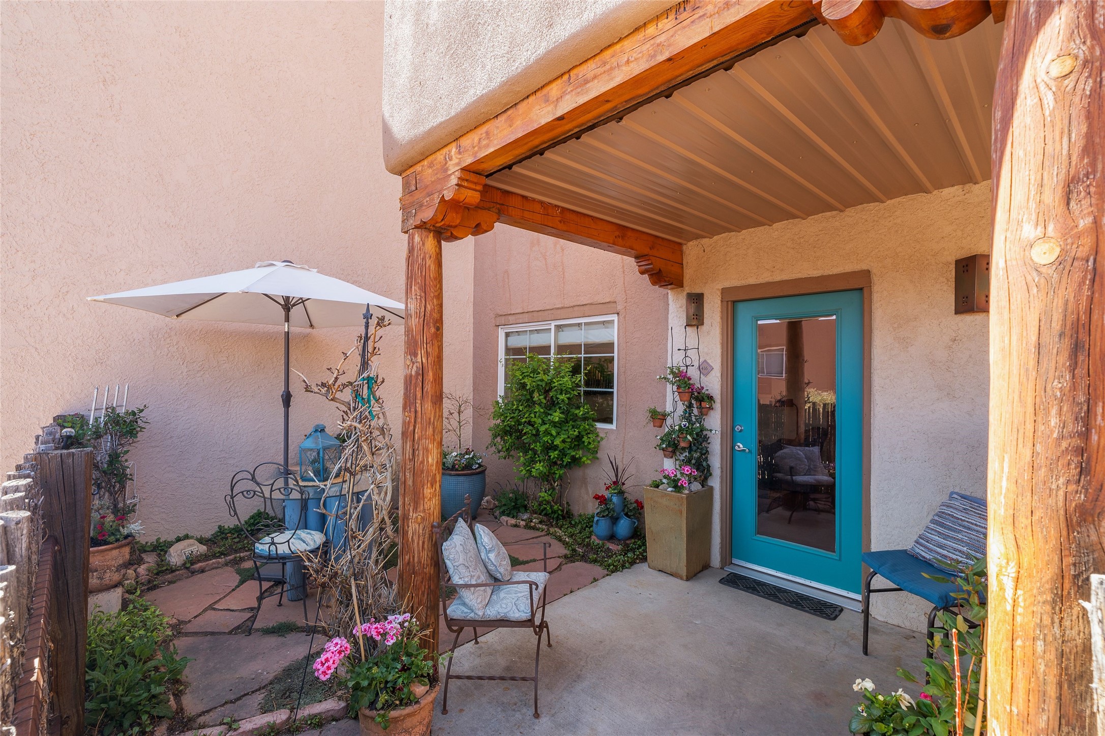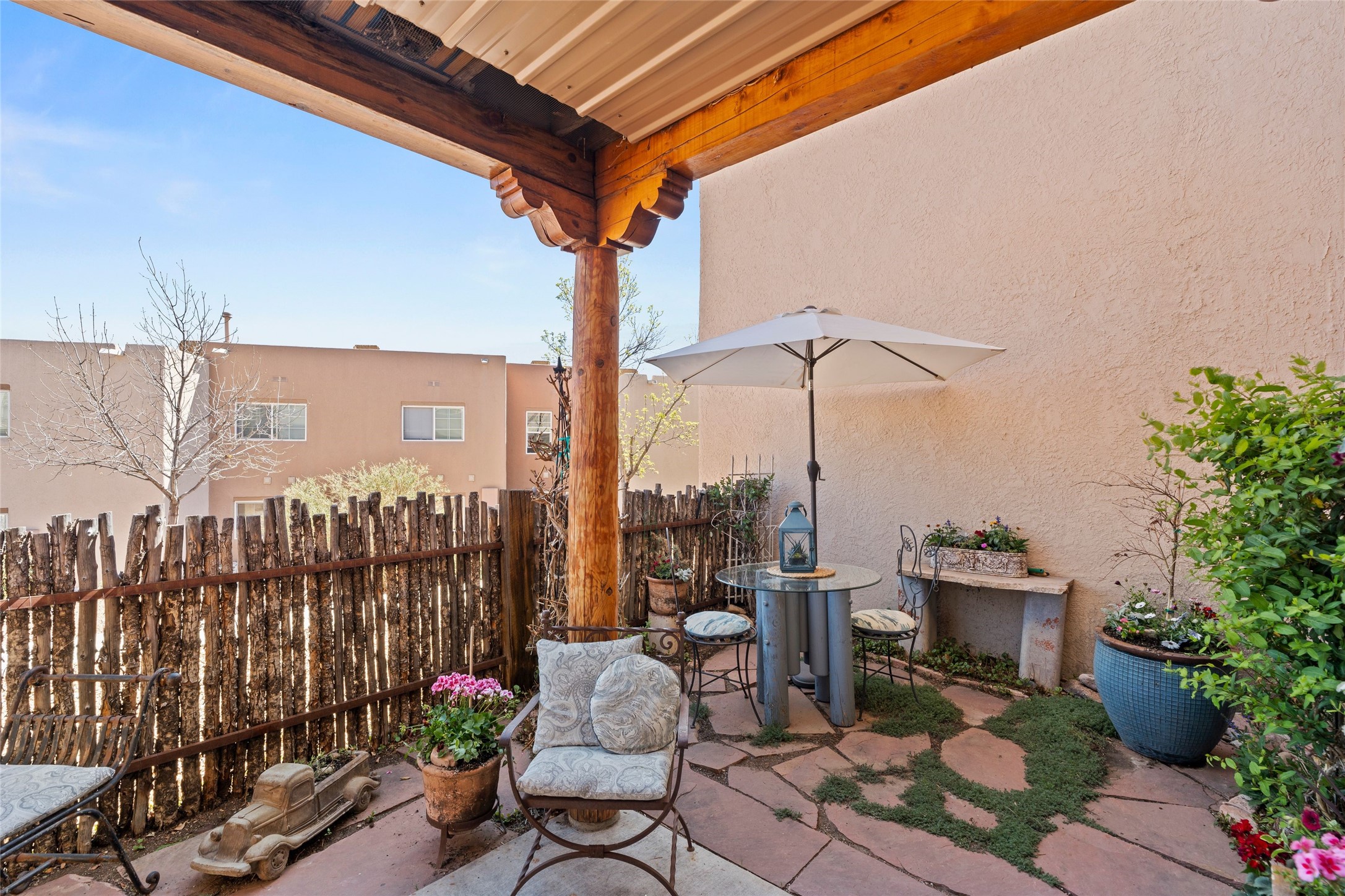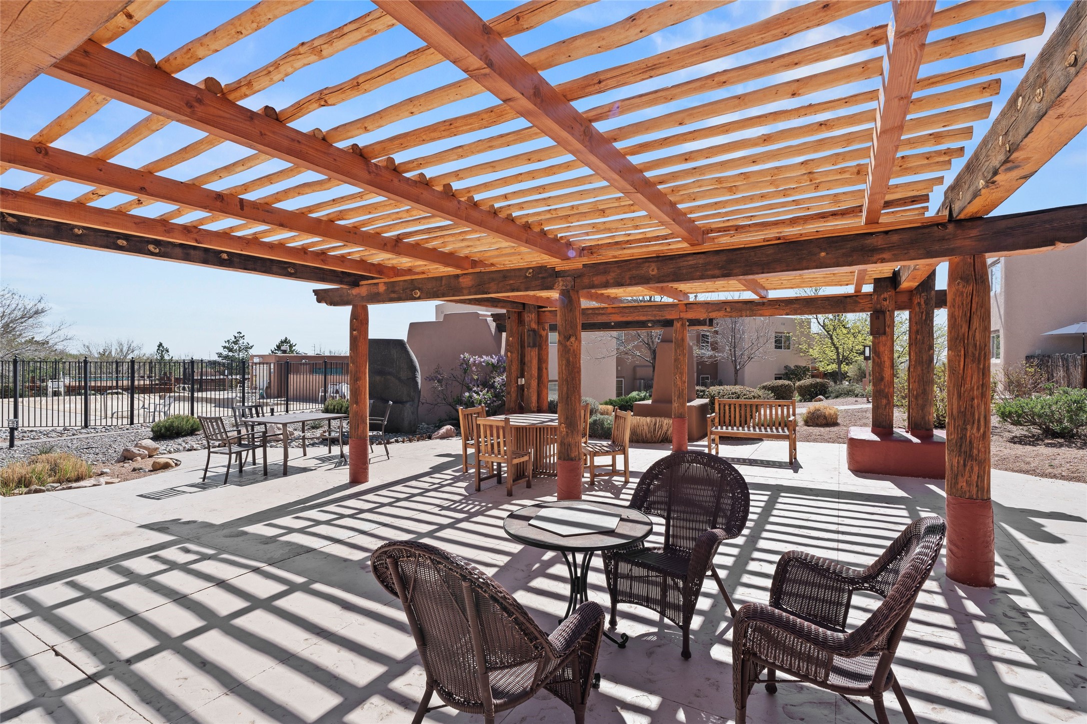 Prime location in Dos Santos. This single level condo on the first floor has a large, inviting front courtyard and opens out to a large common space ramada. This one bedroom, one bath condo with in-unit laundry has charming touches. This center unit is in close proximity to amenities including a seasonal swimming pool, hot tub, fitness area, outdoor grills and clubhouse. The complex also has security gates and a pet area. Convenient location near shopping, schools, medical facilities walking/biking trails.