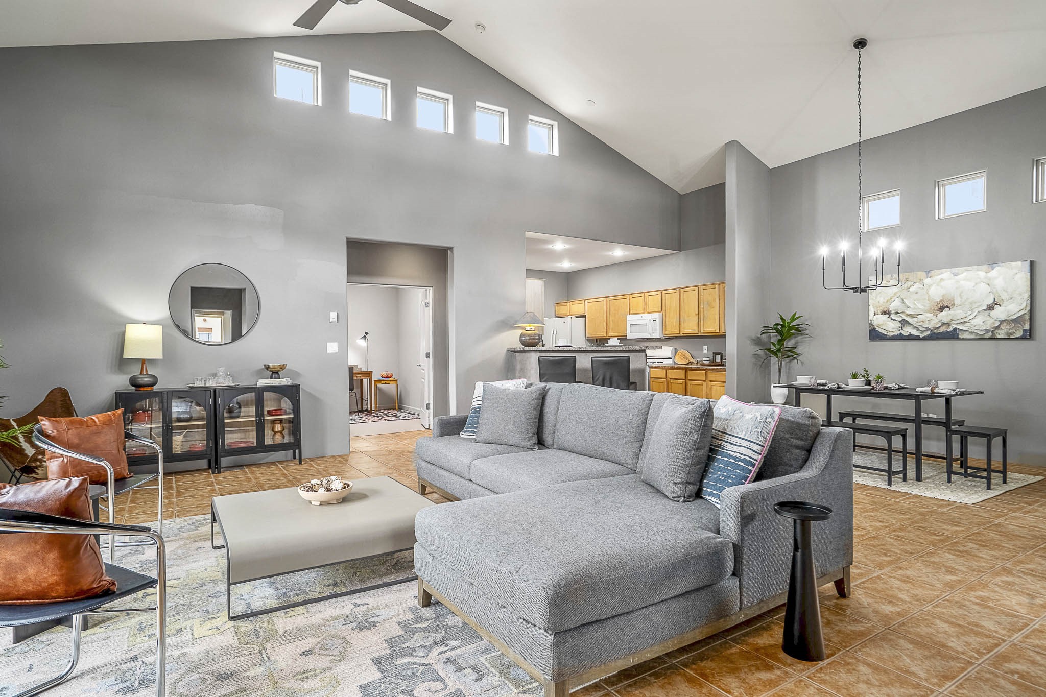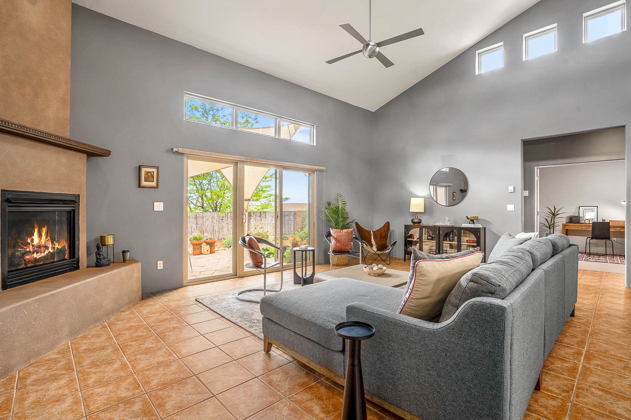 Sitting on a much desired corner lot in Santa Fe's Tierra Contenta neighborhood, this charming, single-level (no interior steps!), 3-bedroom, 2-bathroom home offers a unique blend of Northern New Mexico style and modern design elements. Step inside and you will be captivated by the soaring ceilings in the open-concept, light-filled living and dining space. Thoughtfully designed for both comfort and versatility is a bonus office or den--perfect for remote work or creative pursuits. The home's contemporary flare features exposed, painted, concrete floors in many rooms and is complemented by luxurious radiant in-floor heating throughout, creating a cozy retreat during Santa Fe's cooler seasons. Equally special, is the private, wrap-around backyard, adorned with flowers and several mature trees, that a corner lot provides. Enjoy sunny mornings and peaceful evenings from this outdoor retreat. The patio is completed with clever sun shades that provide comfort in the warmer months and are easy to stow away for the winter season.The spacious, attached, two-car garage offers ample storage, making this sweet property the complete package. Tierra Contenta features convenient access to Highway 599, shops and restaurants, and is ideally located for those commuting to Albuquerque or Los Alamos. This fabulous find in Tierra Contenta combines privacy, style, and functionality in one of Santa Fe's beloved communities.