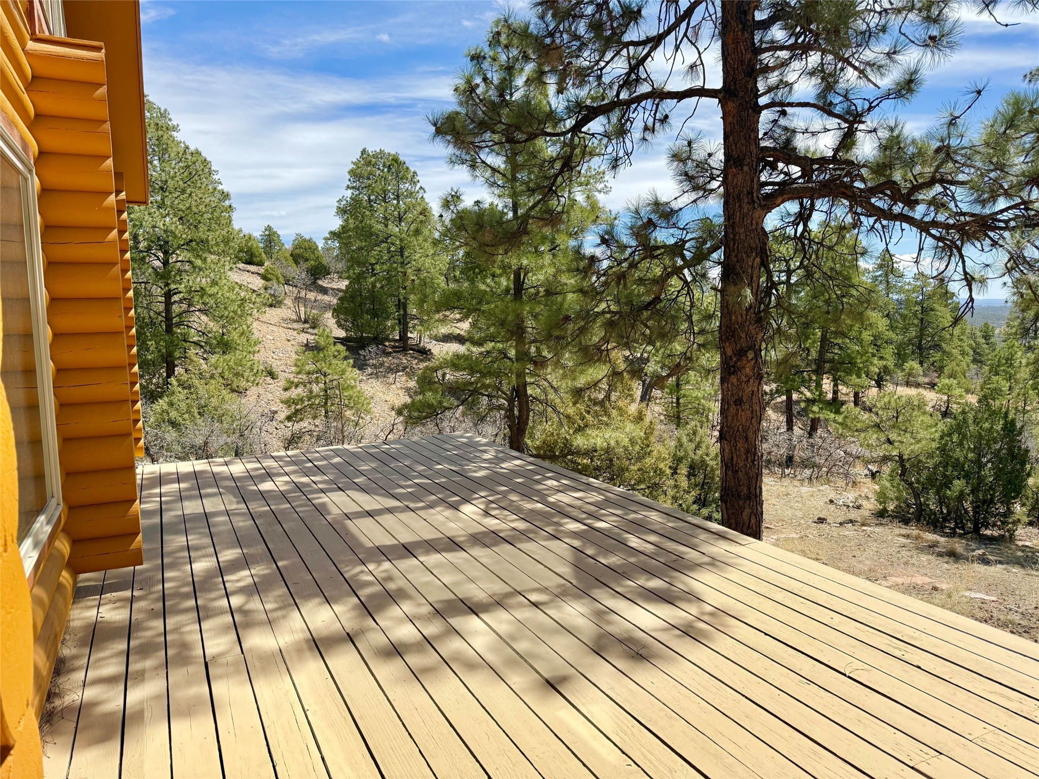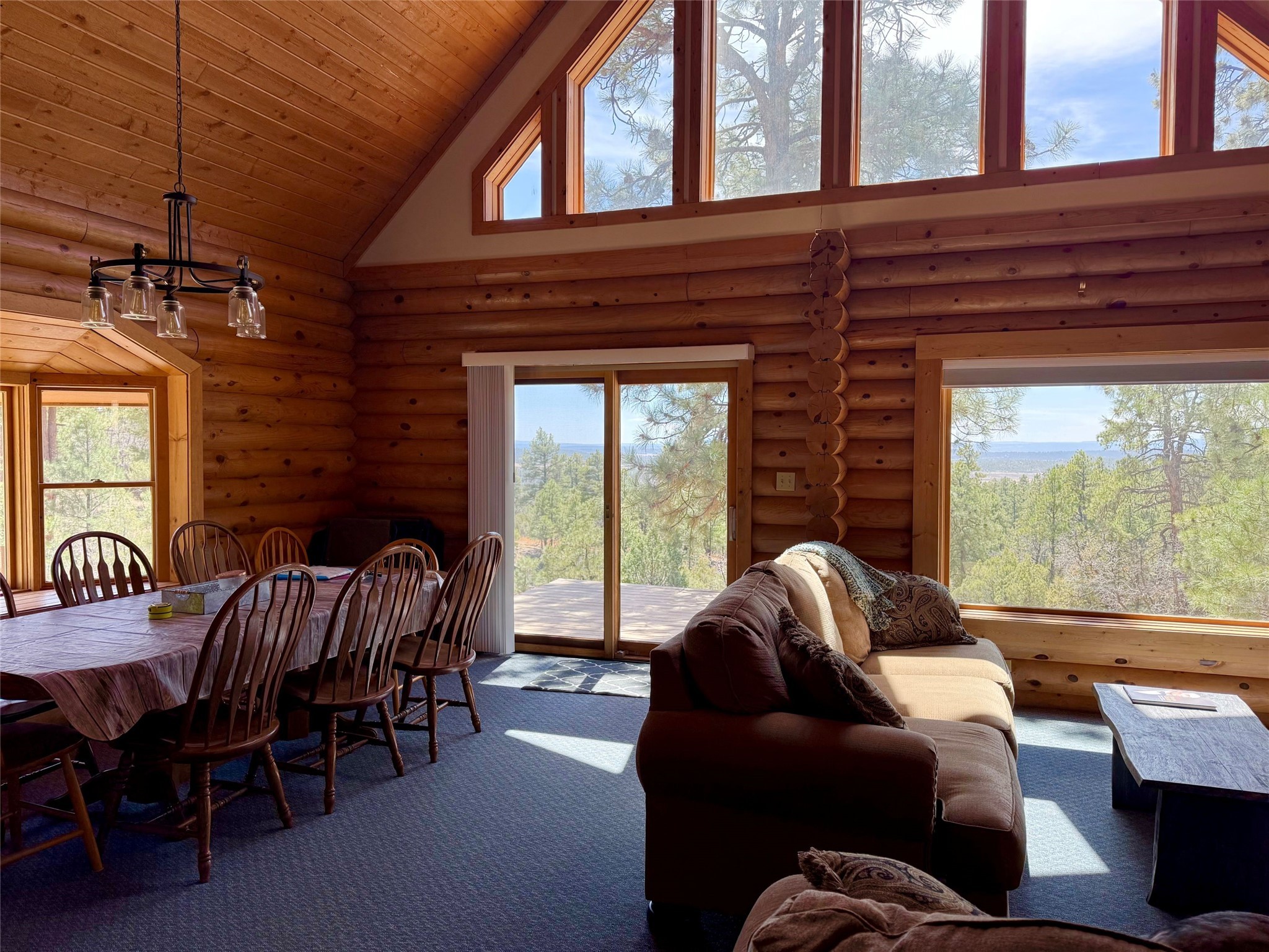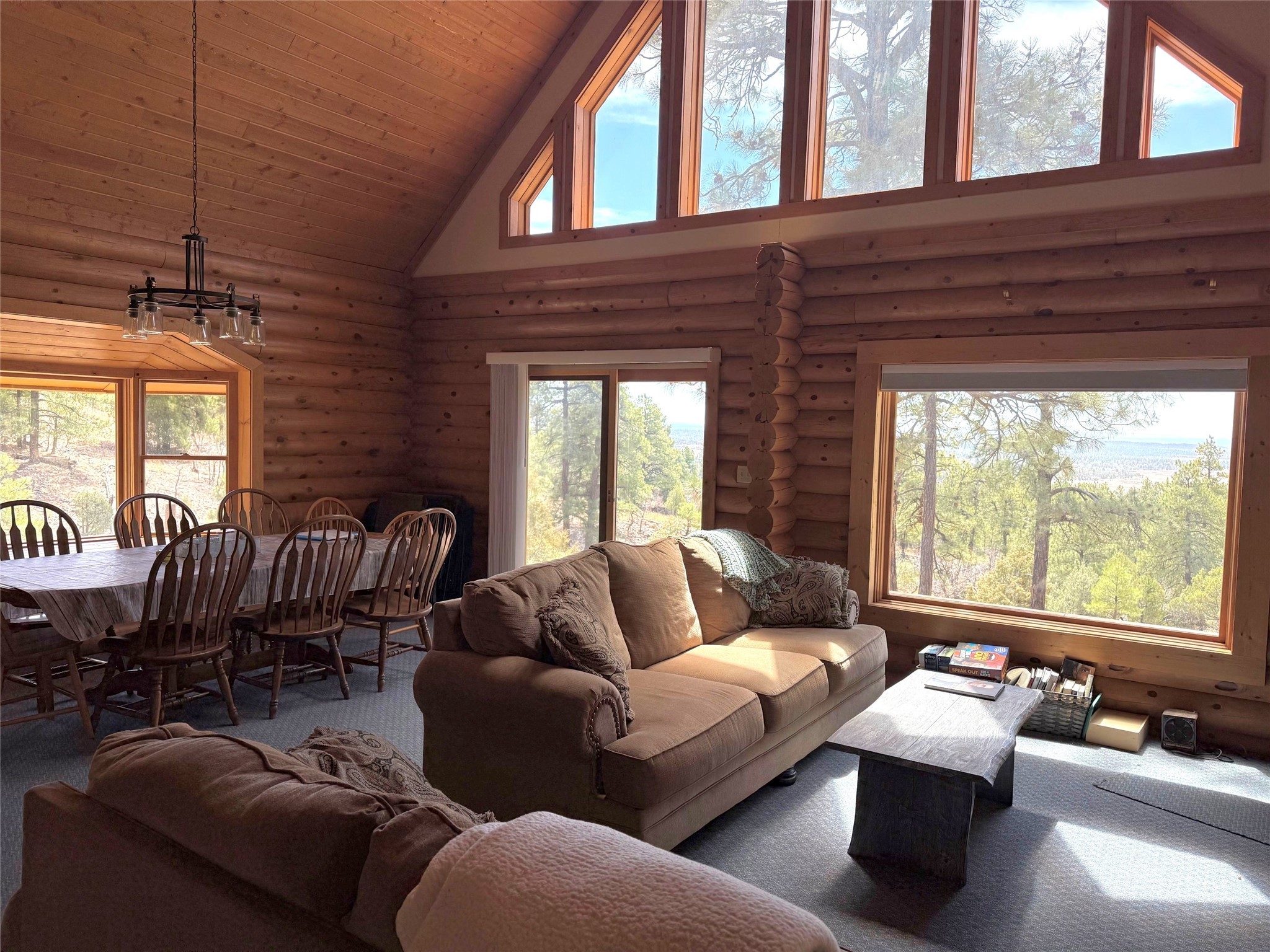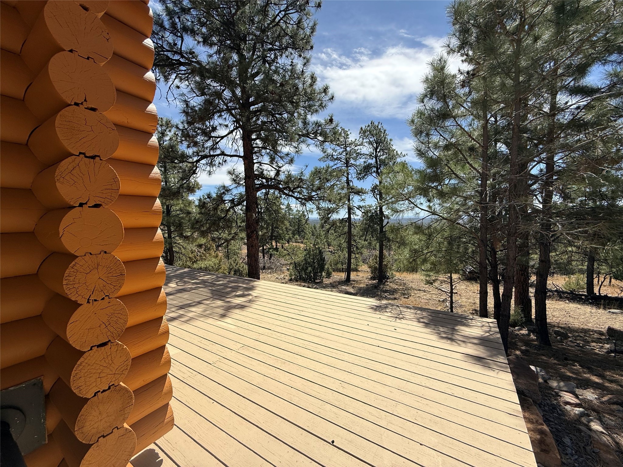 Located in Laguna Vista, this property offers spectacular views! On approximately 5 acres, this comfortable two story log cabin is nicely secluded, mostly level with plenty of trees. Exterior of cabin was recently painted. Open and airy with plenty of natural light, the kitchen is on the first level along with the living room, main Suite and bath. The two guest bedrooms are upstairs as well as bathroom and loft that can be used for additional sleeping, arts and craft space or a reading room. Furniture is negotiable; mattress are barely used, if at all. The large deck is great for enjoying company, bird watching and just relaxing. Hunting, hiking and boating are popular in the Chama and Tierra Amarilla Valley. A seasonal creek runs through the back yard and for those fishing enthusiasts there is access to N. side of Heron Lake in the Subdivision. Plenty of parking for your RV. Escape the city life for Northern New Mexico's recreation and fun!