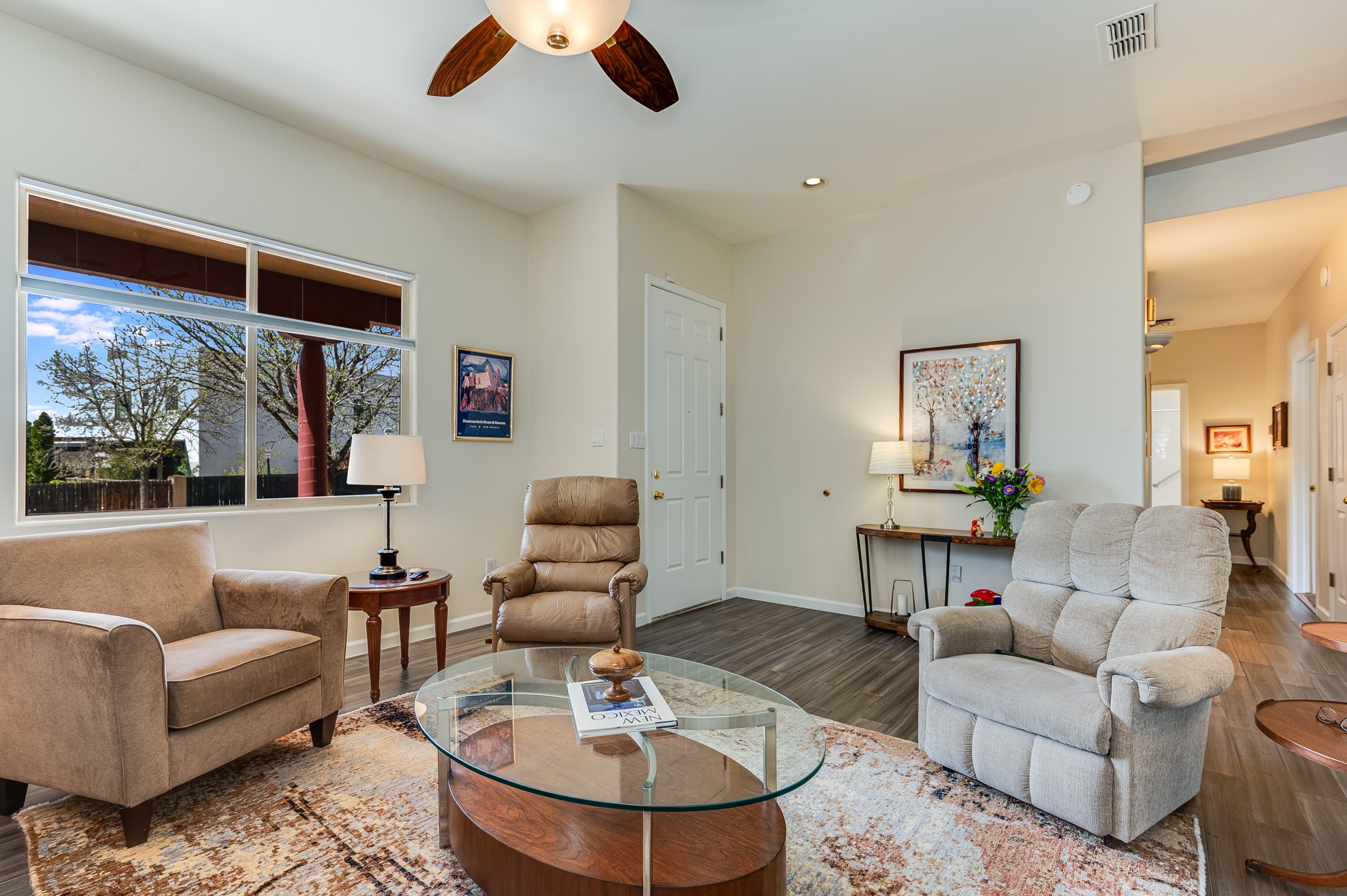 Comfort meets convenience in this inviting and well-maintained single-level home nestled next to the Santa Fe Country Club and surrounded by picturesque walking trails. The open eat-in kitchen features an island for meal preparation and an area for casual dining, making it a welcoming space for gatherings. The large screened back porch just outside the kitchen provides an ideal spot for relaxation or entertaining friends and family. The fully fenced back yard provides privacy, while the two side yard areas offer ample space for a dog run and various back yard activities. Three bedrooms and two bathrooms include a primary bedroom with en-suite bathroom and a second bathroom in the hallway, ensuring ample space for everyone. With plenty of built-in shelving in closets and a two-car garage with additional storage space, organization and storage are a breeze. Recent updates in the past few years include a new roof, fresh interior paint throughout, and exterior maintenance and painting. Whether you're commuting to work or planning a getaway, you'll appreciate the proximity to the Veterans Memorial Highway/599 and the Santa Fe Regional Airport. No Homeowners Association (HOA).