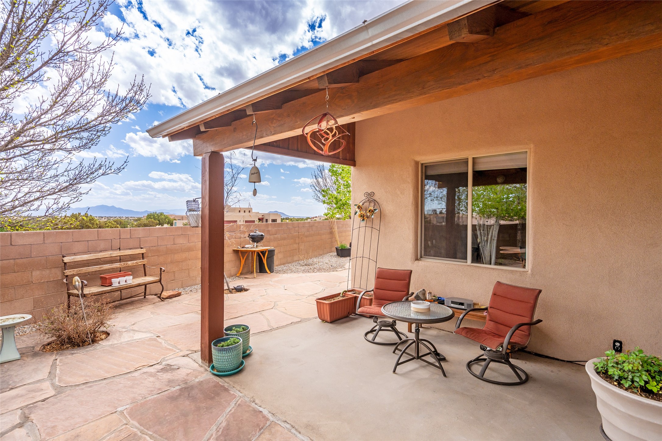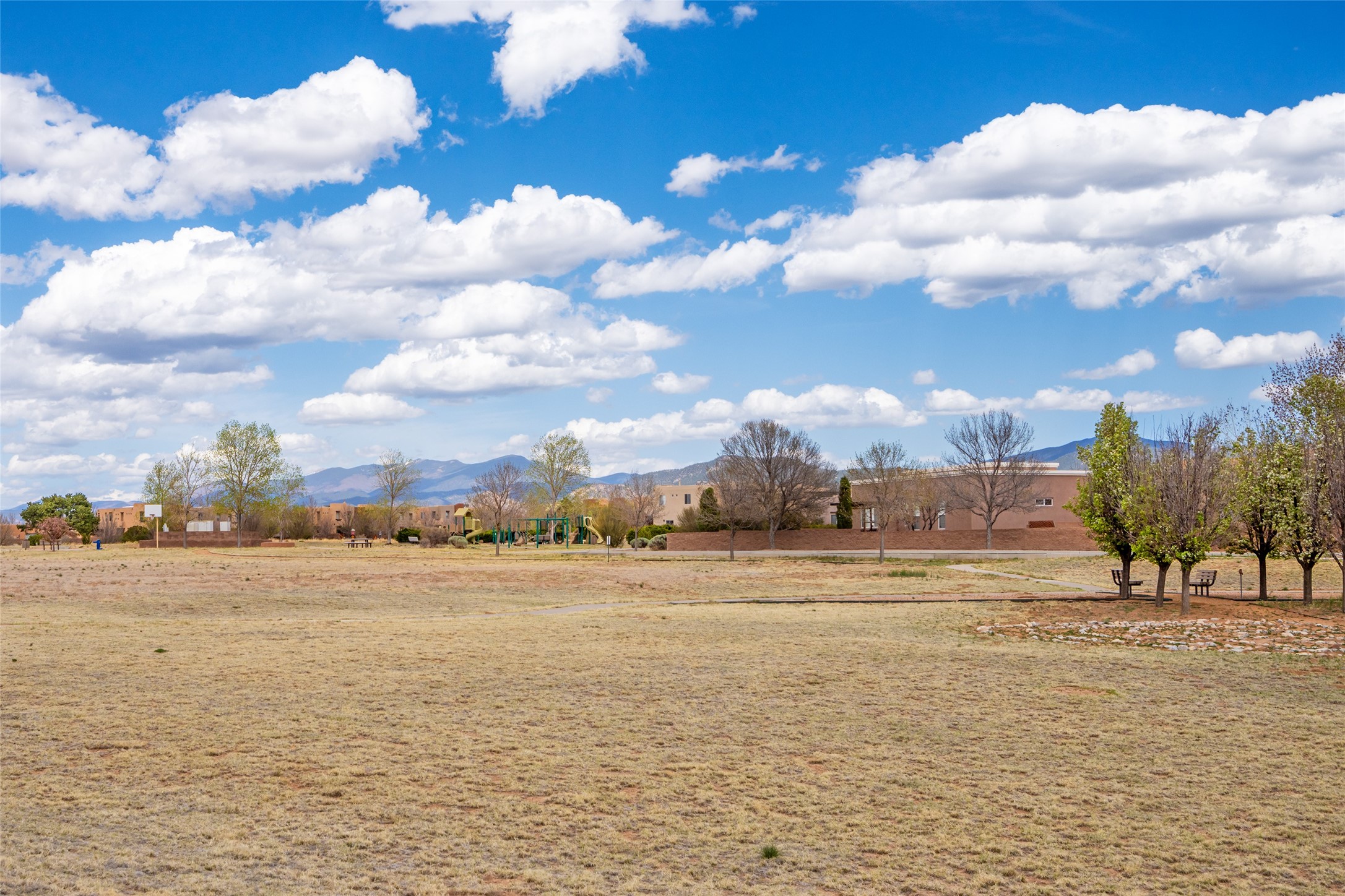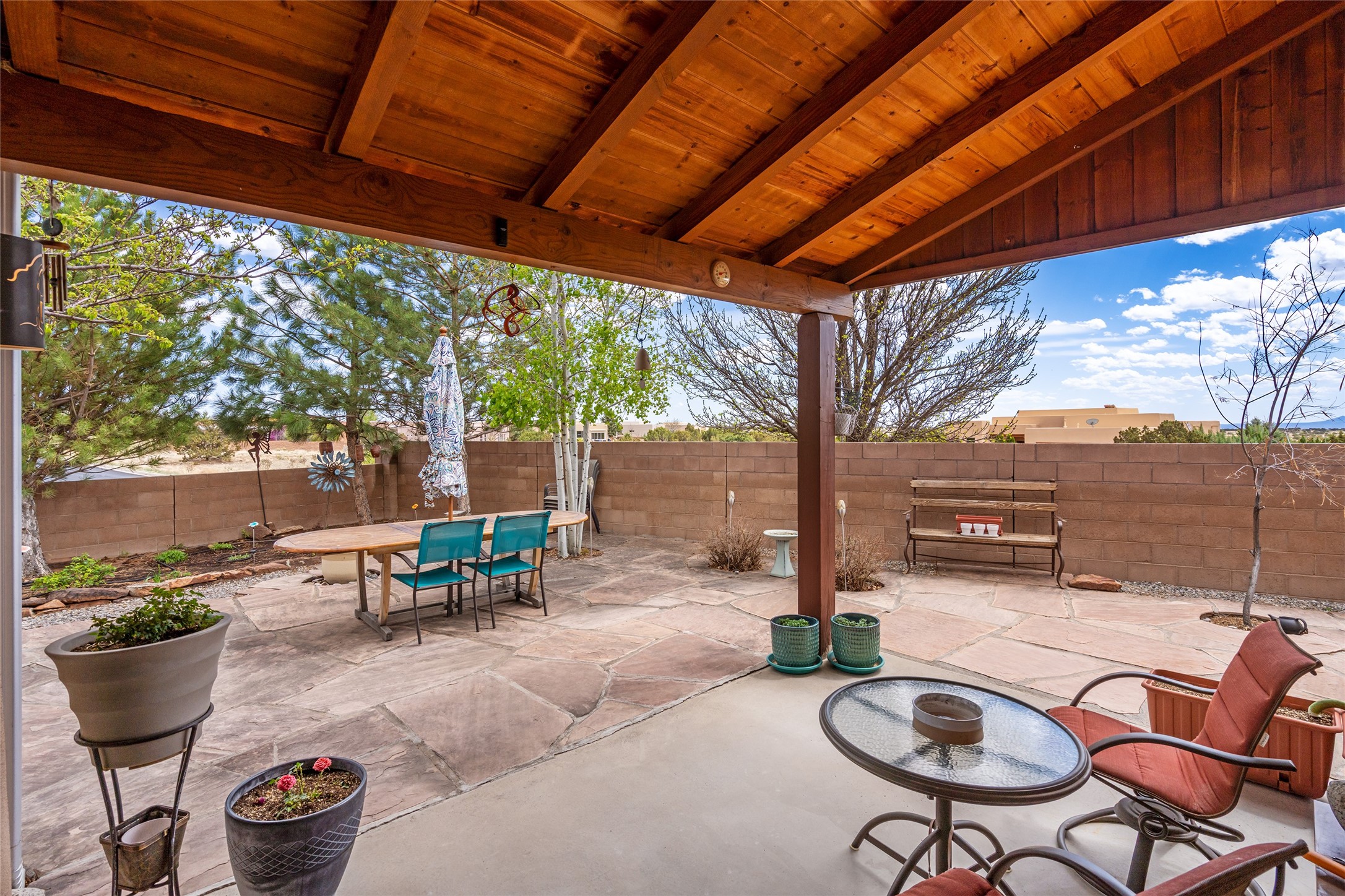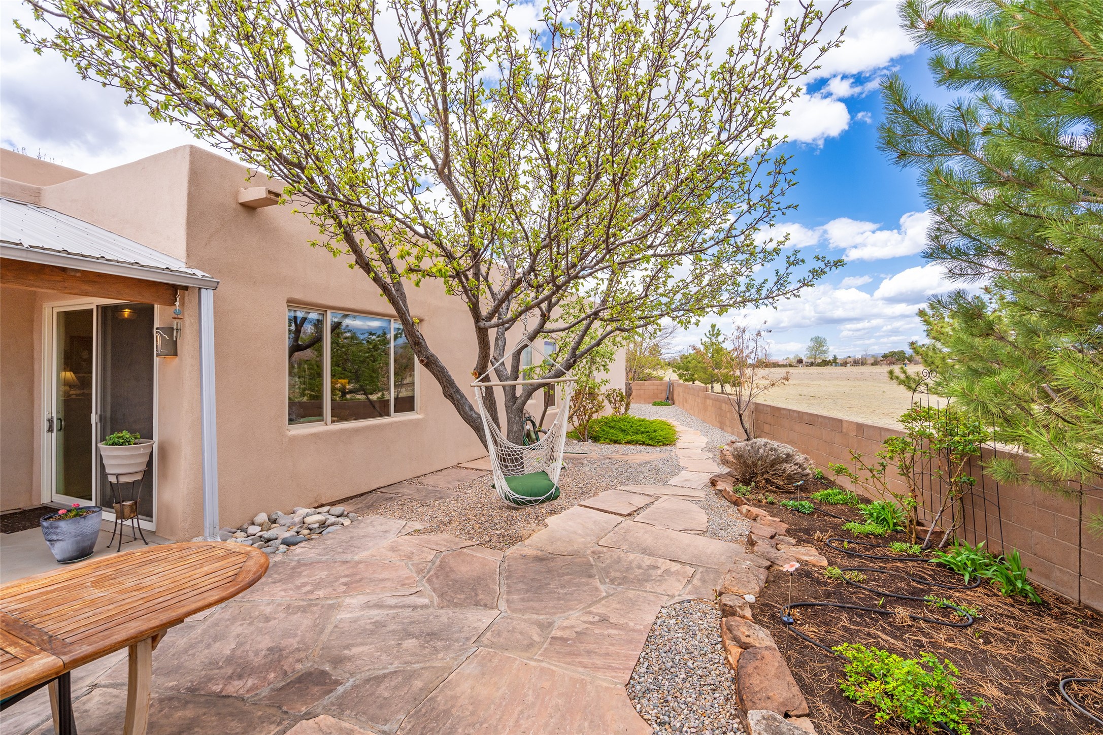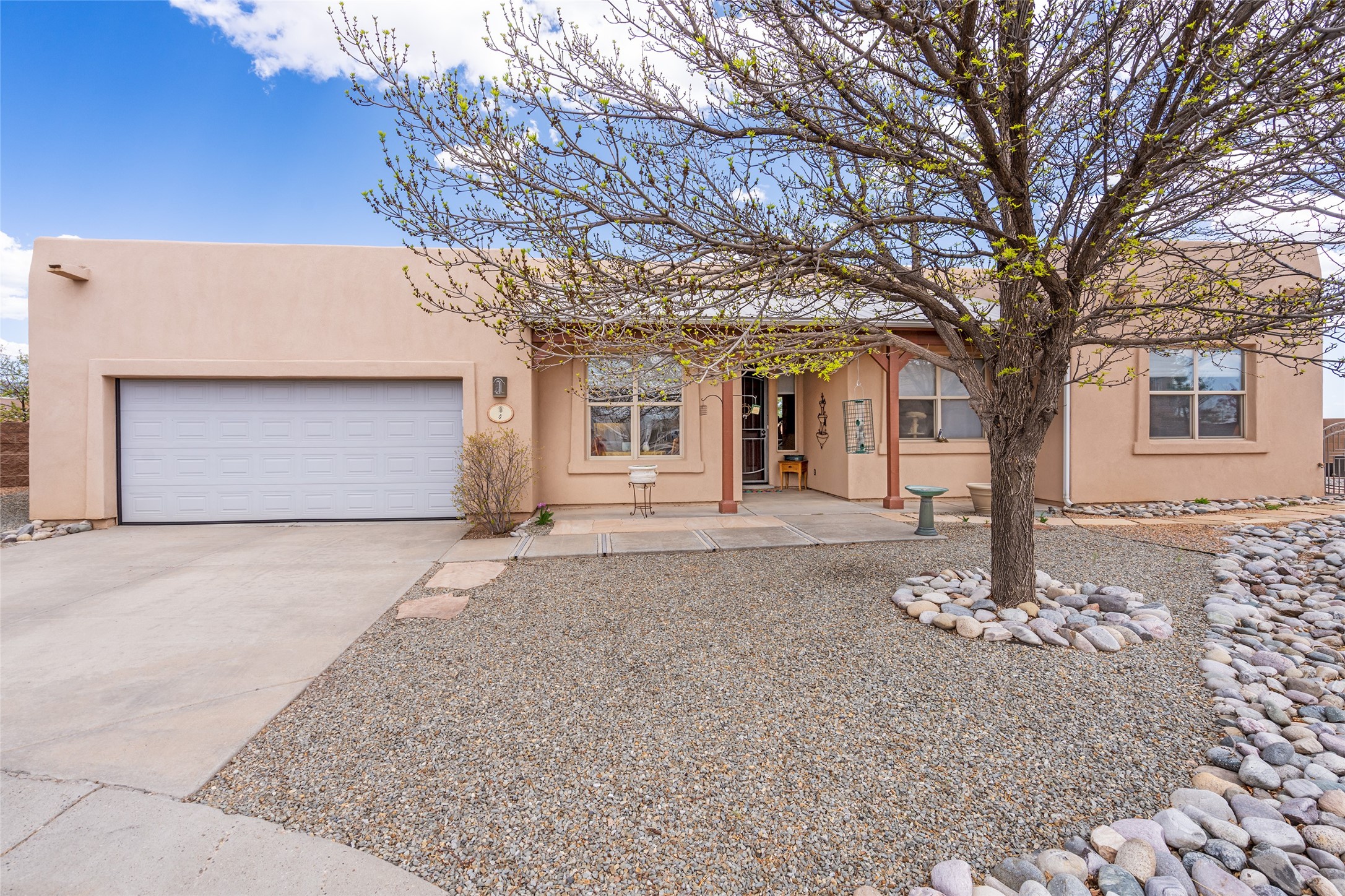Discover this meticulously cared-for single-level home situated on a premium lot that backs directly onto a community park, offering stunning views and a serene atmosphere. This open-concept design exudes tranquility, making it the perfect retreat from the hustle and bustle of daily life. The remodeled kitchen is a chef's delight, featuring elegant cherry cabinetry, gorgeous quartz countertops, a stylish stone-tiled backsplash, and upgraded appliances, including an induction stove. The spacious living area boasts tiled floors, a cozy gas kiva fireplace, and large Anderson sliding glass doors that seamlessly connect to the inviting back portal. With a flexible den off the main living area, you'll have plenty of options for how to utilize the space. The thoughtfully designed split bedroom floor plan ensures privacy for the primary suite, which serves as a true haven. The well-equipped en-suite bathroom features dual sinks, a separate soaking tub, and a walk-in shower, complemented by a spacious walk-in closet. This home is brimming with upgrades, including custom-made window treatments, several ceiling fans, and refined lighting fixtures. The outdoor space is equally impressive, with lovely landscaping and a drip irrigation system that caters to the gardening enthusiast. Much of the yard is adorned with flagstone for low maintenance, while mature trees provide ample shade during the summer months. Enjoy countless hours under the custom northeastern-facing portal, soaking in the breathtaking views of the Sangre de Cristo Mountains across the park while the Ortiz and Sandia mountain views are prominent from the side yard. Rancho Viejo is a wonderful place to live with several community parks, over 15 miles of paved walking trails, and sensible covenants.