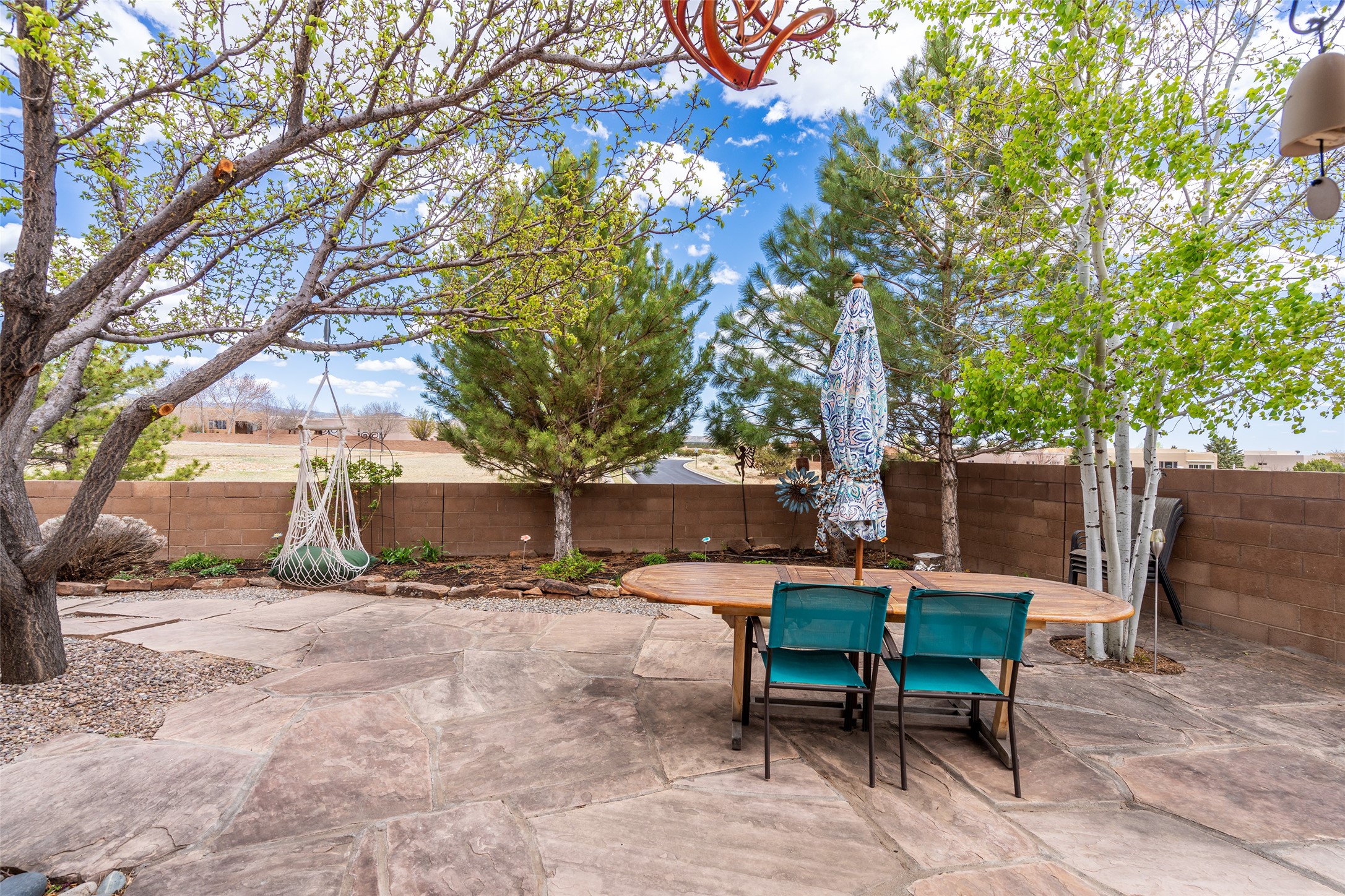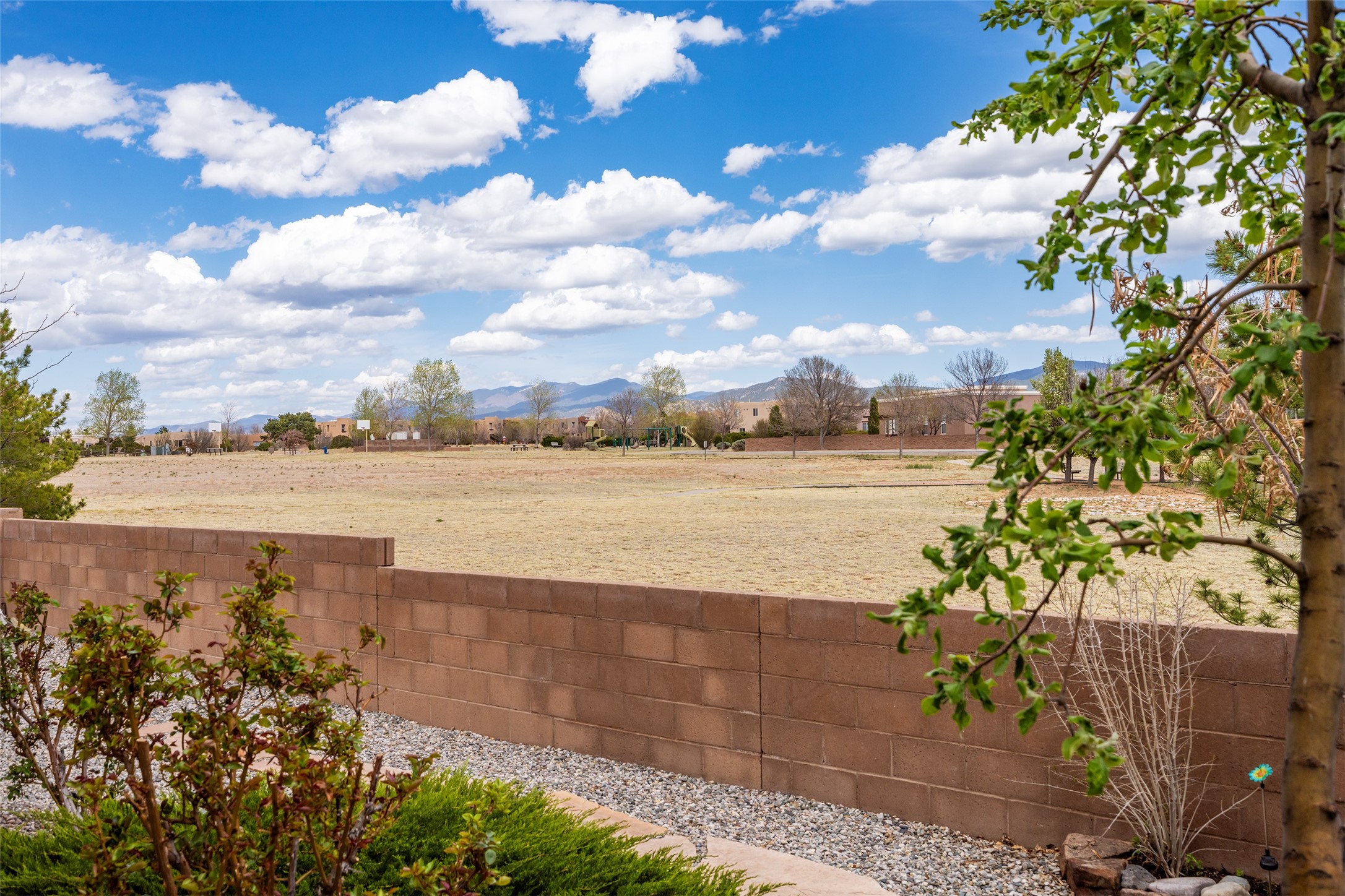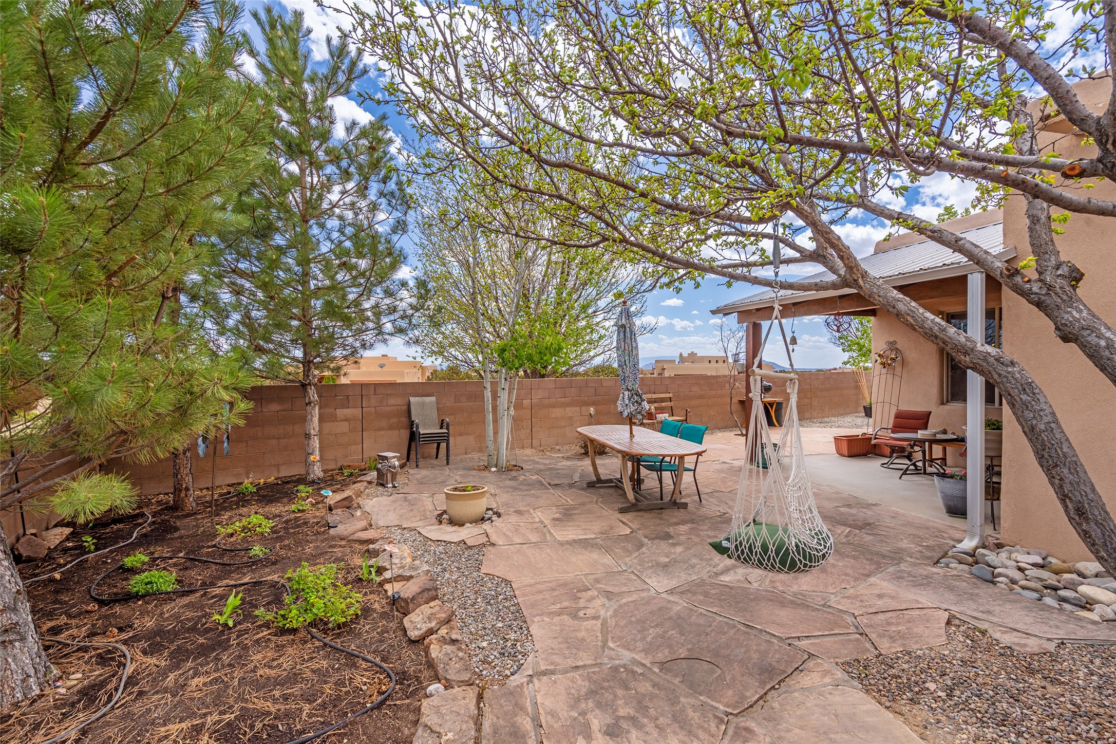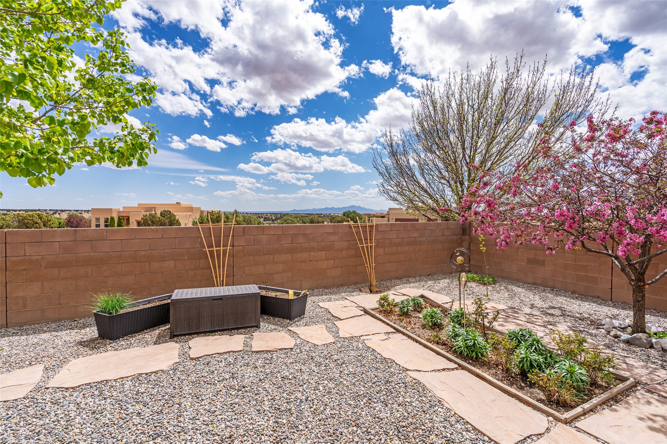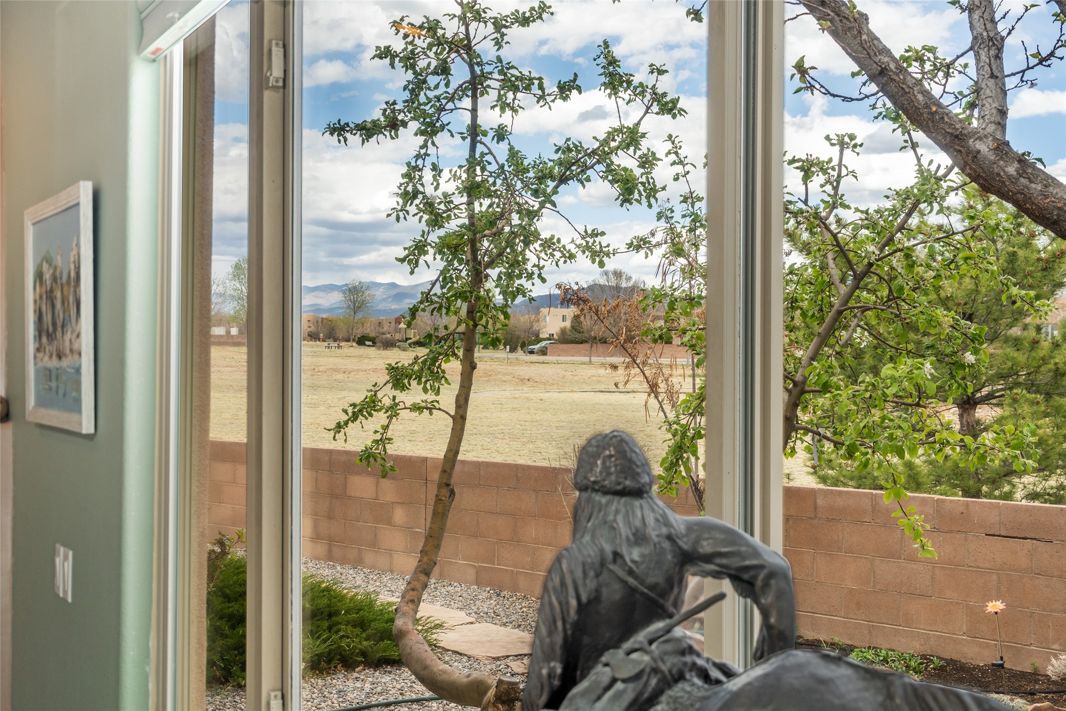 Discover this meticulously cared-for single-level home situated on a premium lot that backs directly onto a community park, offering stunning views and a serene atmosphere. This open-concept design exudes tranquility, making it the perfect retreat from the hustle and bustle of daily life. The remodeled kitchen is a chef's delight, featuring elegant cherry cabinetry, gorgeous quartz countertops, a stylish stone-tiled backsplash, and upgraded appliances, including an induction stove. The spacious living area boasts tiled floors, a cozy gas kiva fireplace, and large Anderson sliding glass doors that seamlessly connect to the inviting back portal. With a flexible den off the main living area, you'll have plenty of options for how to utilize the space. The thoughtfully designed split bedroom floor plan ensures privacy for the primary suite, which serves as a true haven. The well-equipped en-suite bathroom features dual sinks, a separate soaking tub, and a walk-in shower, complemented by a spacious walk-in closet. This home is brimming with upgrades, including custom-made window treatments, several ceiling fans, and refined lighting fixtures. The outdoor space is equally impressive, with lovely landscaping and a drip irrigation system that caters to the gardening enthusiast. Much of the yard is adorned with flagstone for low maintenance, while mature trees provide ample shade during the summer months. Enjoy countless hours under the custom northeastern-facing portal, soaking in the breathtaking views of the Sangre de Cristo Mountains across the park while the Ortiz and Sandia mountain views are prominent from the side yard. Rancho Viejo is a wonderful place to live with several community parks, over 15 miles of paved walking trails, and sensible covenants.
