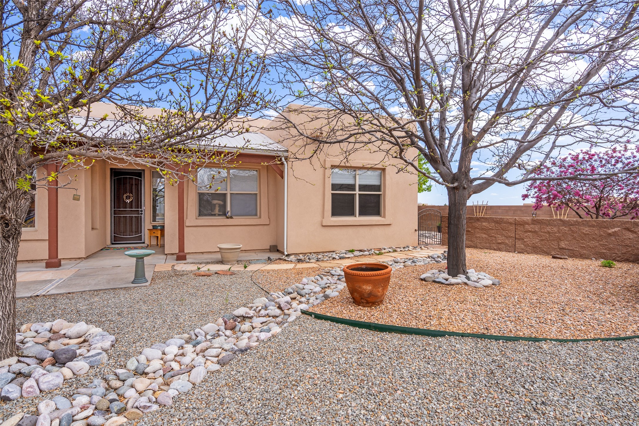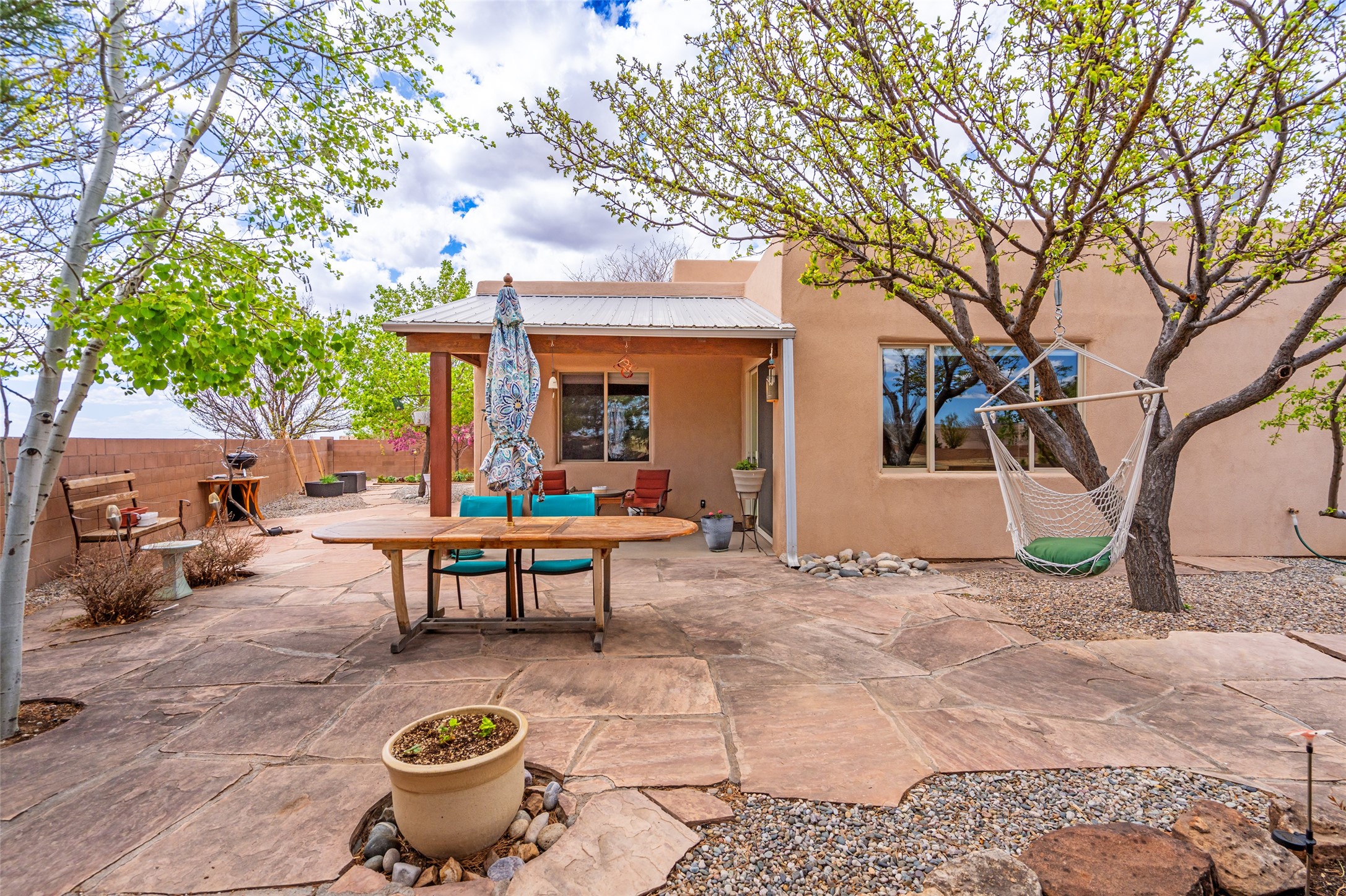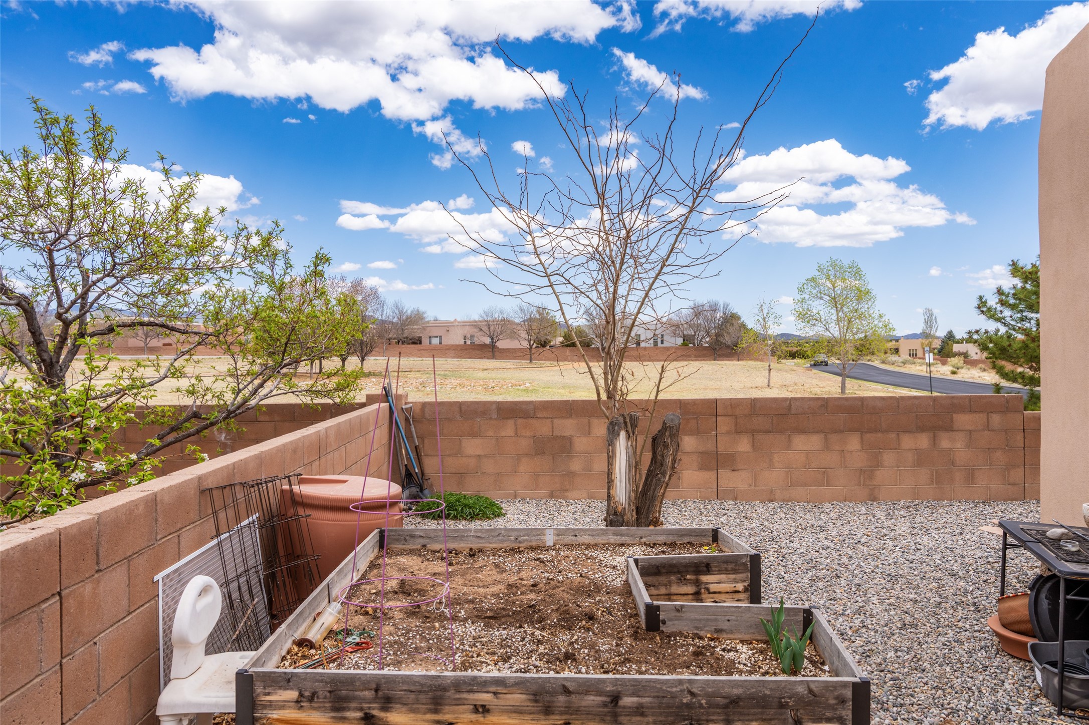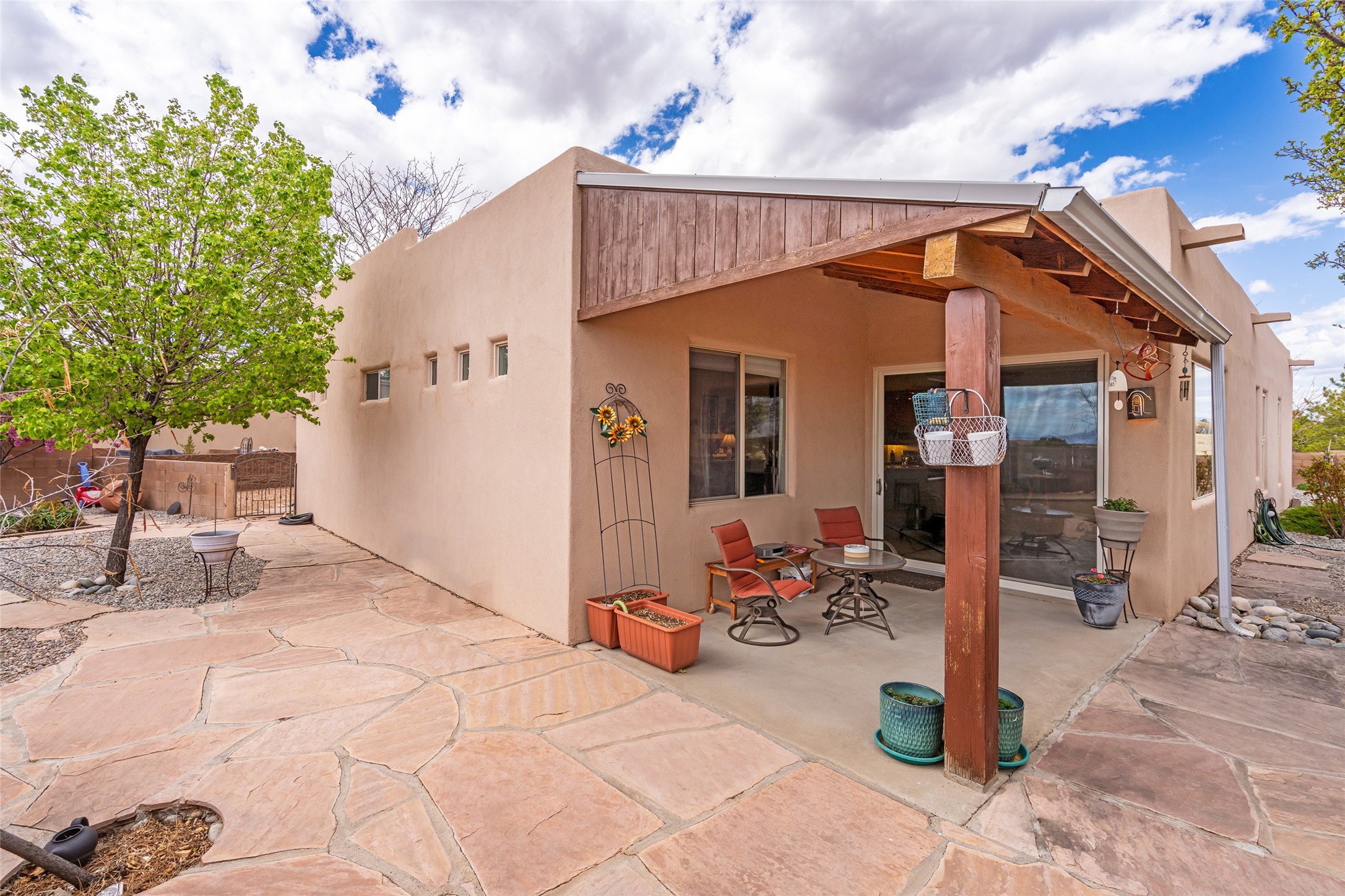 Discover this meticulously cared-for single-level home situated on a premium lot that backs directly onto a community park, offering stunning views and a serene atmosphere. This open-concept design exudes tranquility, making it the perfect retreat from the hustle and bustle of daily life. The remodeled kitchen is a chef's delight, featuring elegant cherry cabinetry, gorgeous quartz countertops, a stylish stone-tiled backsplash, and upgraded appliances, including an induction stove. The spacious living area boasts tiled floors, a cozy gas kiva fireplace, and large Anderson sliding glass doors that seamlessly connect to the inviting back portal. With a flexible den off the main living area, you'll have plenty of options for how to utilize the space. The thoughtfully designed split bedroom floor plan ensures privacy for the primary suite, which serves as a true haven. The well-equipped en-suite bathroom features dual sinks, a separate soaking tub, and a walk-in shower, complemented by a spacious walk-in closet. This home is brimming with upgrades, including custom-made window treatments, several ceiling fans, and refined lighting fixtures. The outdoor space is equally impressive, with lovely landscaping and a drip irrigation system that caters to the gardening enthusiast. Much of the yard is adorned with flagstone for low maintenance, while mature trees provide ample shade during the summer months. Enjoy countless hours under the custom northeastern-facing portal, soaking in the breathtaking views of the Sangre de Cristo Mountains across the park while the Ortiz and Sandia mountain views are prominent from the side yard. Rancho Viejo is a wonderful place to live with several community parks, over 15 miles of paved walking trails, and sensible covenants.