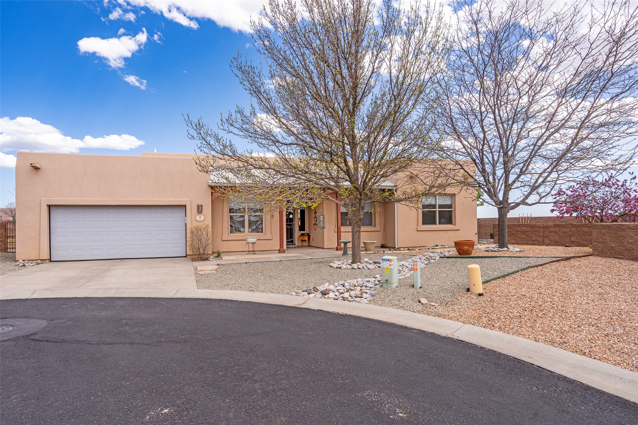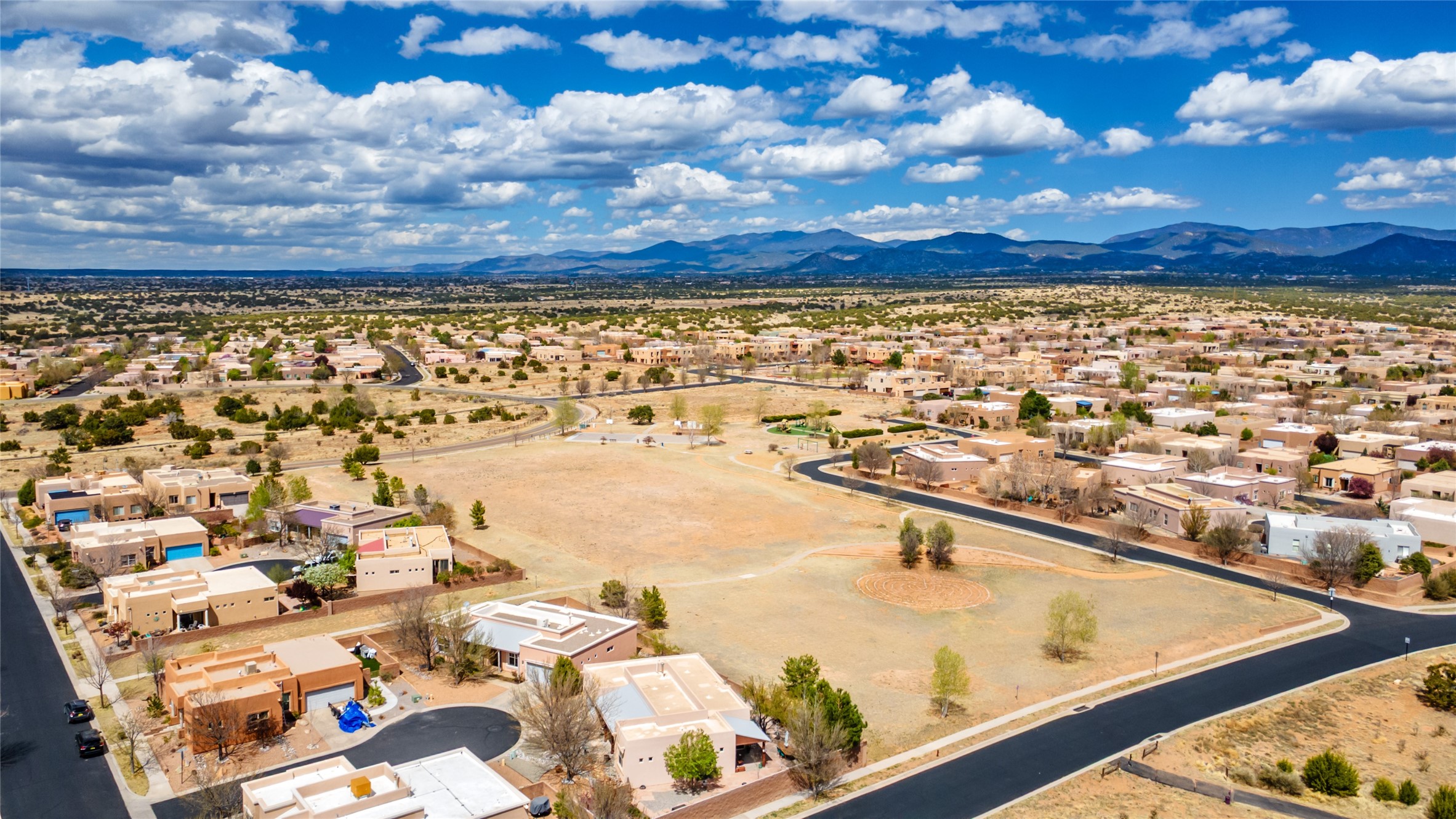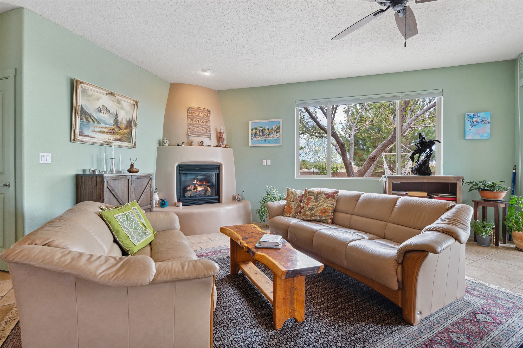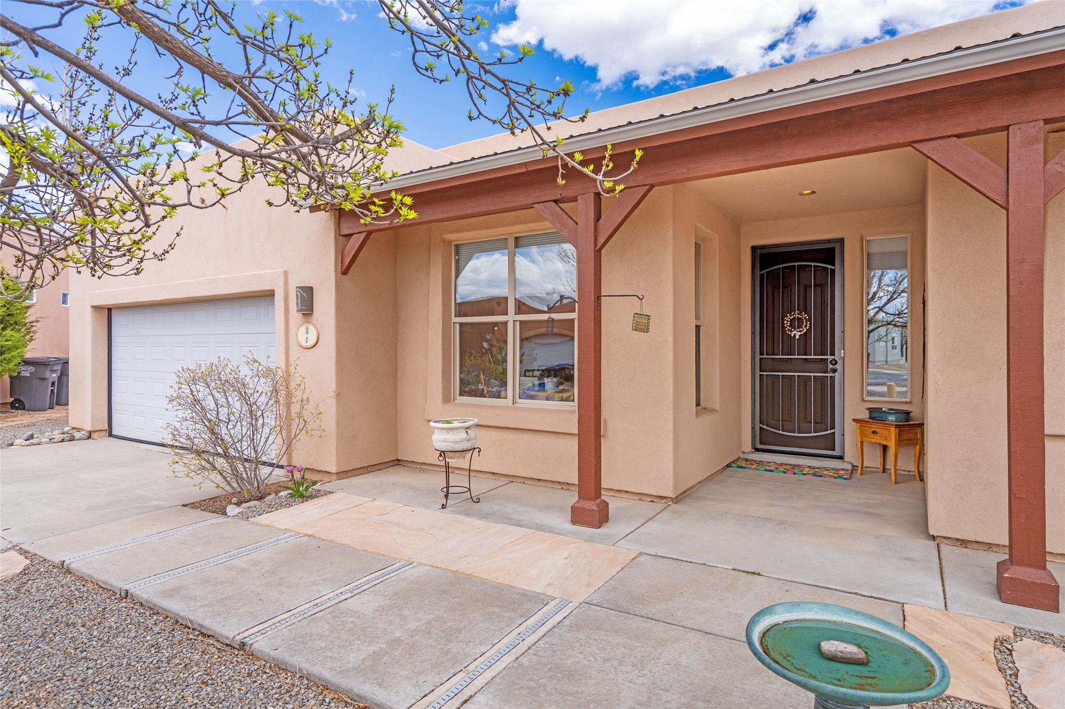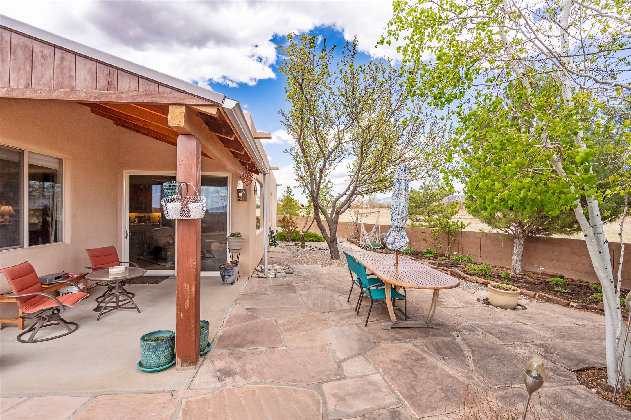 Discover this meticulously cared-for single-level home situated on a premium lot that backs directly onto a community park, offering stunning views and a serene atmosphere. This open-concept design exudes tranquility, making it the perfect retreat from the hustle and bustle of daily life. The remodeled kitchen is a chef's delight, featuring elegant cherry cabinetry, gorgeous quartz countertops, a stylish stone-tiled backsplash, and upgraded appliances, including an induction stove. The spacious living area boasts tiled floors, a cozy gas kiva fireplace, and large Anderson sliding glass doors that seamlessly connect to the inviting back portal. With a flexible den off the main living area, you'll have plenty of options for how to utilize the space. The thoughtfully designed split bedroom floor plan ensures privacy for the primary suite, which serves as a true haven. The well-equipped en-suite bathroom features dual sinks, a separate soaking tub, and a walk-in shower, complemented by a spacious walk-in closet. This home is brimming with upgrades, including custom-made window treatments, several ceiling fans, and refined lighting fixtures. The outdoor space is equally impressive, with lovely landscaping and a drip irrigation system that caters to the gardening enthusiast. Much of the yard is adorned with flagstone for low maintenance, while mature trees provide ample shade during the summer months. Enjoy countless hours under the custom northeastern-facing portal, soaking in the breathtaking views of the Sangre de Cristo Mountains across the park while the Ortiz and Sandia mountain views are prominent from the side yard. Rancho Viejo is a wonderful place to live with several community parks, over 15 miles of paved walking trails, and sensible covenants.