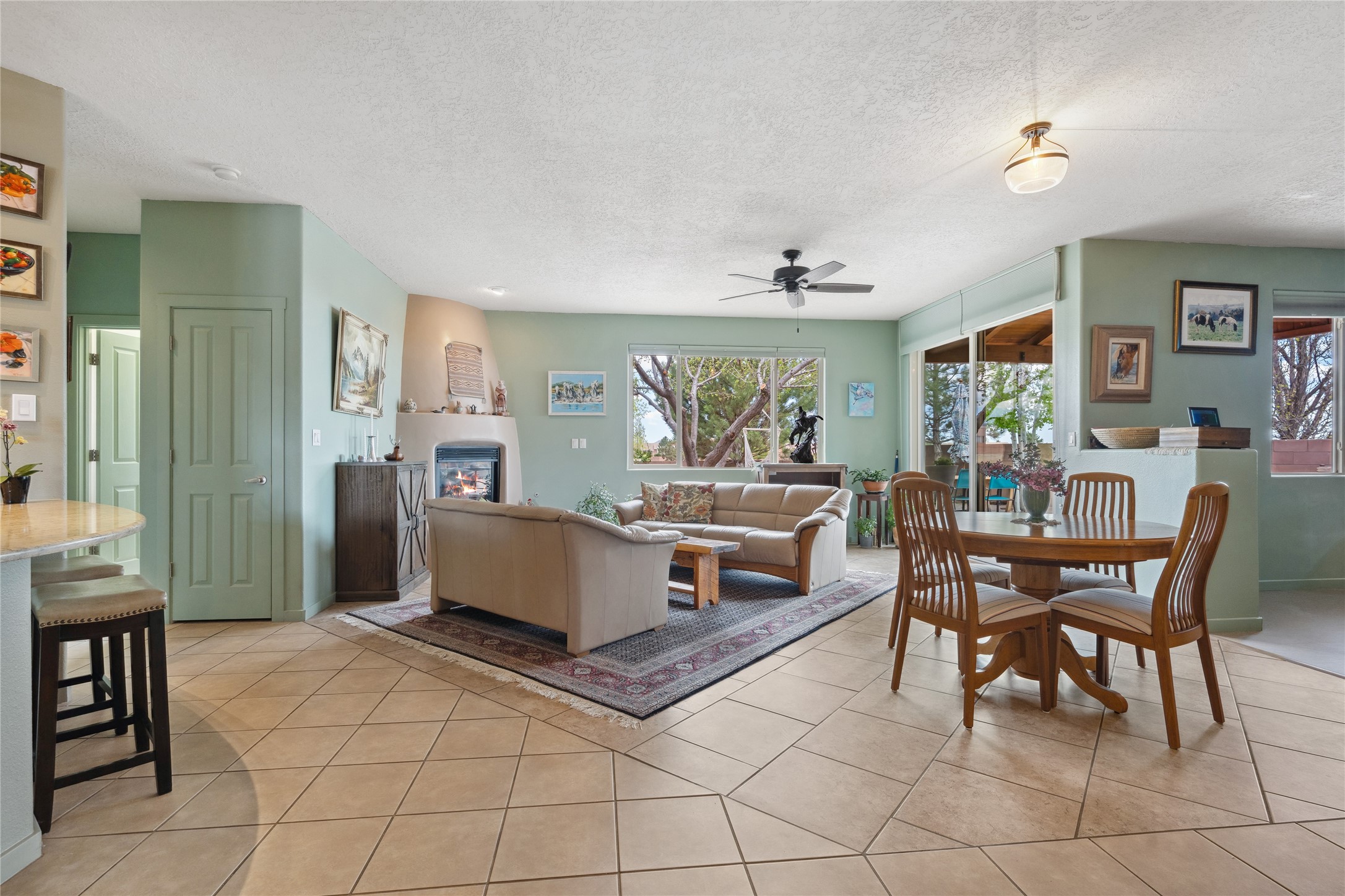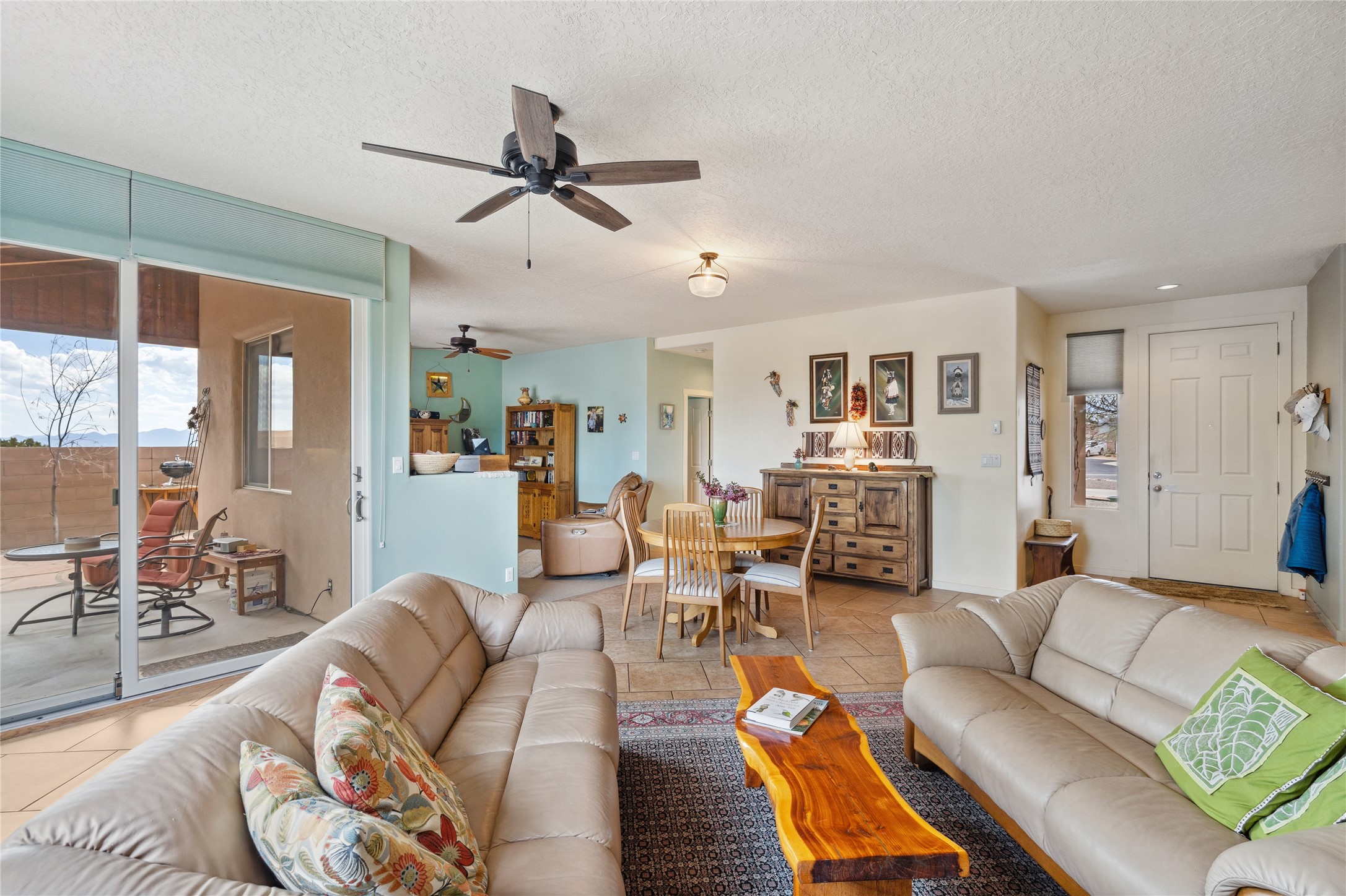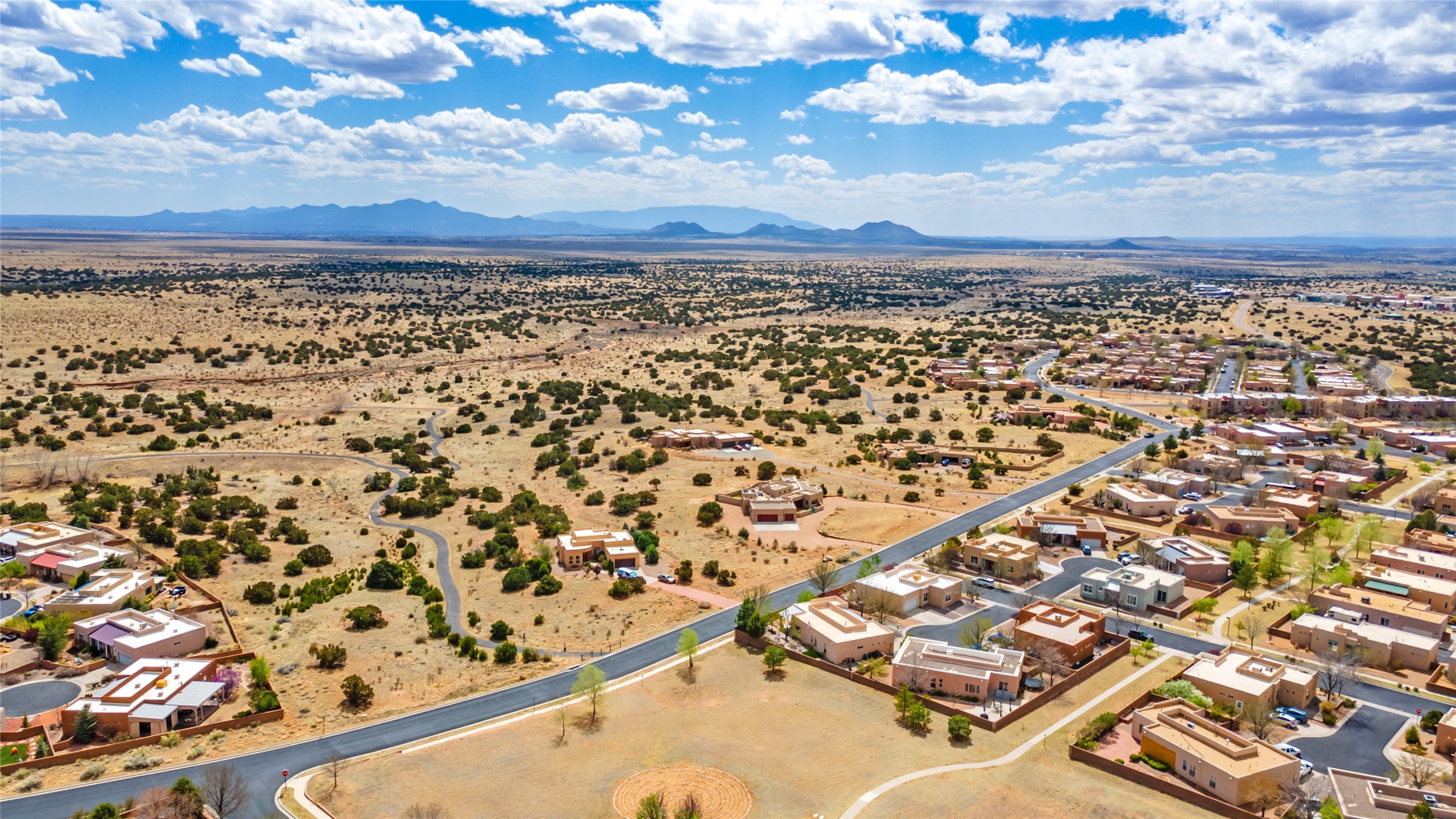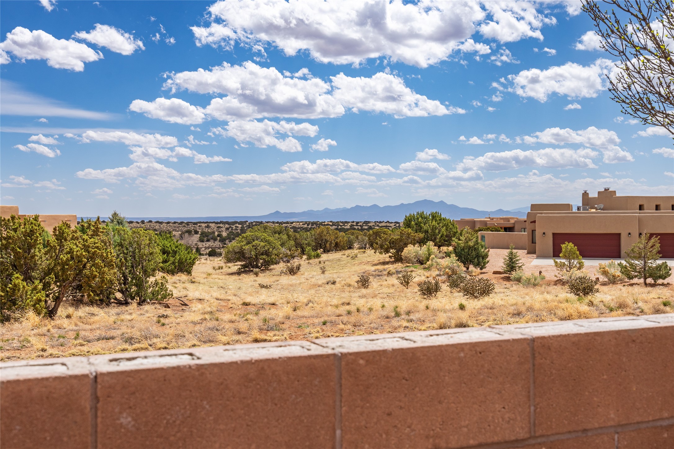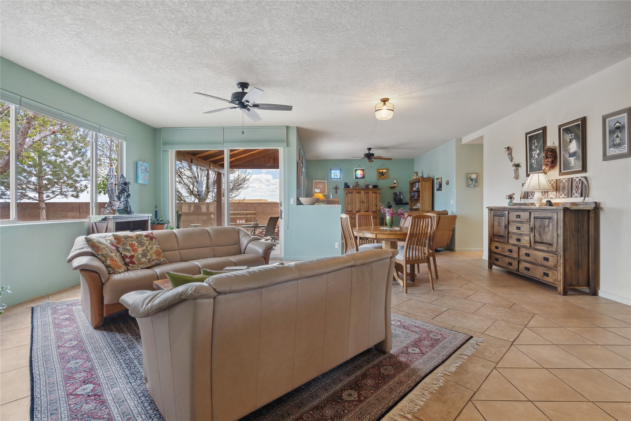 Discover this meticulously cared-for single-level home situated on a premium lot that backs directly onto a community park, offering stunning views and a serene atmosphere. This open-concept design exudes tranquility, making it the perfect retreat from the hustle and bustle of daily life. The remodeled kitchen is a chef's delight, featuring elegant cherry cabinetry, gorgeous quartz countertops, a stylish stone-tiled backsplash, and upgraded appliances, including an induction stove. The spacious living area boasts tiled floors, a cozy gas kiva fireplace, and large Anderson sliding glass doors that seamlessly connect to the inviting back portal. With a flexible den off the main living area, you'll have plenty of options for how to utilize the space. The thoughtfully designed split bedroom floor plan ensures privacy for the primary suite, which serves as a true haven. The well-equipped en-suite bathroom features dual sinks, a separate soaking tub, and a walk-in shower, complemented by a spacious walk-in closet. This home is brimming with upgrades, including custom-made window treatments, several ceiling fans, and refined lighting fixtures. The outdoor space is equally impressive, with lovely landscaping and a drip irrigation system that caters to the gardening enthusiast. Much of the yard is adorned with flagstone for low maintenance, while mature trees provide ample shade during the summer months. Enjoy countless hours under the custom northeastern-facing portal, soaking in the breathtaking views of the Sangre de Cristo Mountains across the park while the Ortiz and Sandia mountain views are prominent from the side yard. Rancho Viejo is a wonderful place to live with several community parks, over 15 miles of paved walking trails, and sensible covenants.