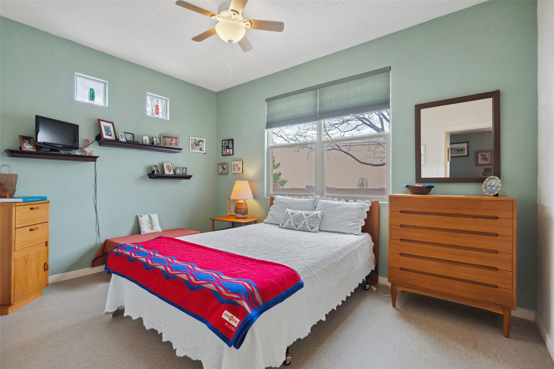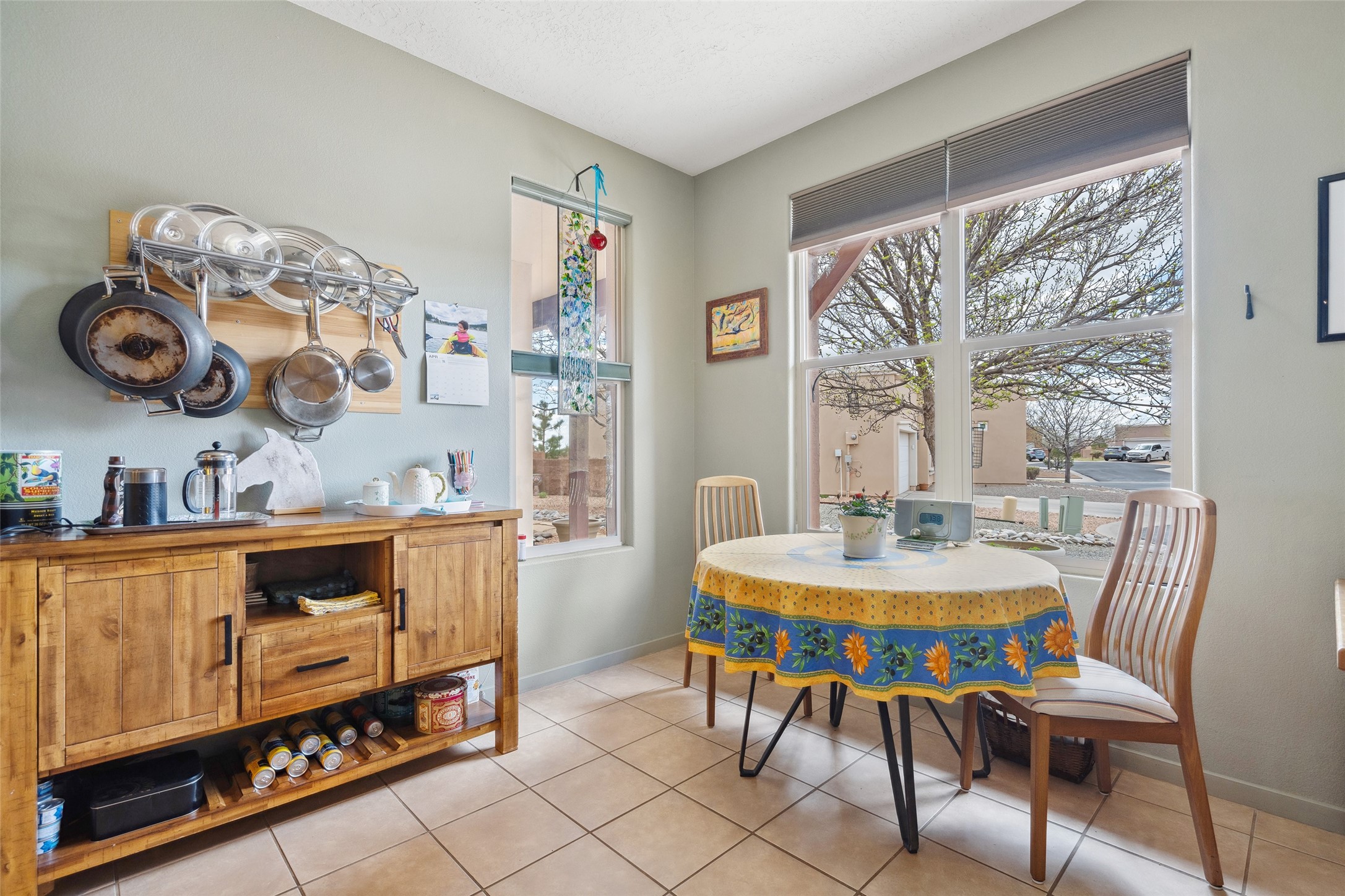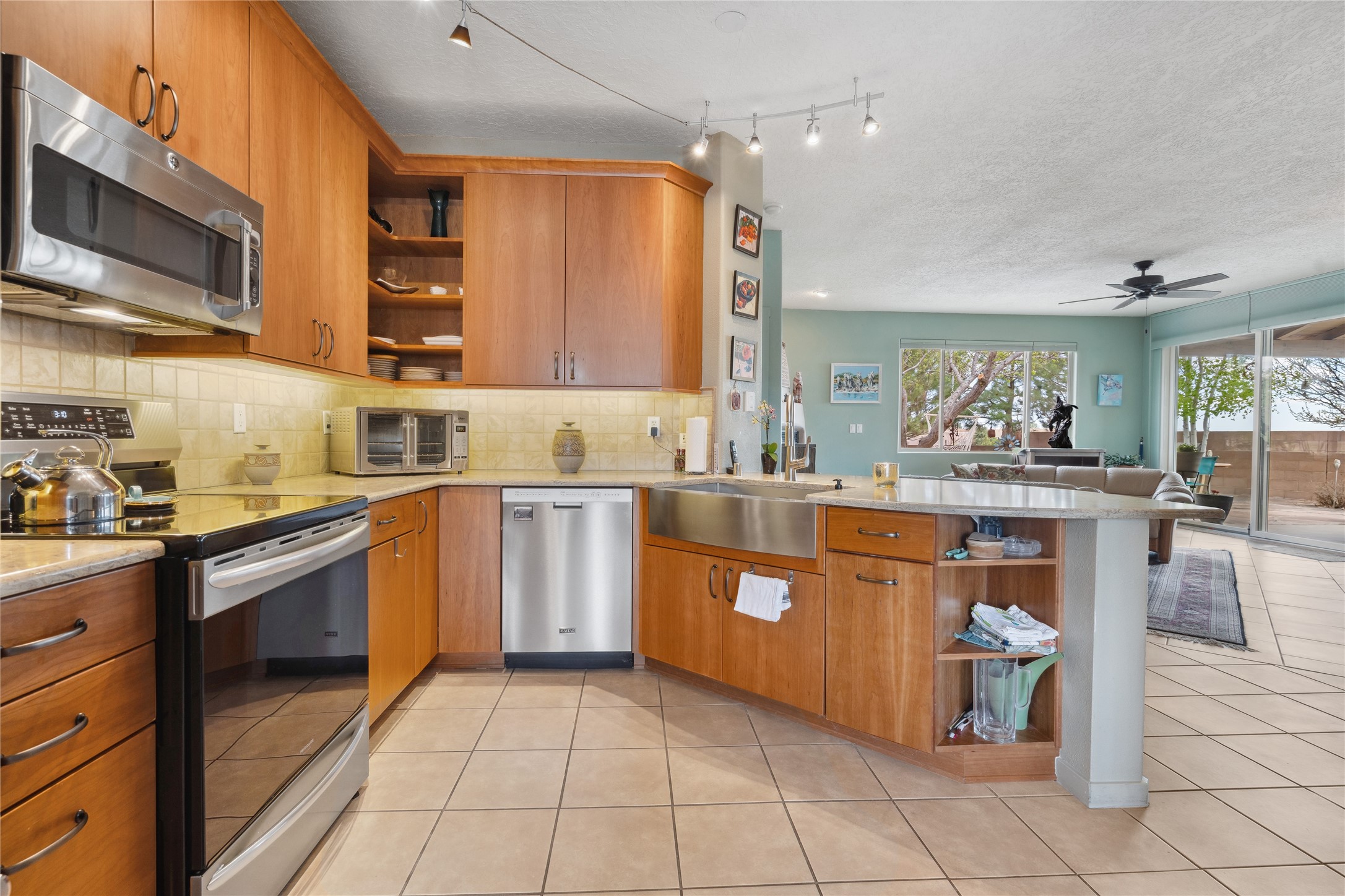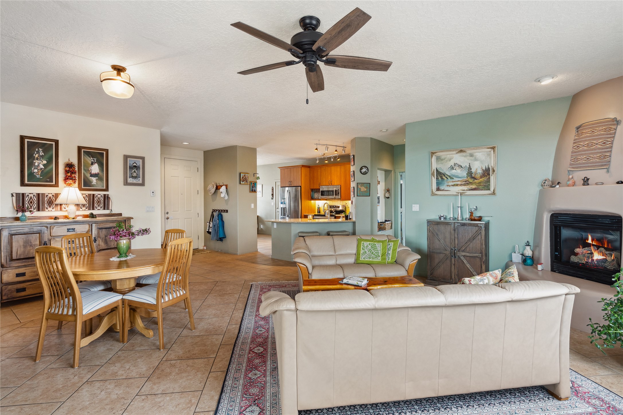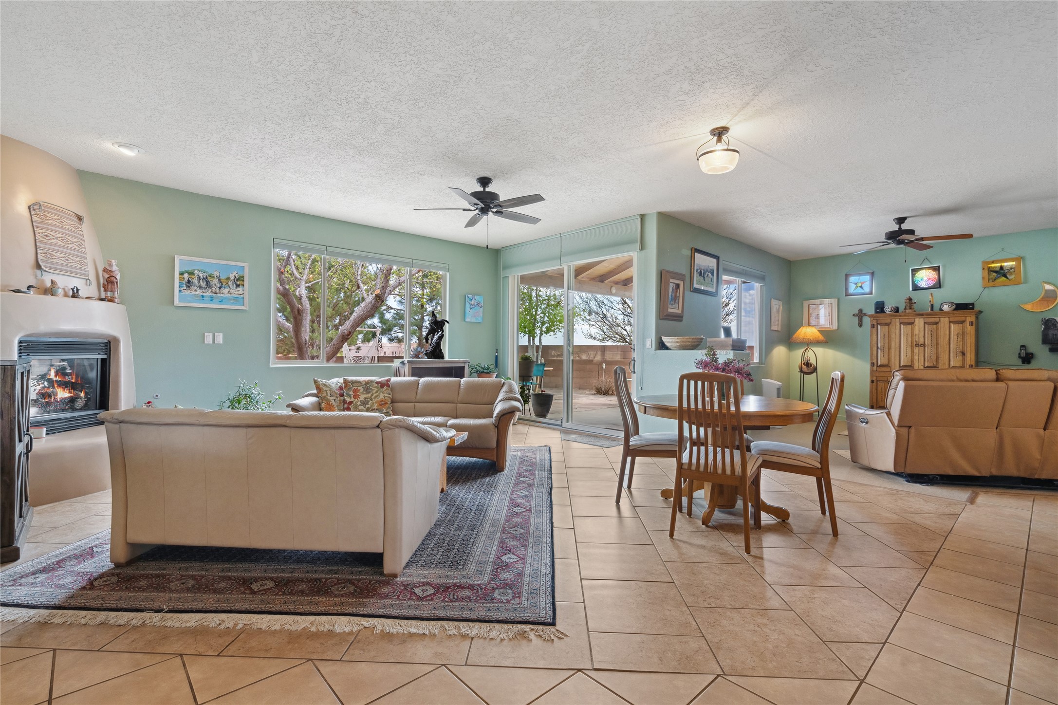 Discover this meticulously cared-for single-level home situated on a premium lot that backs directly onto a community park, offering stunning views and a serene atmosphere. This open-concept design exudes tranquility, making it the perfect retreat from the hustle and bustle of daily life. The remodeled kitchen is a chef's delight, featuring elegant cherry cabinetry, gorgeous quartz countertops, a stylish stone-tiled backsplash, and upgraded appliances, including an induction stove. The spacious living area boasts tiled floors, a cozy gas kiva fireplace, and large Anderson sliding glass doors that seamlessly connect to the inviting back portal. With a flexible den off the main living area, you'll have plenty of options for how to utilize the space. The thoughtfully designed split bedroom floor plan ensures privacy for the primary suite, which serves as a true haven. The well-equipped en-suite bathroom features dual sinks, a separate soaking tub, and a walk-in shower, complemented by a spacious walk-in closet. This home is brimming with upgrades, including custom-made window treatments, several ceiling fans, and refined lighting fixtures. The outdoor space is equally impressive, with lovely landscaping and a drip irrigation system that caters to the gardening enthusiast. Much of the yard is adorned with flagstone for low maintenance, while mature trees provide ample shade during the summer months. Enjoy countless hours under the custom northeastern-facing portal, soaking in the breathtaking views of the Sangre de Cristo Mountains across the park while the Ortiz and Sandia mountain views are prominent from the side yard. Rancho Viejo is a wonderful place to live with several community parks, over 15 miles of paved walking trails, and sensible covenants.