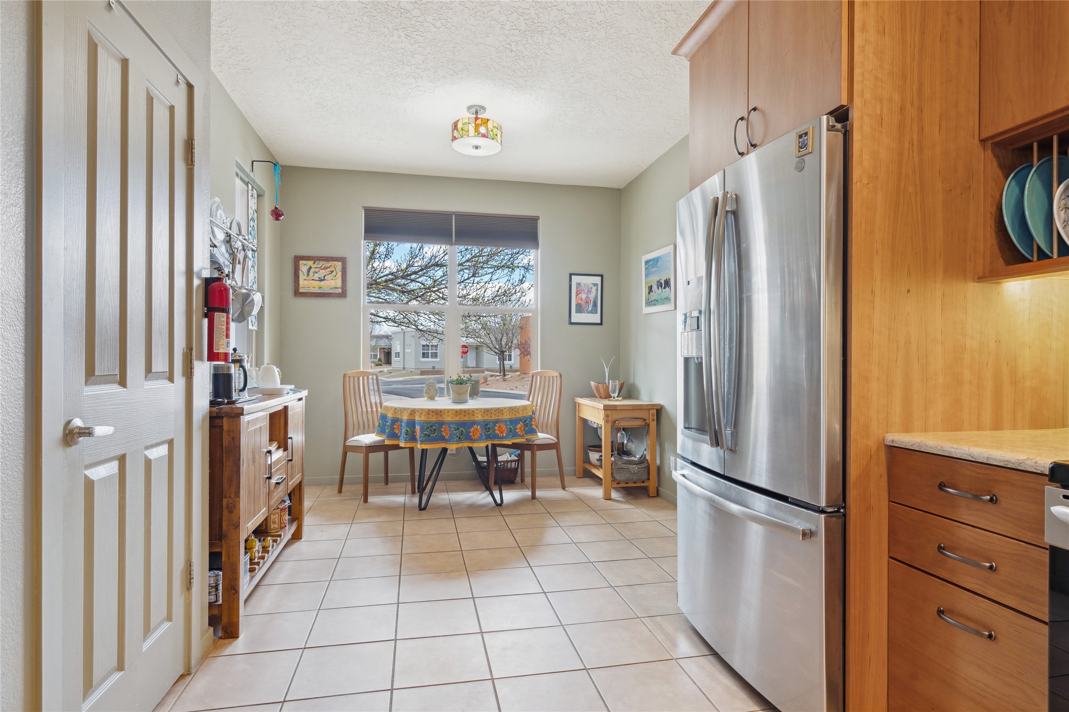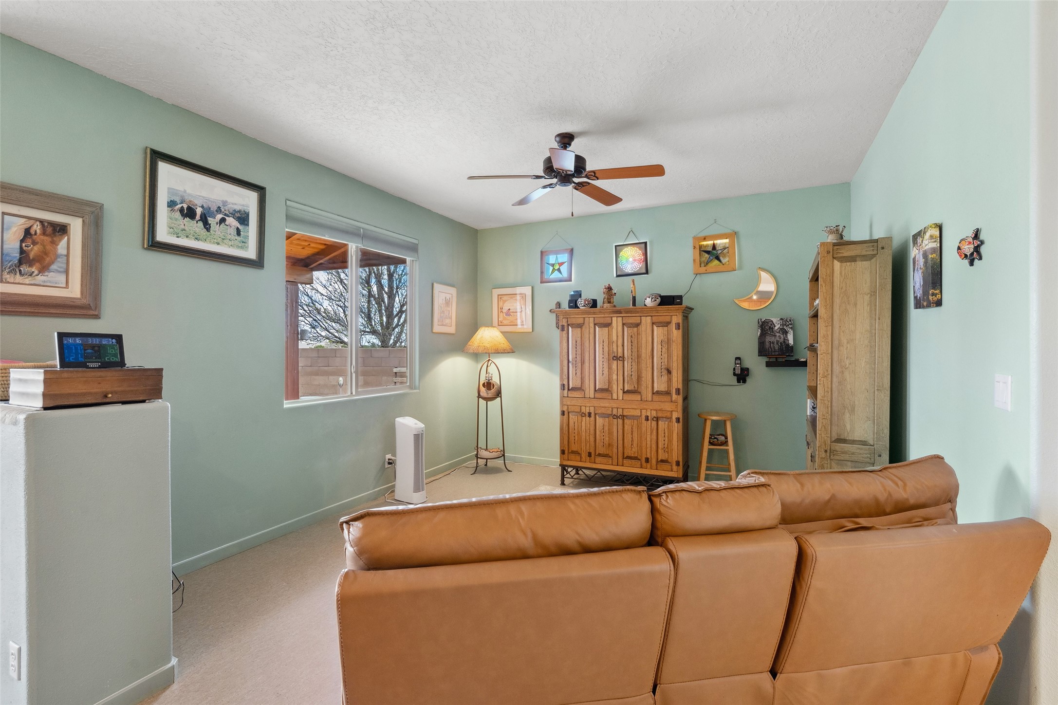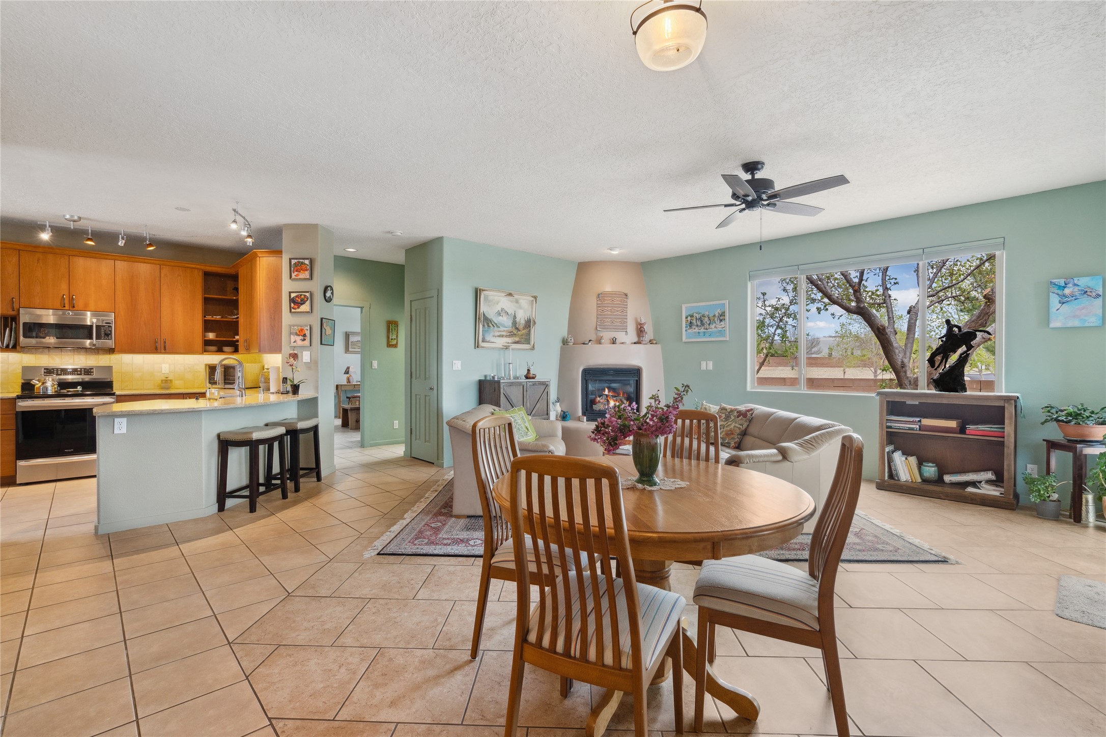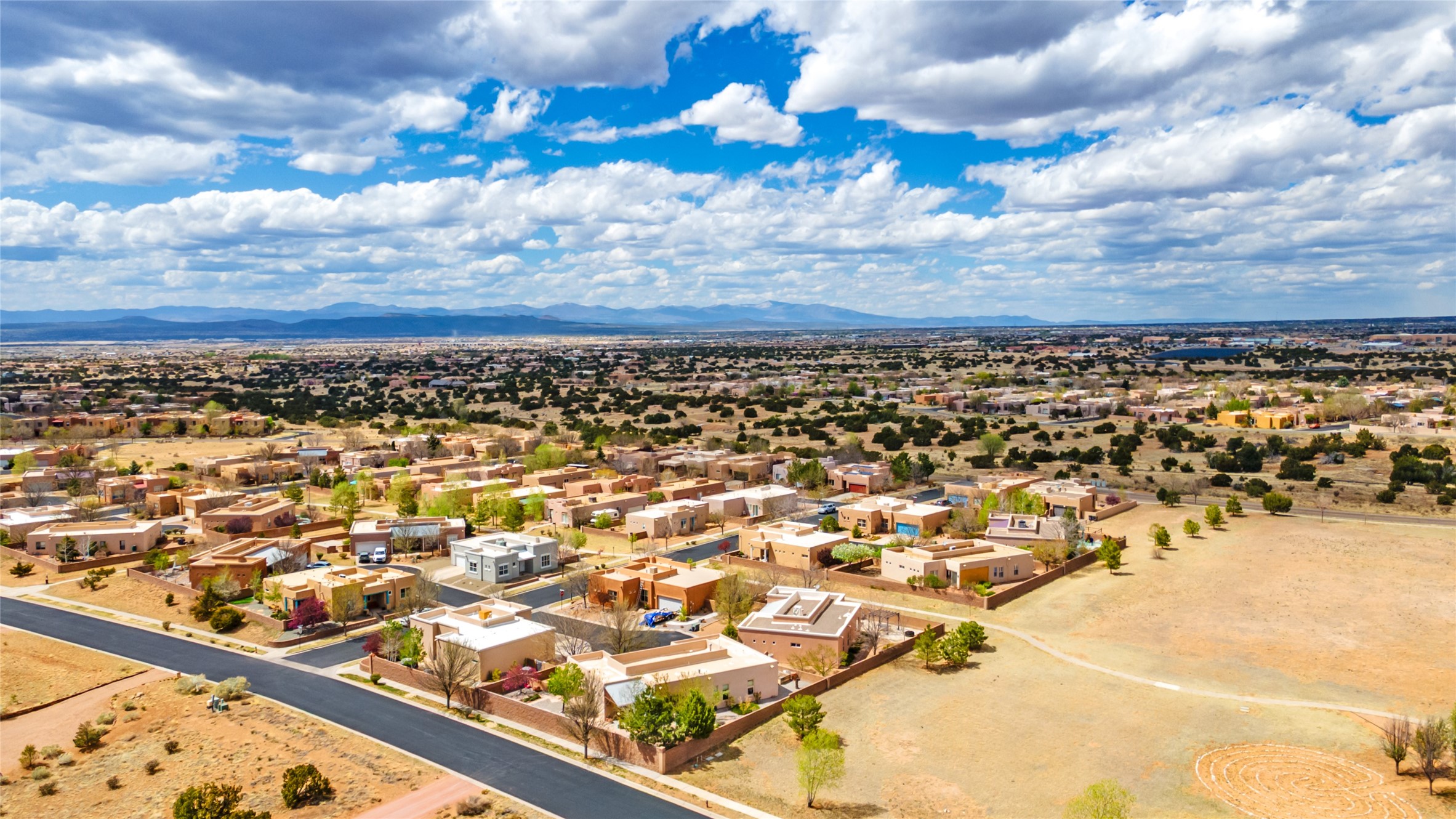 Discover this meticulously cared-for single-level home situated on a premium lot that backs directly onto a community park, offering stunning views and a serene atmosphere. This open-concept design exudes tranquility, making it the perfect retreat from the hustle and bustle of daily life. The remodeled kitchen is a chef's delight, featuring elegant cherry cabinetry, gorgeous quartz countertops, a stylish stone-tiled backsplash, and upgraded appliances, including an induction stove. The spacious living area boasts tiled floors, a cozy gas kiva fireplace, and large Anderson sliding glass doors that seamlessly connect to the inviting back portal. With a flexible den off the main living area, you'll have plenty of options for how to utilize the space. The thoughtfully designed split bedroom floor plan ensures privacy for the primary suite, which serves as a true haven. The well-equipped en-suite bathroom features dual sinks, a separate soaking tub, and a walk-in shower, complemented by a spacious walk-in closet. This home is brimming with upgrades, including custom-made window treatments, several ceiling fans, and refined lighting fixtures. The outdoor space is equally impressive, with lovely landscaping and a drip irrigation system that caters to the gardening enthusiast. Much of the yard is adorned with flagstone for low maintenance, while mature trees provide ample shade during the summer months. Enjoy countless hours under the custom northeastern-facing portal, soaking in the breathtaking views of the Sangre de Cristo Mountains across the park while the Ortiz and Sandia mountain views are prominent from the side yard. Rancho Viejo is a wonderful place to live with several community parks, over 15 miles of paved walking trails, and sensible covenants.