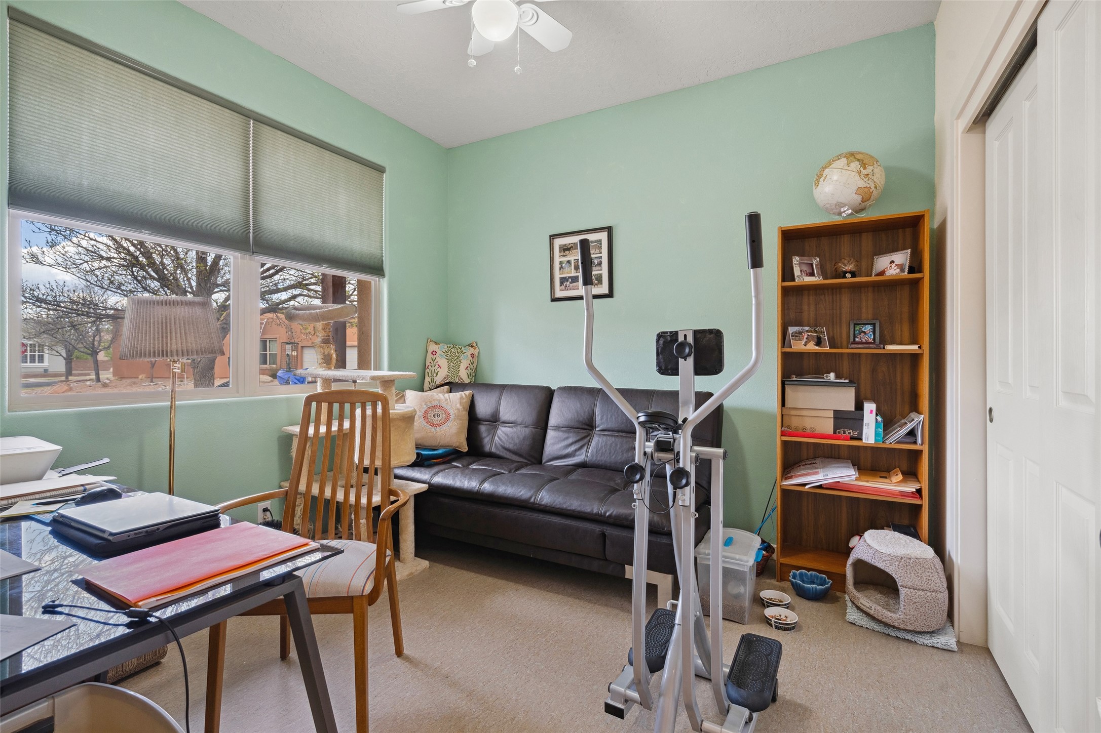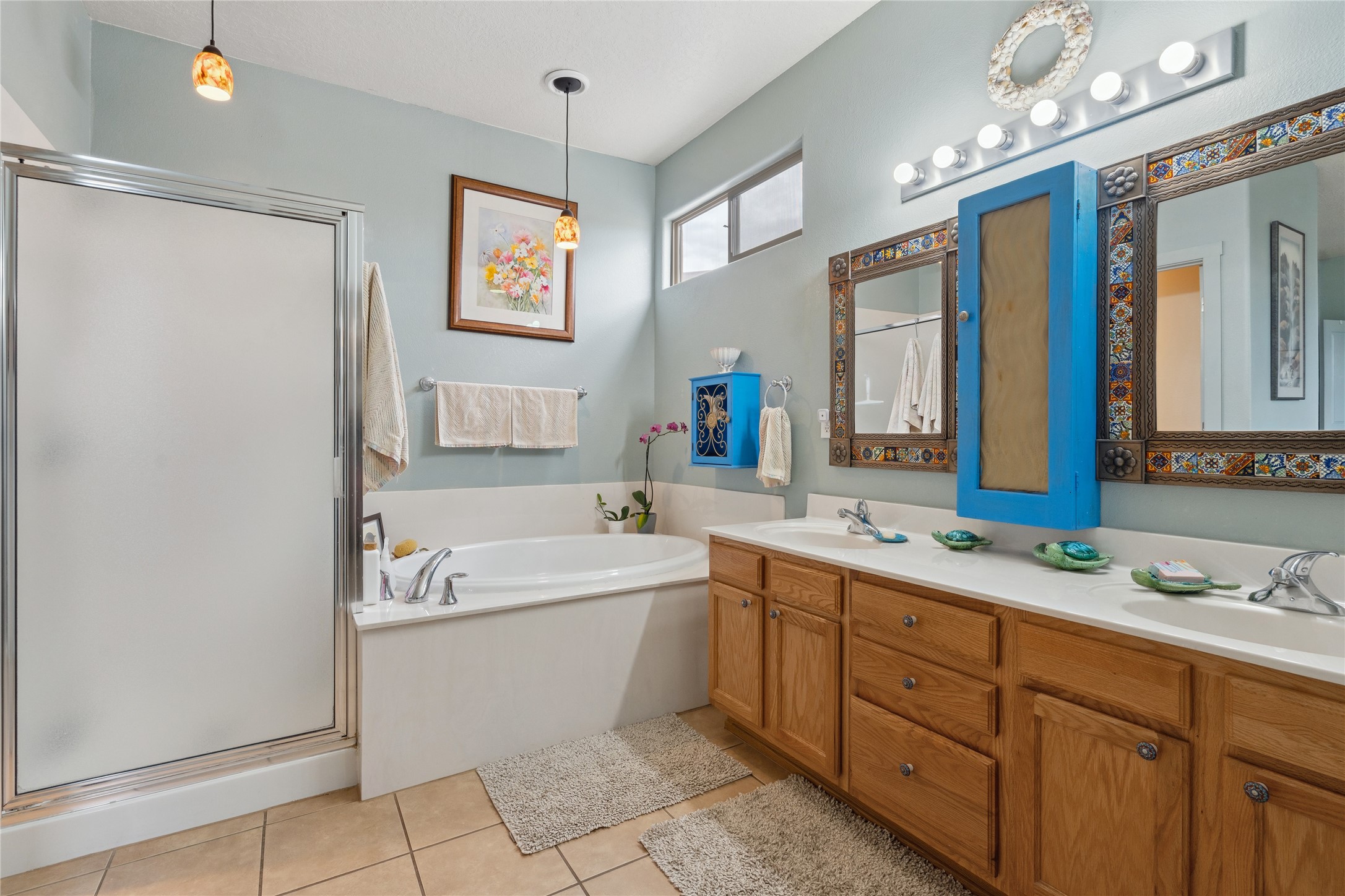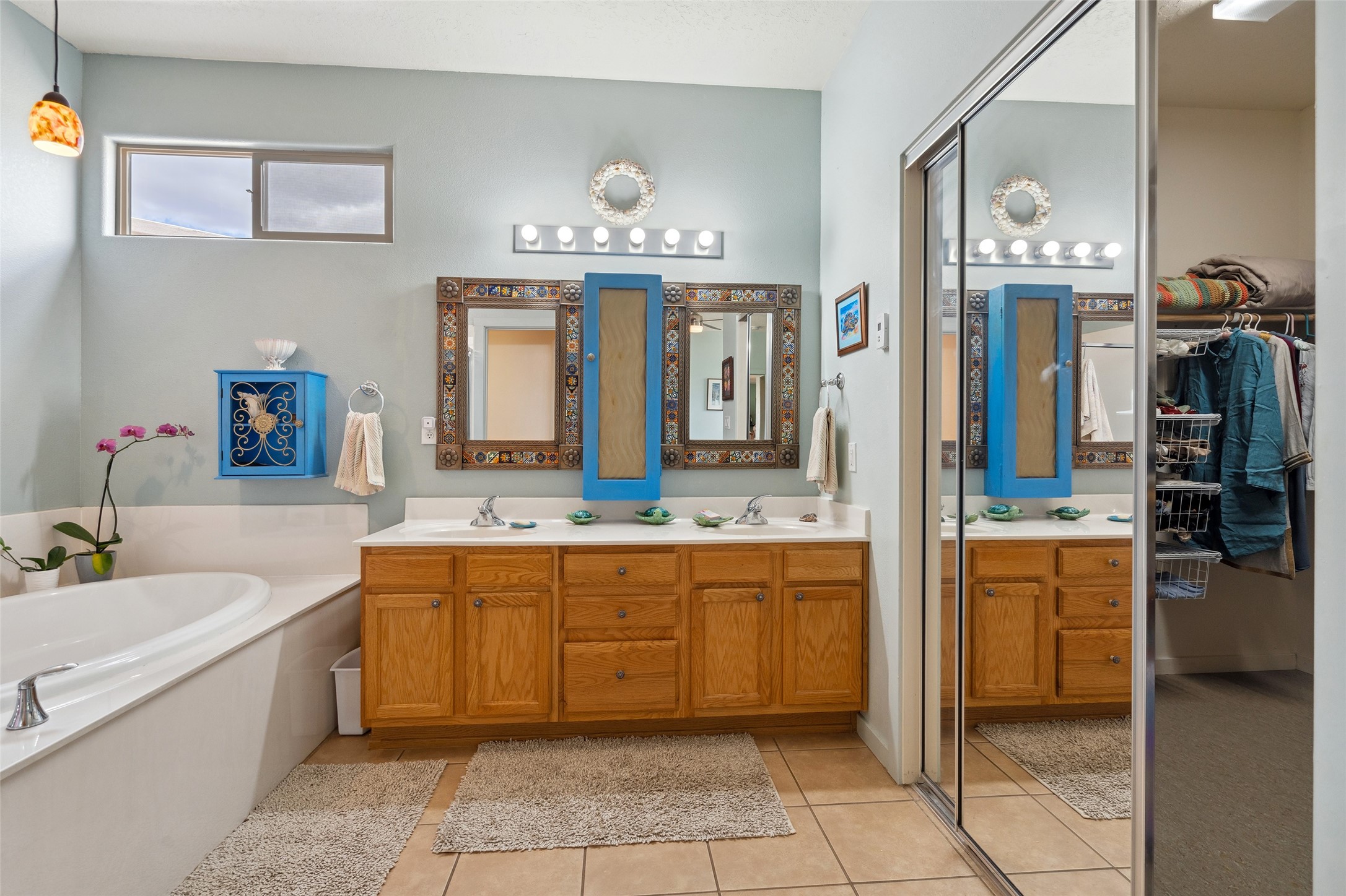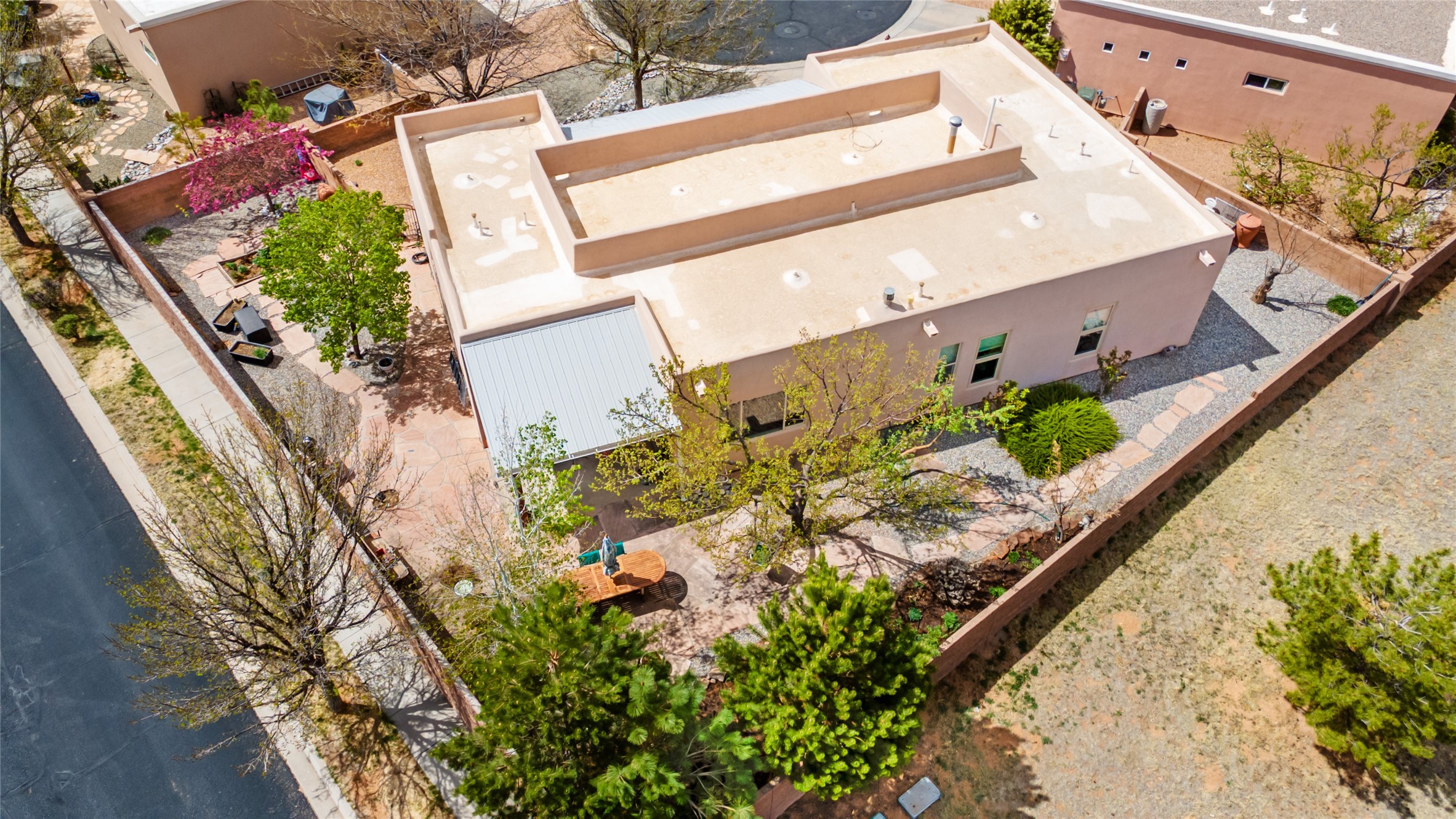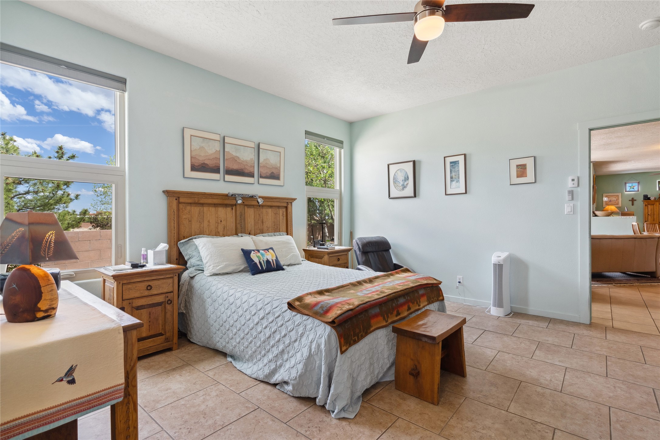 Discover this meticulously cared-for single-level home situated on a premium lot that backs directly onto a community park, offering stunning views and a serene atmosphere. This open-concept design exudes tranquility, making it the perfect retreat from the hustle and bustle of daily life. The remodeled kitchen is a chef's delight, featuring elegant cherry cabinetry, gorgeous quartz countertops, a stylish stone-tiled backsplash, and upgraded appliances, including an induction stove. The spacious living area boasts tiled floors, a cozy gas kiva fireplace, and large Anderson sliding glass doors that seamlessly connect to the inviting back portal. With a flexible den off the main living area, you'll have plenty of options for how to utilize the space. The thoughtfully designed split bedroom floor plan ensures privacy for the primary suite, which serves as a true haven. The well-equipped en-suite bathroom features dual sinks, a separate soaking tub, and a walk-in shower, complemented by a spacious walk-in closet. This home is brimming with upgrades, including custom-made window treatments, several ceiling fans, and refined lighting fixtures. The outdoor space is equally impressive, with lovely landscaping and a drip irrigation system that caters to the gardening enthusiast. Much of the yard is adorned with flagstone for low maintenance, while mature trees provide ample shade during the summer months. Enjoy countless hours under the custom northeastern-facing portal, soaking in the breathtaking views of the Sangre de Cristo Mountains across the park while the Ortiz and Sandia mountain views are prominent from the side yard. Rancho Viejo is a wonderful place to live with several community parks, over 15 miles of paved walking trails, and sensible covenants.