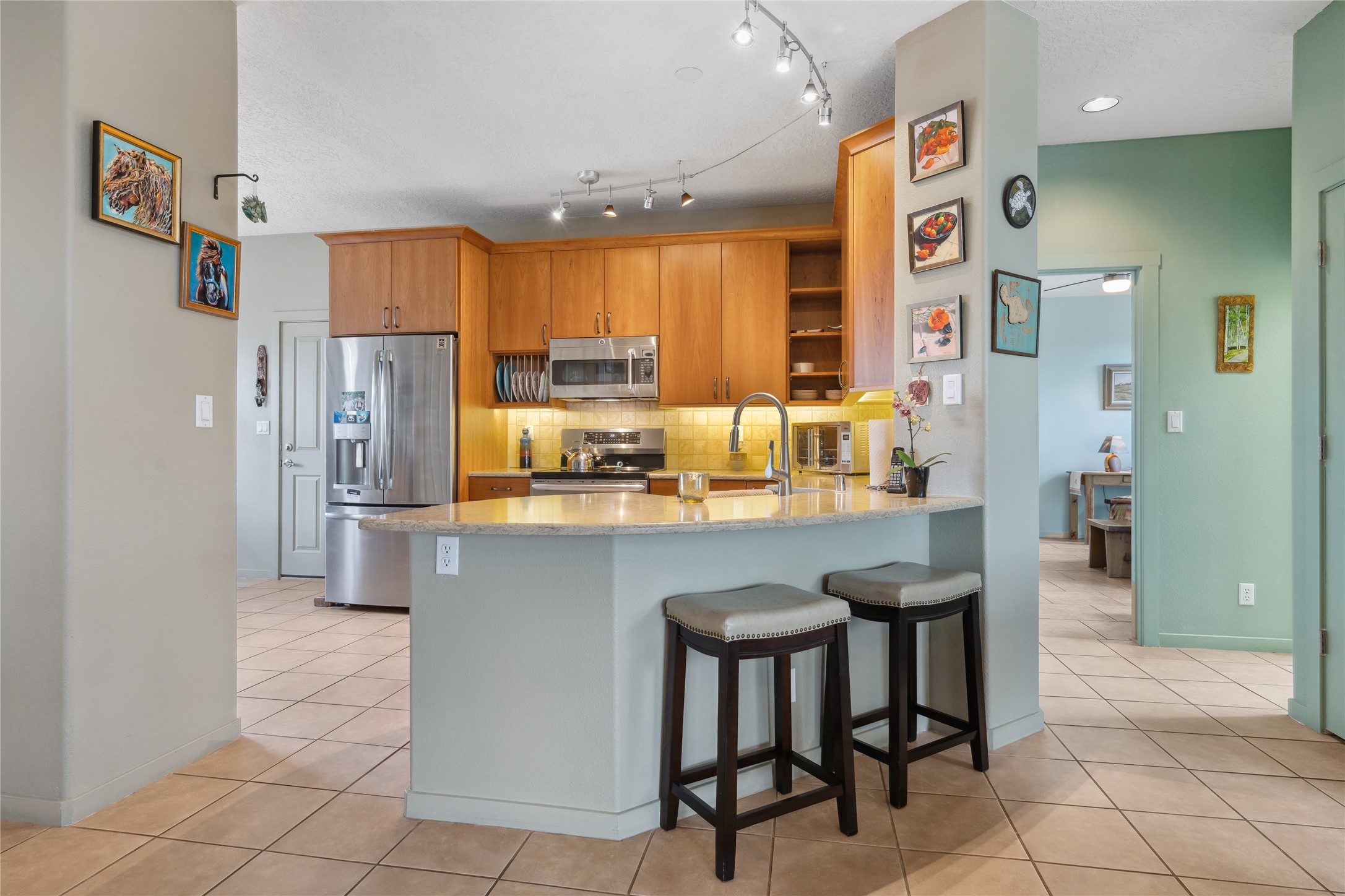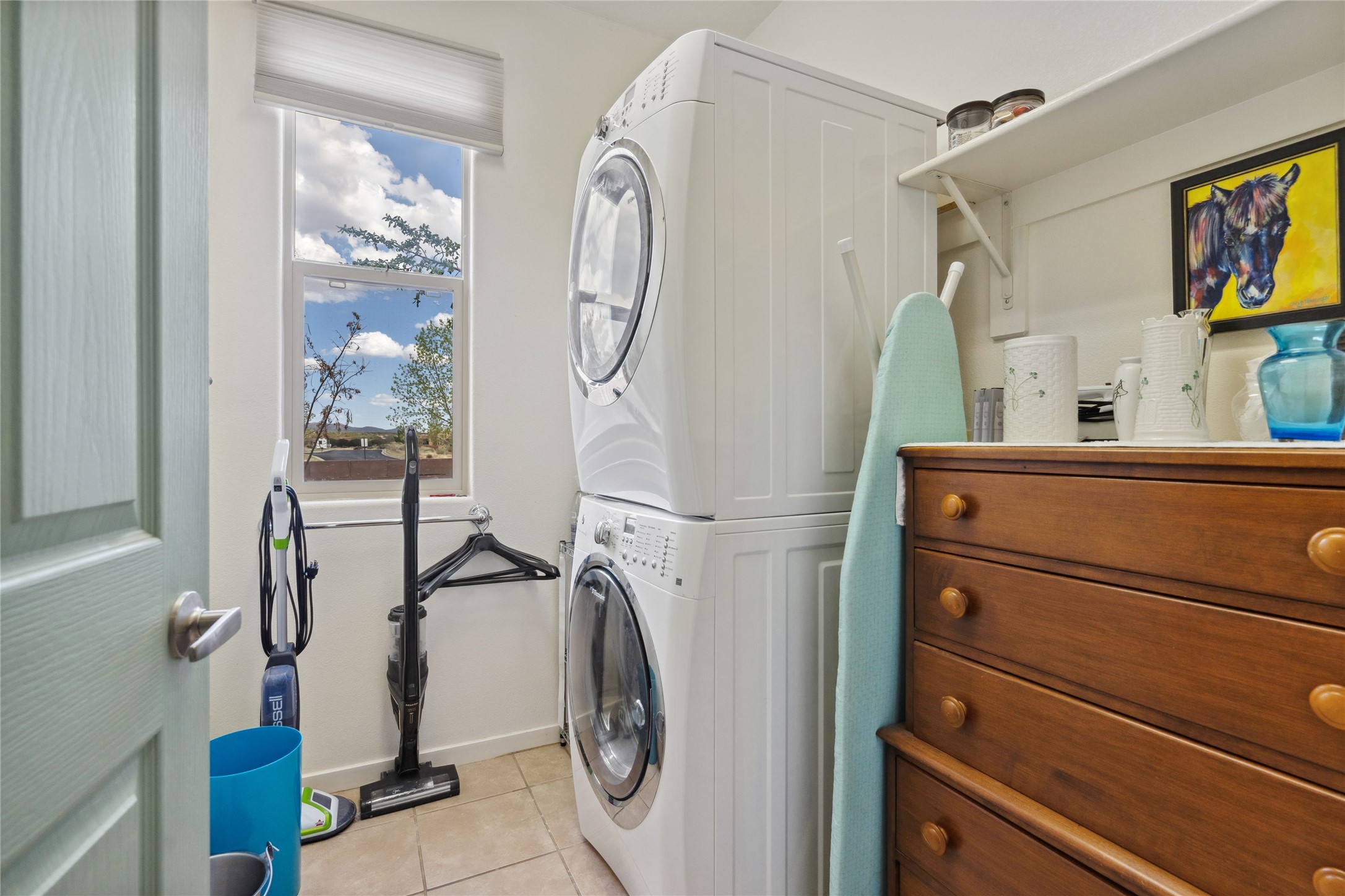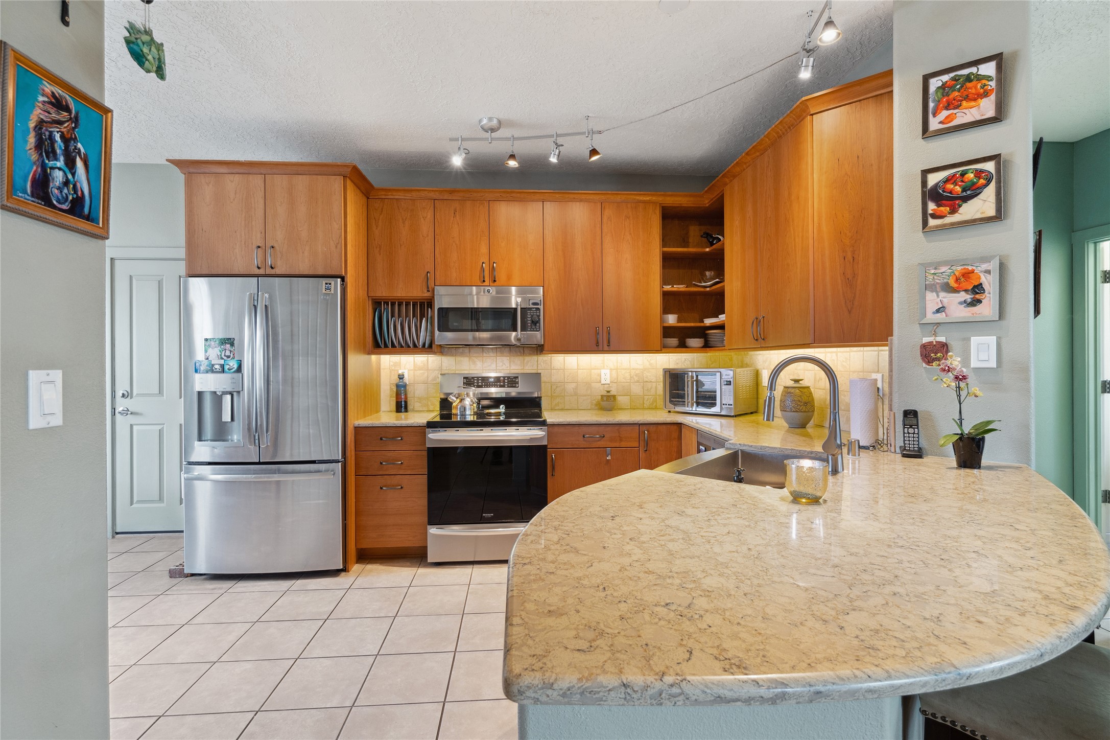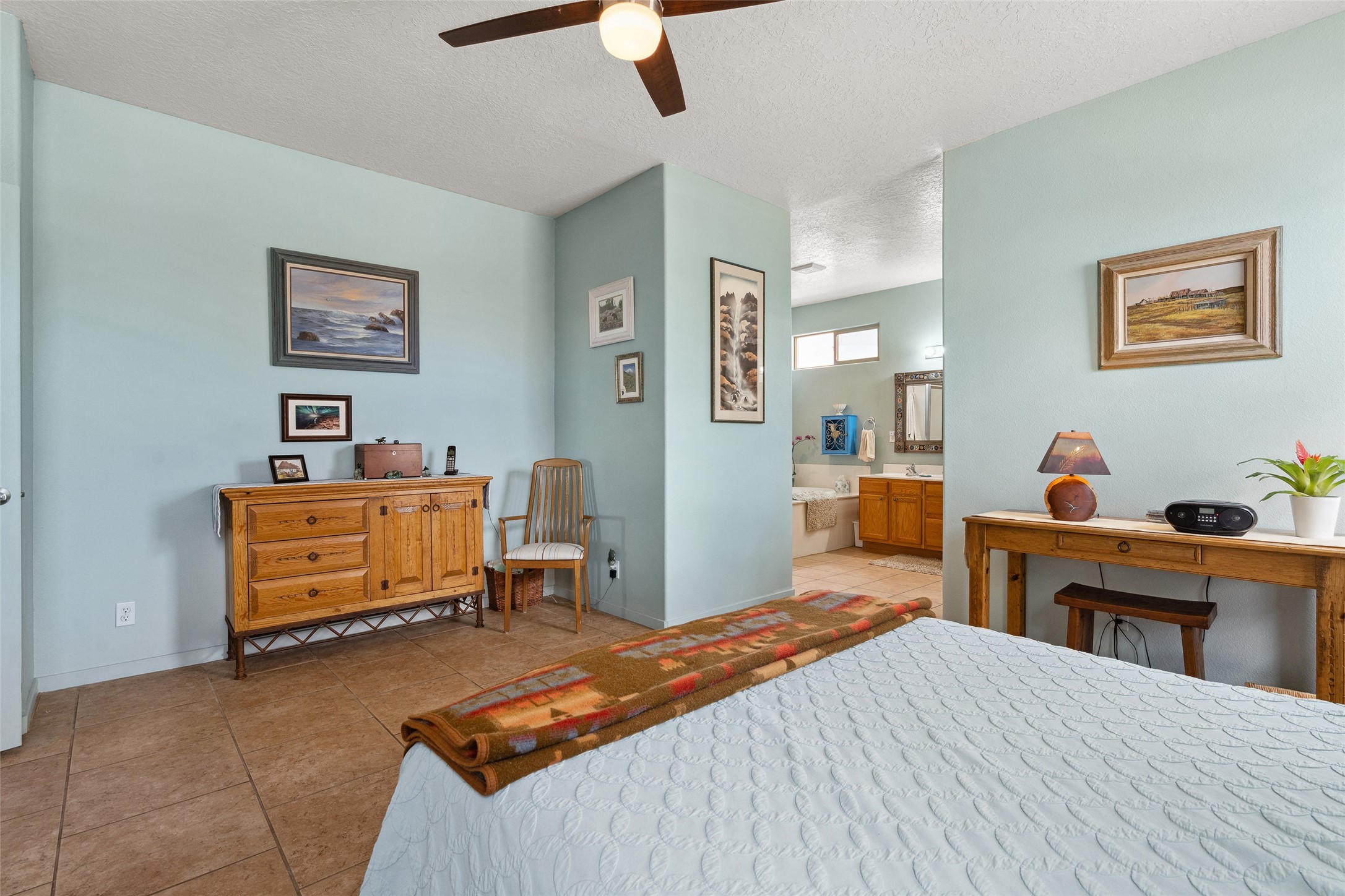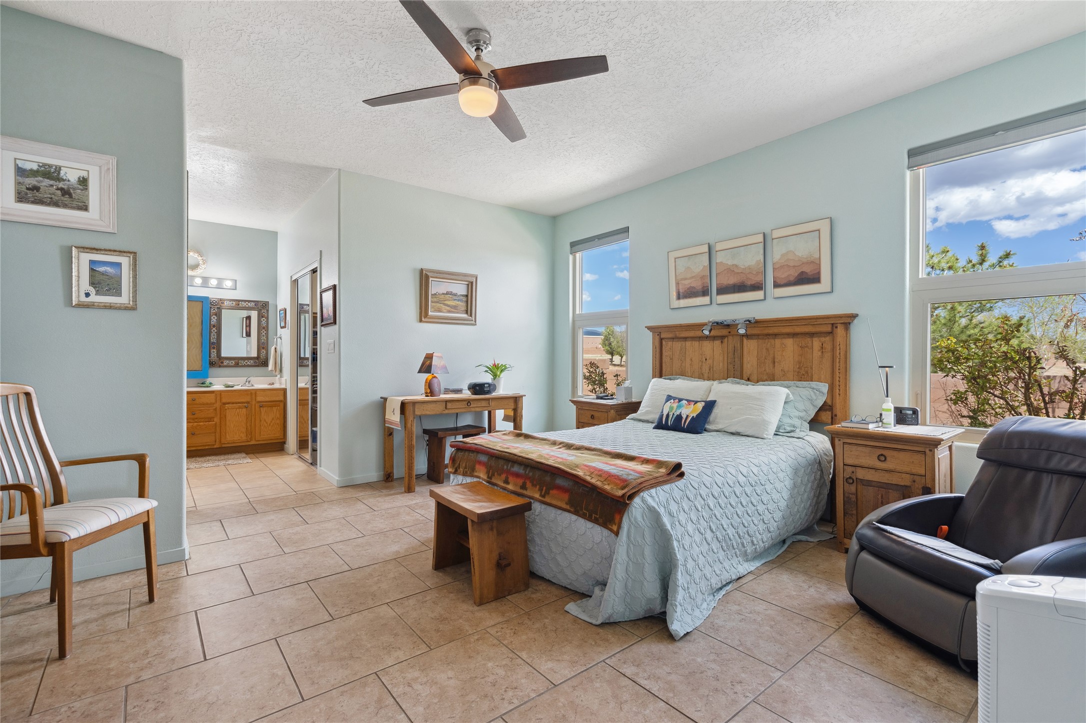 Discover this meticulously cared-for single-level home situated on a premium lot that backs directly onto a community park, offering stunning views and a serene atmosphere. This open-concept design exudes tranquility, making it the perfect retreat from the hustle and bustle of daily life. The remodeled kitchen is a chef's delight, featuring elegant cherry cabinetry, gorgeous quartz countertops, a stylish stone-tiled backsplash, and upgraded appliances, including an induction stove. The spacious living area boasts tiled floors, a cozy gas kiva fireplace, and large Anderson sliding glass doors that seamlessly connect to the inviting back portal. With a flexible den off the main living area, you'll have plenty of options for how to utilize the space. The thoughtfully designed split bedroom floor plan ensures privacy for the primary suite, which serves as a true haven. The well-equipped en-suite bathroom features dual sinks, a separate soaking tub, and a walk-in shower, complemented by a spacious walk-in closet. This home is brimming with upgrades, including custom-made window treatments, several ceiling fans, and refined lighting fixtures. The outdoor space is equally impressive, with lovely landscaping and a drip irrigation system that caters to the gardening enthusiast. Much of the yard is adorned with flagstone for low maintenance, while mature trees provide ample shade during the summer months. Enjoy countless hours under the custom northeastern-facing portal, soaking in the breathtaking views of the Sangre de Cristo Mountains across the park while the Ortiz and Sandia mountain views are prominent from the side yard. Rancho Viejo is a wonderful place to live with several community parks, over 15 miles of paved walking trails, and sensible covenants.