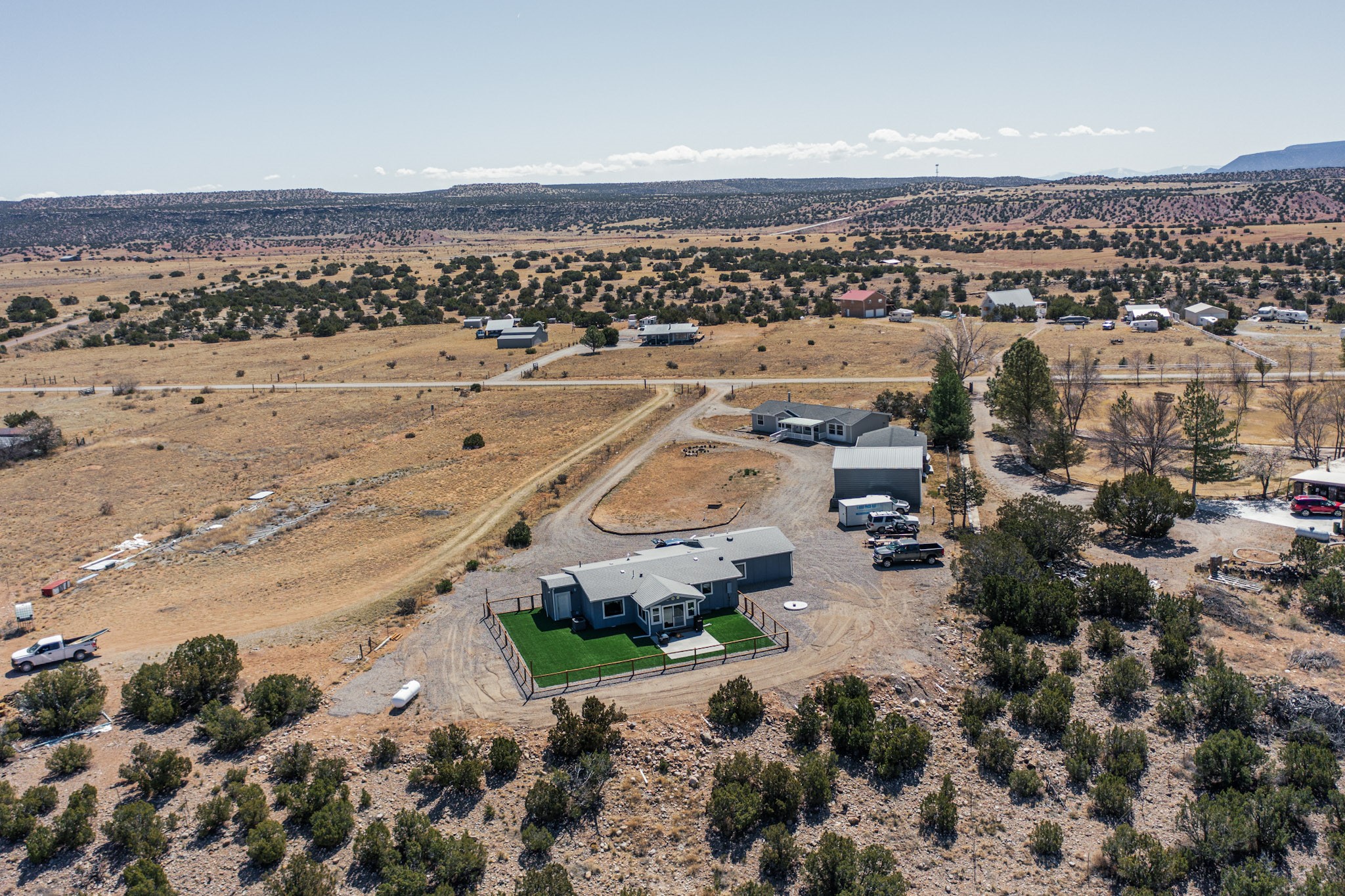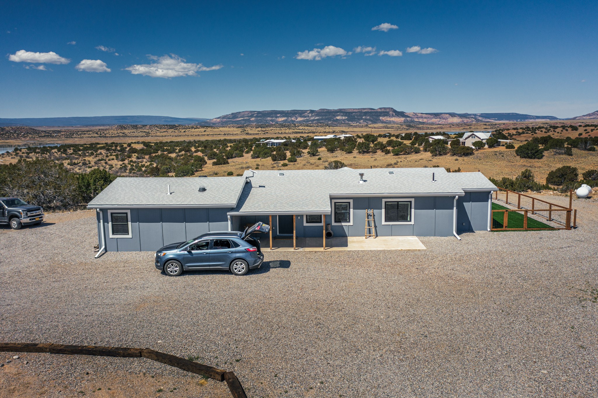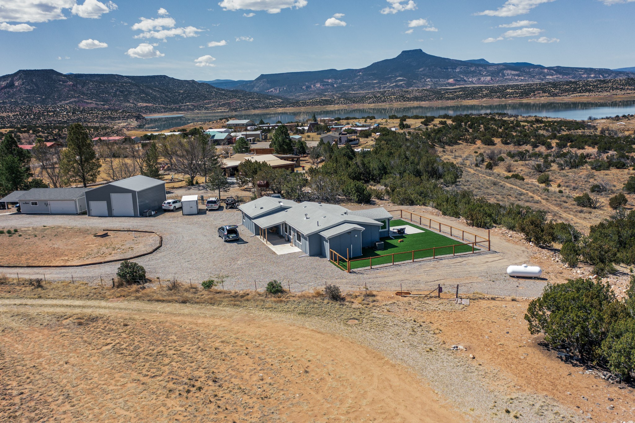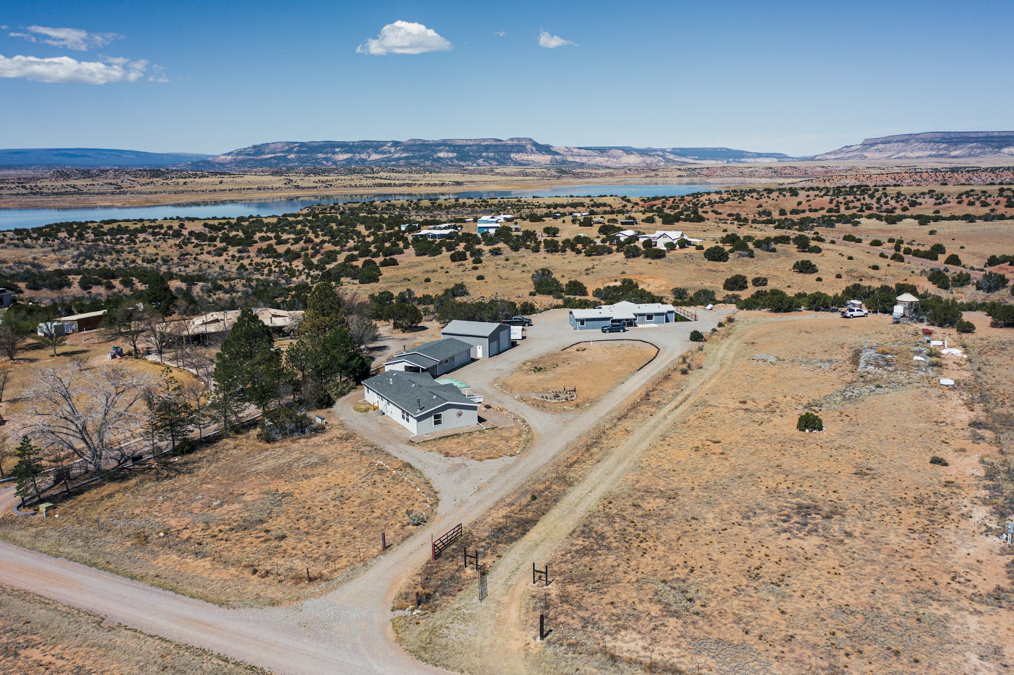 Imagine living and raising your family on Abiquiu Lake. The gated Subdivision renders easy access off HWY 84 on a paved road, and a generously graveled subdivision road. Never have to worry about access to the lake or your home. This home, that was once a part of a family compound, has all the bells and whistles one would want in a home. An incredible open concept chef's kitchen, with spectacular appliances. Quartz countertops and lighting add to the luxury. The owner suite is private and sensational, one would have to see it for oneself. Included in this suite is a home office space but could easily be converted into a personal place to read, write, sing, or watch television. The new owner can decide the use of this space. Then there are the ever changing views, regardless of the time day, there is always a new view. Whether it is early morning, midday, or evening, regardless of the time, the outside views are always stunning. The outside living space has a clear view of Abiquiu Lake and the renowned Ghost Ranch landscapes. If it is too cold outside, this home has enclosed space that could be utilized as an indoor patio, providing the same views that are offered outside. This is a unique subdivision, with an easy access boat ramp, for subdivision owners. Homes like this, with all it has to offer, rarely come on the market. You do not want to miss this opportunity to own this home and land, and all it has available. Nearby is 94A, PVT DR 1770 offering a home that also was once part of the same, family compound. The compound consisted of two dwellings, both are being sold separately. Whether you want one home or two homes, it is important you move quickly, so you can have a choice. Make sure you look at the Video Links.