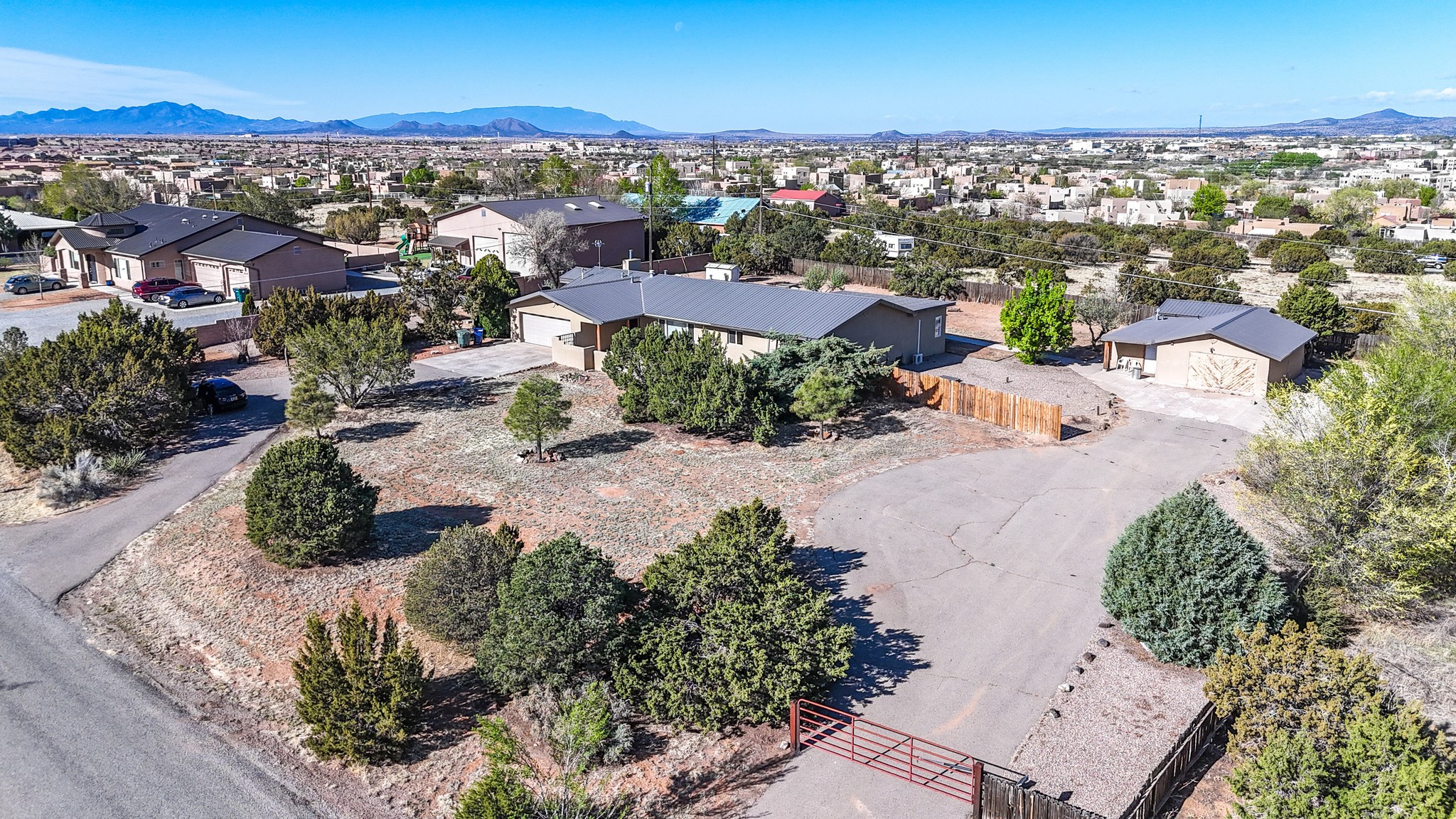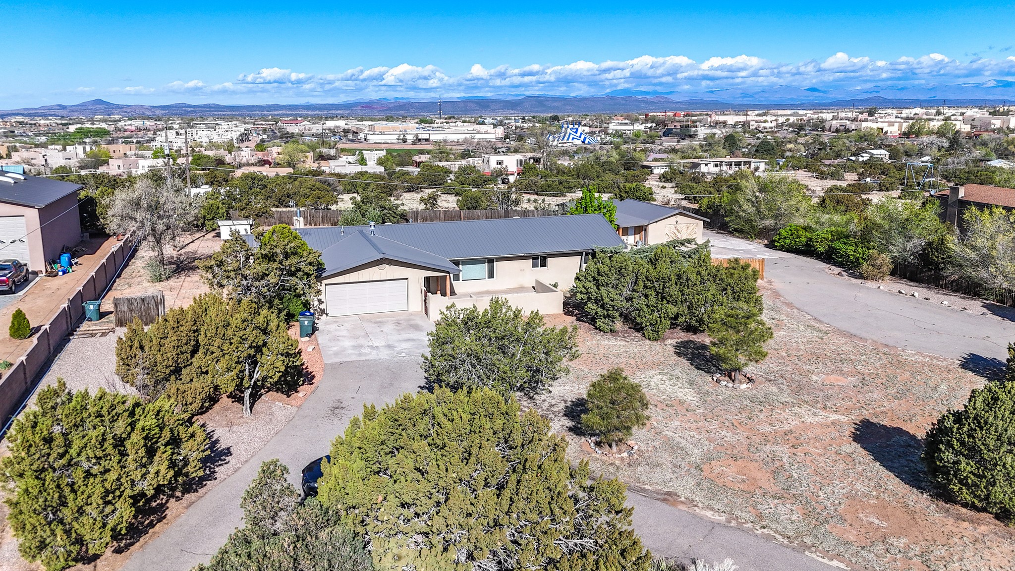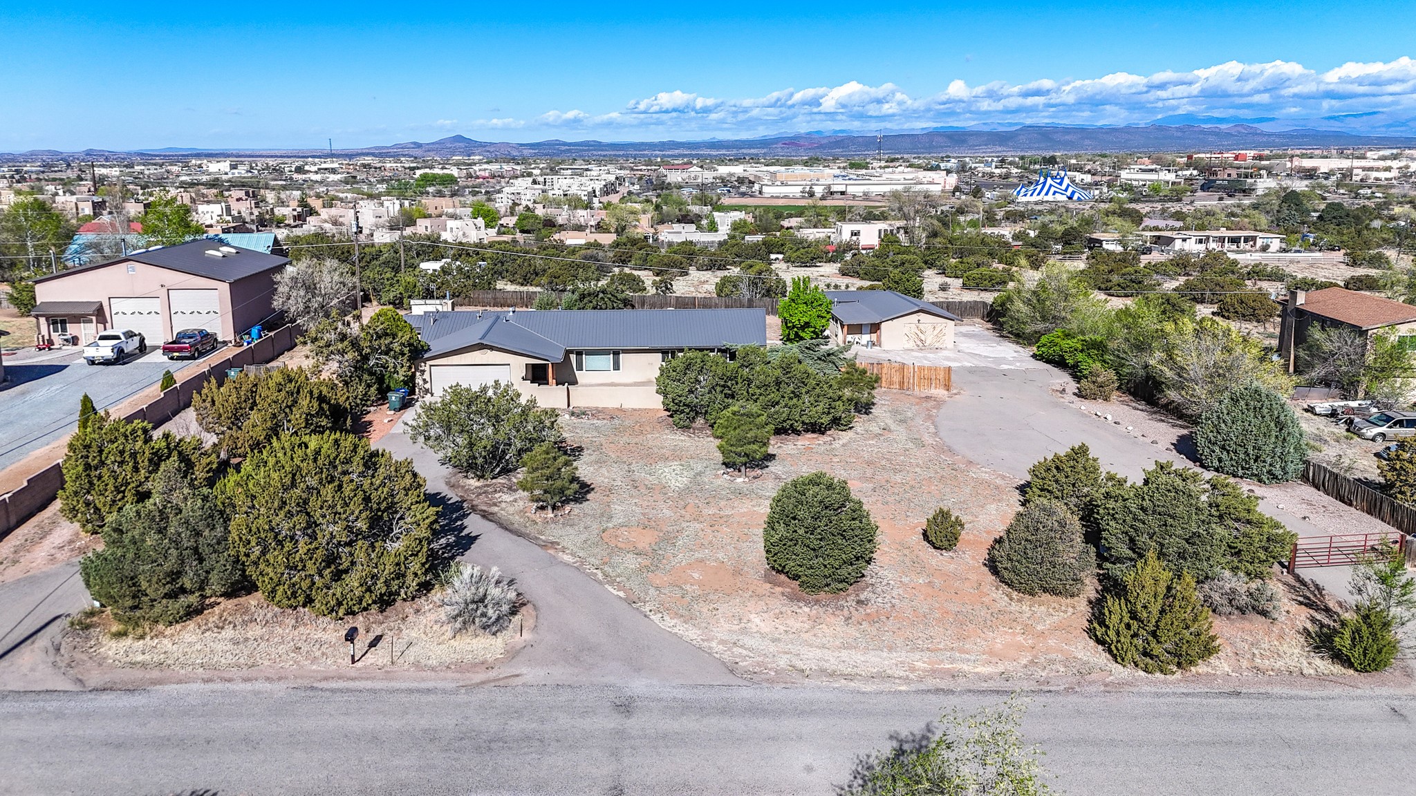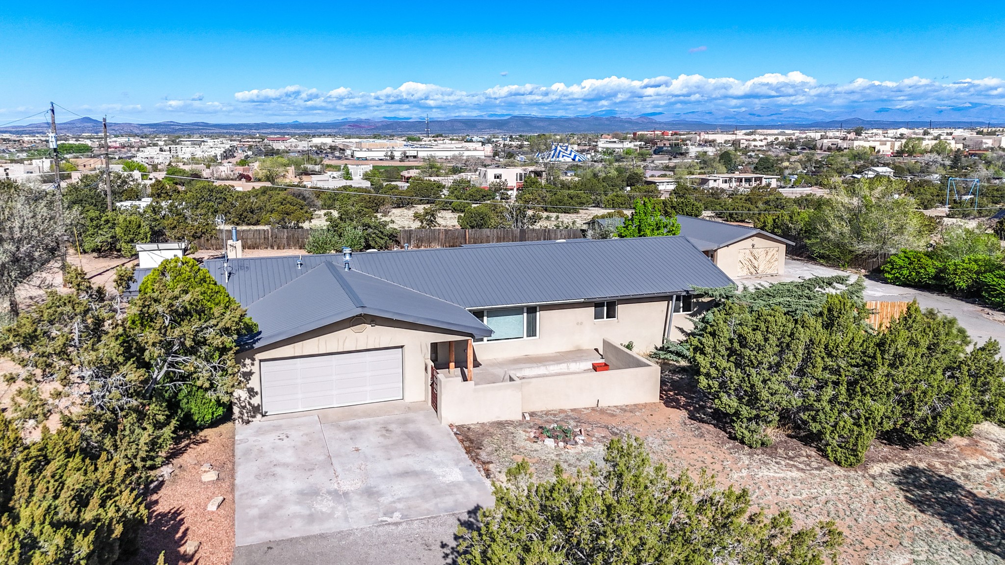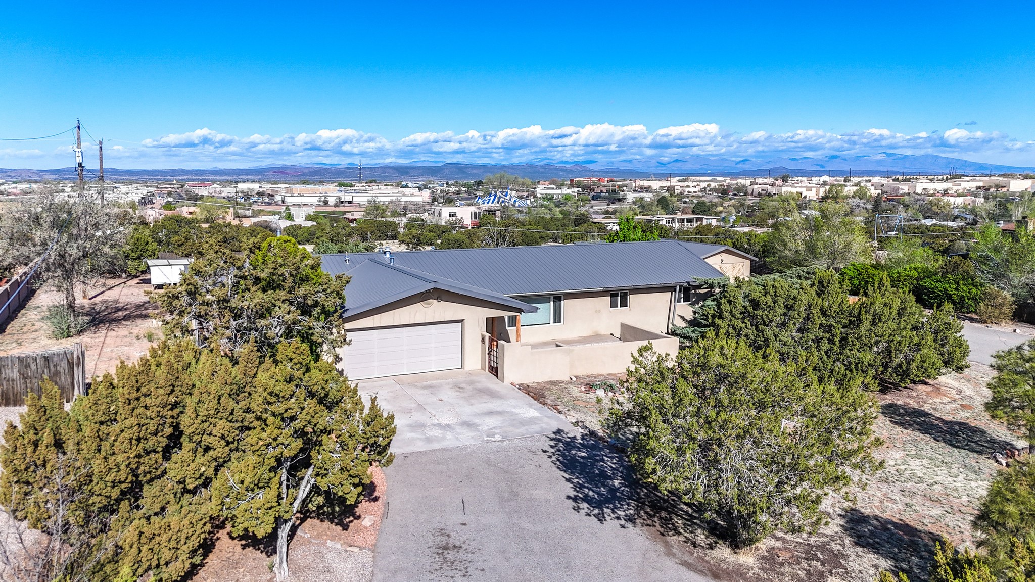 Amazing opportunity to own this versatile large home on a spacious rare one acre property with panoramic views in the heart of Santa Fe. Highly desirable area in the city limits with close proximity to everything that Santa Fe has to offer. Has a detached studio/workshop and dual driveways which is ideal for trade professionals or anyone seeking a flexible work setup with ample space to work with. The open-concept layout centers around a custom kitchen featuring a large granite island, stainless steel appliances, custom wood cabinetry, a built-in desk, and an oversized pantry, making it the perfect space for both everyday living and entertaining. The primary suite is generously sized and includes a private sitting area, along with a luxurious en-suite bathroom that features a walk-in shower and a classic pedestal tub. Natural gas fireplace in living area. In addition to the main home, this property includes several detached structures not included in the listed square footage, adding exceptional value and utility. A detached studio/workshop complete with its own bathroom, heating system, and water heater provides the ideal setup for a private office. The large detached workshop includes a utility sink and sits next to a separate storage unit, all accessible via a second private driveway--an excellent setup for equipment storage, tools, or home-based business operations.Additional features include an electric front gate with key fob entry, a custom front gate for added security, and an attached two-car garage. The lot offers plenty of space for RV or boat parking. Whether you need dedicated workspace, storage for your business, or are simply looking for a multi-functional property with income potential, this home checks all the boxes and offers a unique opportunity for both personal and professional use. Come see for yourself why this spectacular property is one of the great values available in todays market.