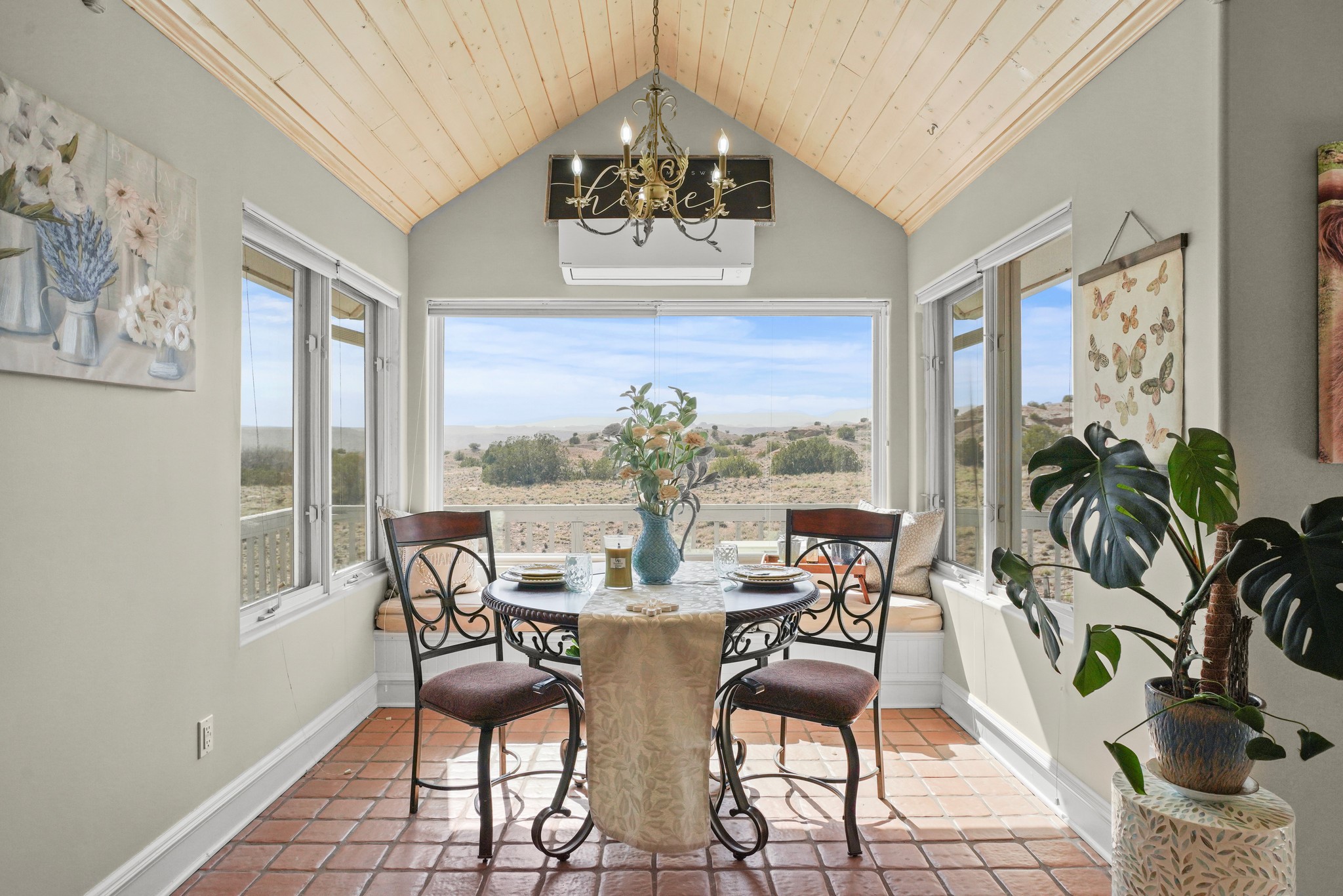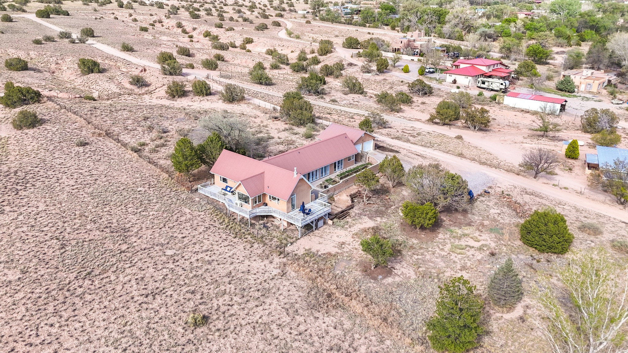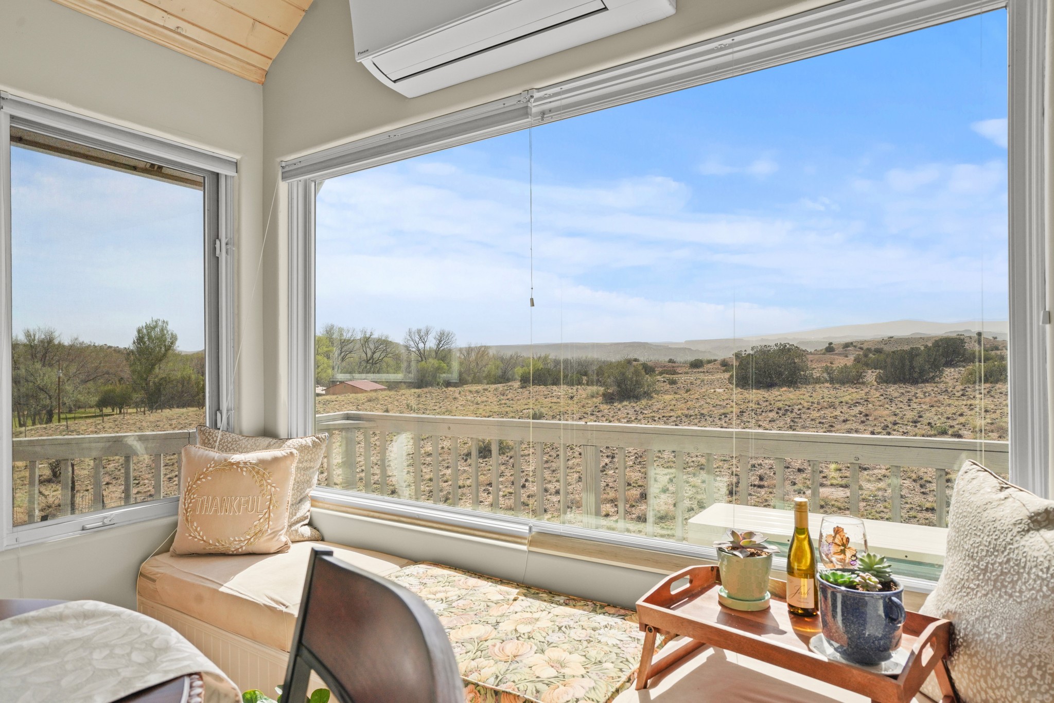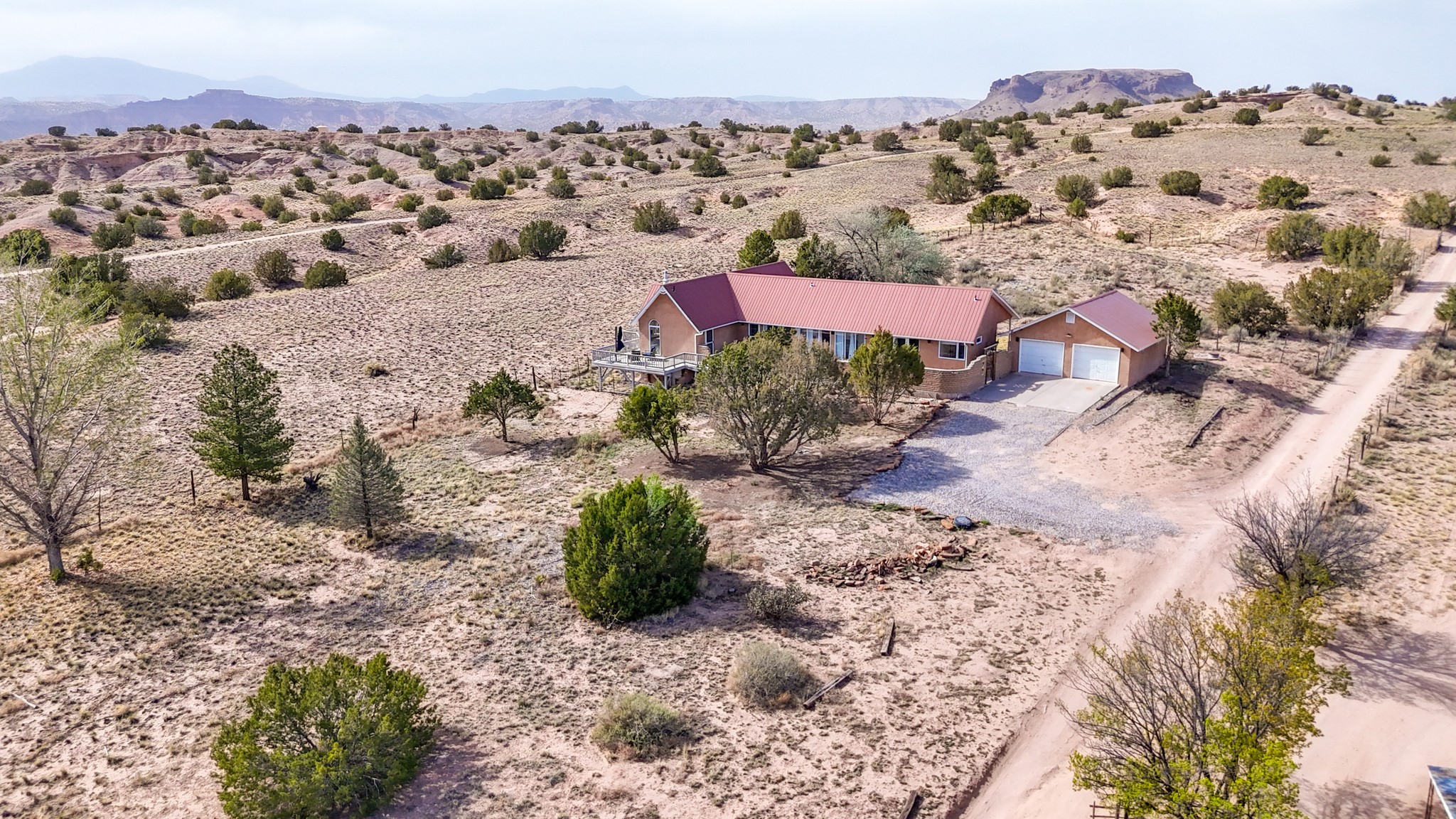 Peace and Tranquility coupled with views are added features to this custom, passive solar home. As you pull into this 3/4 acres property, you are met with a 2 car garage, and an adobe wall that welcomes you into the courtyard garden leading to the front door. This home boasts pitched, high ceilings with blonde T&G planks and large windows which make this home fill with light. The three bedrooms are generous in size and one is currently used as an exercise room. There are 2 bathrooms, and the primary suite bath has a large window to take in the view. The land abuts the San Ildefonso Pueblo with unobstructed sunset views of the Jemez mountains and Pajarito Plateau. Recent updates include an energy efficient 2 ton mini split system for auxiliary heating in winter and cooling in summer 2024, new propane water heater 2022, upgrade to the zone system of the boiler for radiant floor heating system 2022. This property is country living with an easy drive to Los Alamos, Santa Fe and Espanola.