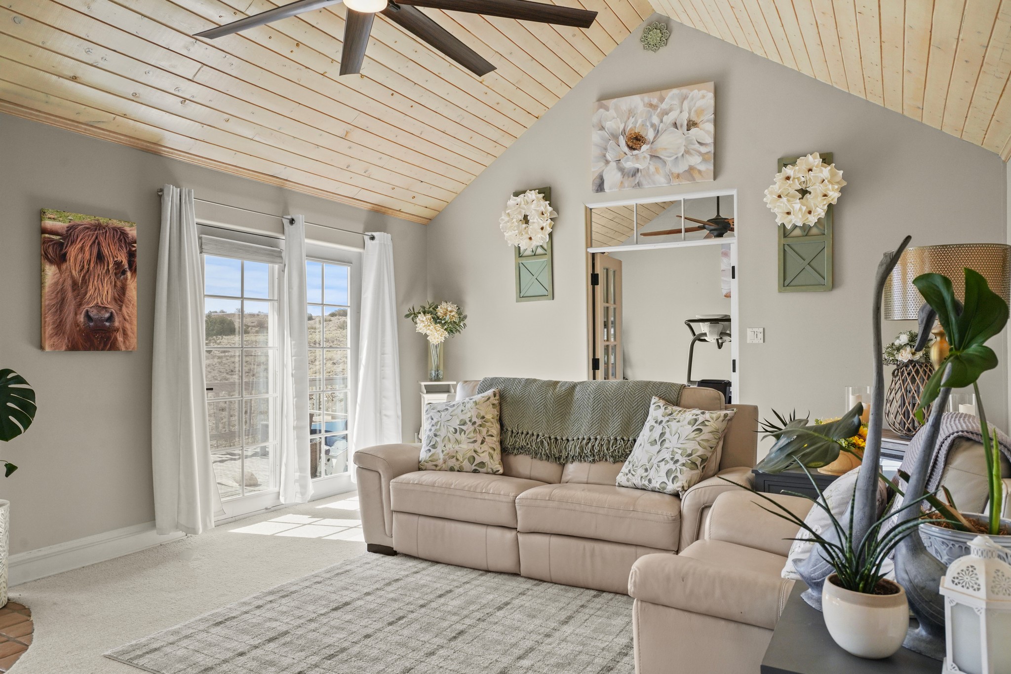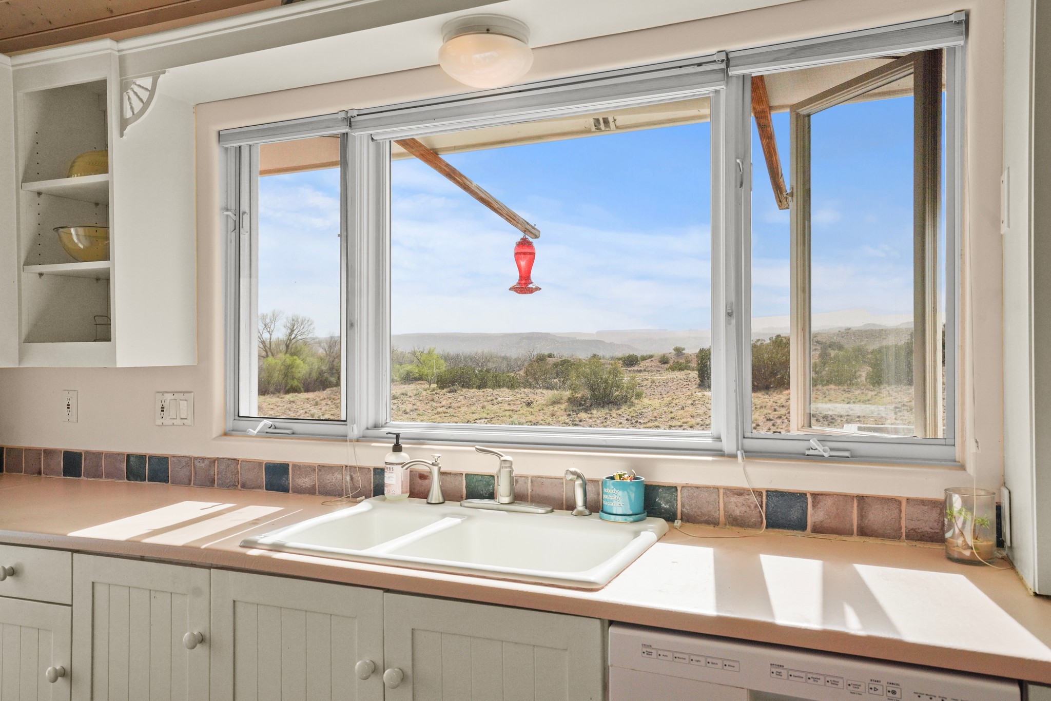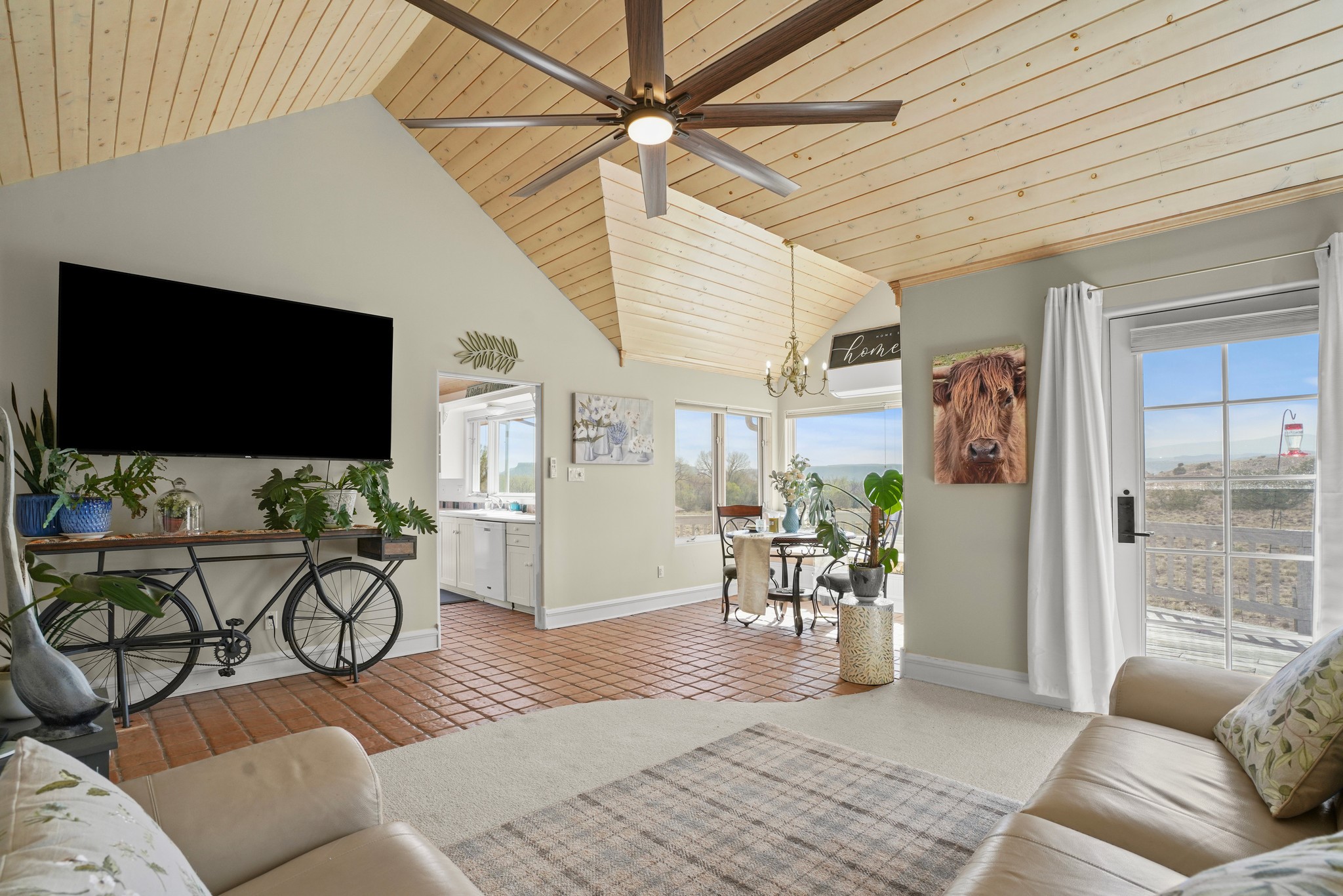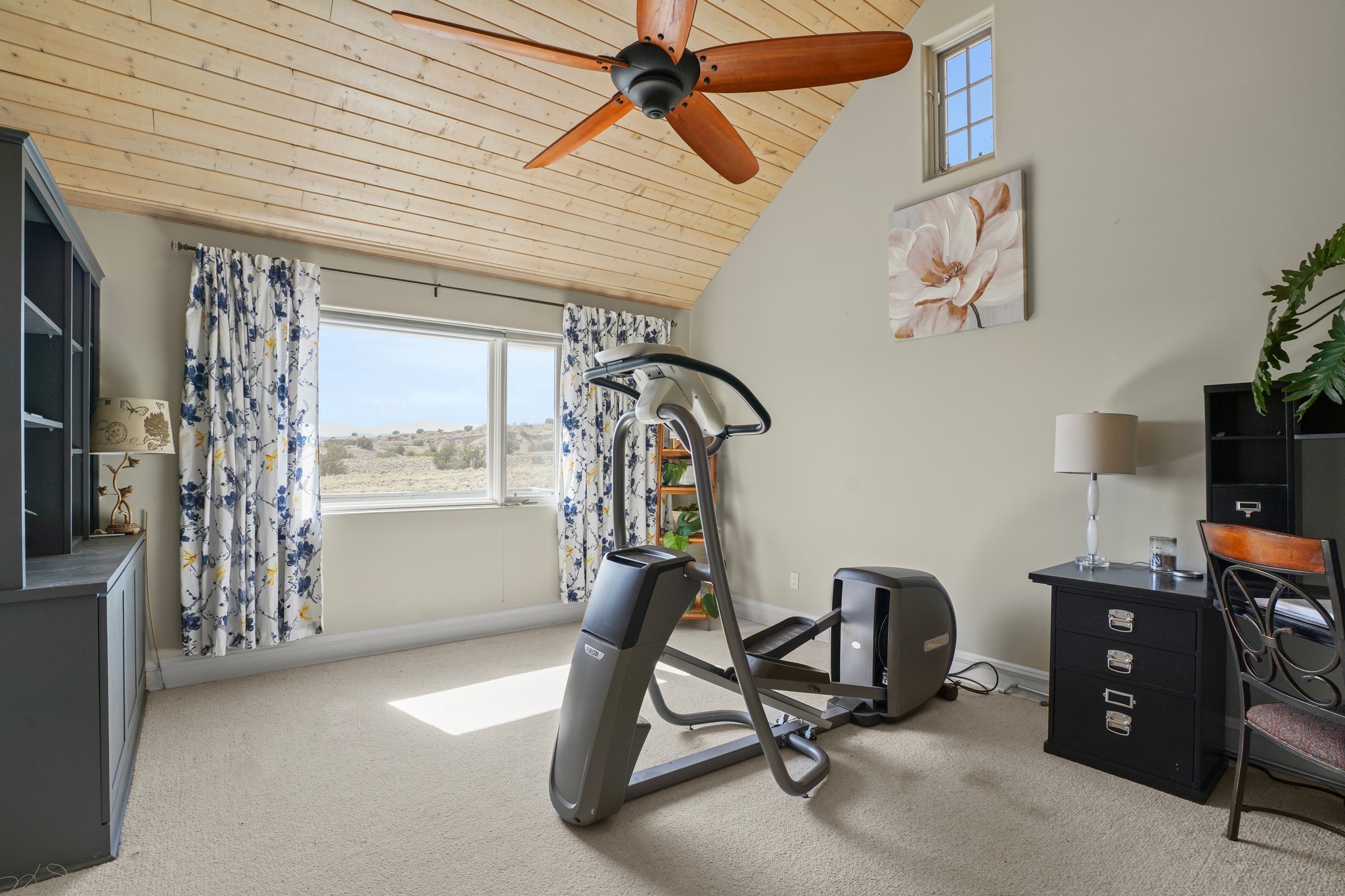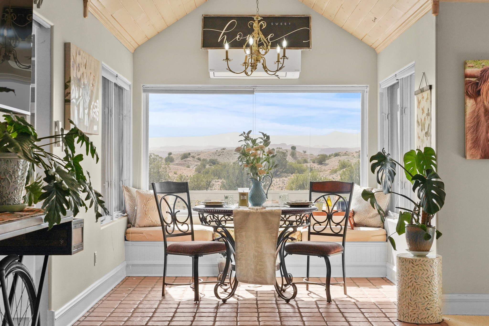 Peace and Tranquility coupled with views are added features to this custom, passive solar home. As you pull into this 3/4 acres property, you are met with a 2 car garage, and an adobe wall that welcomes you into the courtyard garden leading to the front door. This home boasts pitched, high ceilings with blonde T&G planks and large windows which make this home fill with light. The three bedrooms are generous in size and one is currently used as an exercise room. There are 2 bathrooms, and the primary suite bath has a large window to take in the view. The land abuts the San Ildefonso Pueblo with unobstructed sunset views of the Jemez mountains and Pajarito Plateau. Recent updates include an energy efficient 2 ton mini split system for auxiliary heating in winter and cooling in summer 2024, new propane water heater 2022, upgrade to the zone system of the boiler for radiant floor heating system 2022. This property is country living with an easy drive to Los Alamos, Santa Fe and Espanola.