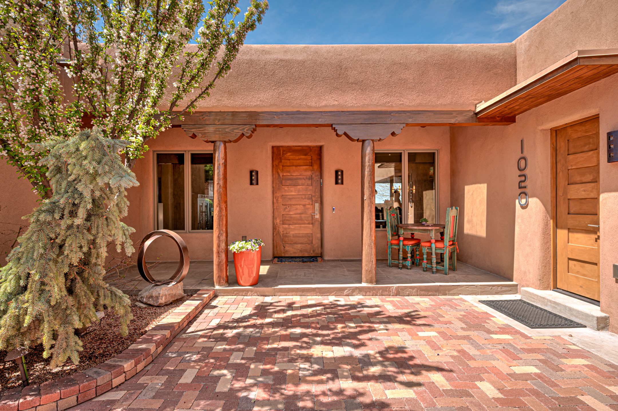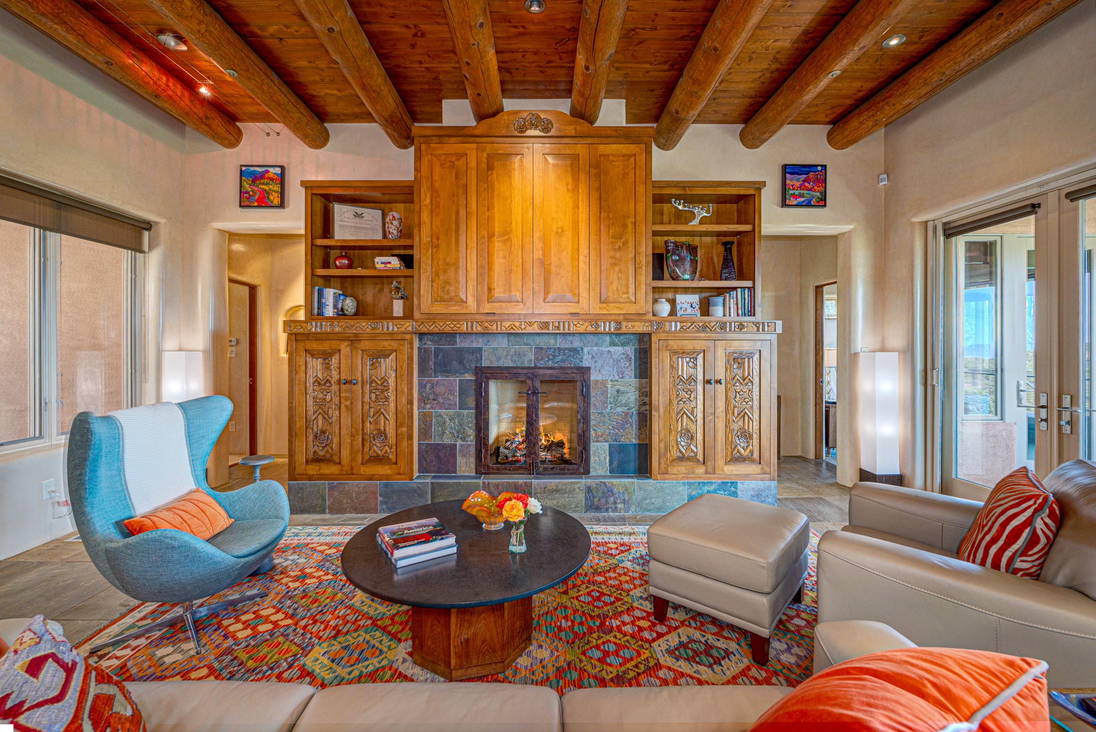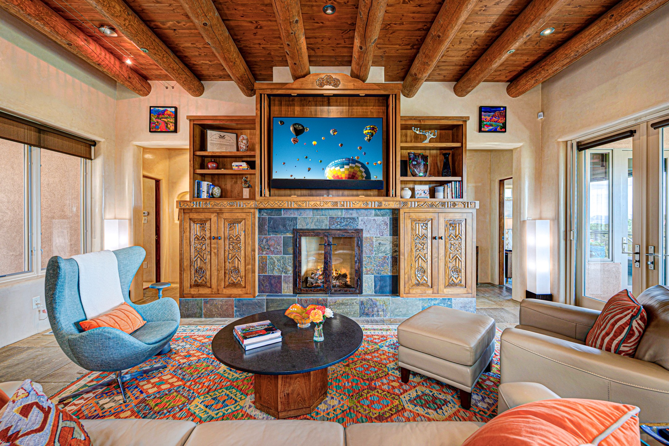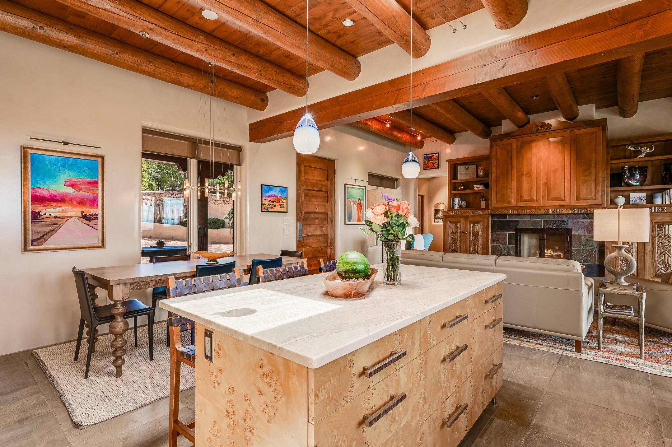 Located in the exclusive, gated High Summit community above Santa Fe, this stunning residence offers a rare blend of privacy, convenience, and breathtaking natural beauty and views. Located just minutes from Ten Thousand Waves, the Santa Fe Ski Basin, and the renowned Dale Ball Trail system--with direct access from your own backyard--this home is a true sanctuary for those who cherish the outdoors and Santa Fe's iconic landscape. Set against the serene backdrop of the Santa Fe National Forest, with sweeping views of the Sandia and Jemez Mountains, sunsets, and city lights, this thoughtfully designed home exemplifies the best of Santa Fe style. Inside, rich architectural details abound--vigas and beams, smooth plaster walls, custom cabinetry and doors, and natural stone flooring create a warm, refined atmosphere. This home is appointed with high-end finishes throughout. The gourmet kitchen is equipped with premium appliances, a generous island, and breakfast bar--ideal for everyday living or effortless entertaining. A gas log fireplace anchors the living room, while a cozy kiva fireplace adds charm to the bedroom suite. Comfort meets efficiency with central cooling, as well as radiant in-floor heating. The beautifully landscaped grounds are complemented by an outdoor view portal with automatic sunshades, seamlessly blending indoor and outdoor living. Built in 2013, the home has 2 bedrooms, 2 baths, private office/study/den plus an additional room currently the perfect home gym. Also included is a large storage room with built-in shelving and 2 car garage. All of this, with paved, maintained roads and city utilities--just five miles from the heart of downtown Santa Fe, Canyon Road's galleries, and world-class dining. A unique opportunity to own an elegant mountain escape in one of Santa Fe's most desirable enclaves.
