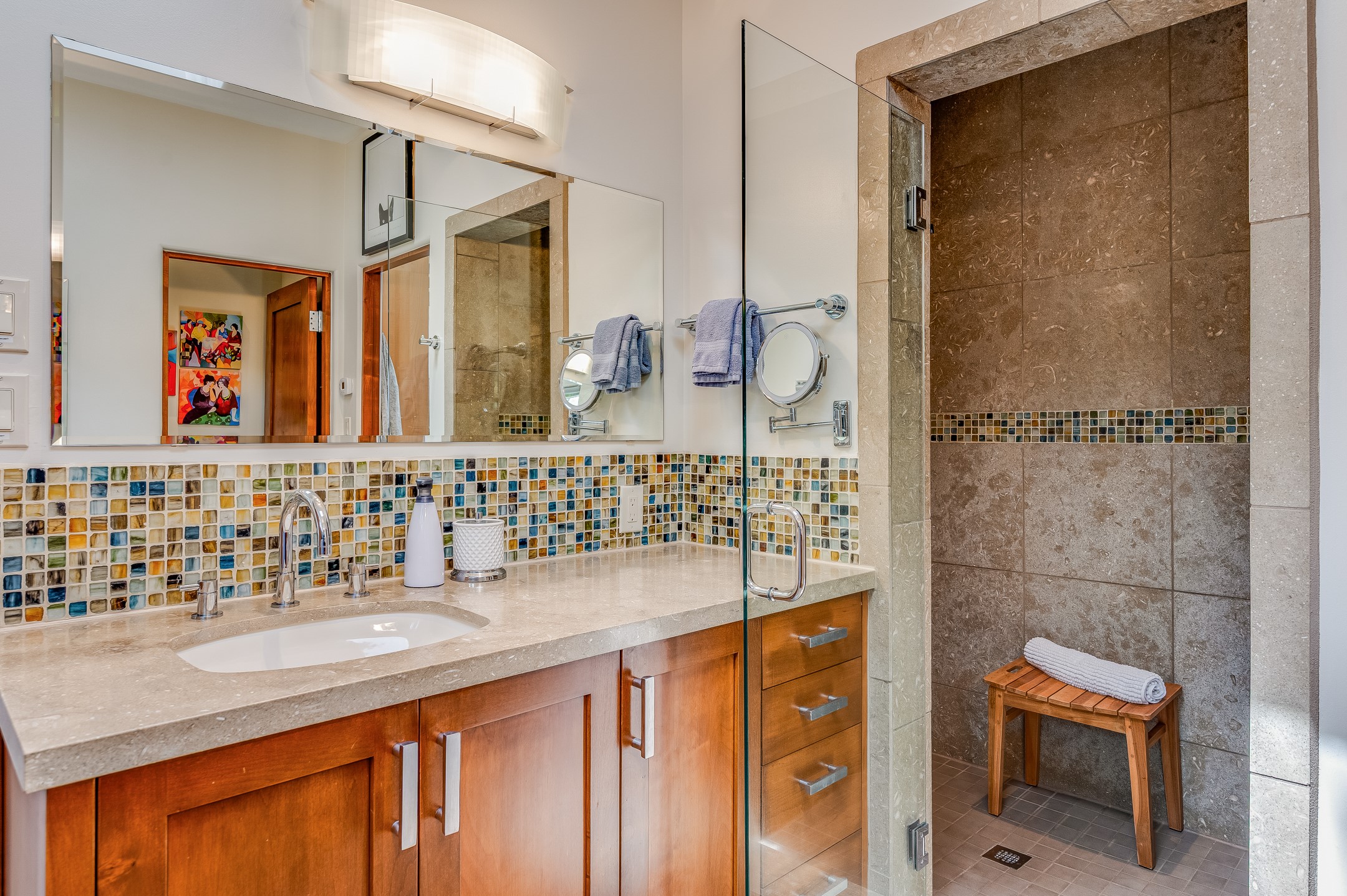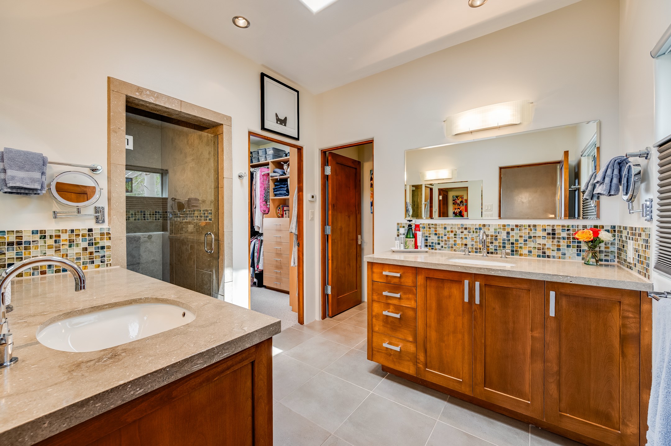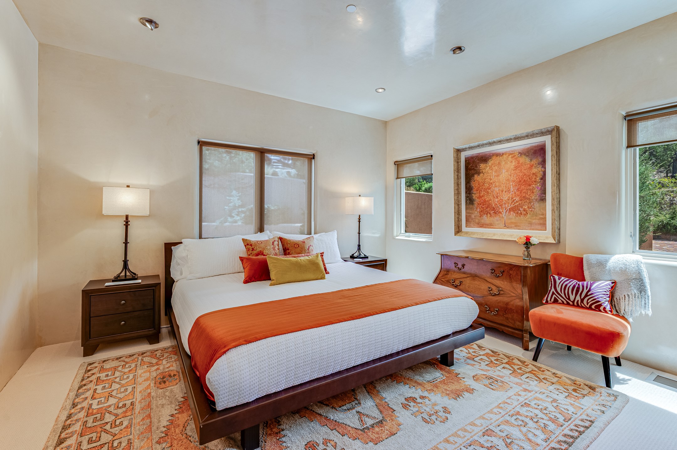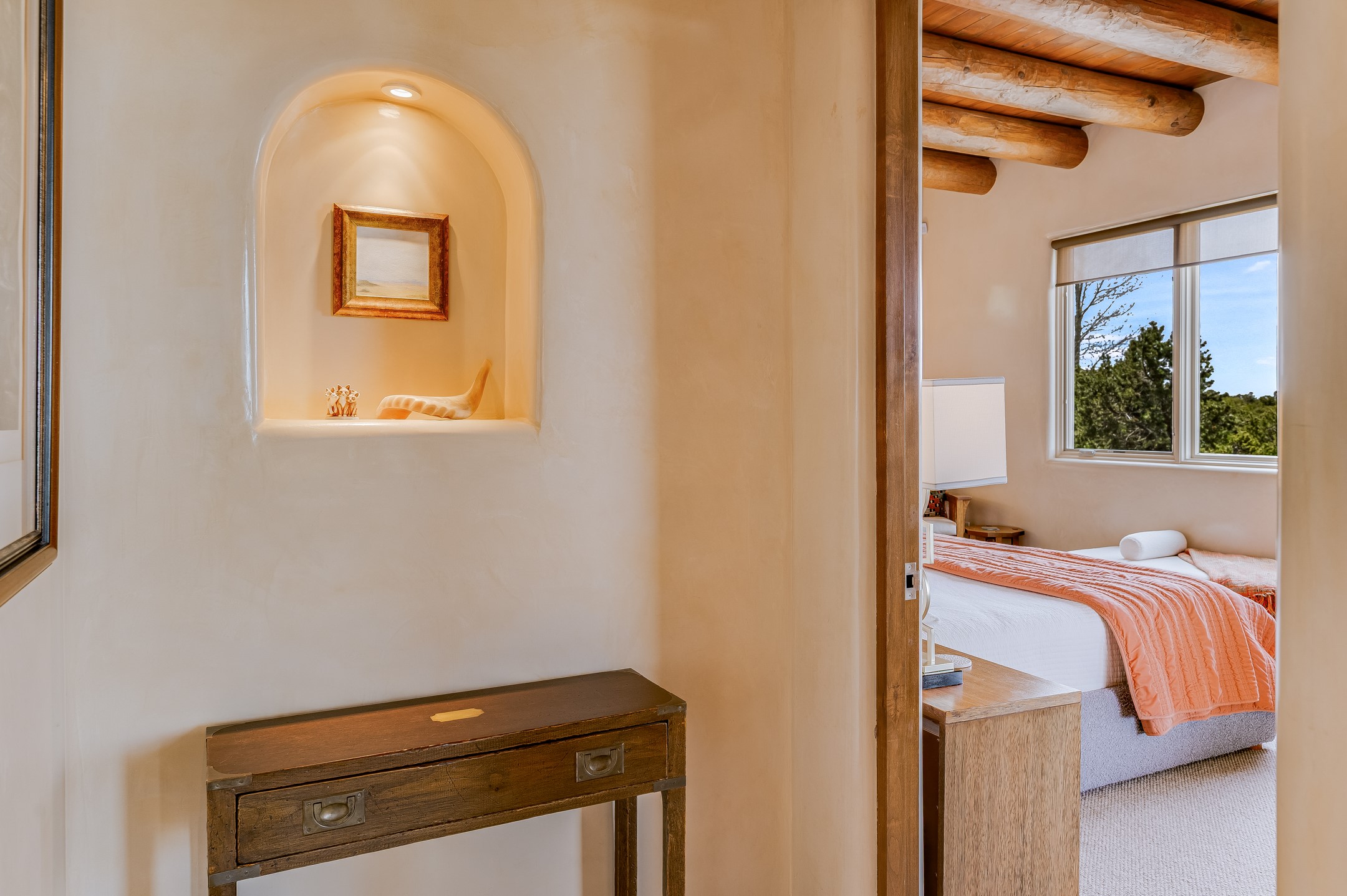Located in the exclusive, gated High Summit community above Santa Fe, this stunning residence offers a rare blend of privacy, convenience, and breathtaking natural beauty and views. Located just minutes from Ten Thousand Waves, the Santa Fe Ski Basin, and the renowned Dale Ball Trail system--with direct access from your own backyard--this home is a true sanctuary for those who cherish the outdoors and Santa Fe's iconic landscape. Set against the serene backdrop of the Santa Fe National Forest, with sweeping views of the Sandia and Jemez Mountains, sunsets, and city lights, this thoughtfully designed home exemplifies the best of Santa Fe style. Inside, rich architectural details abound--vigas and beams, smooth plaster walls, custom cabinetry and doors, and natural stone flooring create a warm, refined atmosphere. This home is appointed with high-end finishes throughout. The gourmet kitchen is equipped with premium appliances, a generous island, and breakfast bar--ideal for everyday living or effortless entertaining. A gas log fireplace anchors the living room, while a cozy kiva fireplace adds charm to the bedroom suite. Comfort meets efficiency with central cooling, as well as radiant in-floor heating. The beautifully landscaped grounds are complemented by an outdoor view portal with automatic sunshades, seamlessly blending indoor and outdoor living. Built in 2013, the home has 2 bedrooms, 2 baths, private office/study/den plus an additional room currently the perfect home gym. Also included is a large storage room with built-in shelving and 2 car garage. All of this, with paved, maintained roads and city utilities--just five miles from the heart of downtown Santa Fe, Canyon Road's galleries, and world-class dining. A unique opportunity to own an elegant mountain escape in one of Santa Fe's most desirable enclaves.
