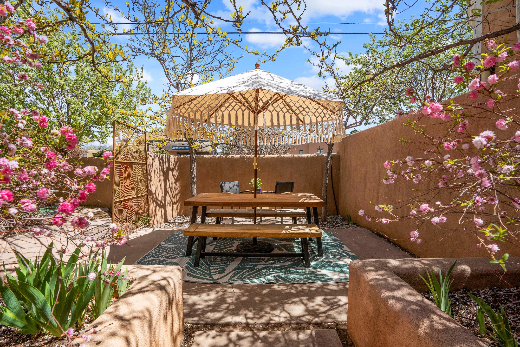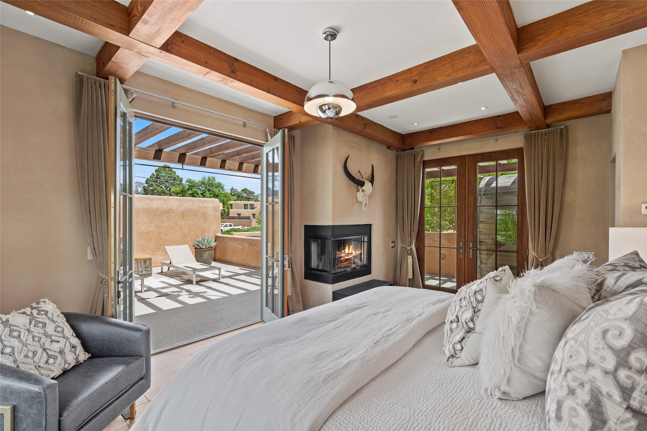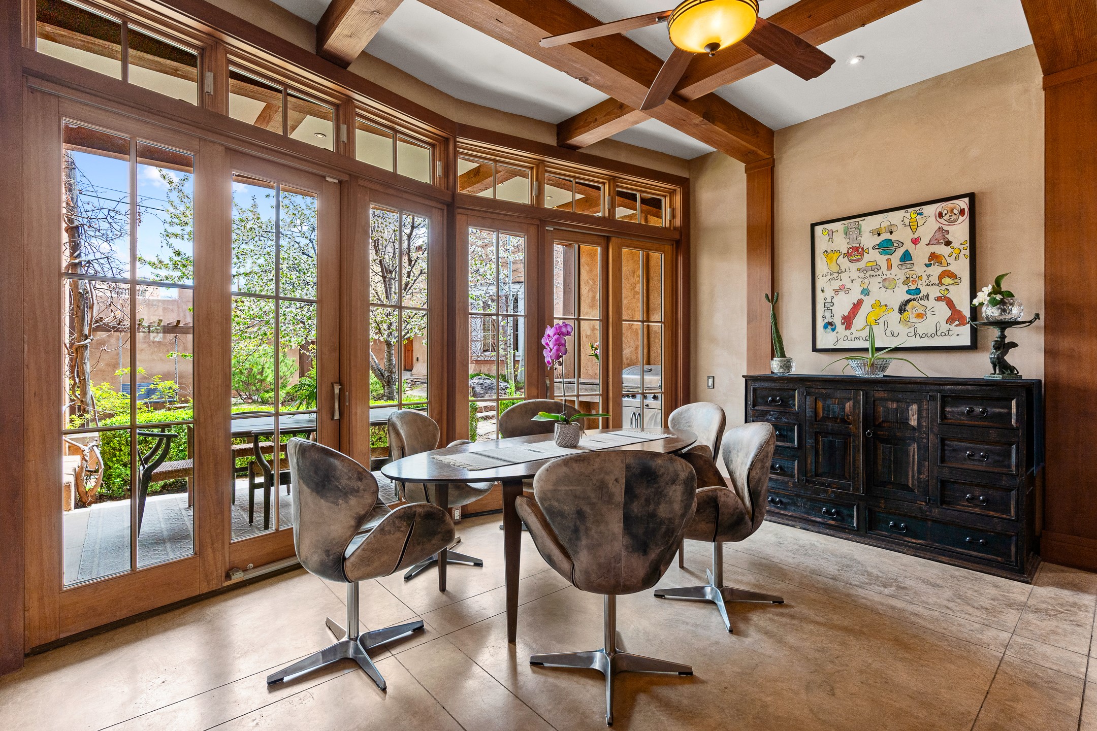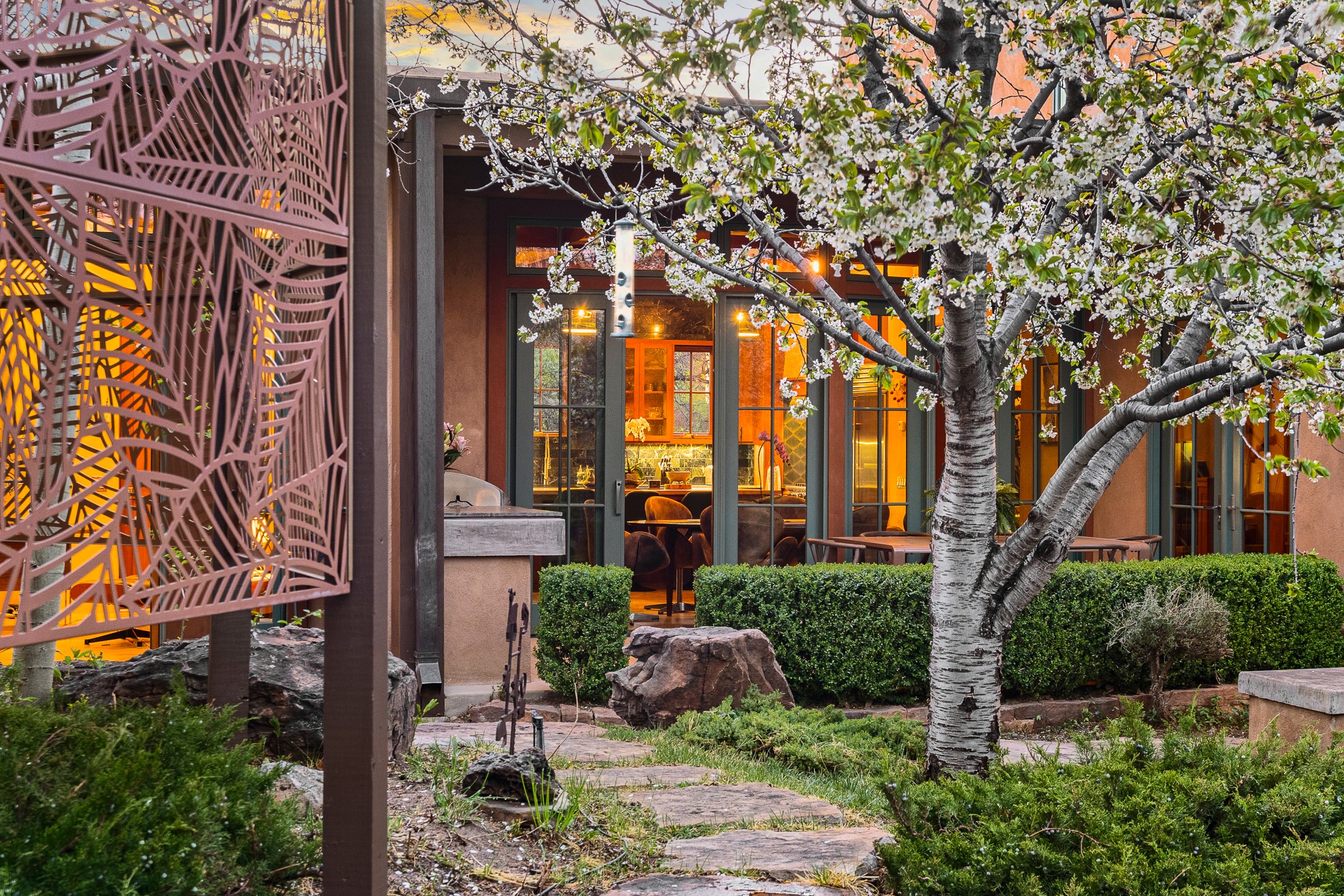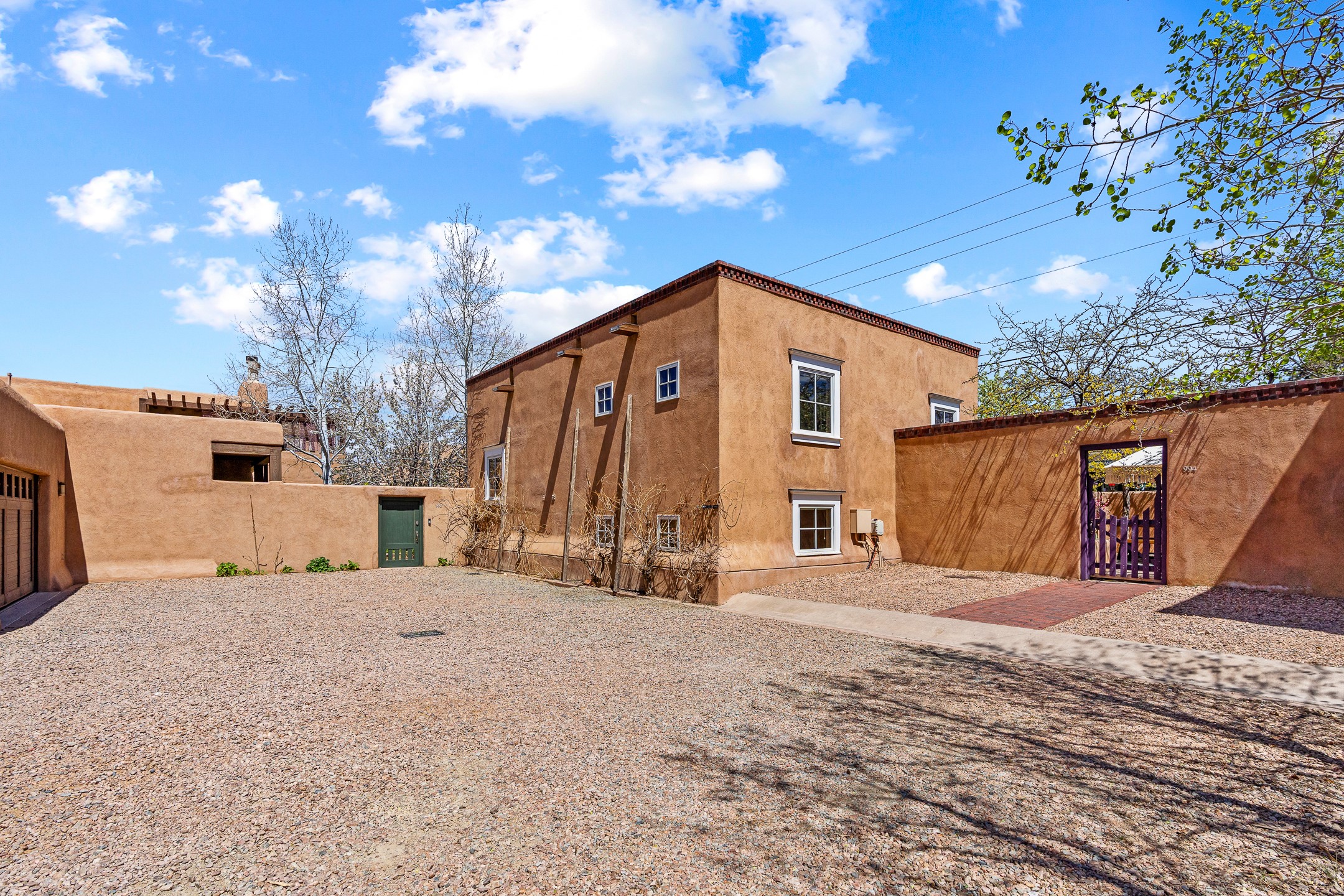 A rare and refined offering in the heart of Santa Fe, this extraordinary 6-bedroom, 6-bath gated compound is a seamless blend of architectural brilliance, design sophistication, and functional versatility. Encompassing two distinctive yet complementary residences, this private estate is nestled in the coveted South Capitol and Eastside neighborhoods--just moments from the Plaza, Canyon Road, museums, and Santa Fe's world-class dining and shopping.The main residence is a serene 4-bedroom, 4-bath sanctuary where timeless elegance meets exceptional craftsmanship. Soaring ceilings, natural American Clay plaster walls, and Douglas Fir coffered wood beam ceilings enhance the grand interiors, while floor-to-ceiling transom windows invite in abundant light. The stunning chef's kitchen--complete with Subzero refrigerator and new Viking appliances--opens to a beautifully landscaped central courtyard with a tranquil waterfall fountain, lush gardens, alfresco dining areas, and multiple verandas perfect for entertaining.The gracious living and dining rooms are anchored by a natural stone fireplace and expansive glass doors overlooking a verdant courtyard adorned with mature Wisteria, Aspen, and Cherry trees. Upstairs, the luxurious primary suite features breathtaking views of Picacho Peak, a spa-like bathroom with Jacuzzi tub, steam shower, and private rooftop terrace with fireplace, cedar hot tub, sauna, and wrap-around deck.The adjacent property, designed by an architect for both residential and commercial use, adds a flexible 2-3 bedroom, 2-bath layout ideal for live/work functionality, a creative studio, or income-generating rental. It features 12-foot ceilings, expansive windows, radiant in-floor heating, mini split A/C systems, a modern kitchen with polished granite countertops, and a spacious open-concept living area.Together, these two properties form a unique and cohesive compound with separate utility metering, multiple private entrances, 2.5-car garage plus two additional parking spaces, and the rare opportunity to live, work, and entertain in one of Santa Fe's most desirable locations. Whether as a private estate, multi-generational retreat, or mixed-use investment, this compound is a true Santa Fe masterpiece.These properties may be purchased together as a compound or separately. For individual details, please see listing MLS# 202501407 and MLS# 202501401.