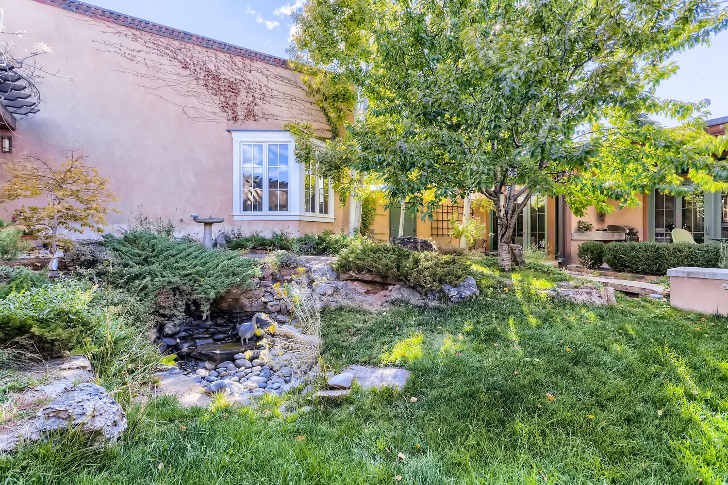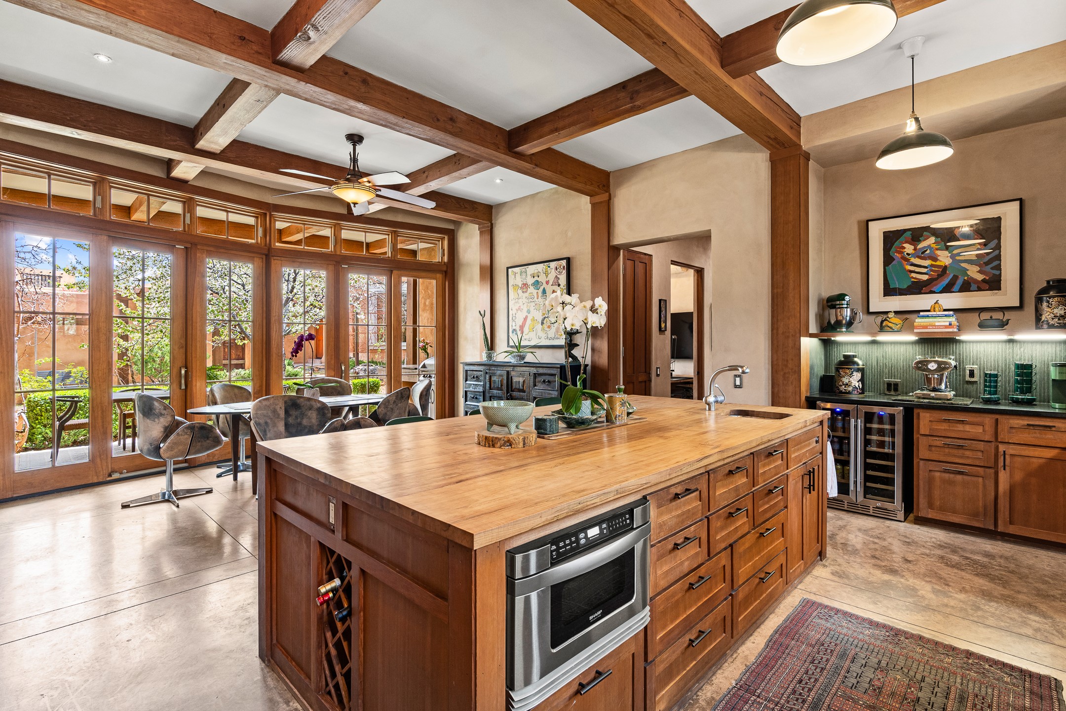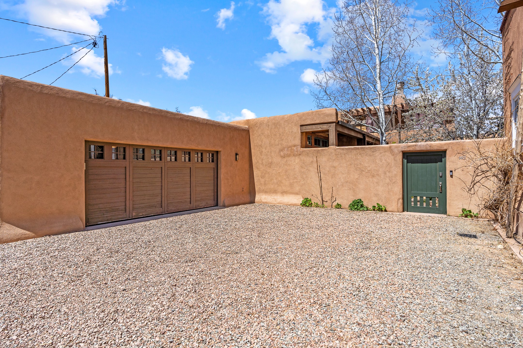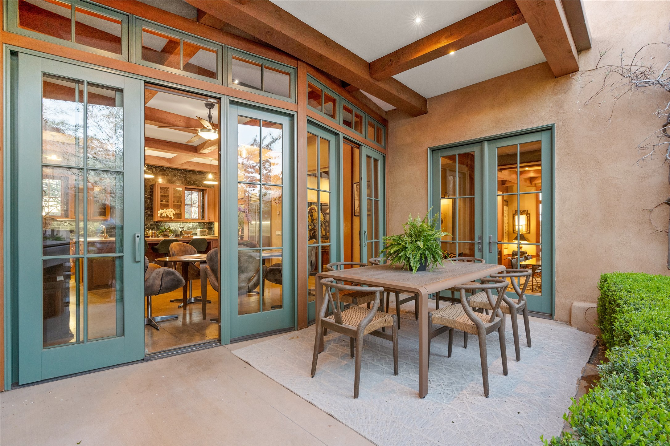 A rare and refined offering in the heart of Santa Fe, this extraordinary 6-bedroom, 6-bath gated compound is a seamless blend of architectural brilliance, design sophistication, and functional versatility. Encompassing two distinctive yet complementary residences, this private estate is nestled in the coveted South Capitol and Eastside neighborhoods--just moments from the Plaza, Canyon Road, museums, and Santa Fe's world-class dining and shopping.The main residence is a serene 4-bedroom, 4-bath sanctuary where timeless elegance meets exceptional craftsmanship. Soaring ceilings, natural American Clay plaster walls, and Douglas Fir coffered wood beam ceilings enhance the grand interiors, while floor-to-ceiling transom windows invite in abundant light. The stunning chef's kitchen--complete with Subzero refrigerator and new Viking appliances--opens to a beautifully landscaped central courtyard with a tranquil waterfall fountain, lush gardens, alfresco dining areas, and multiple verandas perfect for entertaining.The gracious living and dining rooms are anchored by a natural stone fireplace and expansive glass doors overlooking a verdant courtyard adorned with mature Wisteria, Aspen, and Cherry trees. Upstairs, the luxurious primary suite features breathtaking views of Picacho Peak, a spa-like bathroom with Jacuzzi tub, steam shower, and private rooftop terrace with fireplace, cedar hot tub, sauna, and wrap-around deck.The adjacent property, designed by an architect for both residential and commercial use, adds a flexible 2-3 bedroom, 2-bath layout ideal for live/work functionality, a creative studio, or income-generating rental. It features 12-foot ceilings, expansive windows, radiant in-floor heating, mini split A/C systems, a modern kitchen with polished granite countertops, and a spacious open-concept living area.Together, these two properties form a unique and cohesive compound with separate utility metering, multiple private entrances, 2.5-car garage plus two additional parking spaces, and the rare opportunity to live, work, and entertain in one of Santa Fe's most desirable locations. Whether as a private estate, multi-generational retreat, or mixed-use investment, this compound is a true Santa Fe masterpiece.These properties may be purchased together as a compound or separately. For individual details, please see listing MLS# 202501407 and MLS# 202501401.