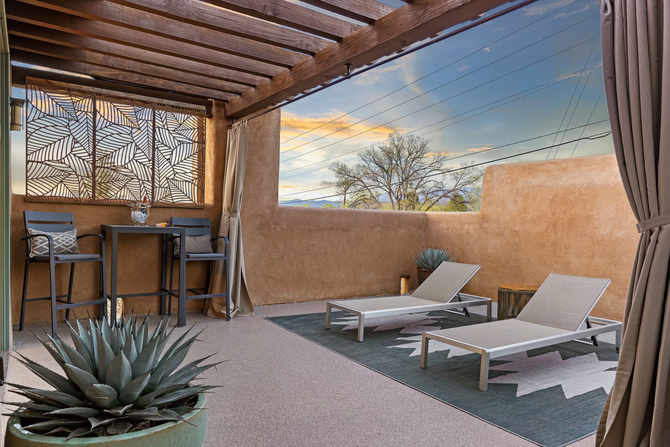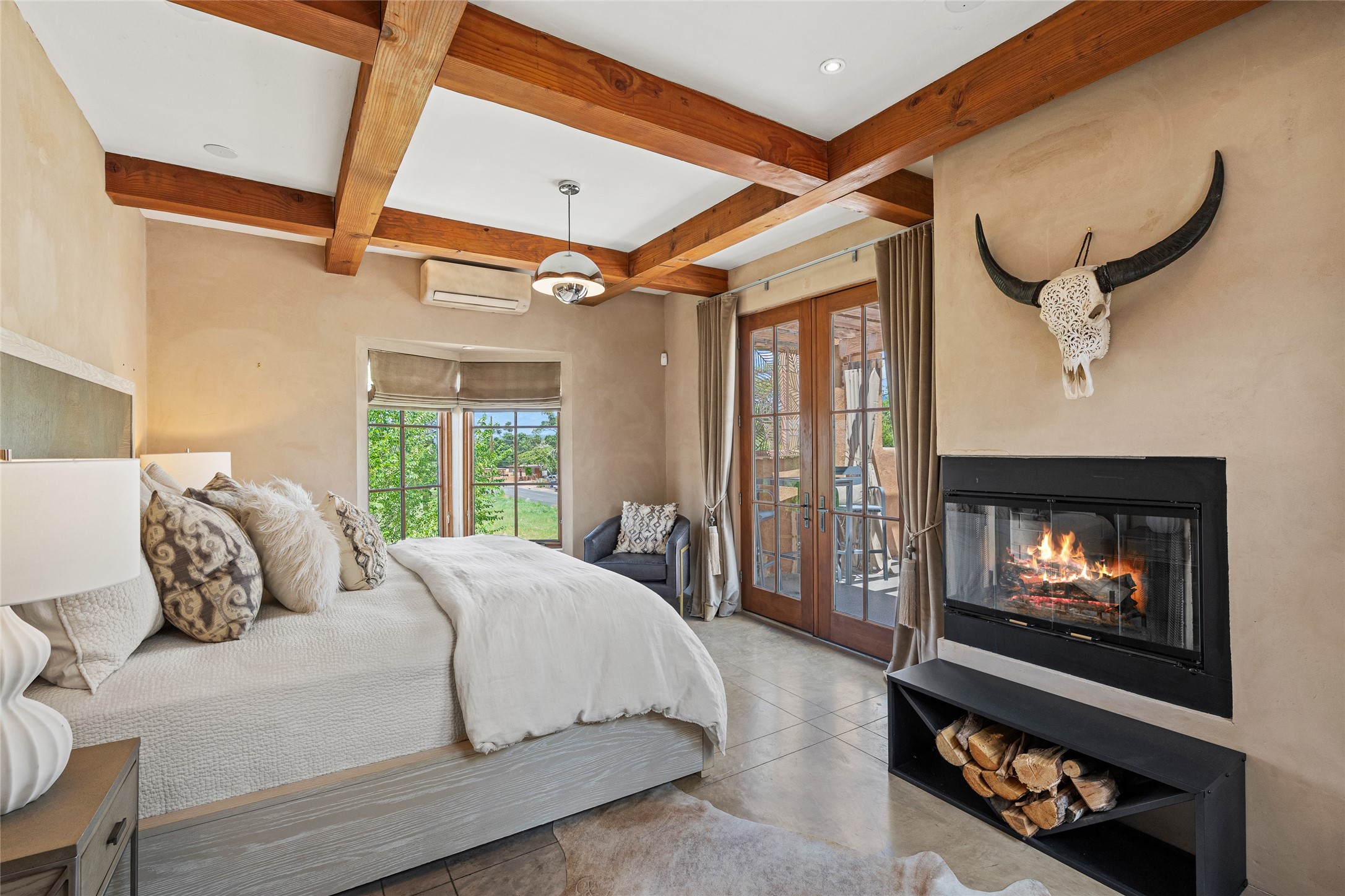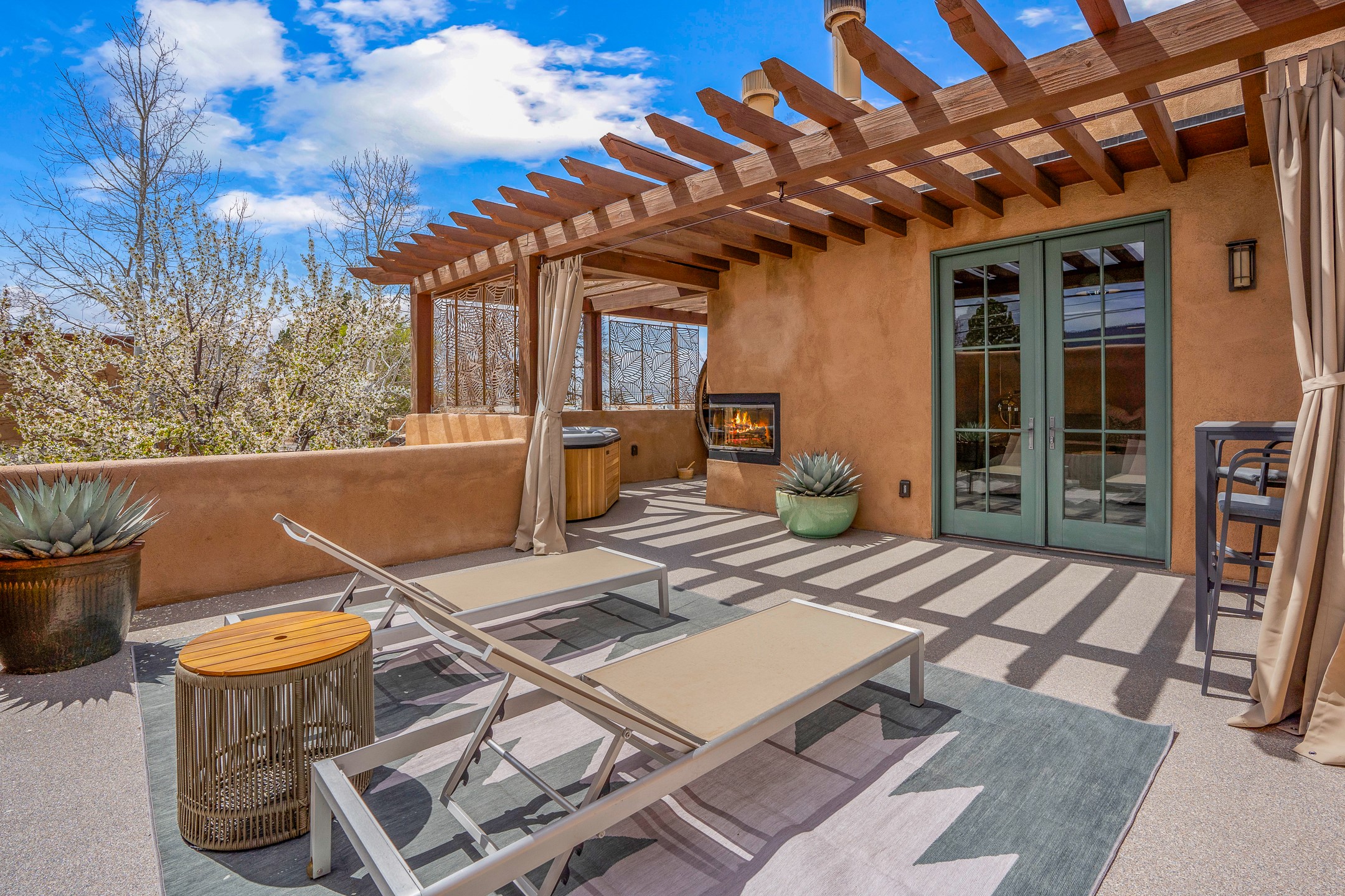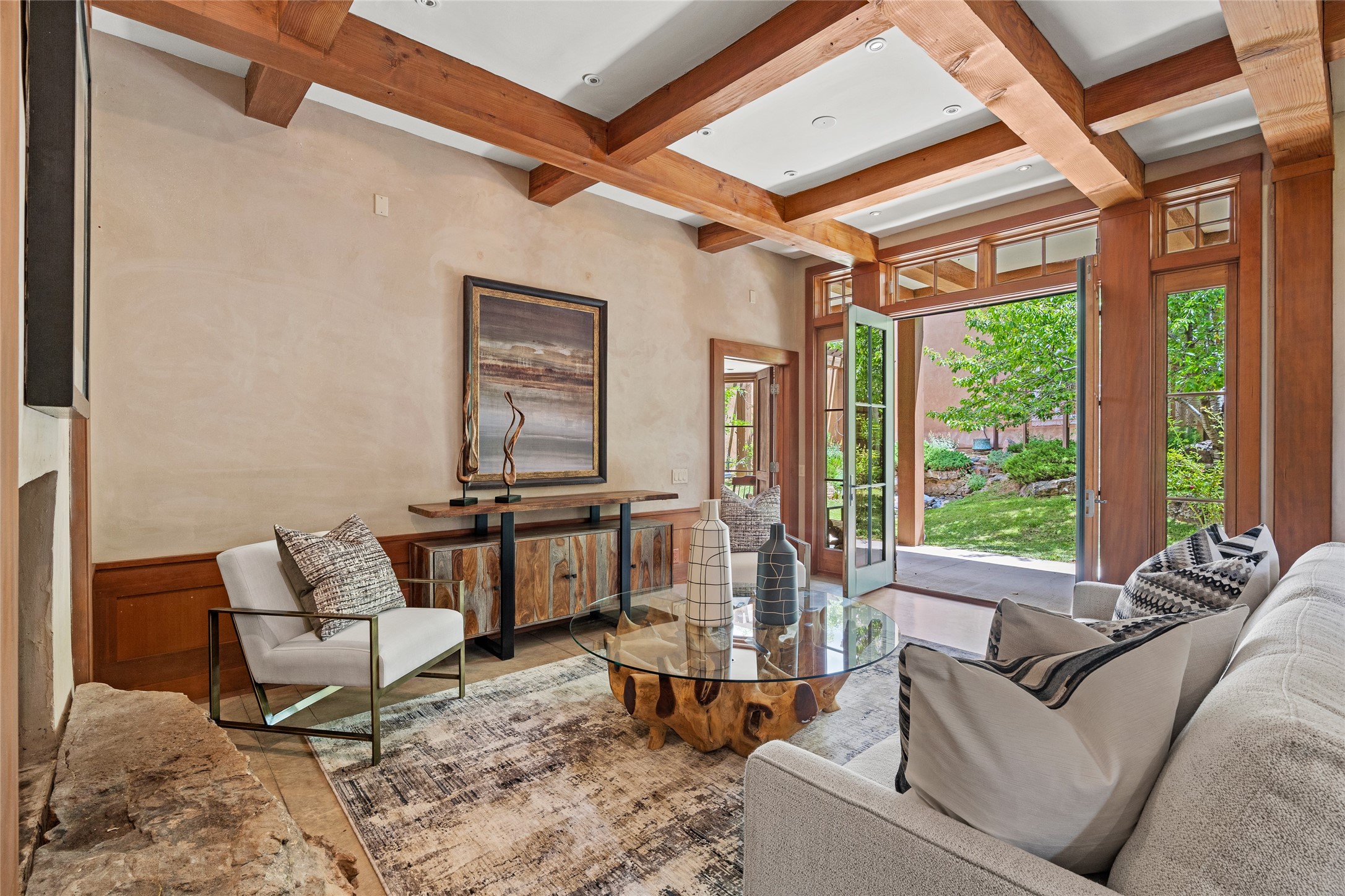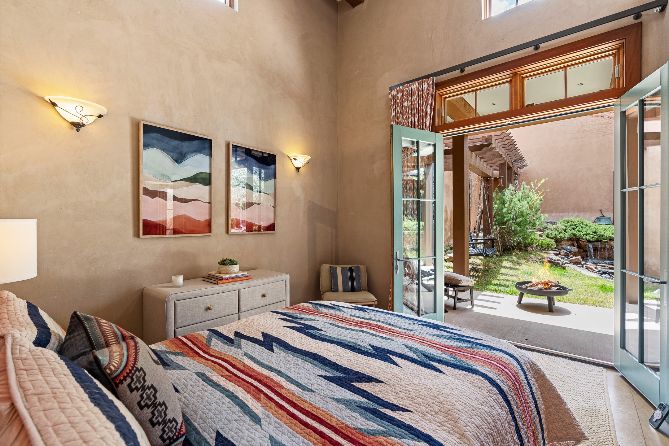 A rare and refined offering in the heart of Santa Fe, this extraordinary 6-bedroom, 6-bath gated compound is a seamless blend of architectural brilliance, design sophistication, and functional versatility. Encompassing two distinctive yet complementary residences, this private estate is nestled in the coveted South Capitol and Eastside neighborhoods--just moments from the Plaza, Canyon Road, museums, and Santa Fe's world-class dining and shopping.The main residence is a serene 4-bedroom, 4-bath sanctuary where timeless elegance meets exceptional craftsmanship. Soaring ceilings, natural American Clay plaster walls, and Douglas Fir coffered wood beam ceilings enhance the grand interiors, while floor-to-ceiling transom windows invite in abundant light. The stunning chef's kitchen--complete with Subzero refrigerator and new Viking appliances--opens to a beautifully landscaped central courtyard with a tranquil waterfall fountain, lush gardens, alfresco dining areas, and multiple verandas perfect for entertaining.The gracious living and dining rooms are anchored by a natural stone fireplace and expansive glass doors overlooking a verdant courtyard adorned with mature Wisteria, Aspen, and Cherry trees. Upstairs, the luxurious primary suite features breathtaking views of Picacho Peak, a spa-like bathroom with Jacuzzi tub, steam shower, and private rooftop terrace with fireplace, cedar hot tub, sauna, and wrap-around deck.The adjacent property, designed by an architect for both residential and commercial use, adds a flexible 2-3 bedroom, 2-bath layout ideal for live/work functionality, a creative studio, or income-generating rental. It features 12-foot ceilings, expansive windows, radiant in-floor heating, mini split A/C systems, a modern kitchen with polished granite countertops, and a spacious open-concept living area.Together, these two properties form a unique and cohesive compound with separate utility metering, multiple private entrances, 2.5-car garage plus two additional parking spaces, and the rare opportunity to live, work, and entertain in one of Santa Fe's most desirable locations. Whether as a private estate, multi-generational retreat, or mixed-use investment, this compound is a true Santa Fe masterpiece.These properties may be purchased together as a compound or separately. For individual details, please see listing MLS# 202501407 and MLS# 202501401.