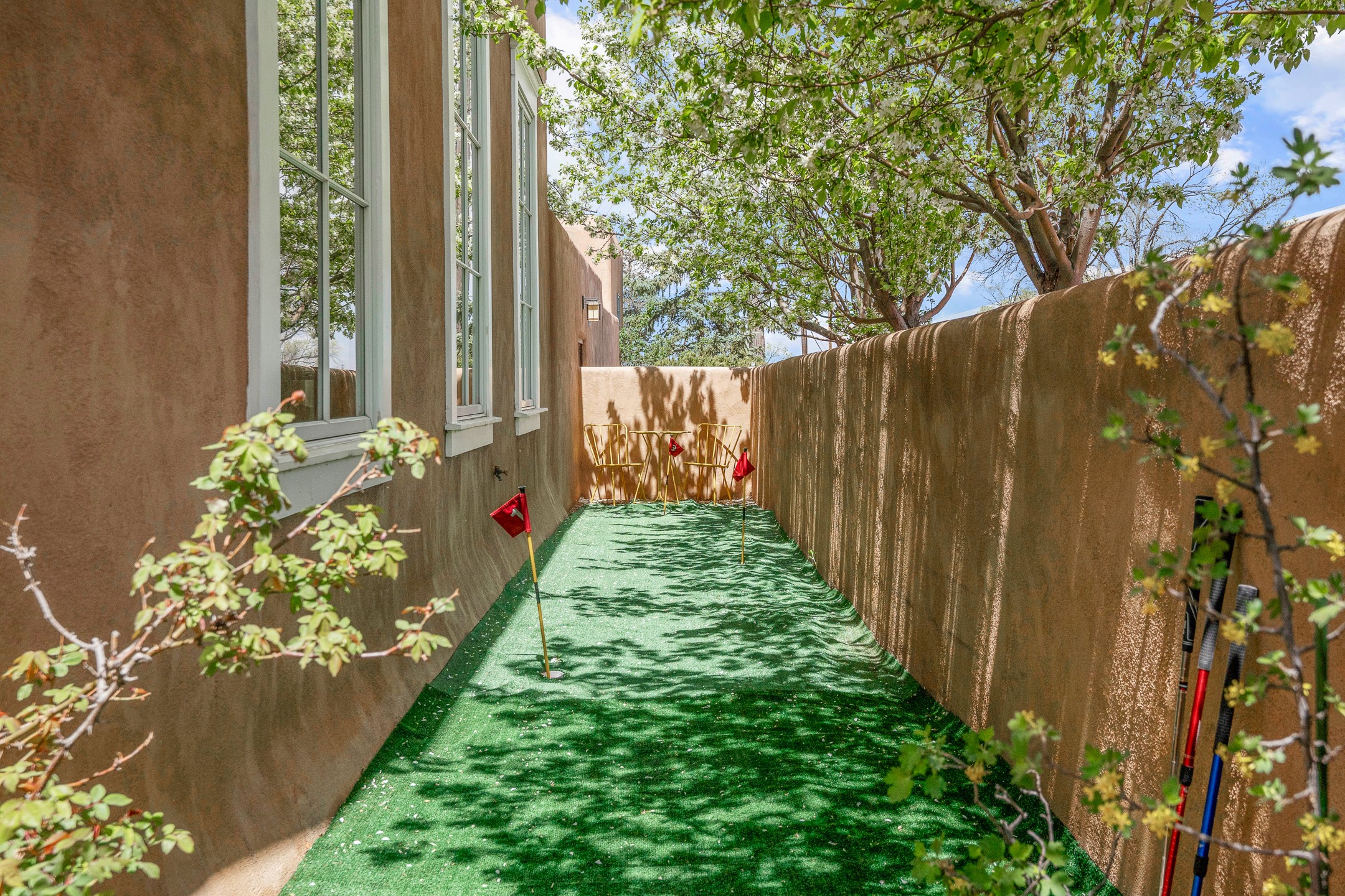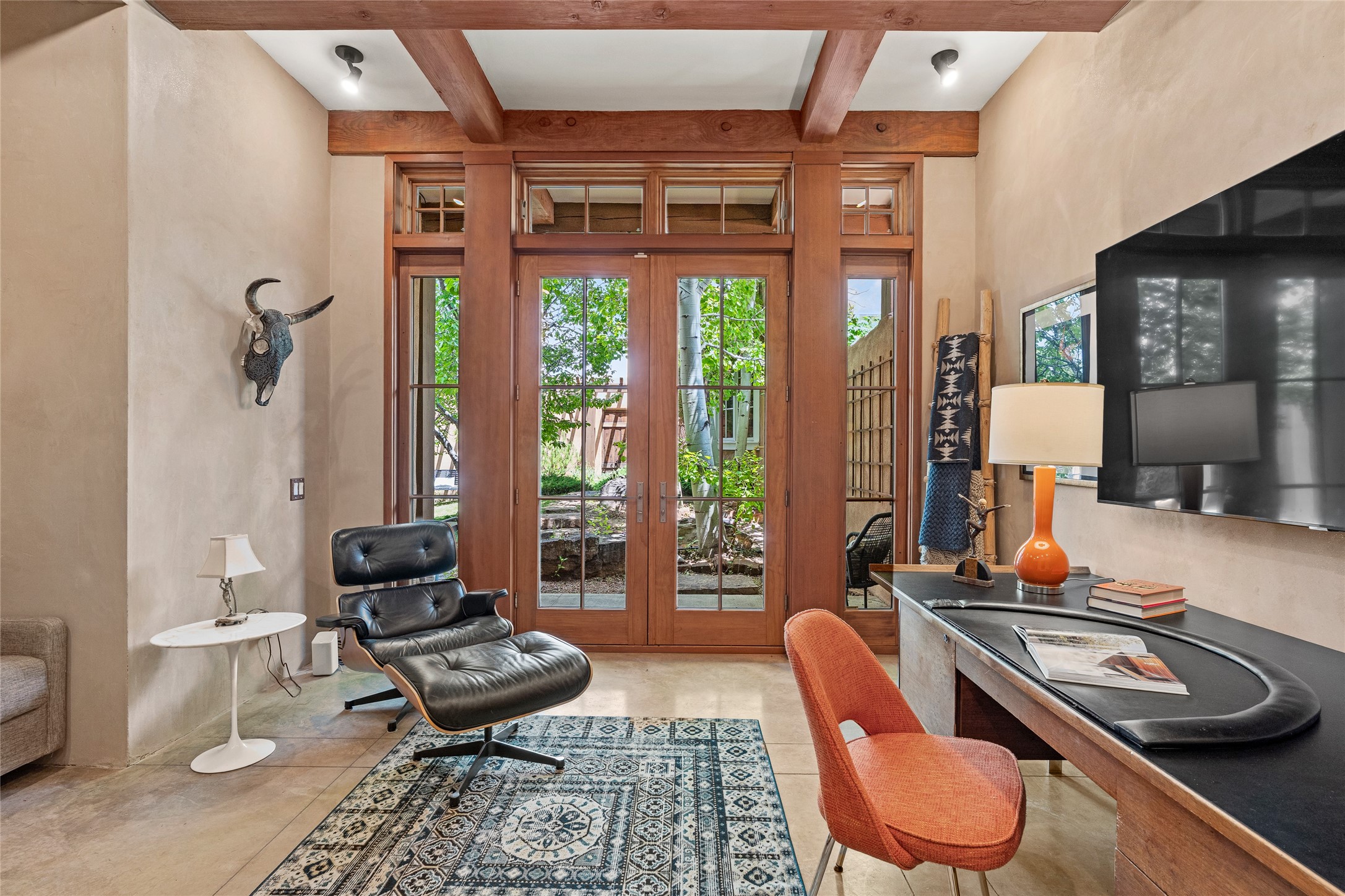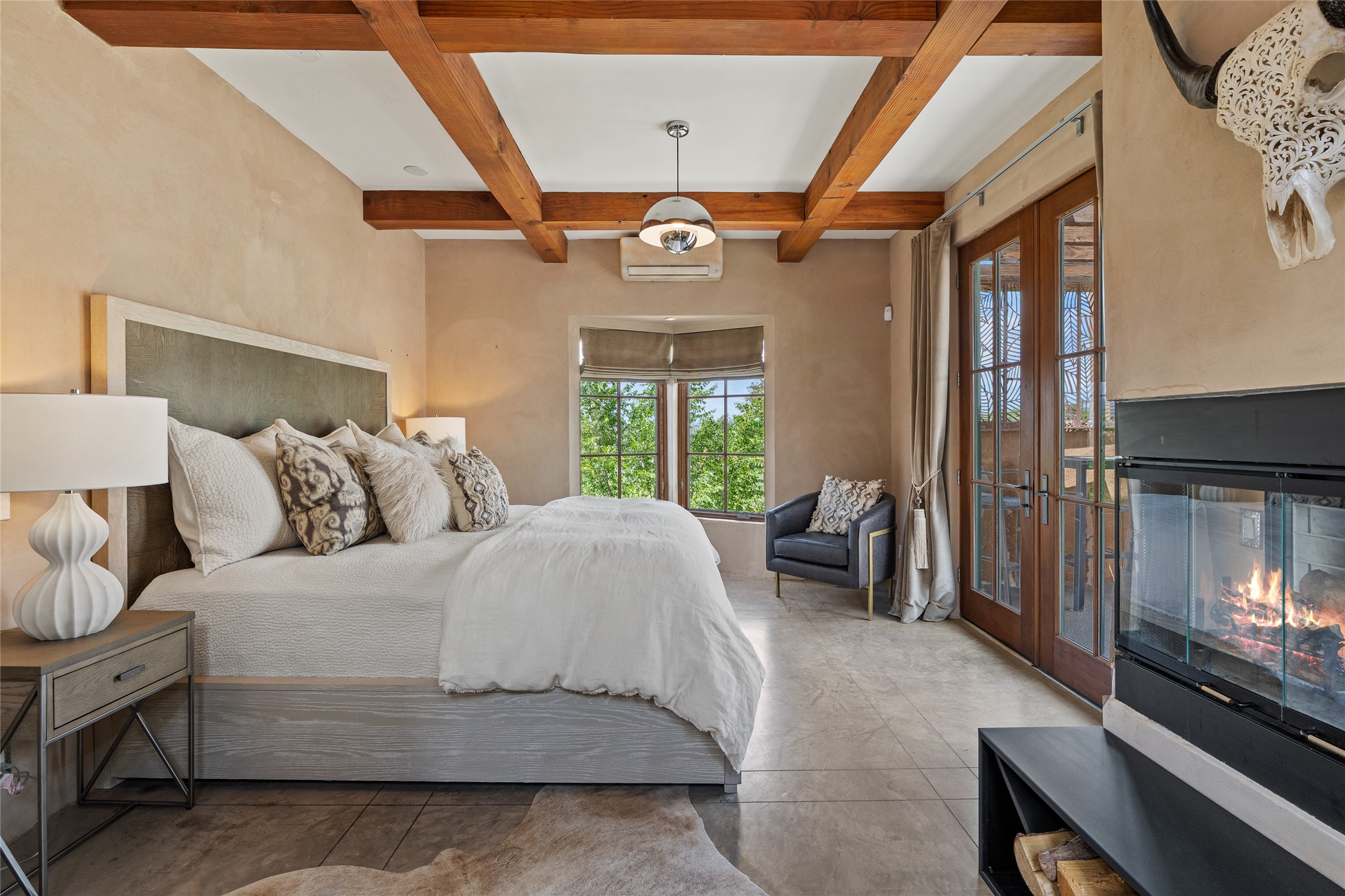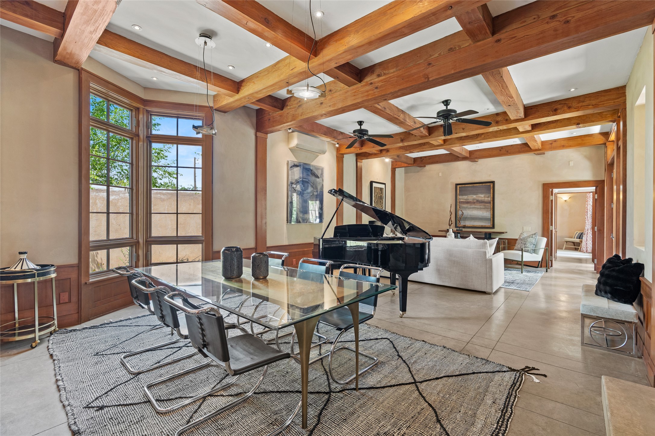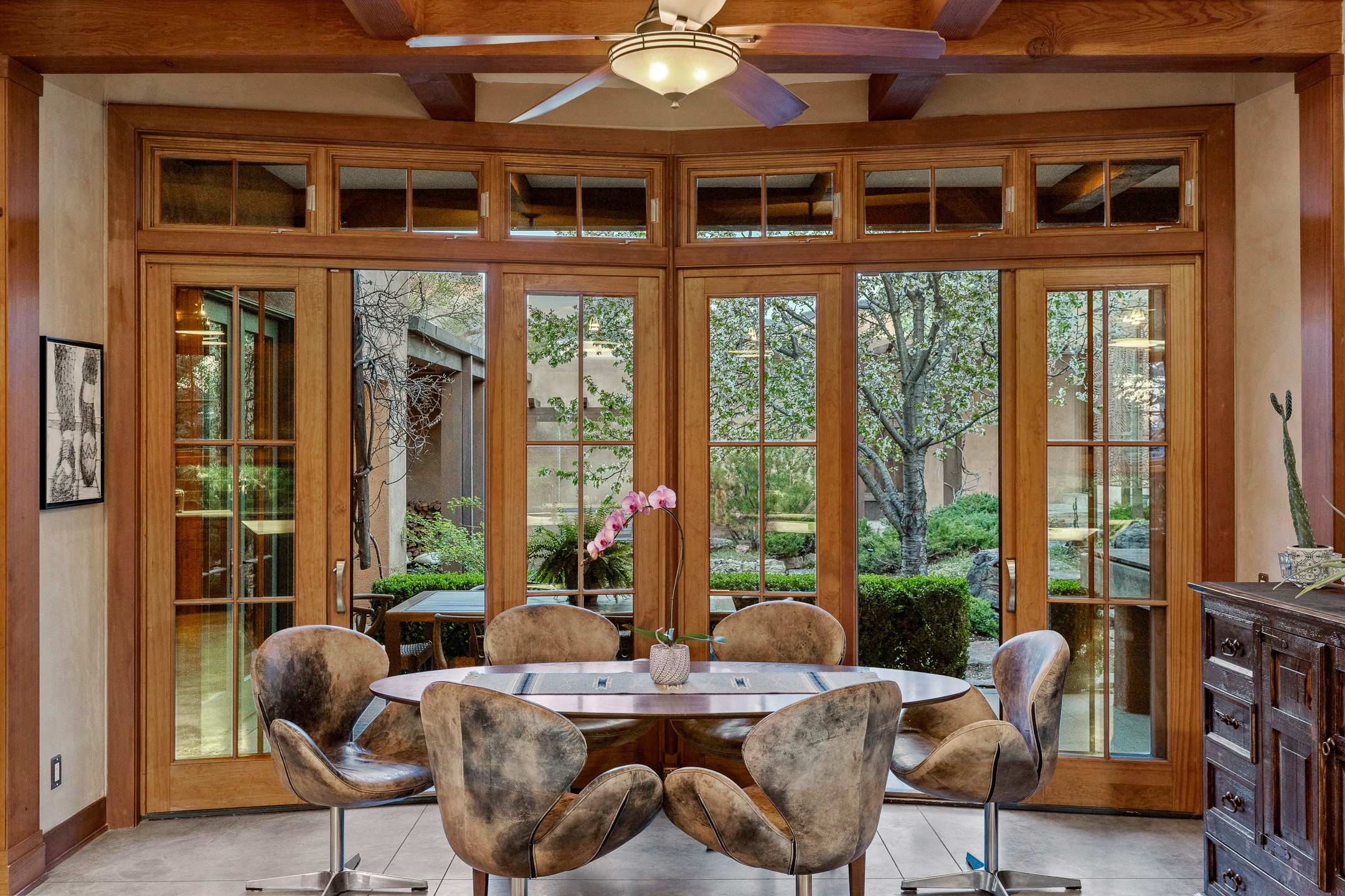 A rare and refined offering in the heart of Santa Fe, this extraordinary 6-bedroom, 6-bath gated compound is a seamless blend of architectural brilliance, design sophistication, and functional versatility. Encompassing two distinctive yet complementary residences, this private estate is nestled in the coveted South Capitol and Eastside neighborhoods--just moments from the Plaza, Canyon Road, museums, and Santa Fe's world-class dining and shopping.The main residence is a serene 4-bedroom, 4-bath sanctuary where timeless elegance meets exceptional craftsmanship. Soaring ceilings, natural American Clay plaster walls, and Douglas Fir coffered wood beam ceilings enhance the grand interiors, while floor-to-ceiling transom windows invite in abundant light. The stunning chef's kitchen--complete with Subzero refrigerator and new Viking appliances--opens to a beautifully landscaped central courtyard with a tranquil waterfall fountain, lush gardens, alfresco dining areas, and multiple verandas perfect for entertaining.The gracious living and dining rooms are anchored by a natural stone fireplace and expansive glass doors overlooking a verdant courtyard adorned with mature Wisteria, Aspen, and Cherry trees. Upstairs, the luxurious primary suite features breathtaking views of Picacho Peak, a spa-like bathroom with Jacuzzi tub, steam shower, and private rooftop terrace with fireplace, cedar hot tub, sauna, and wrap-around deck.The adjacent property, designed by an architect for both residential and commercial use, adds a flexible 2-3 bedroom, 2-bath layout ideal for live/work functionality, a creative studio, or income-generating rental. It features 12-foot ceilings, expansive windows, radiant in-floor heating, mini split A/C systems, a modern kitchen with polished granite countertops, and a spacious open-concept living area.Together, these two properties form a unique and cohesive compound with separate utility metering, multiple private entrances, 2.5-car garage plus two additional parking spaces, and the rare opportunity to live, work, and entertain in one of Santa Fe's most desirable locations. Whether as a private estate, multi-generational retreat, or mixed-use investment, this compound is a true Santa Fe masterpiece.These properties may be purchased together as a compound or separately. For individual details, please see listing MLS# 202501407 and MLS# 202501401.