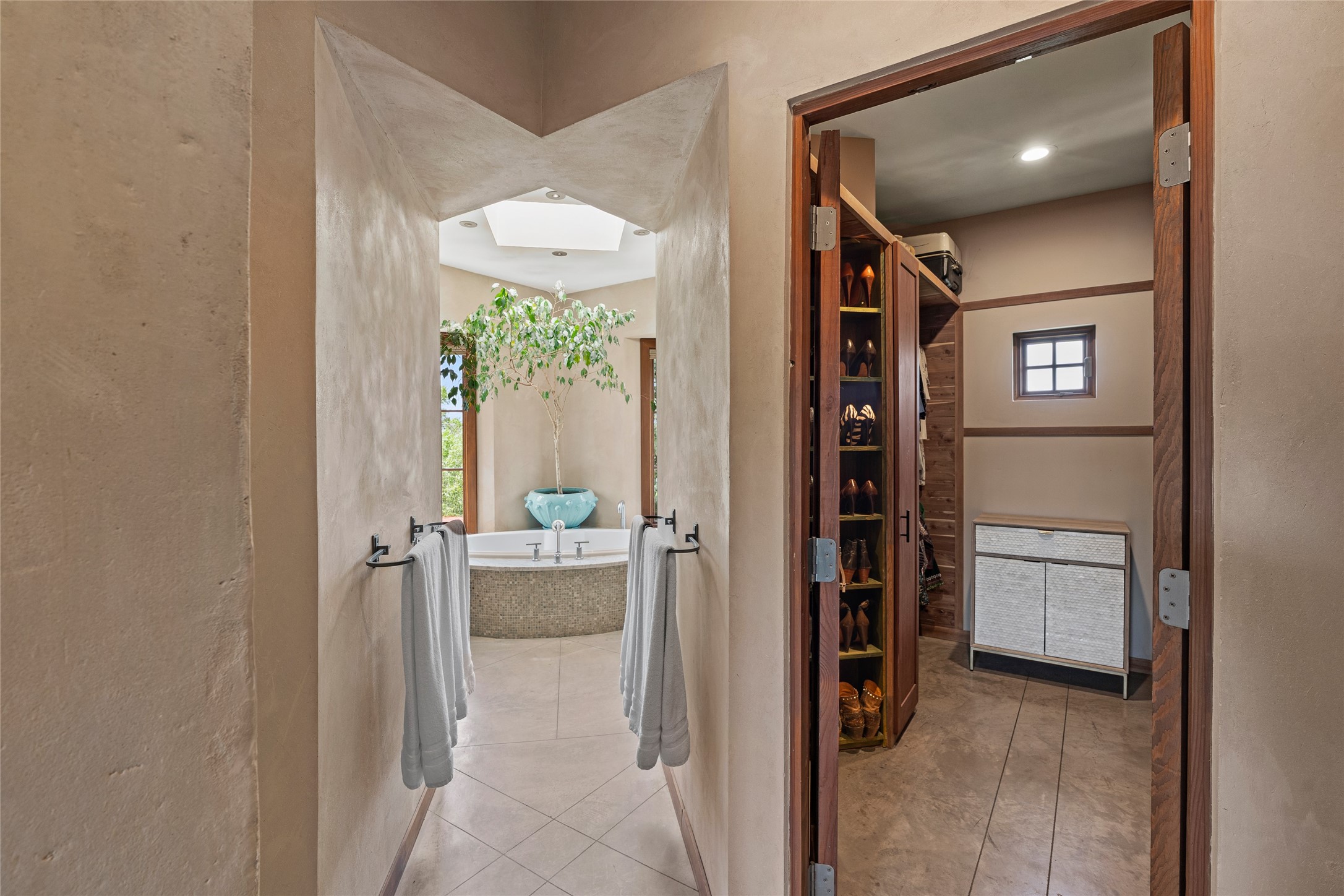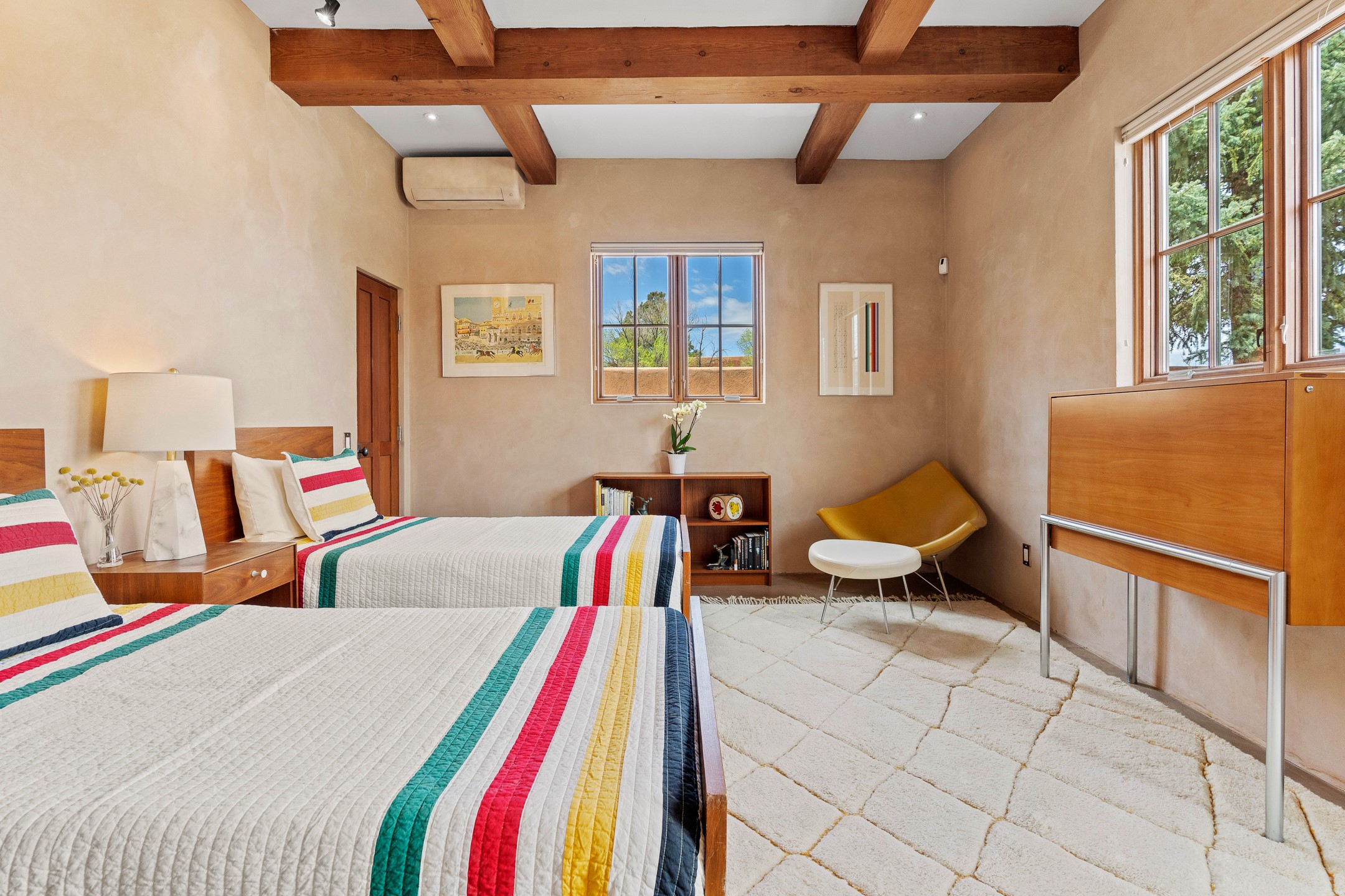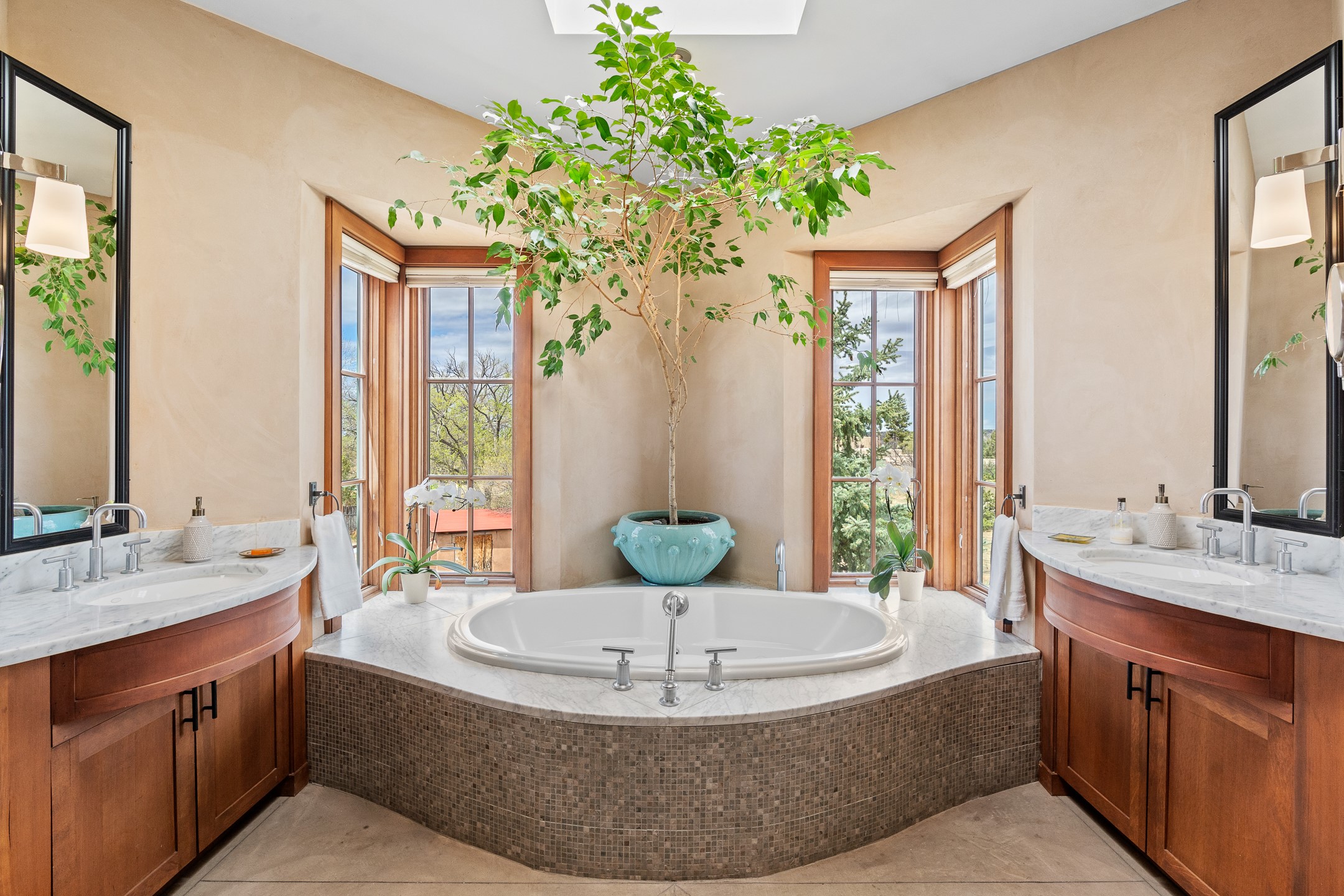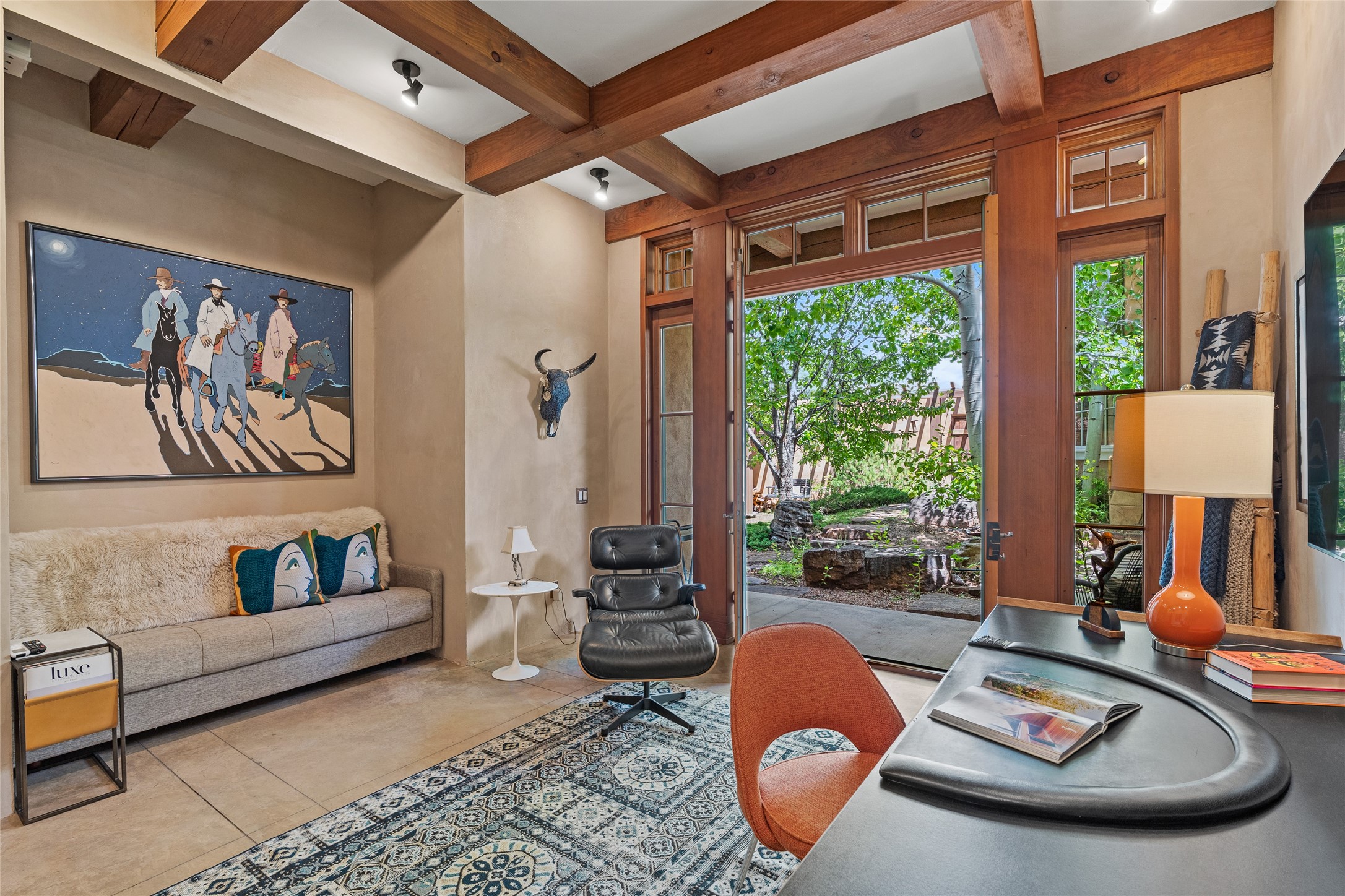A rare and refined offering in the heart of Santa Fe, this extraordinary 6-bedroom, 6-bath gated compound is a seamless blend of architectural brilliance, design sophistication, and functional versatility. Encompassing two distinctive yet complementary residences, this private estate is nestled in the coveted South Capitol and Eastside neighborhoods--just moments from the Plaza, Canyon Road, museums, and Santa Fe's world-class dining and shopping.The main residence is a serene 4-bedroom, 4-bath sanctuary where timeless elegance meets exceptional craftsmanship. Soaring ceilings, natural American Clay plaster walls, and Douglas Fir coffered wood beam ceilings enhance the grand interiors, while floor-to-ceiling transom windows invite in abundant light. The stunning chef's kitchen--complete with Subzero refrigerator and new Viking appliances--opens to a beautifully landscaped central courtyard with a tranquil waterfall fountain, lush gardens, alfresco dining areas, and multiple verandas perfect for entertaining.The gracious living and dining rooms are anchored by a natural stone fireplace and expansive glass doors overlooking a verdant courtyard adorned with mature Wisteria, Aspen, and Cherry trees. Upstairs, the luxurious primary suite features breathtaking views of Picacho Peak, a spa-like bathroom with Jacuzzi tub, steam shower, and private rooftop terrace with fireplace, cedar hot tub, sauna, and wrap-around deck.The adjacent property, designed by an architect for both residential and commercial use, adds a flexible 2-3 bedroom, 2-bath layout ideal for live/work functionality, a creative studio, or income-generating rental. It features 12-foot ceilings, expansive windows, radiant in-floor heating, mini split A/C systems, a modern kitchen with polished granite countertops, and a spacious open-concept living area.Together, these two properties form a unique and cohesive compound with separate utility metering, multiple private entrances, 2.5-car garage plus two additional parking spaces, and the rare opportunity to live, work, and entertain in one of Santa Fe's most desirable locations. Whether as a private estate, multi-generational retreat, or mixed-use investment, this compound is a true Santa Fe masterpiece.These properties may be purchased together as a compound or separately. For individual details, please see listing MLS# 202501407 and MLS# 202501401.