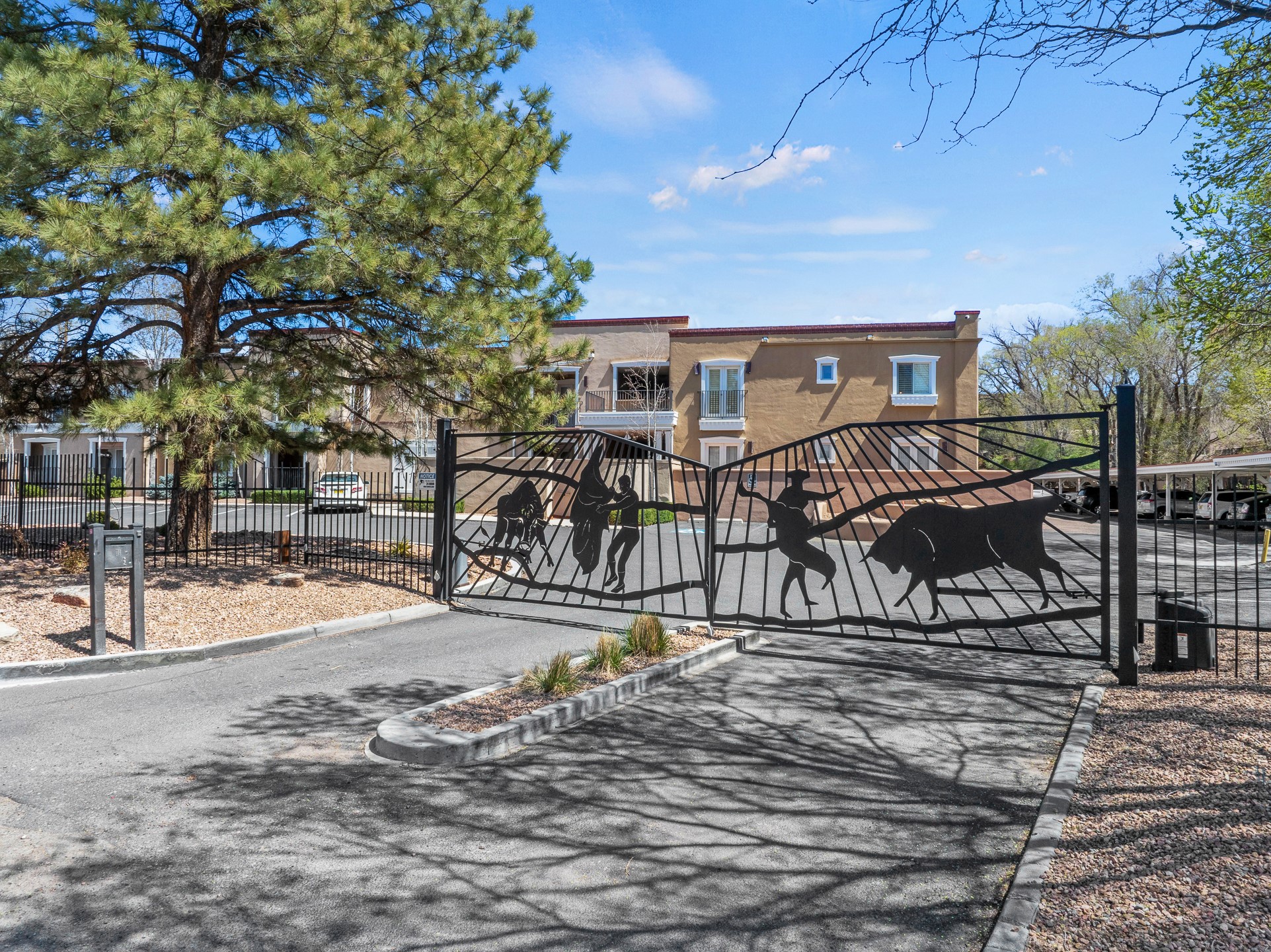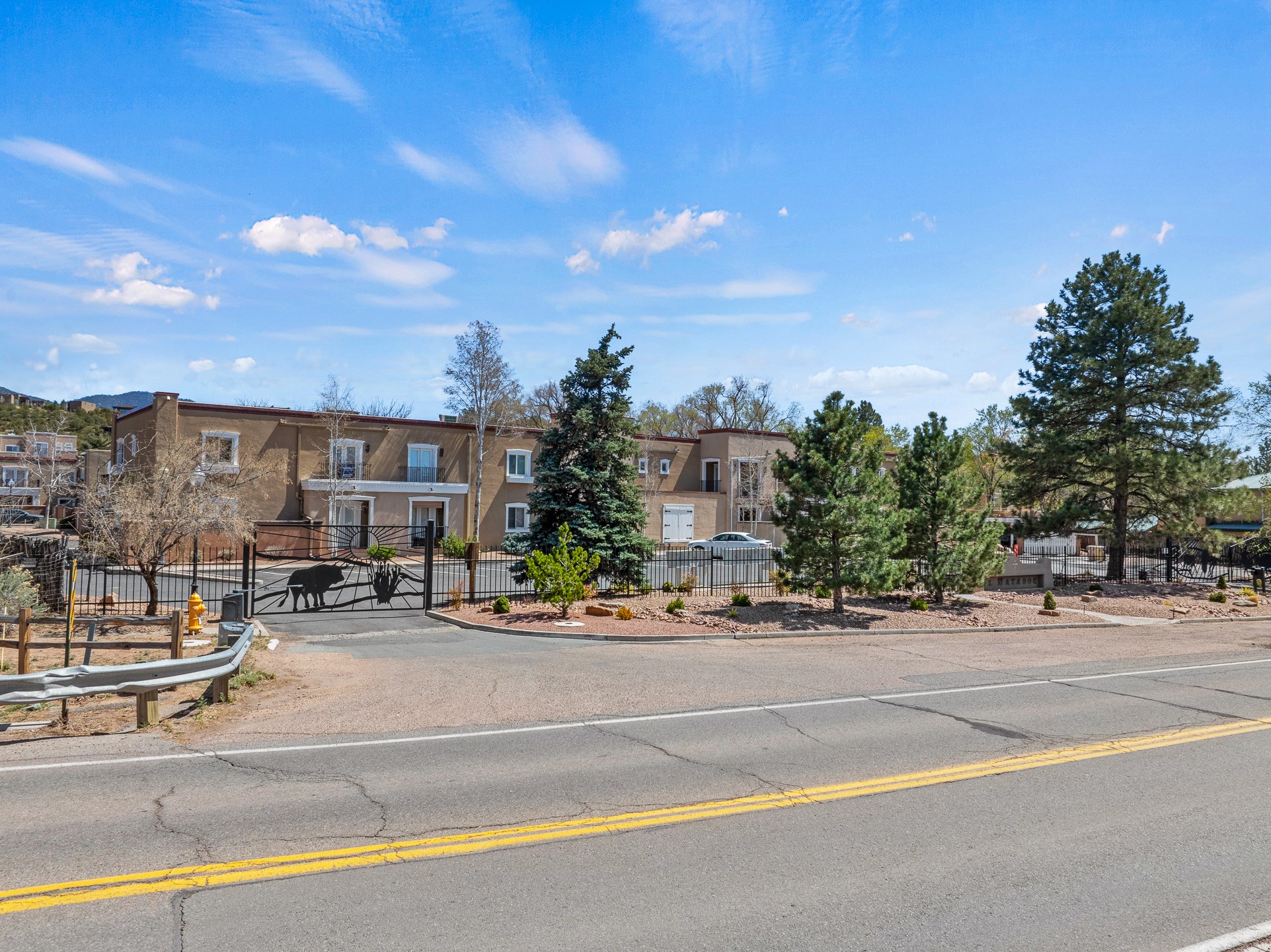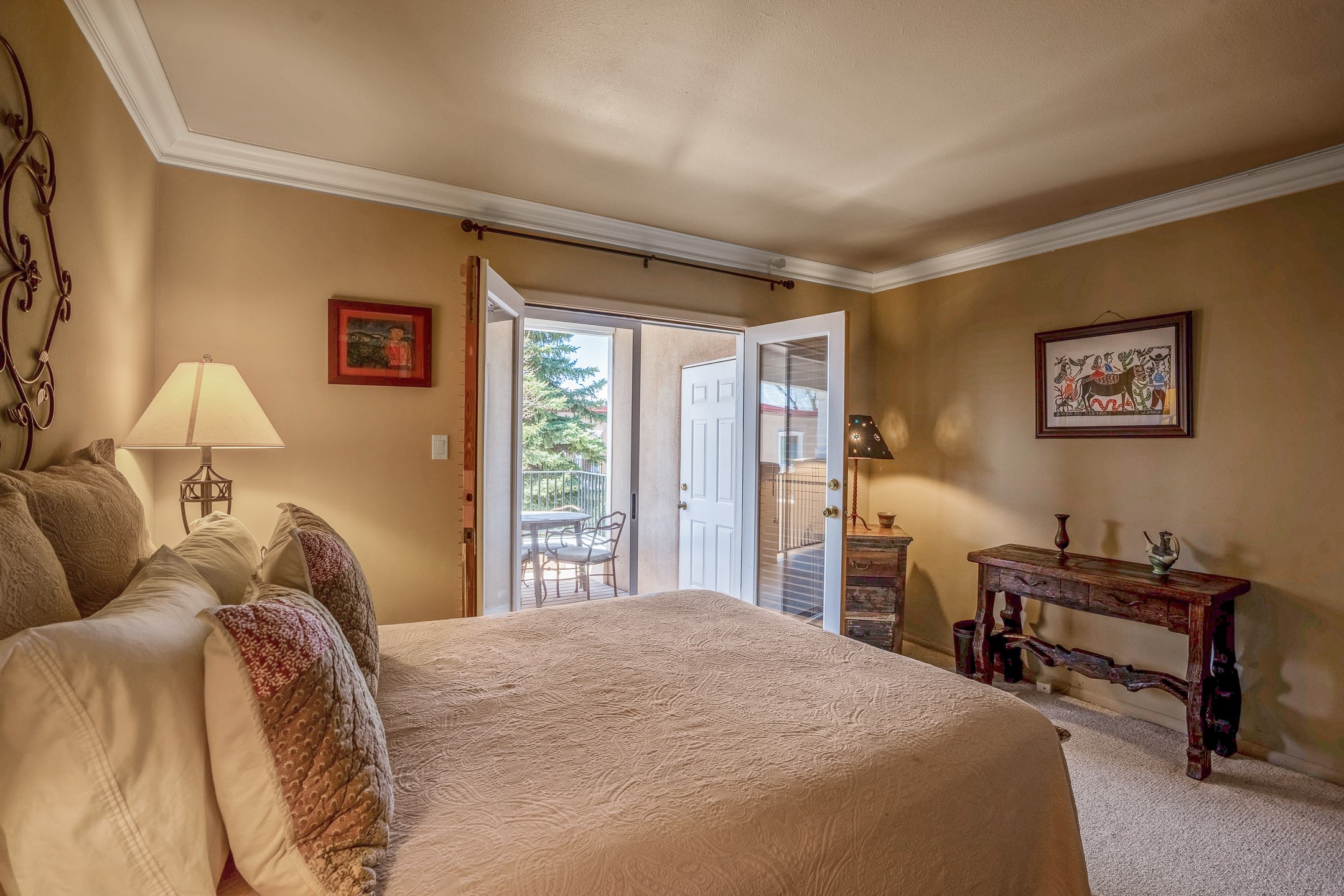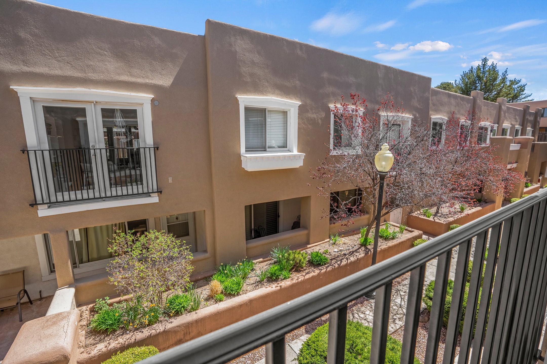 This second-floor condo has a warm and bright interior and offers a very spacious feel. The front patio is generously sized and can be accessed from the living room and the bedroom through 2 sets of French doors. This gated community is ideally located just a few blocks north of the downtown plaza, and across the street from the Fort Marcy Sports Complex, which offers a large park, pickle ball courts, a workout facility and indoor pool. The El Matador Condominiums feature a gated entrance and a beautiful and lush interior courtyard. There is one reserved space in the carport, and several guest parking spots. The condo has refrigerated central air-conditioning and forced-air heat, and a gas fireplace. Ideal for investors, and as a part-time home. Some furnishings included with sale at no additional cost. Washer/dryer in condo. Storage locker located off front patio area.