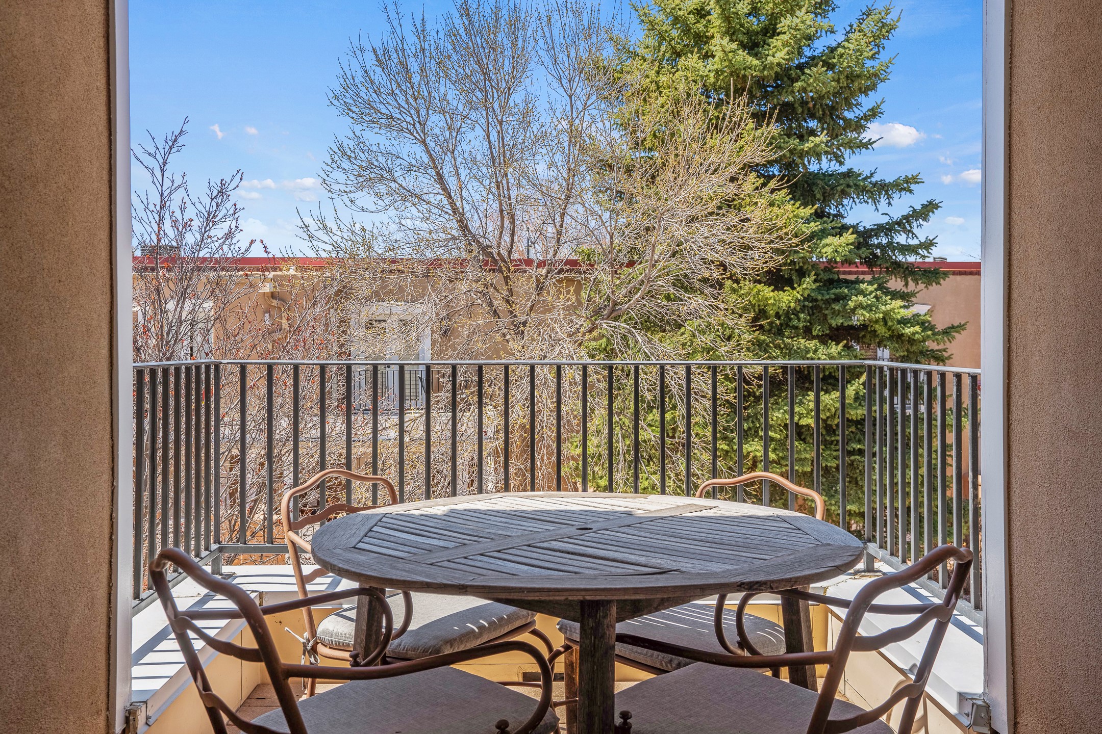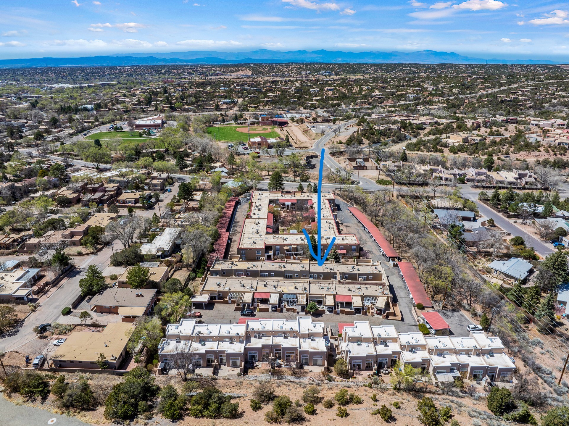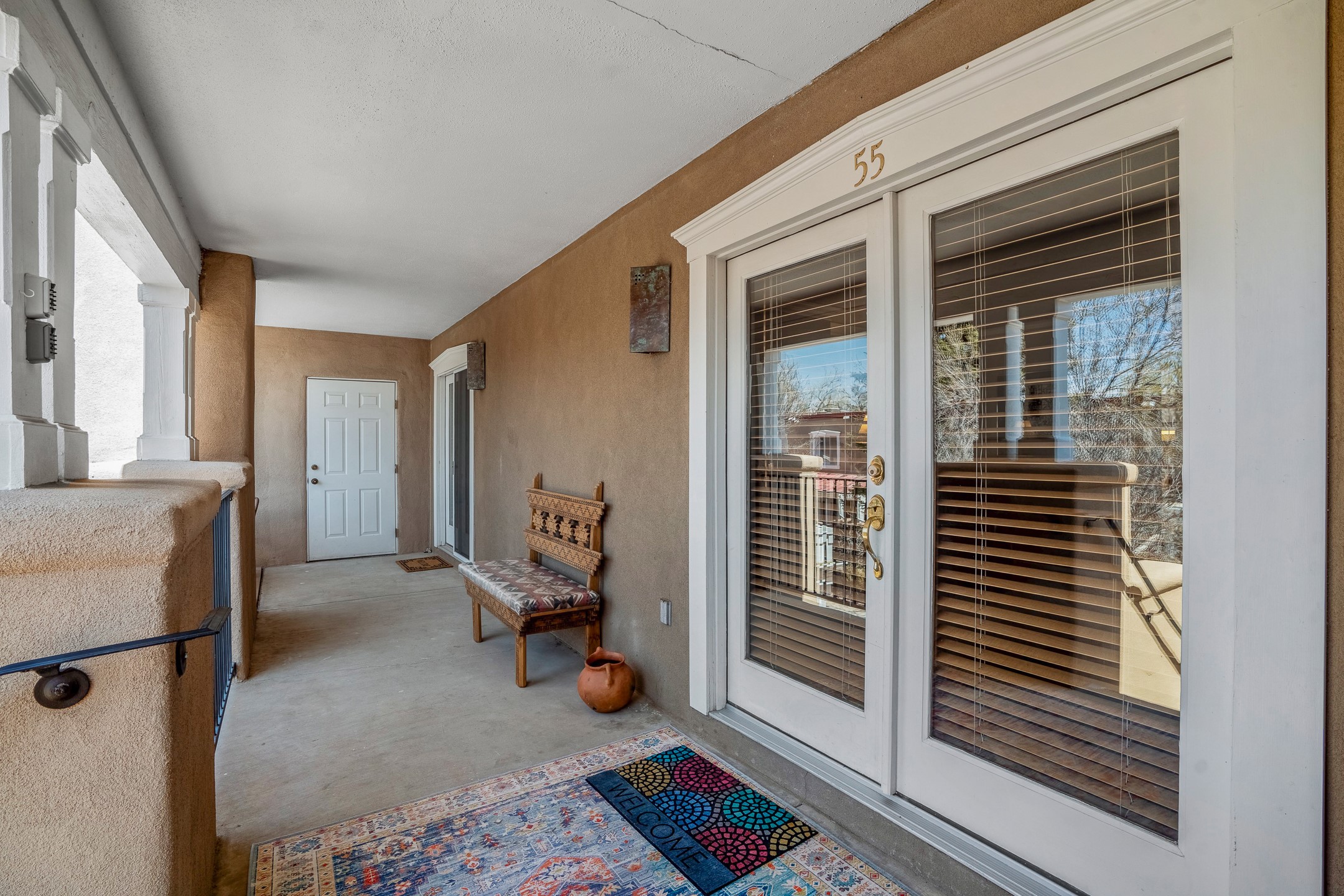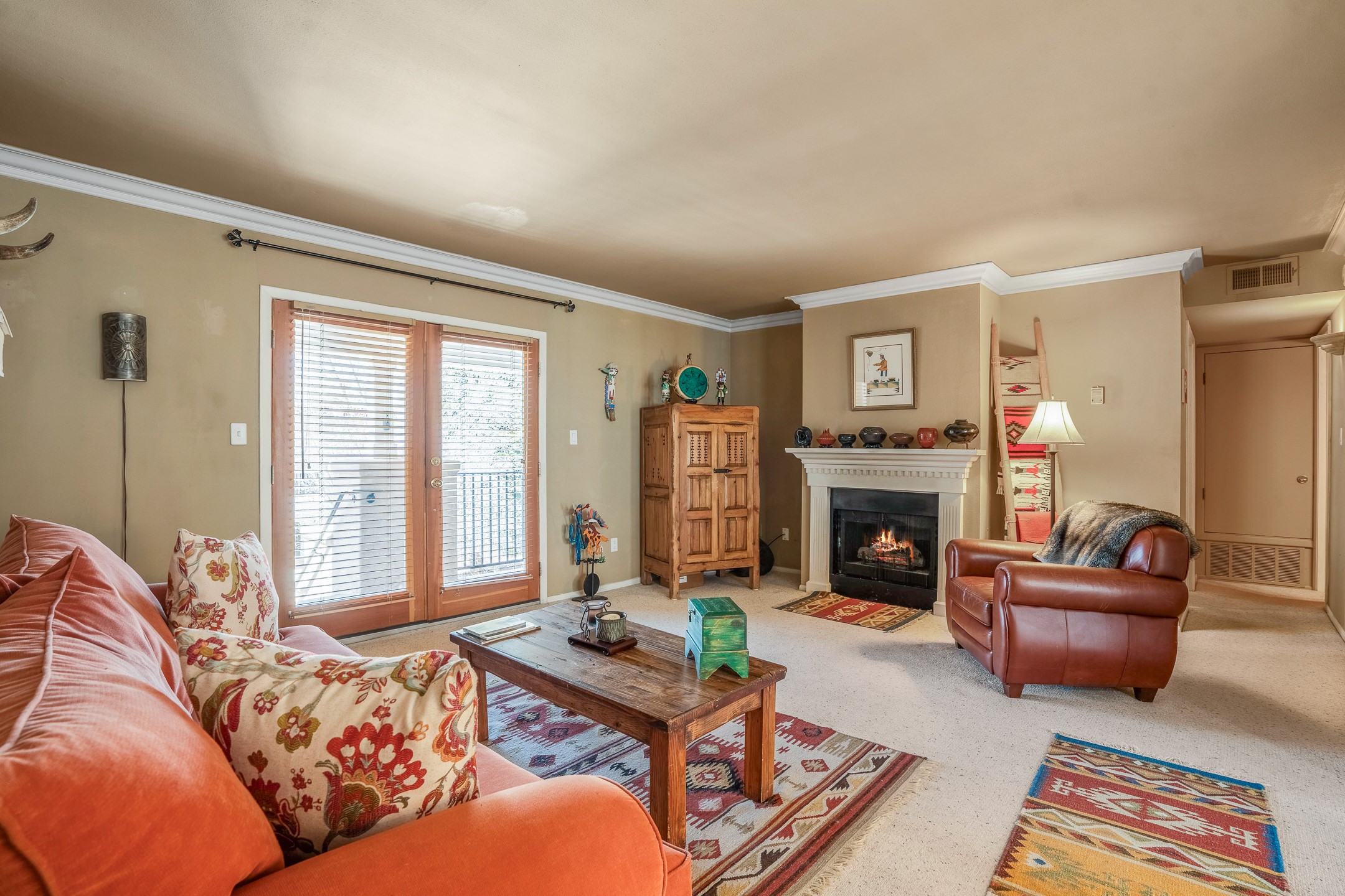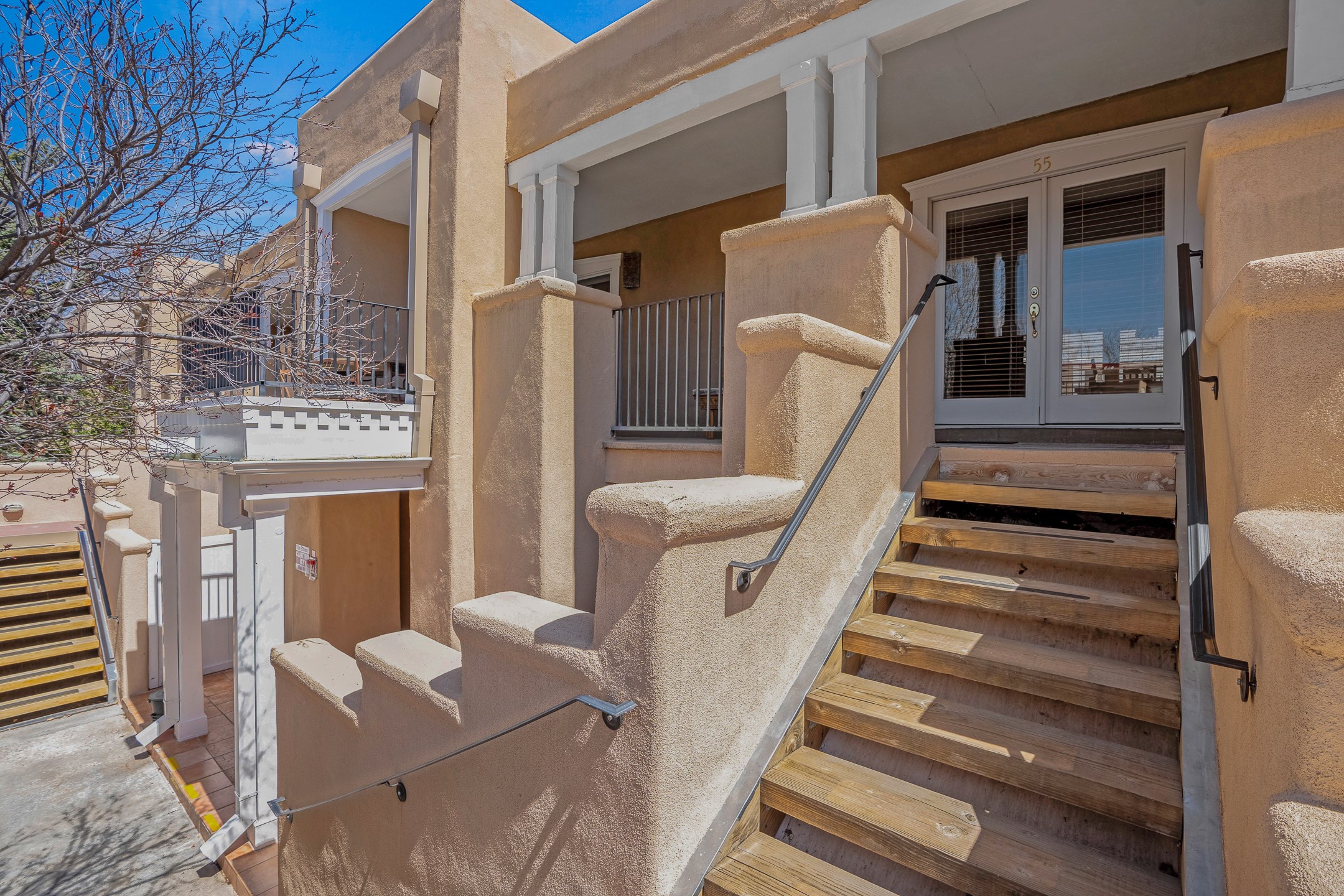 This second-floor condo has a warm and bright interior and offers a very spacious feel. The front patio is generously sized and can be accessed from the living room and the bedroom through 2 sets of French doors. This gated community is ideally located just a few blocks north of the downtown plaza, and across the street from the Fort Marcy Sports Complex, which offers a large park, pickle ball courts, a workout facility and indoor pool. The El Matador Condominiums feature a gated entrance and a beautiful and lush interior courtyard. There is one reserved space in the carport, and several guest parking spots. The condo has refrigerated central air-conditioning and forced-air heat, and a gas fireplace. Ideal for investors, and as a part-time home. Some furnishings included with sale at no additional cost. Washer/dryer in condo. Storage locker located off front patio area.