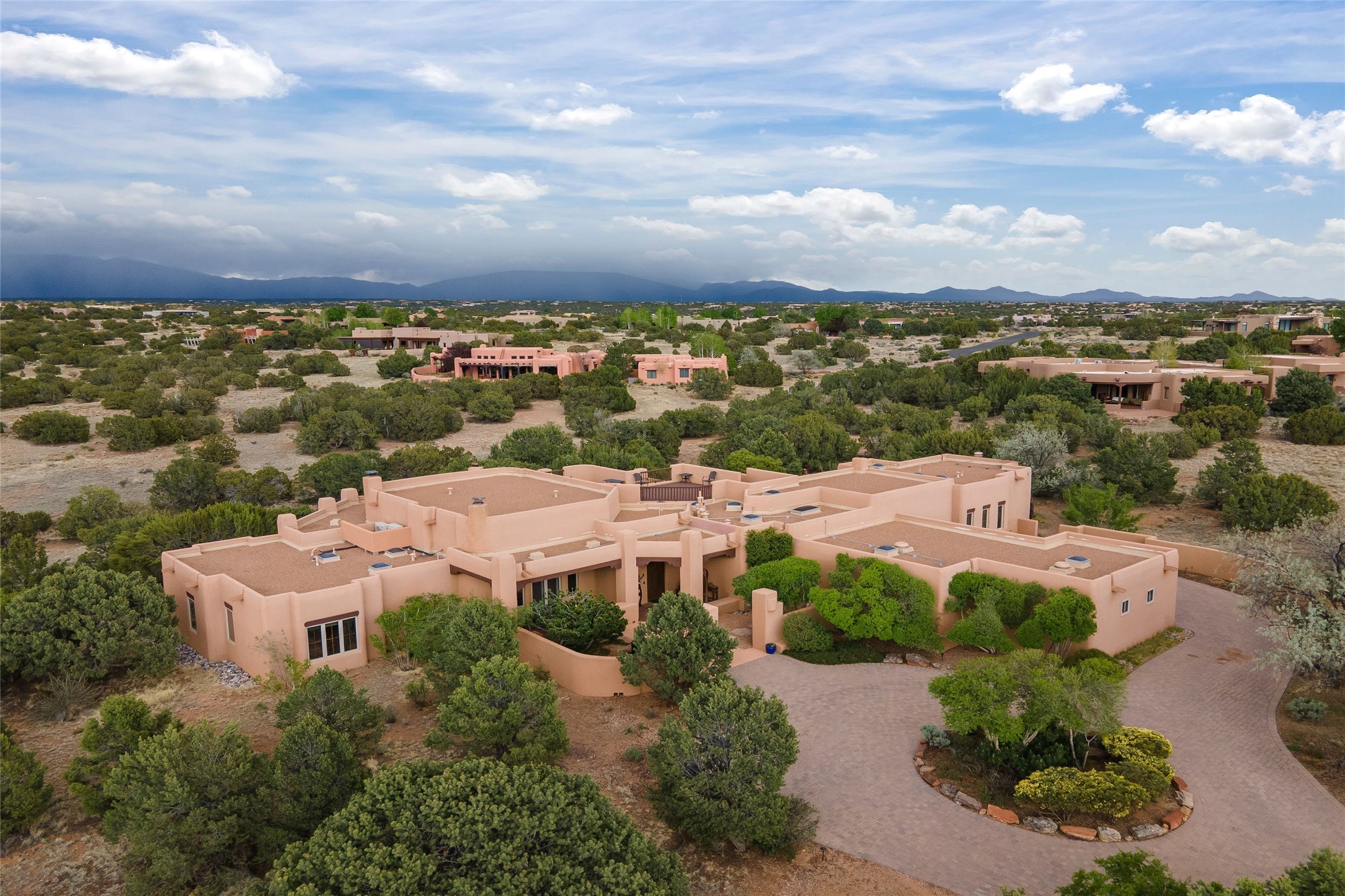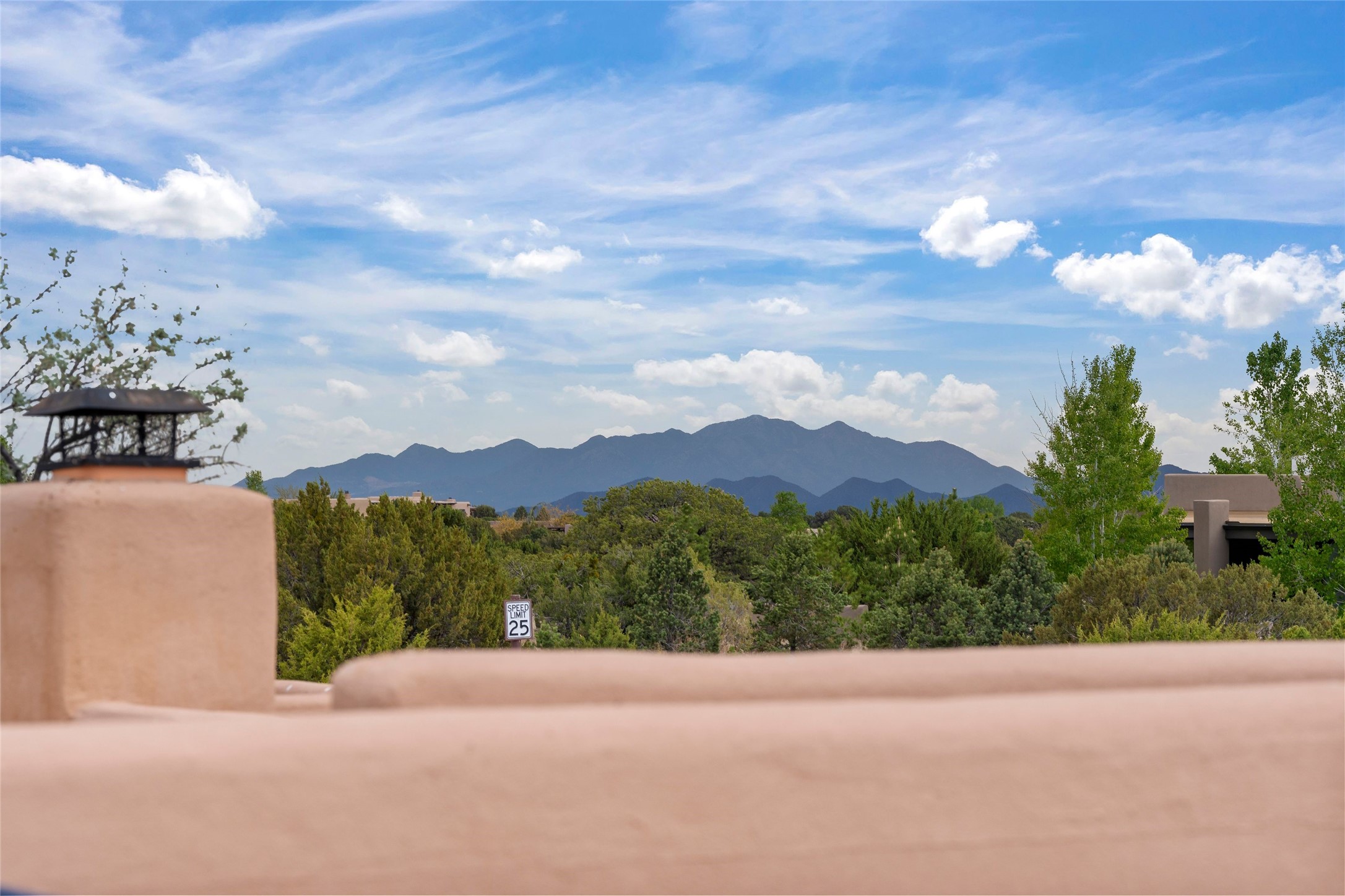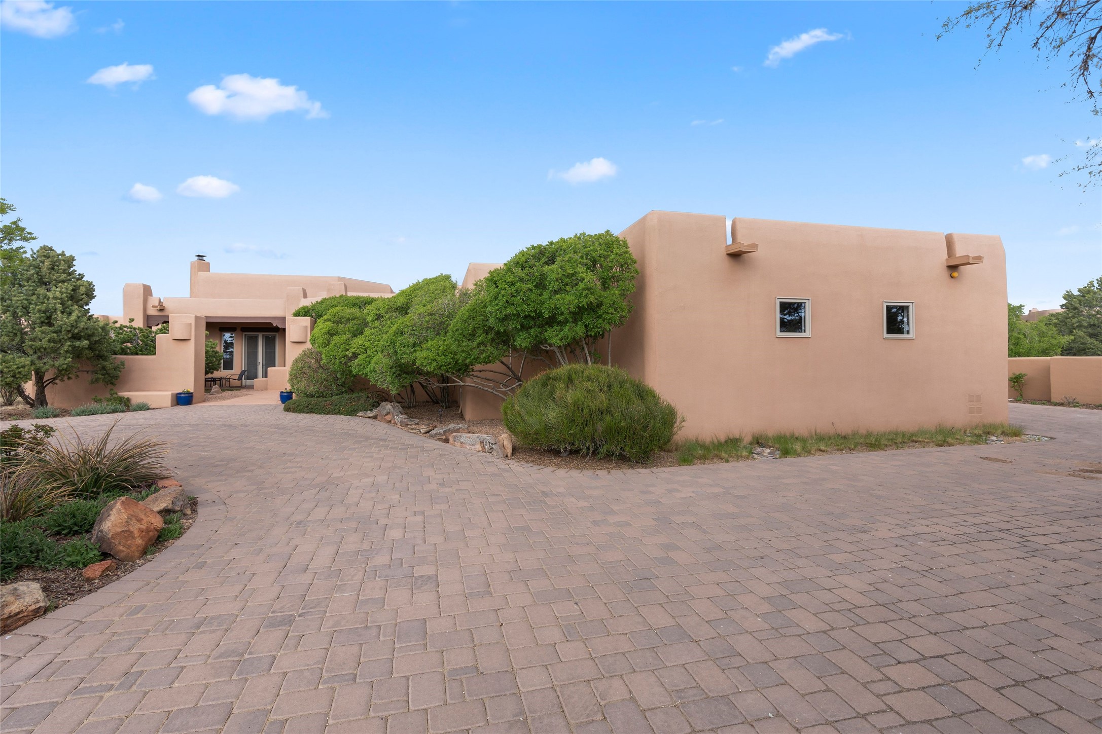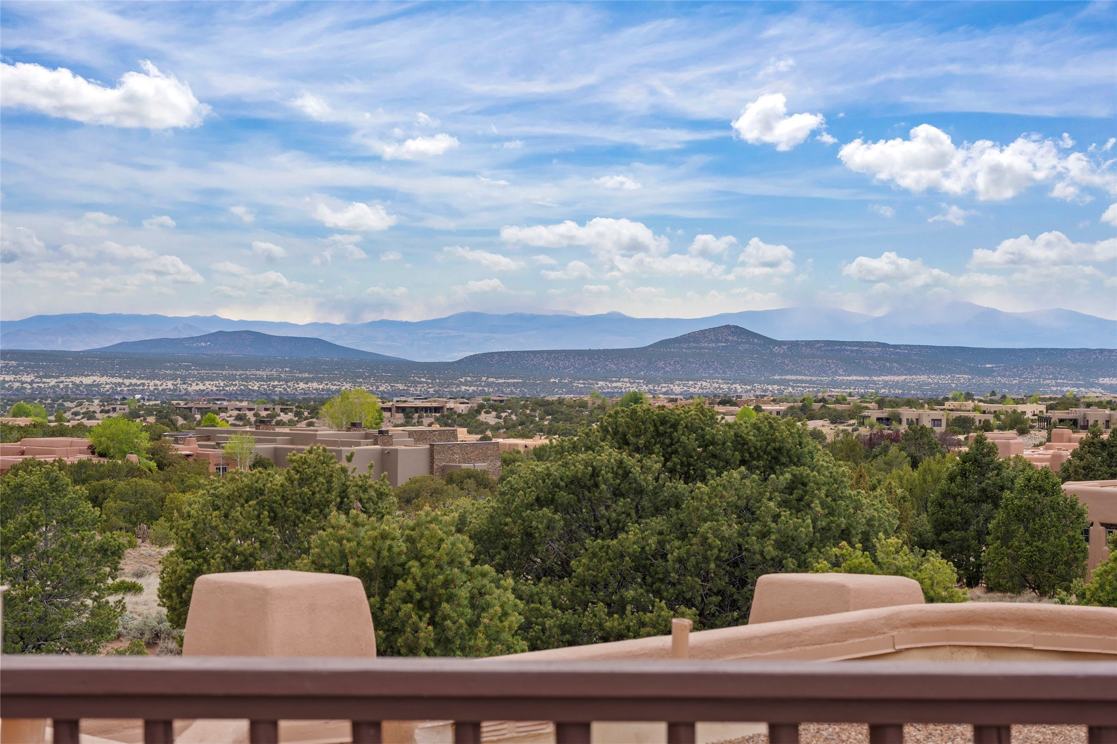 This Soft Contemporary 3-Bed + Den + Retreat / 3.5 -Bath home offers Sangre de Cristo Mountain Views in gated Las Campanas. The Great Room is truly Great, with 2 areas for socializing - One with a Kiva Fireplace, built-in TV / entertainment niche & doors to the Front Portal area. The other is a conversation area with a free-flowing kiva fireplace, wet bar, room for a Baby Grand Piano, Sangre de Cristo views plus access to the Back Portal area with wood-burning kiva fireplace. The Dining area is perfect for sharing meals & has access to the Back Portal area with Built-in BBQ & in-ground spa. The Kitchen has a Sub-Zero refrigerator, Bosch Dishwasher, Dacor Oven & Microwave plus a generous island with Dacor gas cooktop & prep sink. There is also a walk-in wine storage area plus Buffet & Butler's Pantry, both with ample storage. The Owner's Suite includes a kiva fireplace, walk-in closet & its own private portal with a Sangre de Cristo Mountain view. The Owner's Bath offers 2 separate vanities, 2 separate water closets, walk-in shower with body sprays & direct access to the In-ground Spa & outdoor shower. Also in the Owner's Suite wing, there is a private Den / Office with walk-in closet & outdoor access through double French doors as well as a south-facing Library / Retreat area. Two secondary bedrooms, each with their own bathrooms, are on the opposite side of the home, creating privacy from the Owner's Suite. The spacious outdoor area offers a multitude of desirable features - Private In-Ground Spa, Outdoor Shower, Built-in BBQ, Extensive shaded portal areas with wood-burning fireplace & a spacious roof deck with 360-degree Mountain Views. The 3-car garage includes a third, separate stall that can be used as a studio. This fabulous home checks all the boxes - 3 Bedrooms + Den + Retreat * 3 Baths * 3-Car Garage * In-ground Spa * Outdoor Shower * Spacious Roof Deck * Sangre de Cristo Mountain views - Make it yours Today!