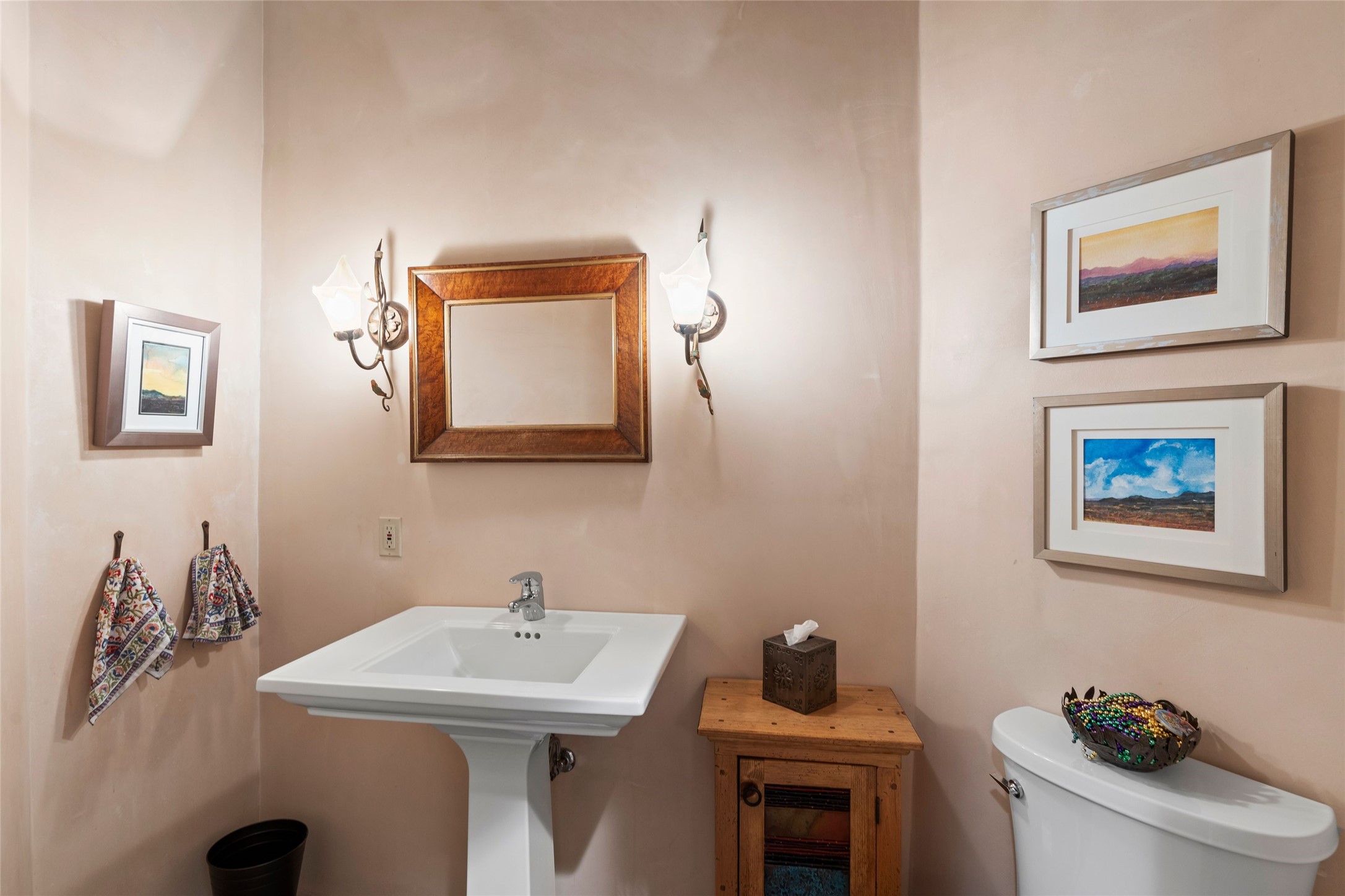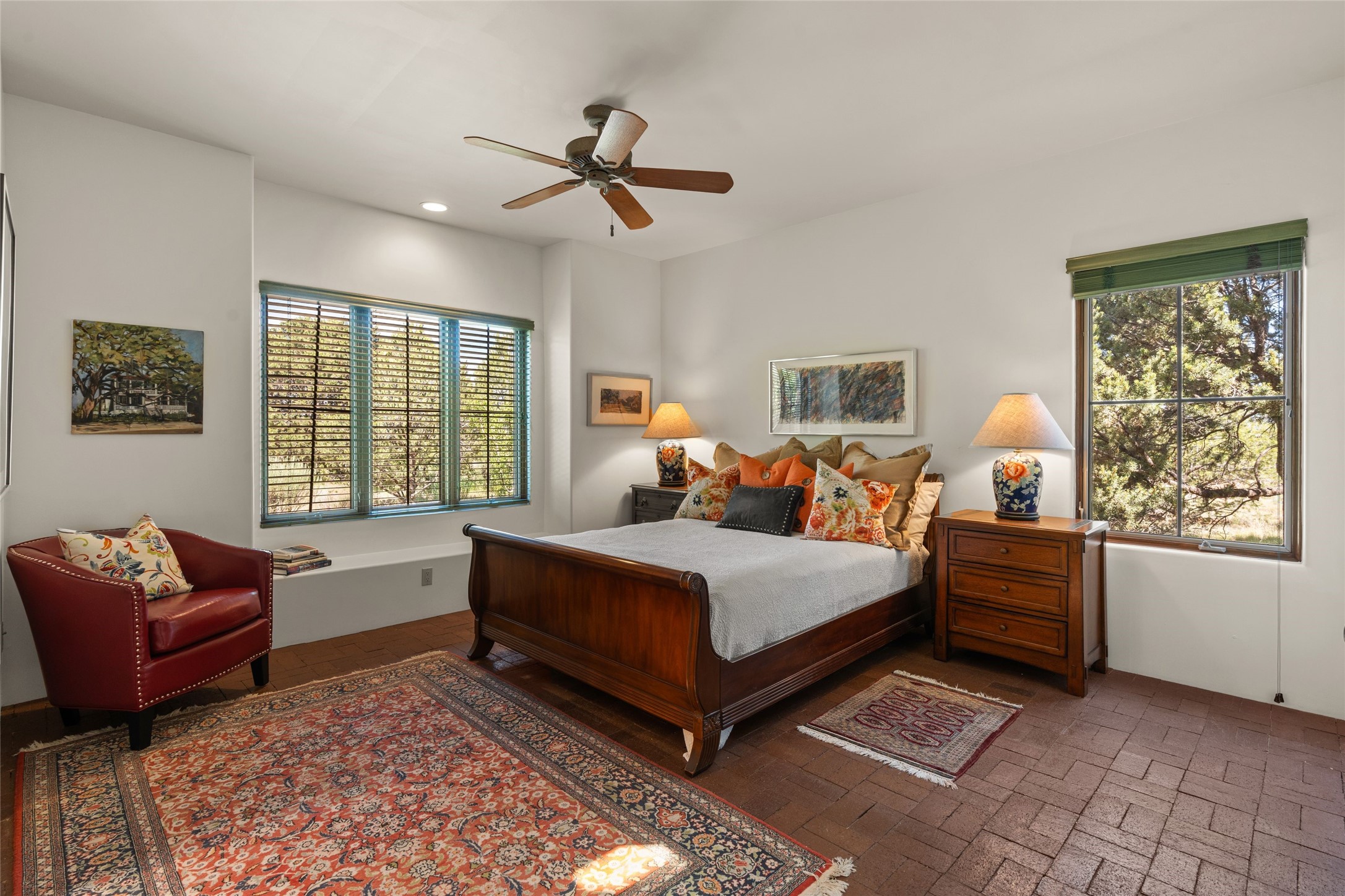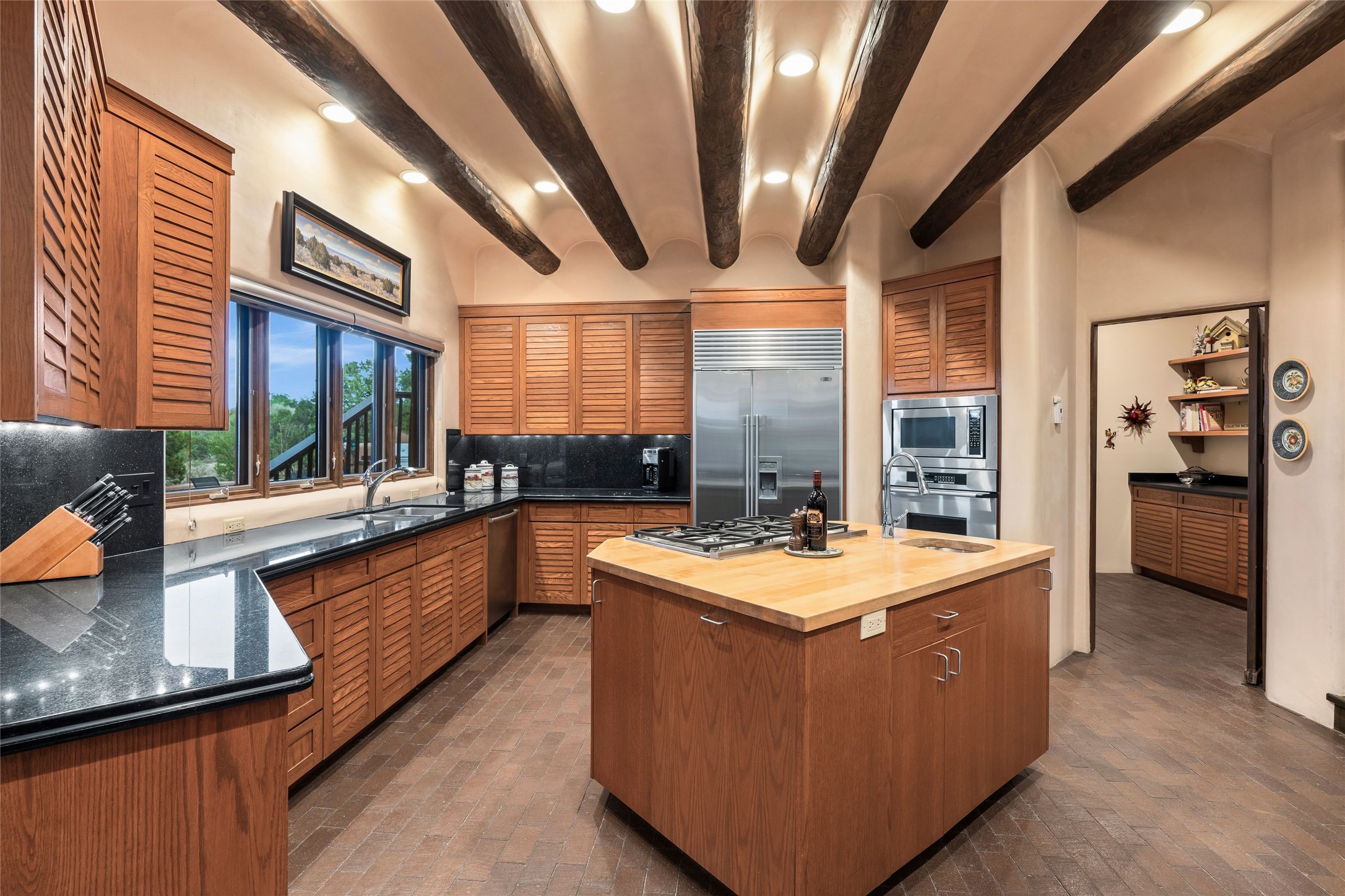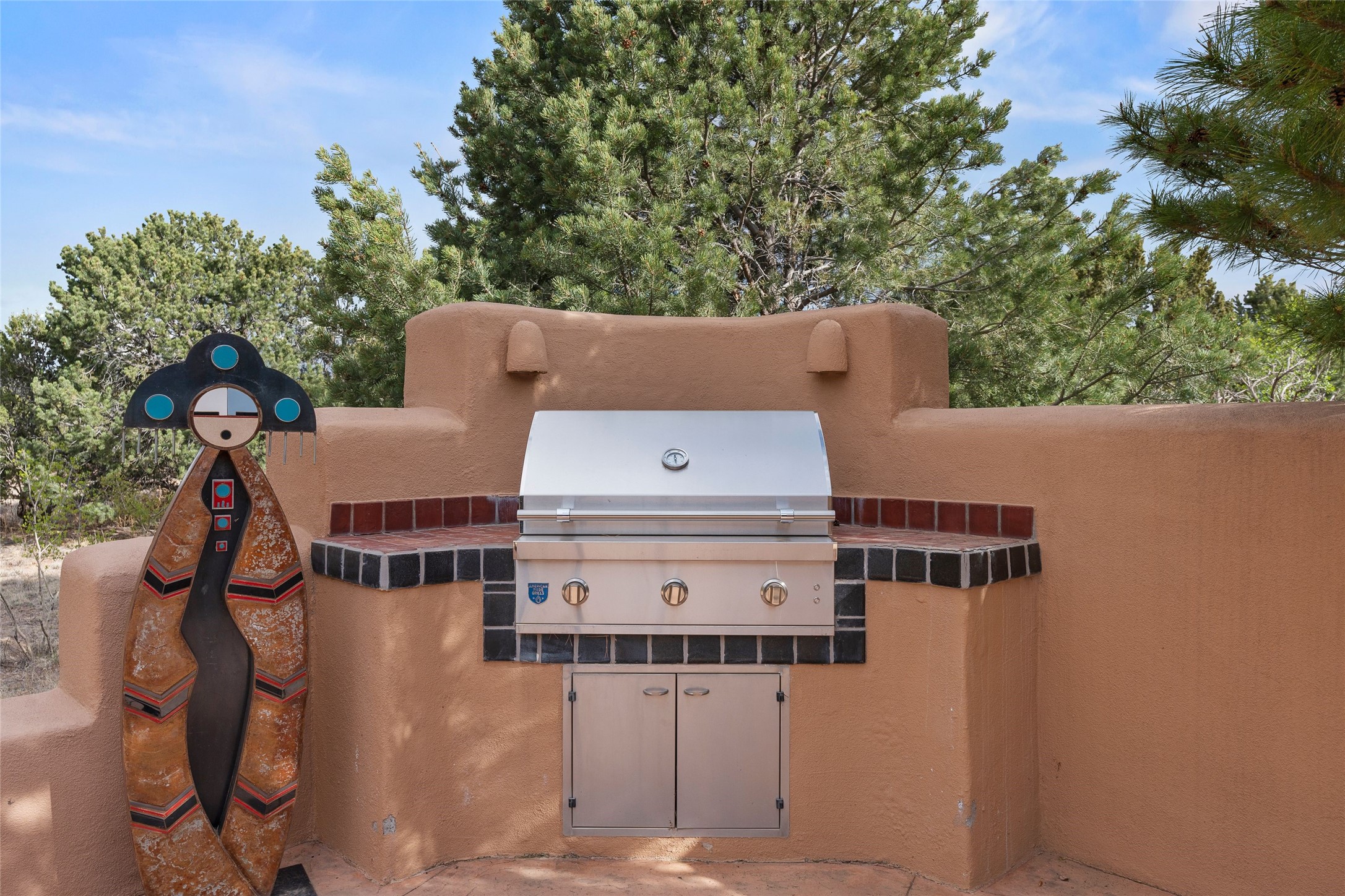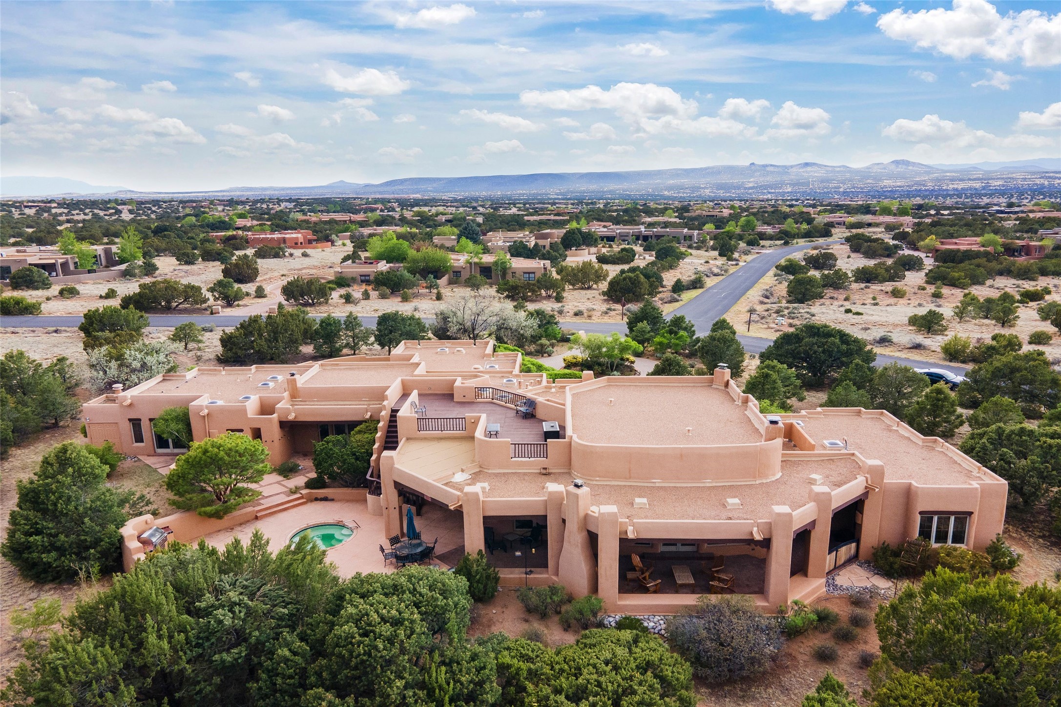 This Soft Contemporary 3-Bed + Den + Retreat / 3.5 -Bath home offers Sangre de Cristo Mountain Views in gated Las Campanas. The Great Room is truly Great, with 2 areas for socializing - One with a Kiva Fireplace, built-in TV / entertainment niche & doors to the Front Portal area. The other is a conversation area with a free-flowing kiva fireplace, wet bar, room for a Baby Grand Piano, Sangre de Cristo views plus access to the Back Portal area with wood-burning kiva fireplace. The Dining area is perfect for sharing meals & has access to the Back Portal area with Built-in BBQ & in-ground spa. The Kitchen has a Sub-Zero refrigerator, Bosch Dishwasher, Dacor Oven & Microwave plus a generous island with Dacor gas cooktop & prep sink. There is also a walk-in wine storage area plus Buffet & Butler's Pantry, both with ample storage. The Owner's Suite includes a kiva fireplace, walk-in closet & its own private portal with a Sangre de Cristo Mountain view. The Owner's Bath offers 2 separate vanities, 2 separate water closets, walk-in shower with body sprays & direct access to the In-ground Spa & outdoor shower. Also in the Owner's Suite wing, there is a private Den / Office with walk-in closet & outdoor access through double French doors as well as a south-facing Library / Retreat area. Two secondary bedrooms, each with their own bathrooms, are on the opposite side of the home, creating privacy from the Owner's Suite. The spacious outdoor area offers a multitude of desirable features - Private In-Ground Spa, Outdoor Shower, Built-in BBQ, Extensive shaded portal areas with wood-burning fireplace & a spacious roof deck with 360-degree Mountain Views. The 3-car garage includes a third, separate stall that can be used as a studio. This fabulous home checks all the boxes - 3 Bedrooms + Den + Retreat * 3 Baths * 3-Car Garage * In-ground Spa * Outdoor Shower * Spacious Roof Deck * Sangre de Cristo Mountain views - Make it yours Today!